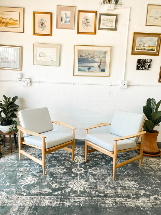 Pair of Swedish Armchairs Featuring Cool Blue Upholstered Cushions.