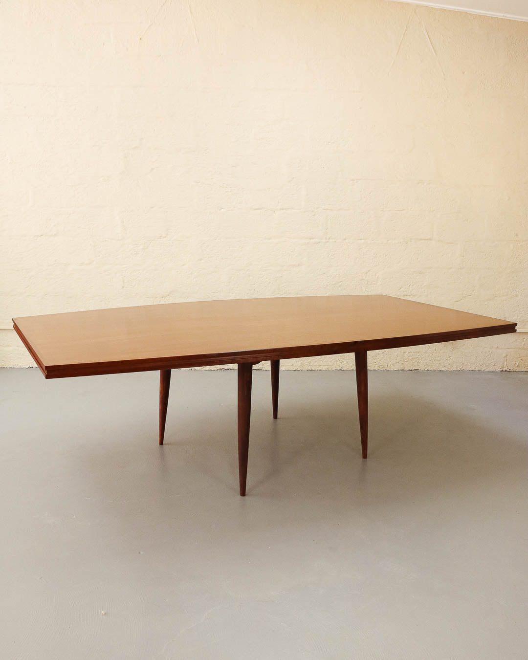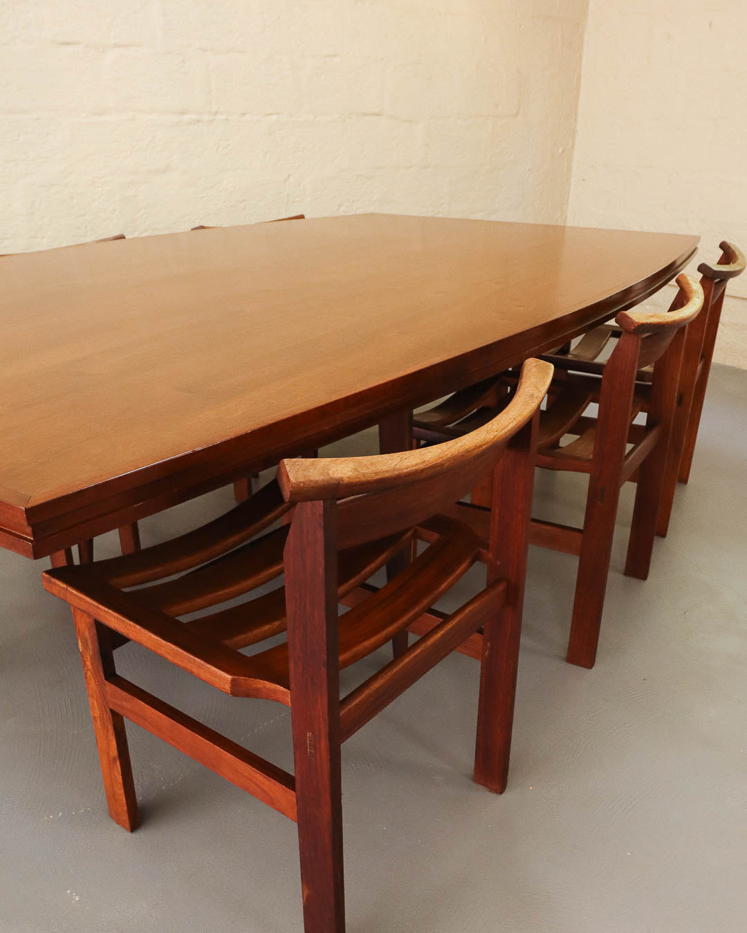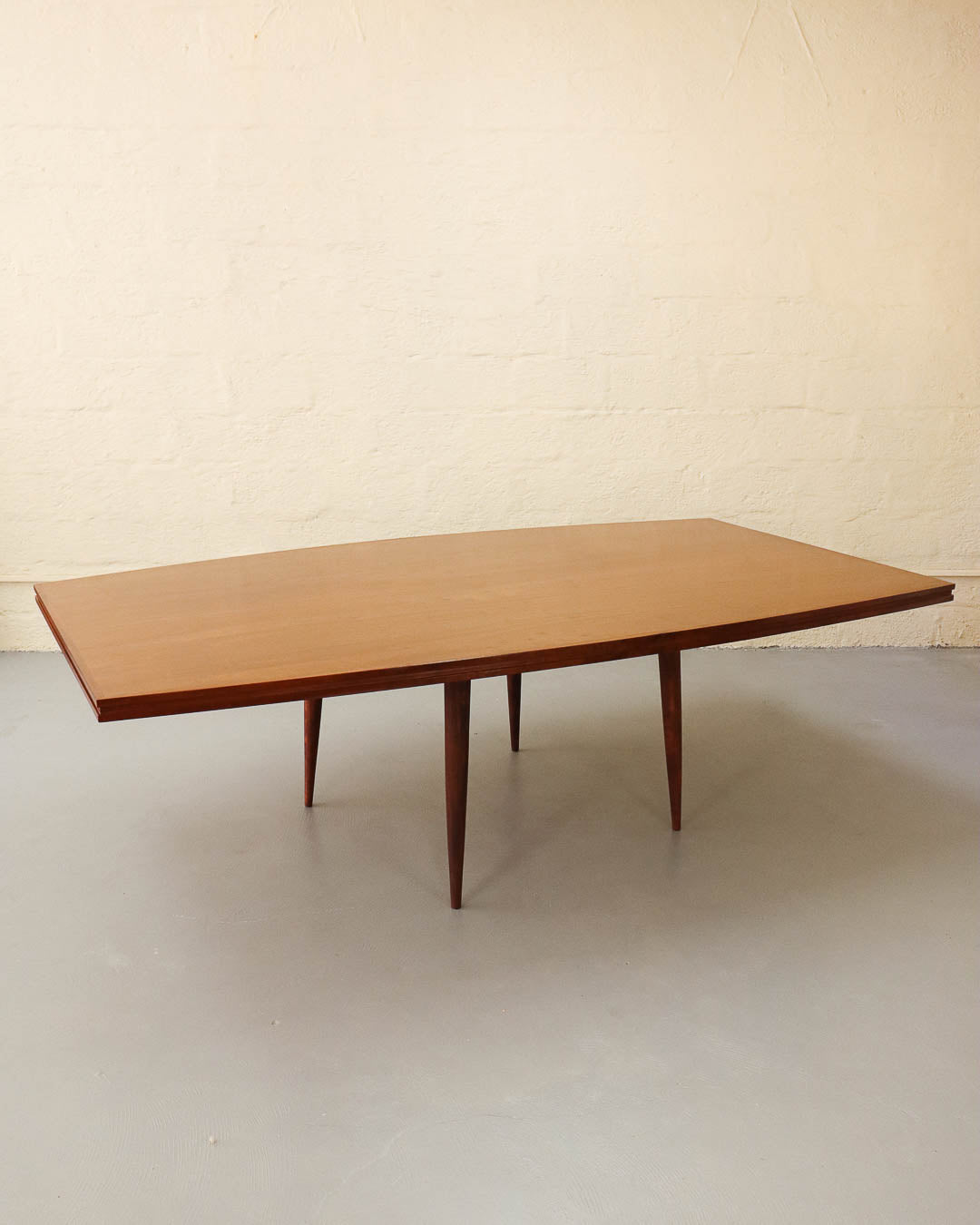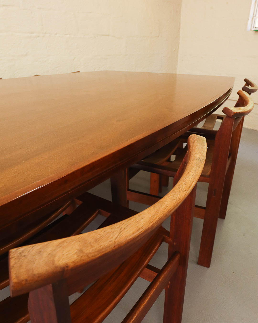 Exceptional solid imbuia dining table by renowned South African designer EE Meyer for Binnehuis, crafted in the 1960s. This classic mid-century rounded 6-seater comes with an impressively large additional top that extends over the frame, comfortably seating 8 to 10 people. The elegant tapered legs and refined lines speak to Meyer’s signature style. Lightly restored to preserve its original character, this table is both a striking centrepiece and a highly collectable example of South African mid-century furniture.