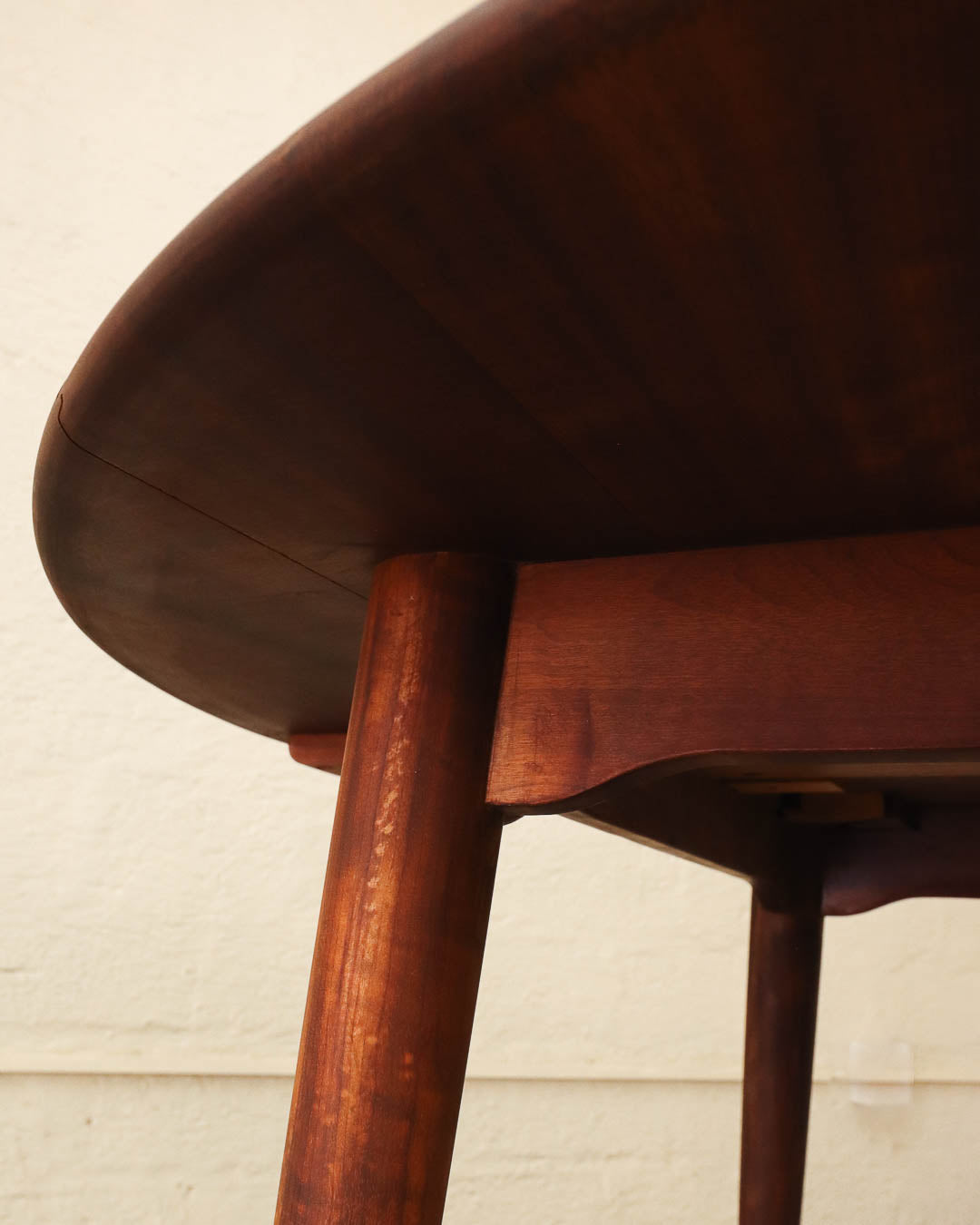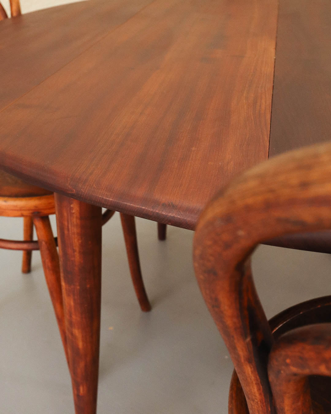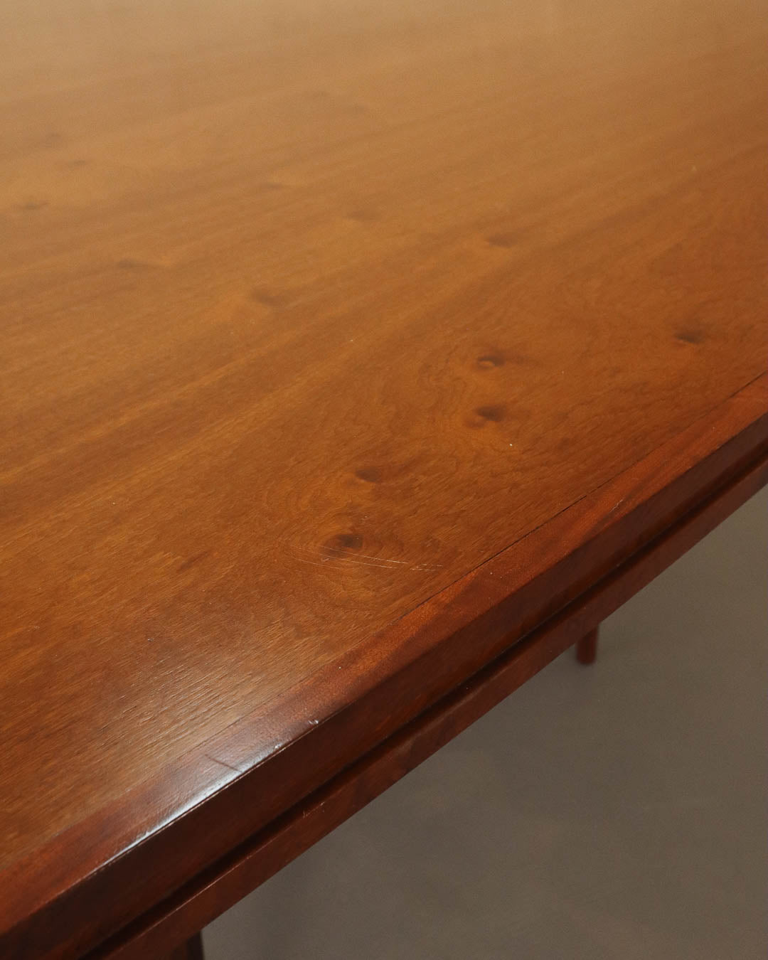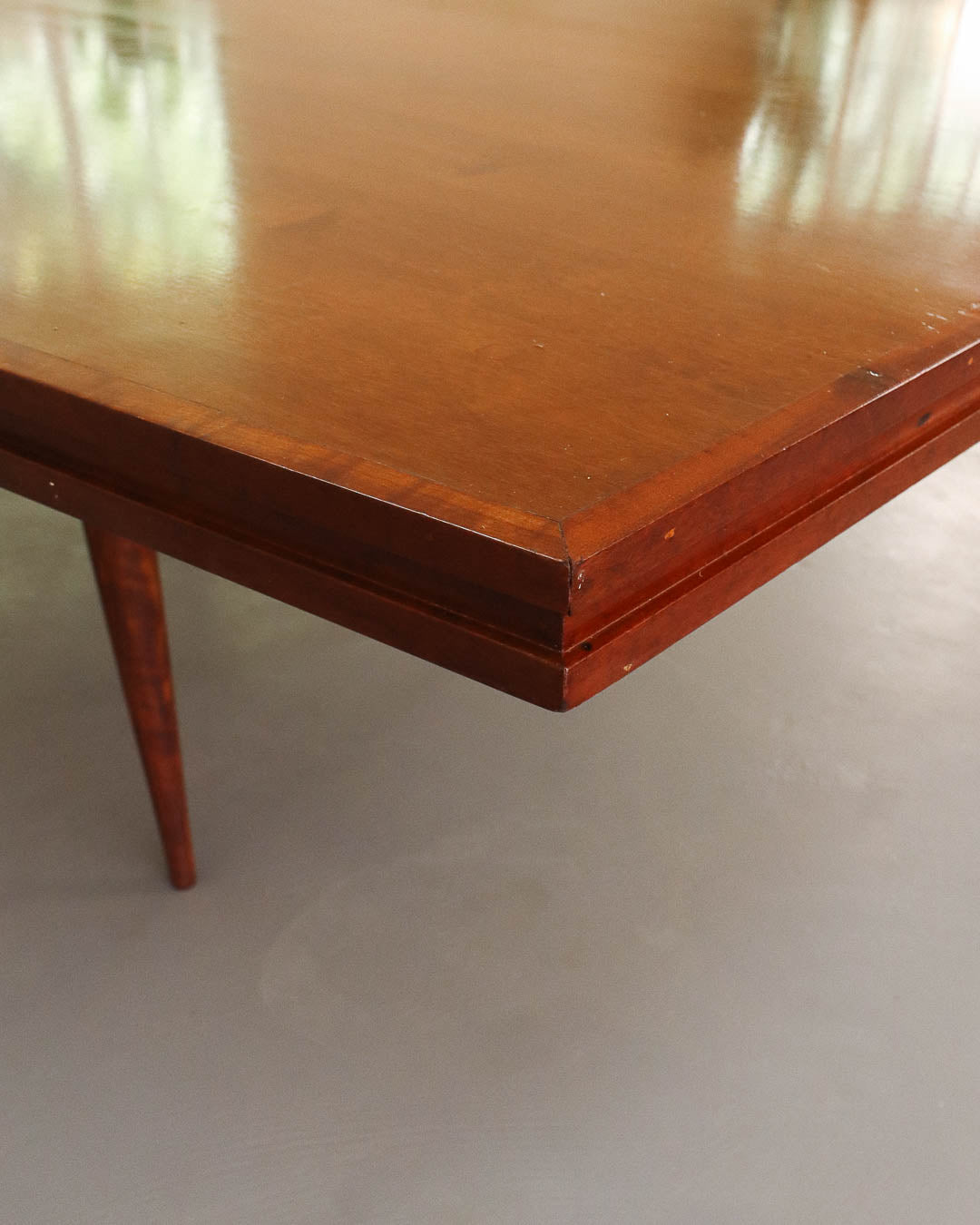 Exceptional solid imbuia dining table by renowned South African designer EE Meyer for Binnehuis, crafted in the 1960s. This classic mid-century rounded 6-seater comes with an impressively large additional top that extends over the frame, comfortably seating 8 to 10 people. The elegant tapered legs and refined lines speak to Meyer’s signature style. Lightly restored to preserve its original character, this table is both a striking centrepiece and a highly collectable example of South African mid-century furniture.