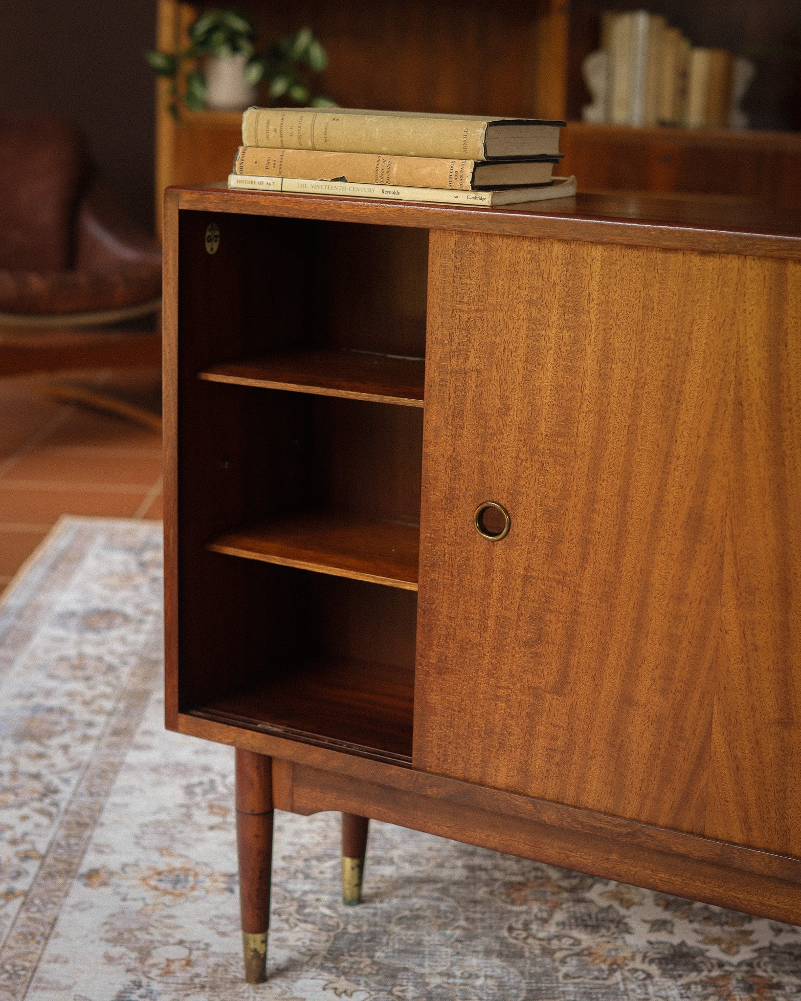 Mid-century teak sideboard/cabinet by iconic British furniture maker Greaves & Thomas, made in the 1960s. Two sliding cupboard doors supported on tapered legs with brass feet, with shelving on the inside. This stylish piece can be used as a bookcase, drinks cabinet, hall cabinet or as a smaller sideboard.
