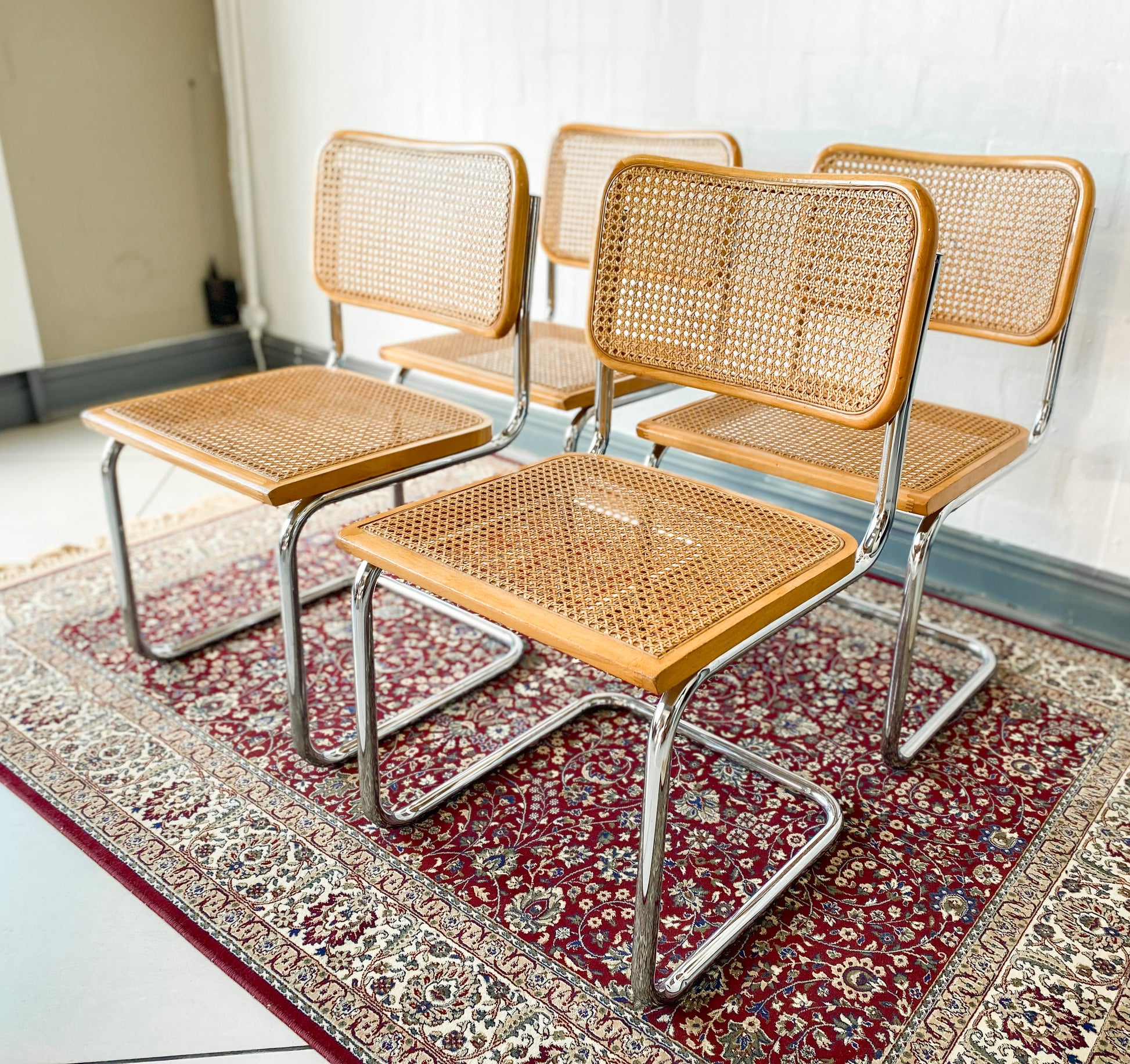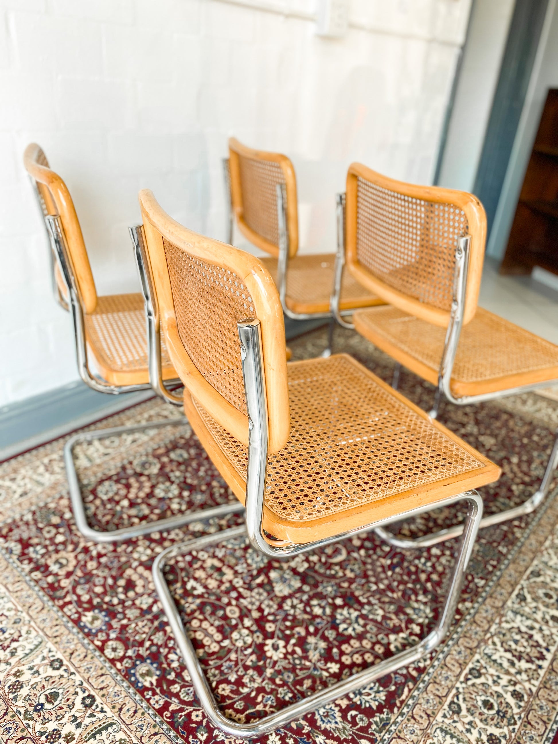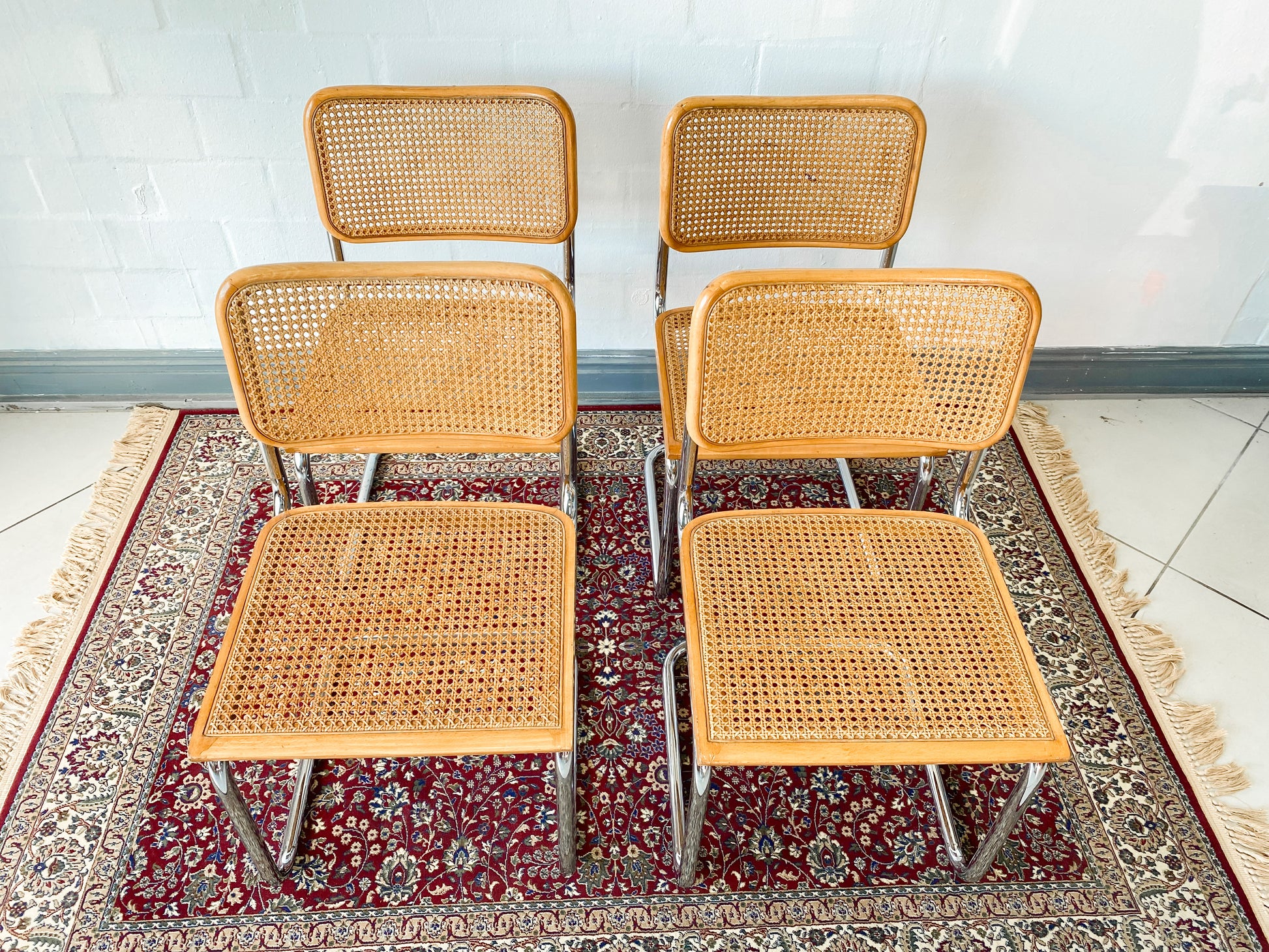 Beautiful set of 4 Cesca cantilever dining chairs. Each chair has been carefully restored. The cane webbing has been piled and the chrome frames have been cleaned. Additionally, each chair is fitted with rubber glides at the bottom to protect your floors and ensure maximum stability. The chairs feature an "Italian mark of guarantee" imprint on the bases.