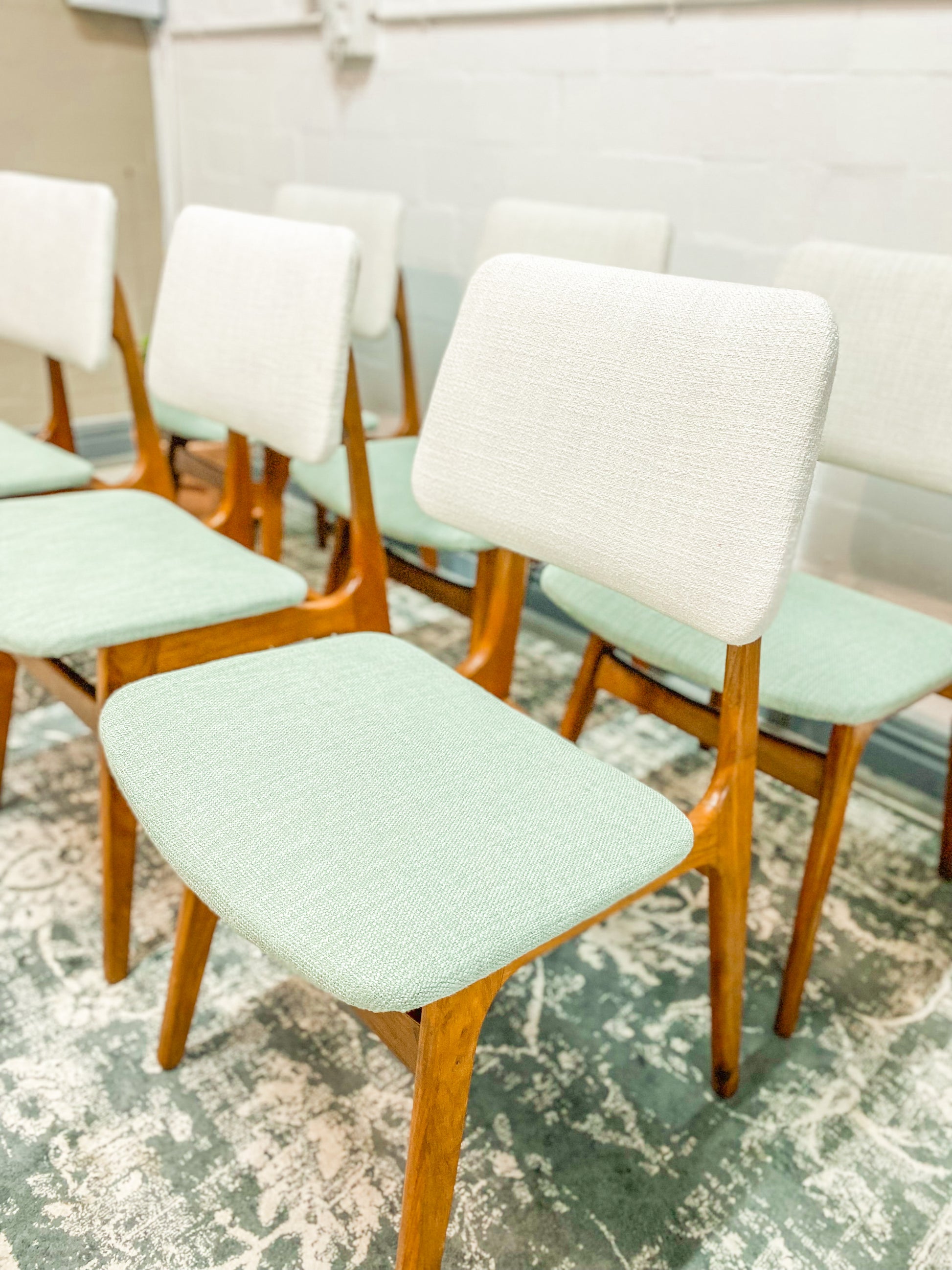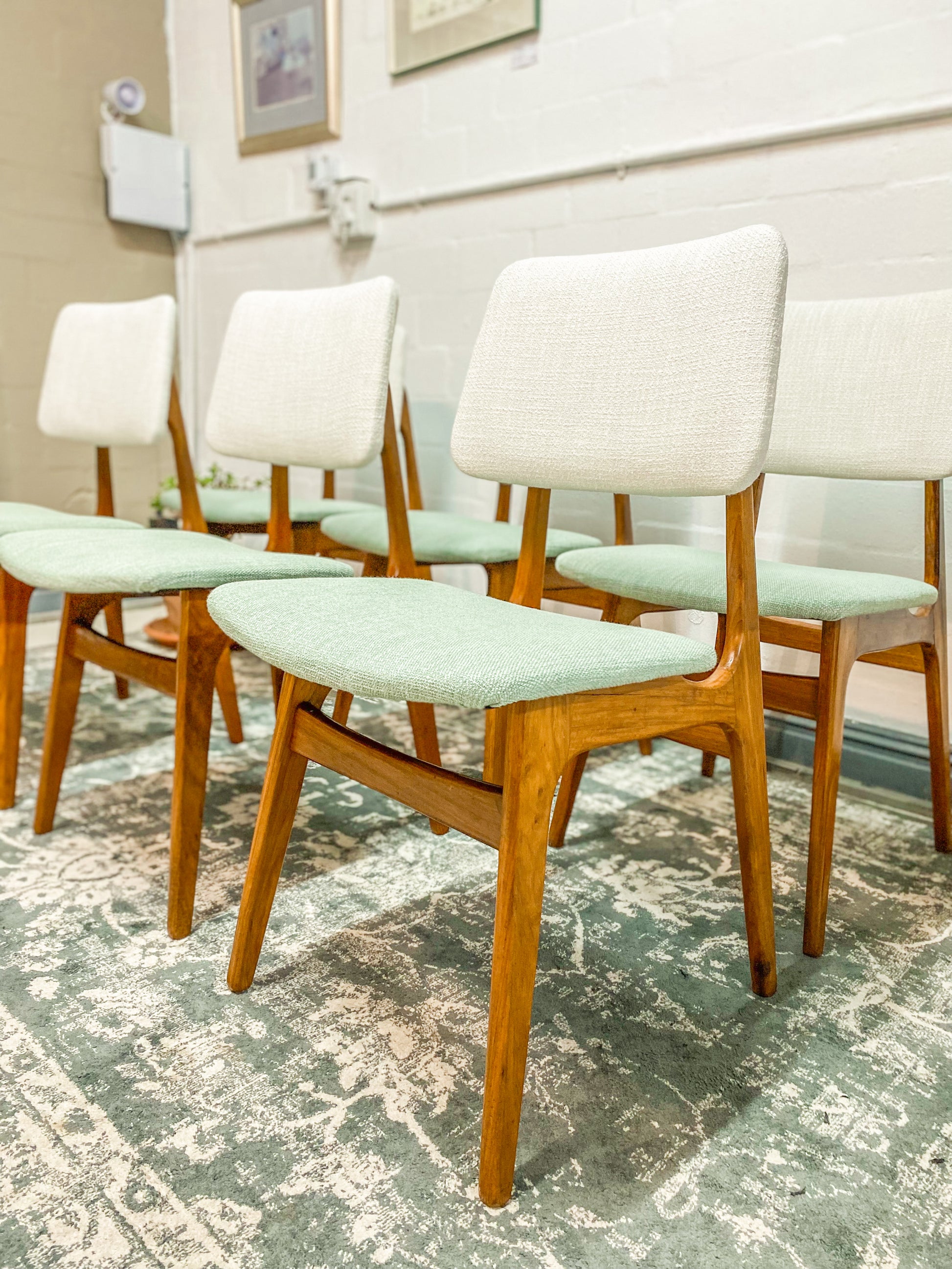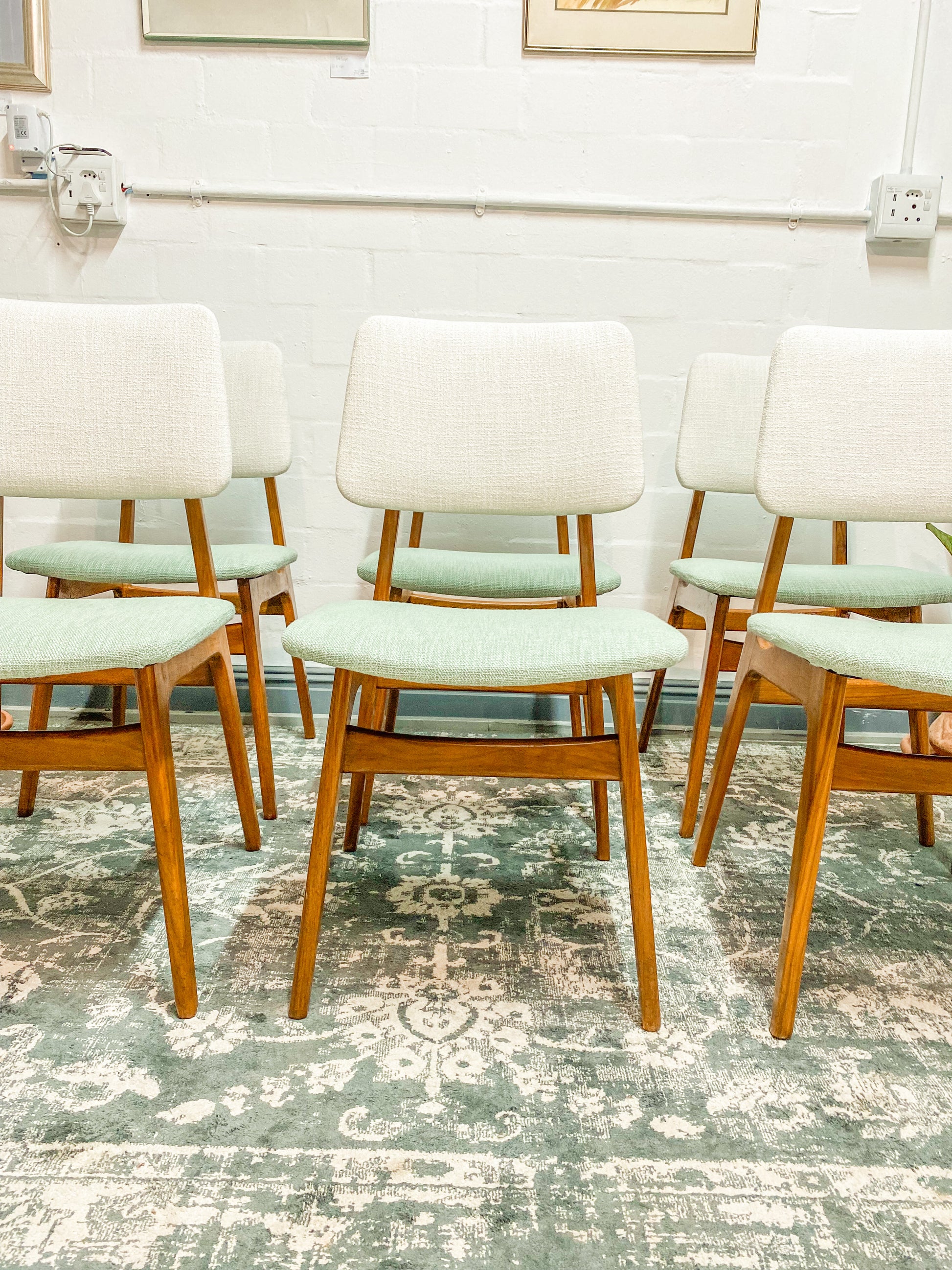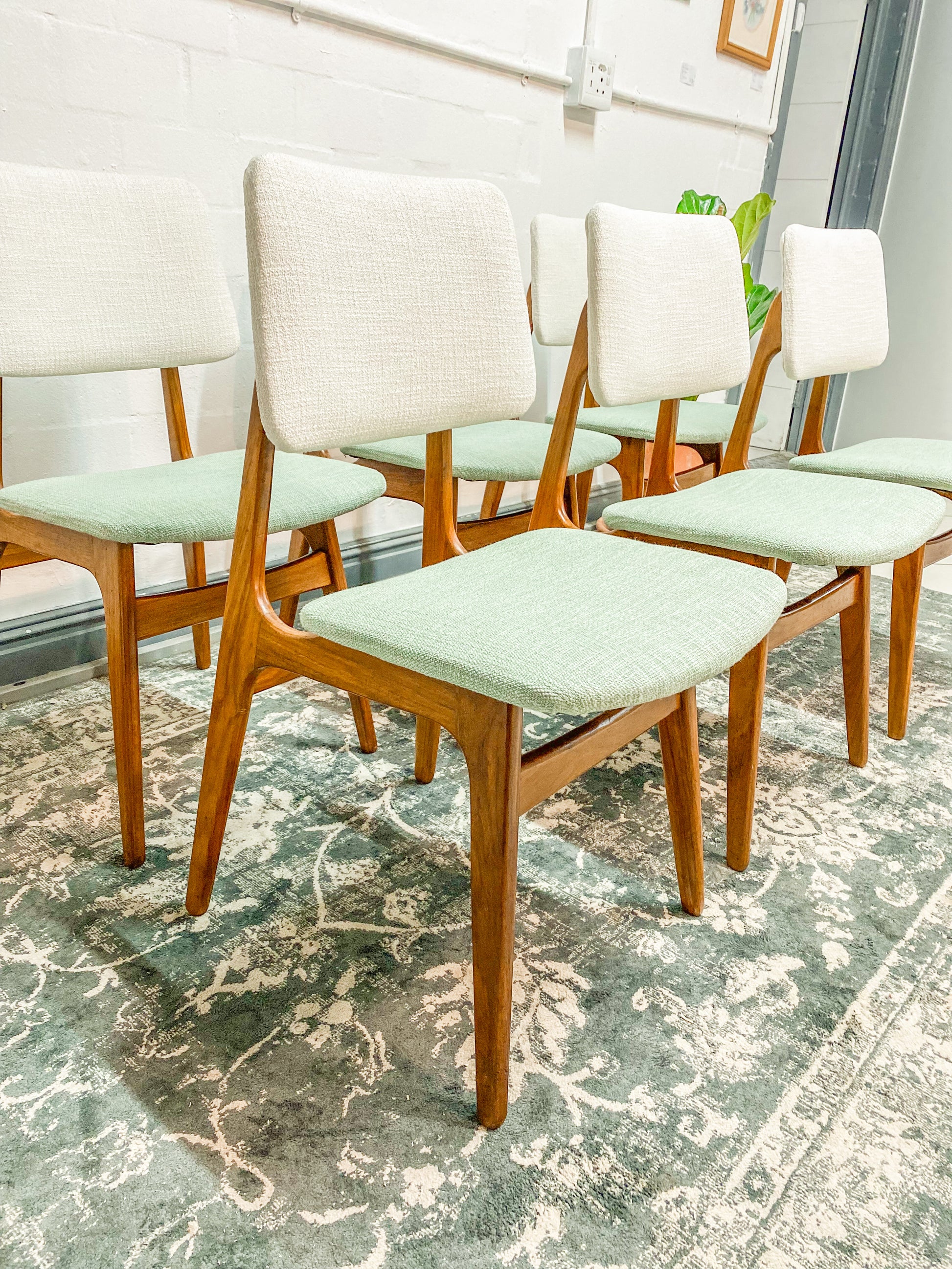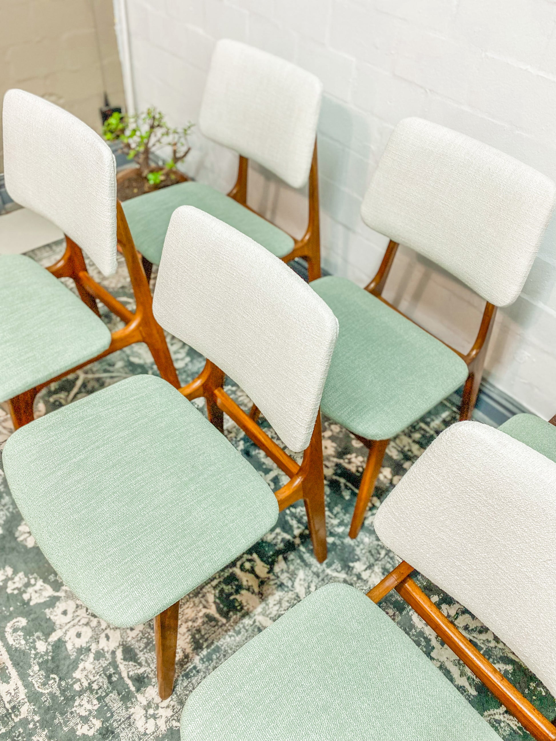 Timeless set of six mid century modern kiaat dining chairs. Featuring a unique combination of newly upon lime green and frosted white upholstery, these chairs are sure to instantly brighten any room. The wood grain is warm and inviting, while the upholstery is modern yet timeless. A dining piece that perfectly compliment your current style and decor.
