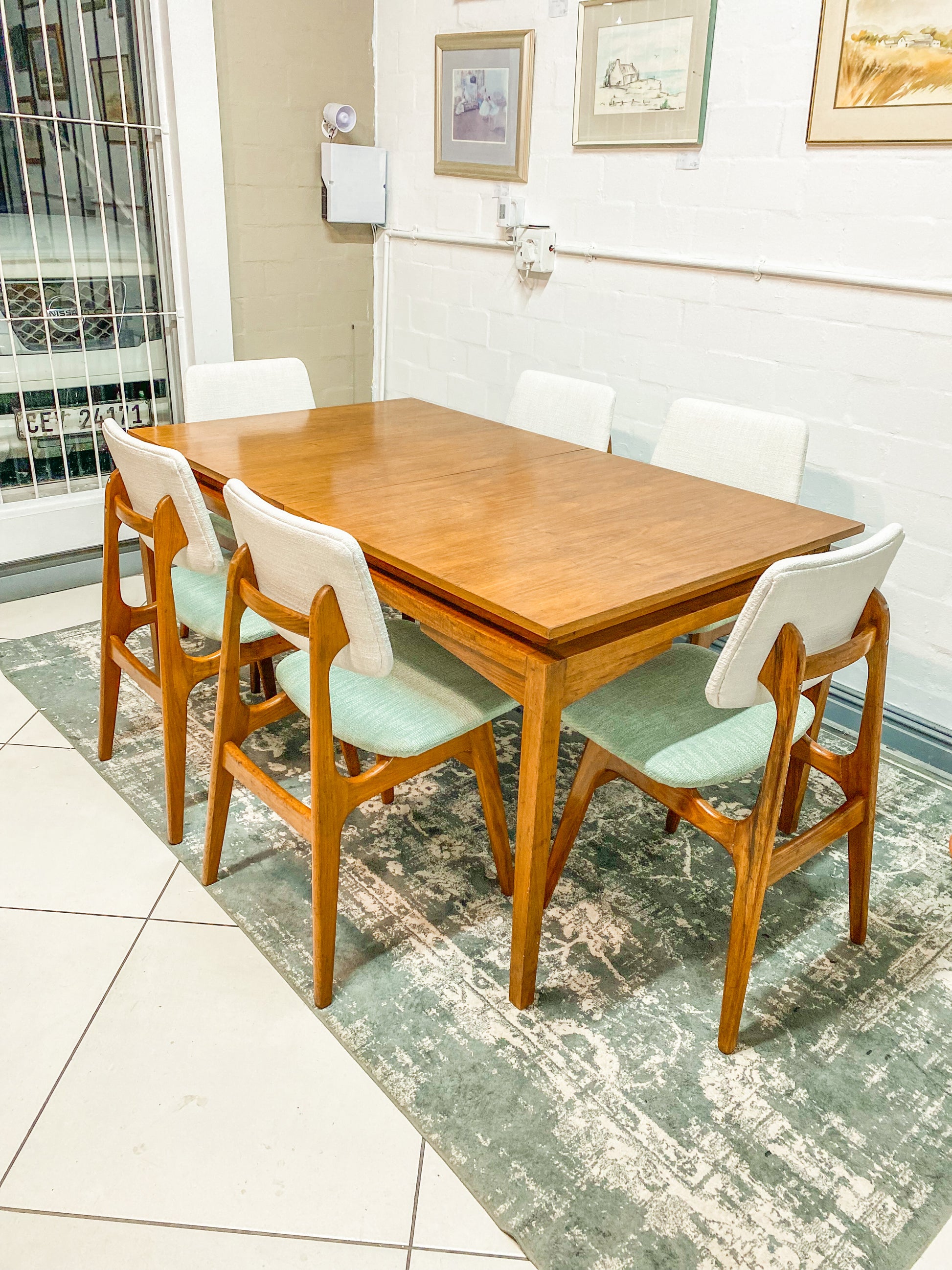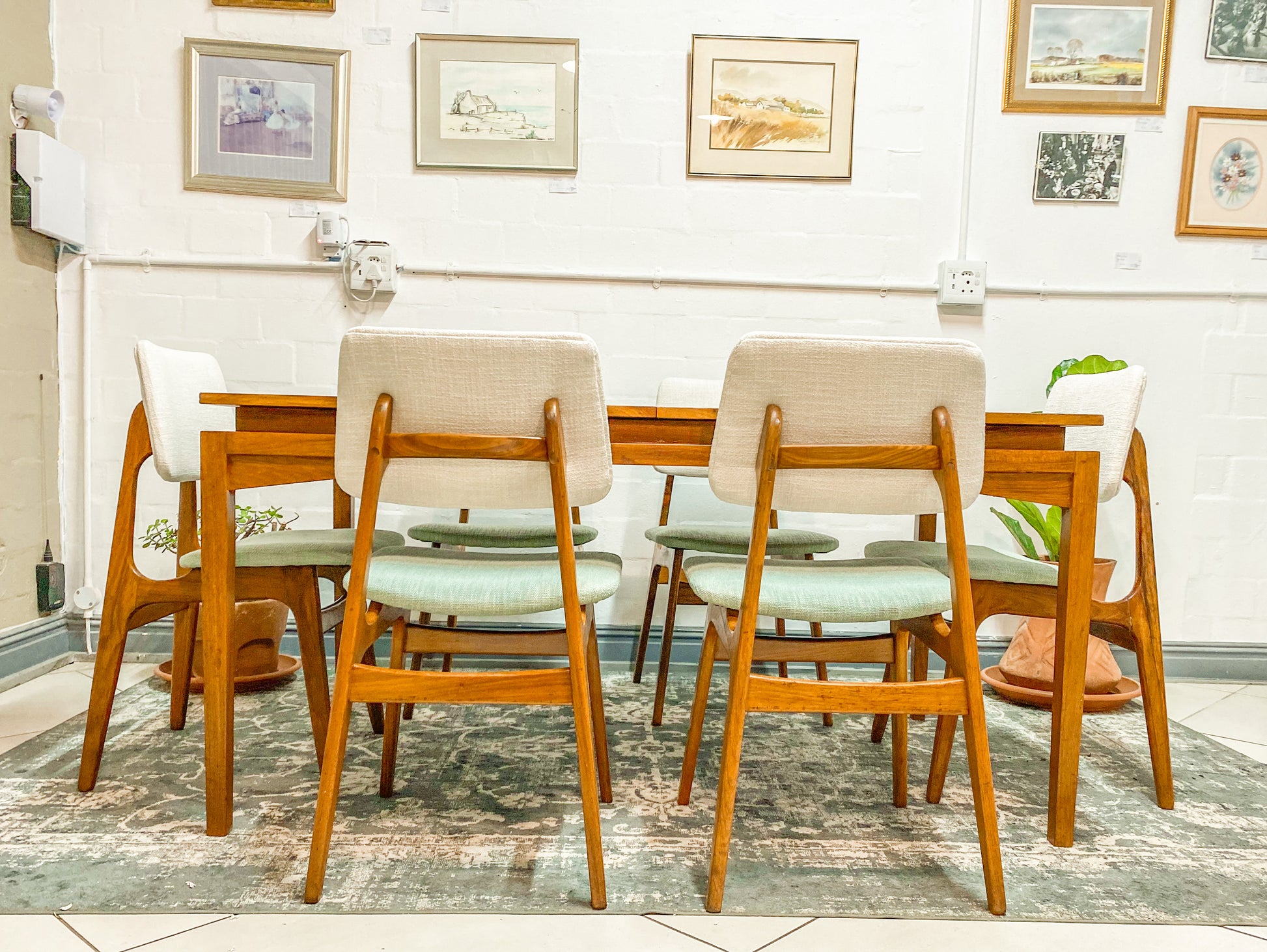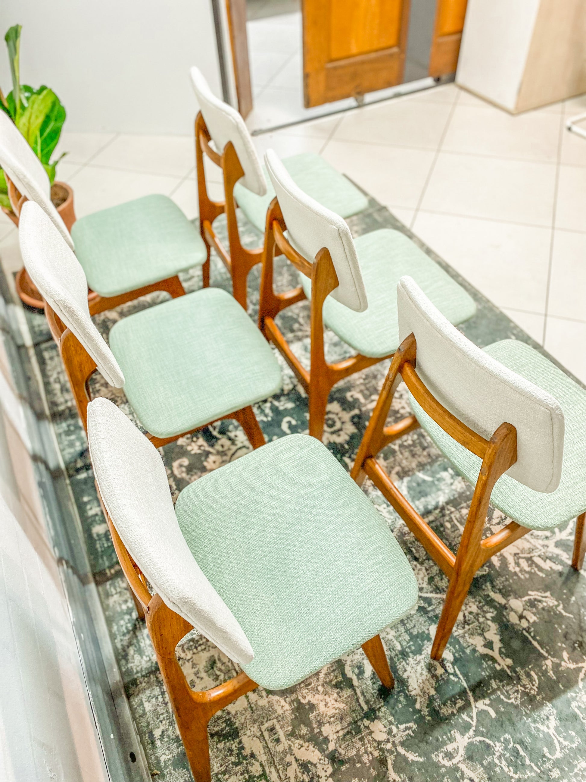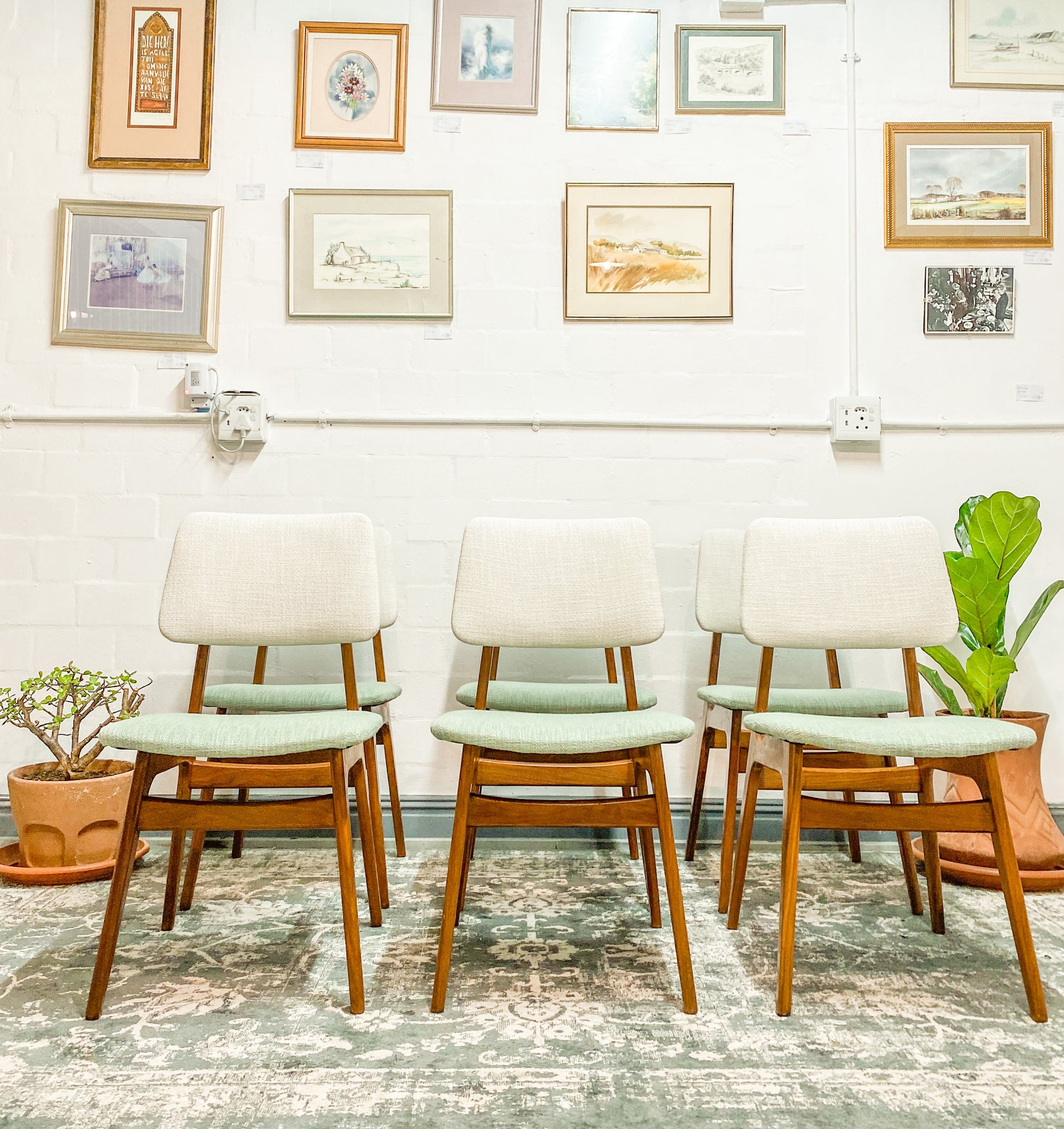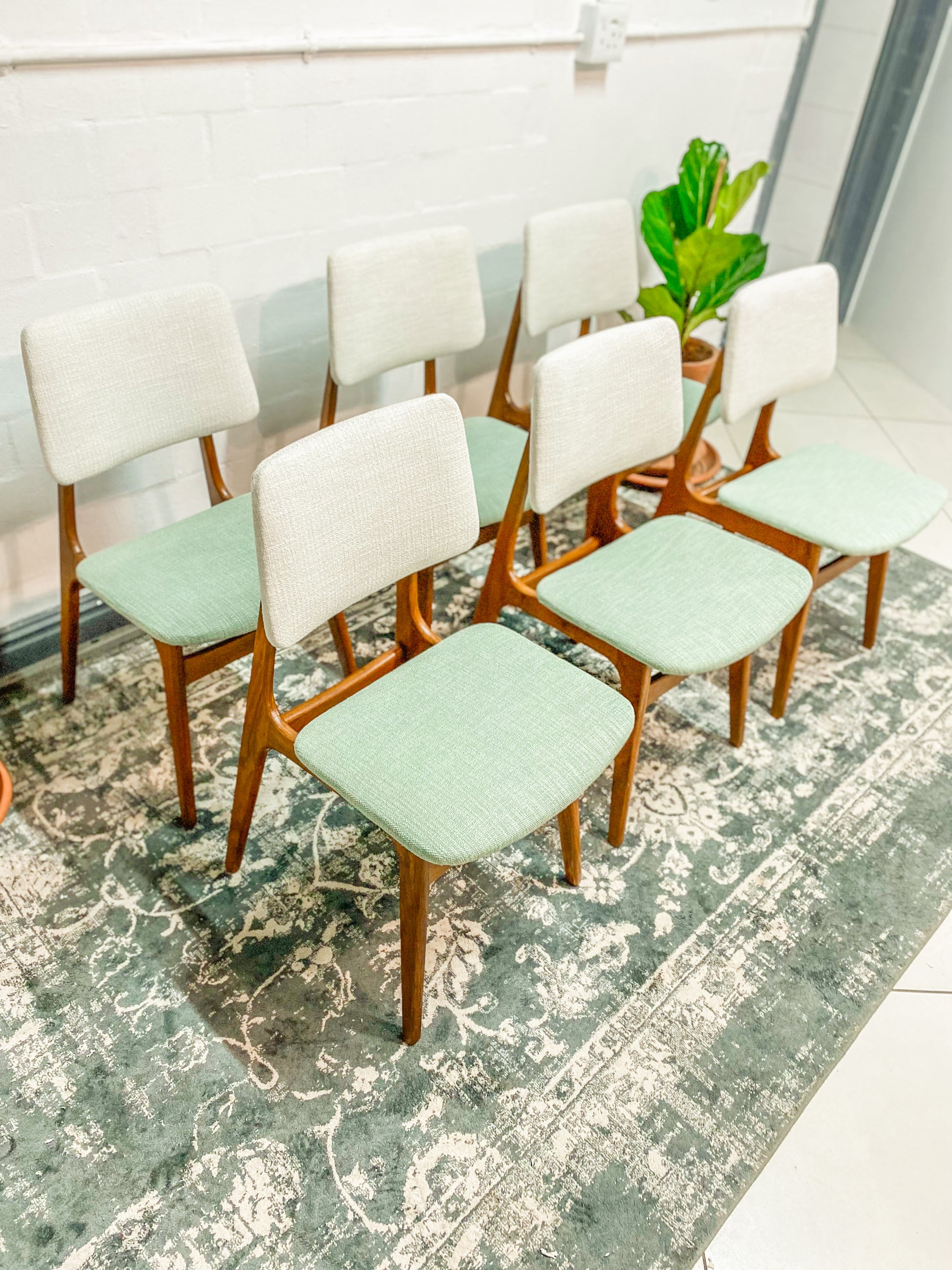 Timeless set of six mid century modern kiaat dining chairs. Featuring a unique combination of newly upon lime green and frosted white upholstery, these chairs are sure to instantly brighten any room. The wood grain is warm and inviting, while the upholstery is modern yet timeless. A dining piece that perfectly compliment your current style and decor.