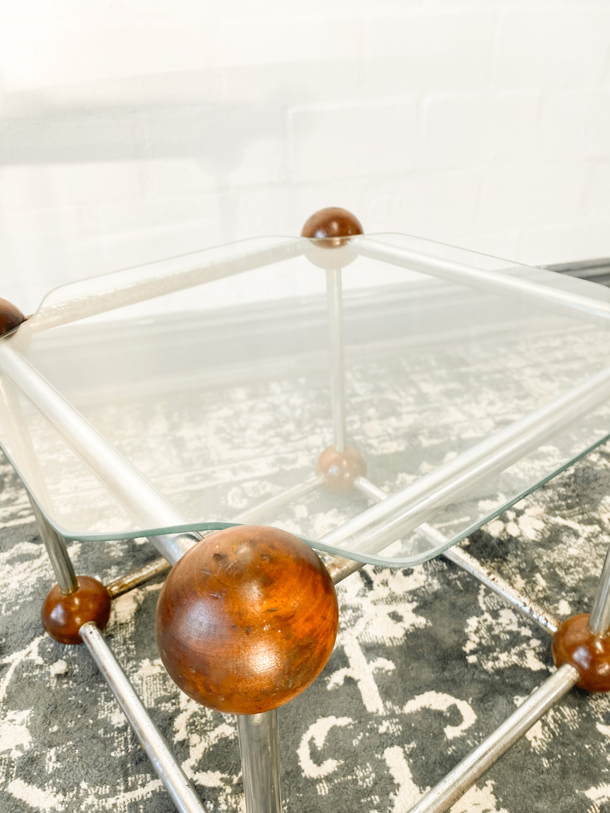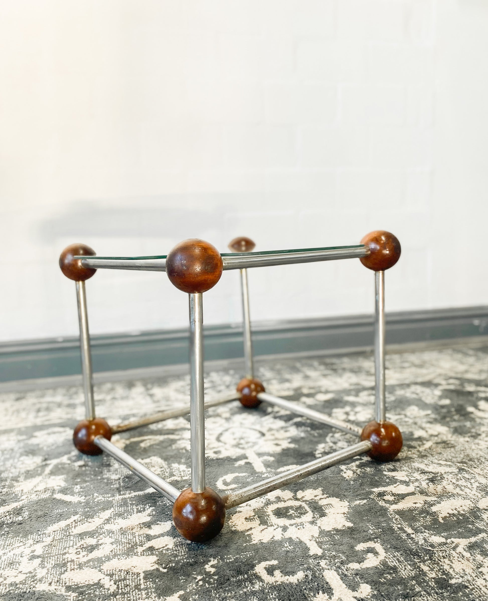 Elevate your living space with the Atom Side Table! Its sleek chrome frame and wood accents create a sophisticated, Mid-Century Modern look, while its expertly crafted floating glass tabletop provides an air of elegance. With its timeless design, it's perfect for any contemporary lounge, coffee nook, or waiting room. In good vintage condition.