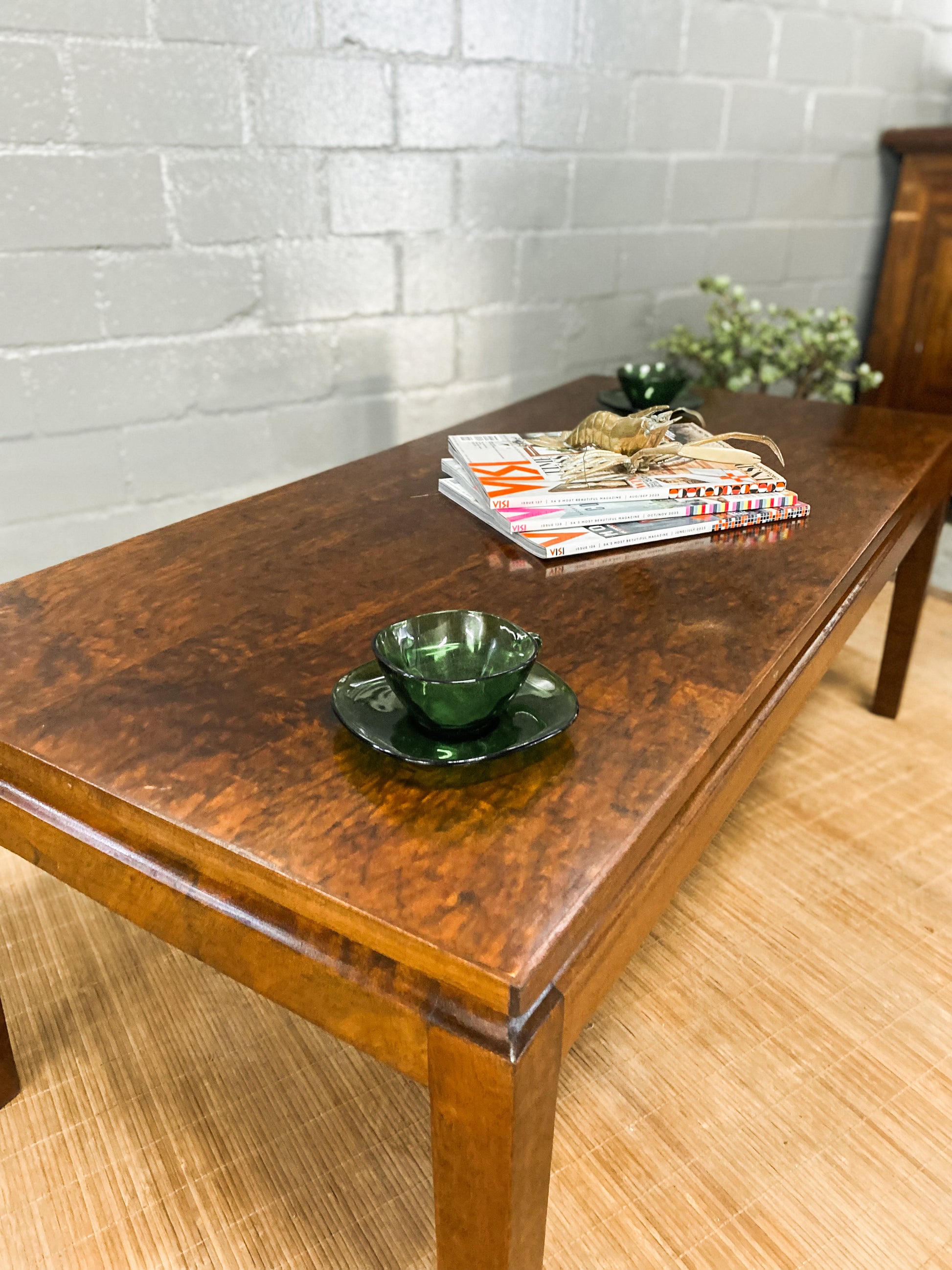 Magnificent Binnehuis rectangular coffee table, masterfully crafted by EE Meyer, showcasing rich imbuia woodgrains and robust construction. This piece is in excellent original condition, having been meticulously cleaned and oiled, ensuring its longevity as a cherished addition to your home for years to come.