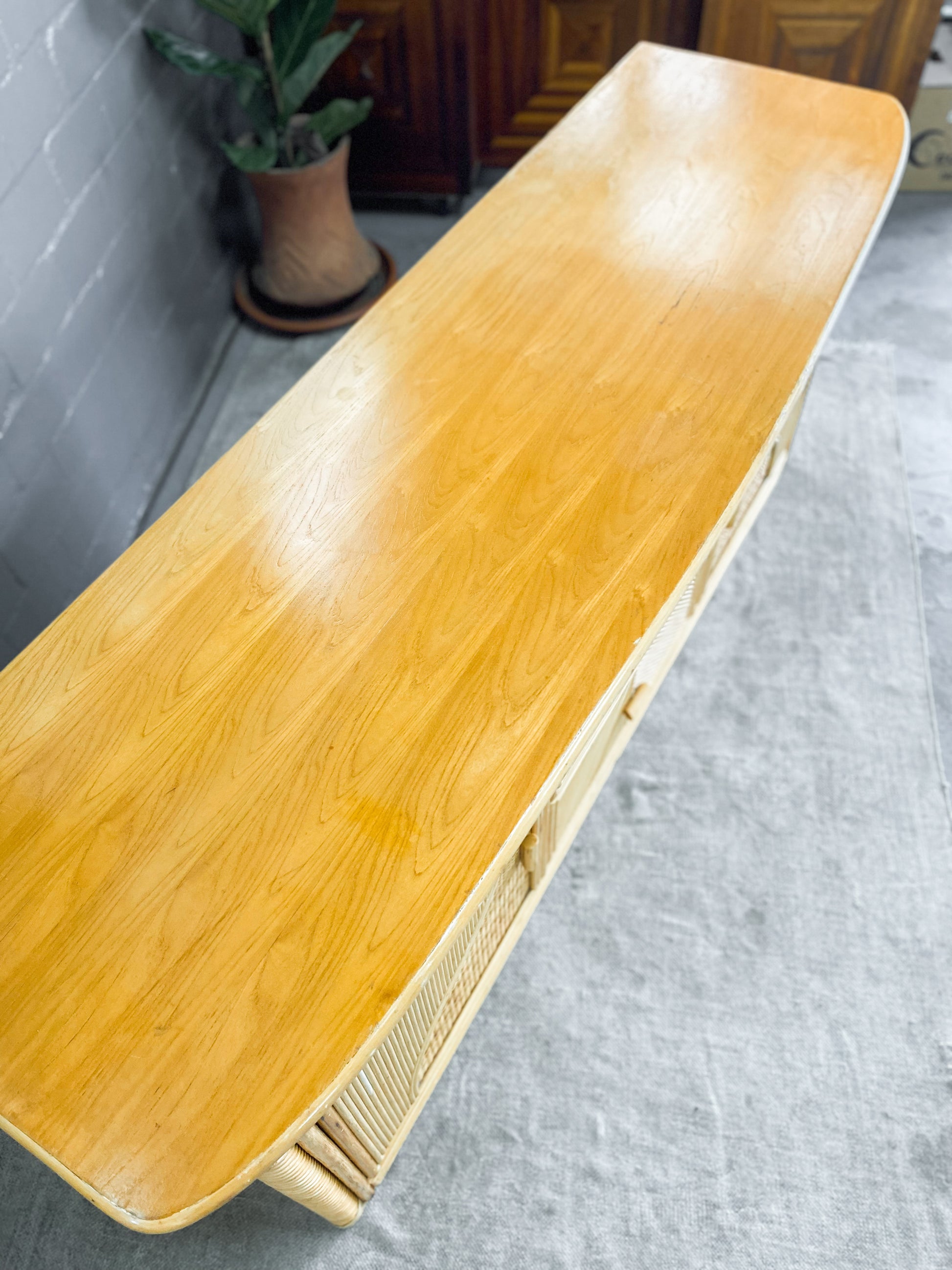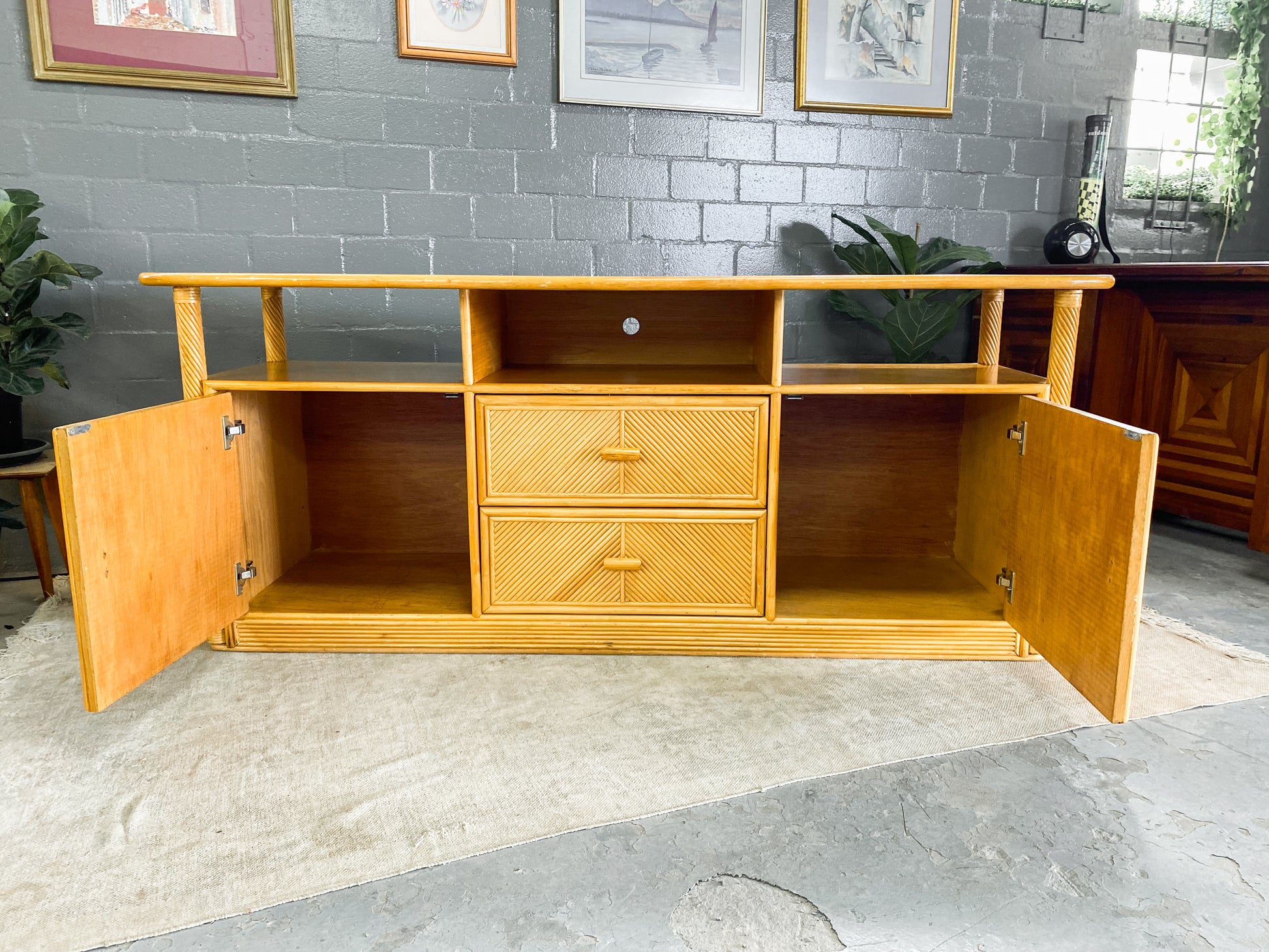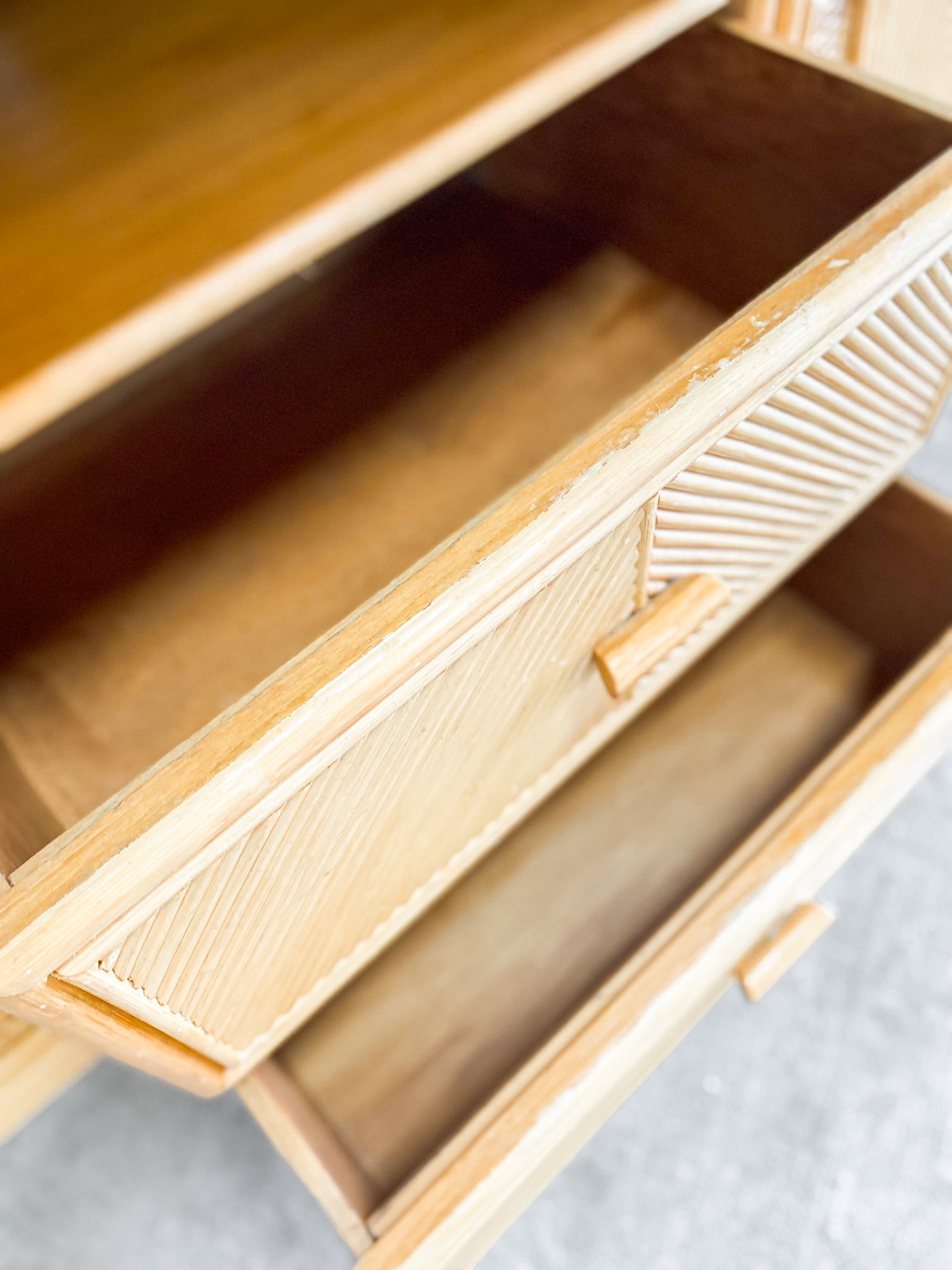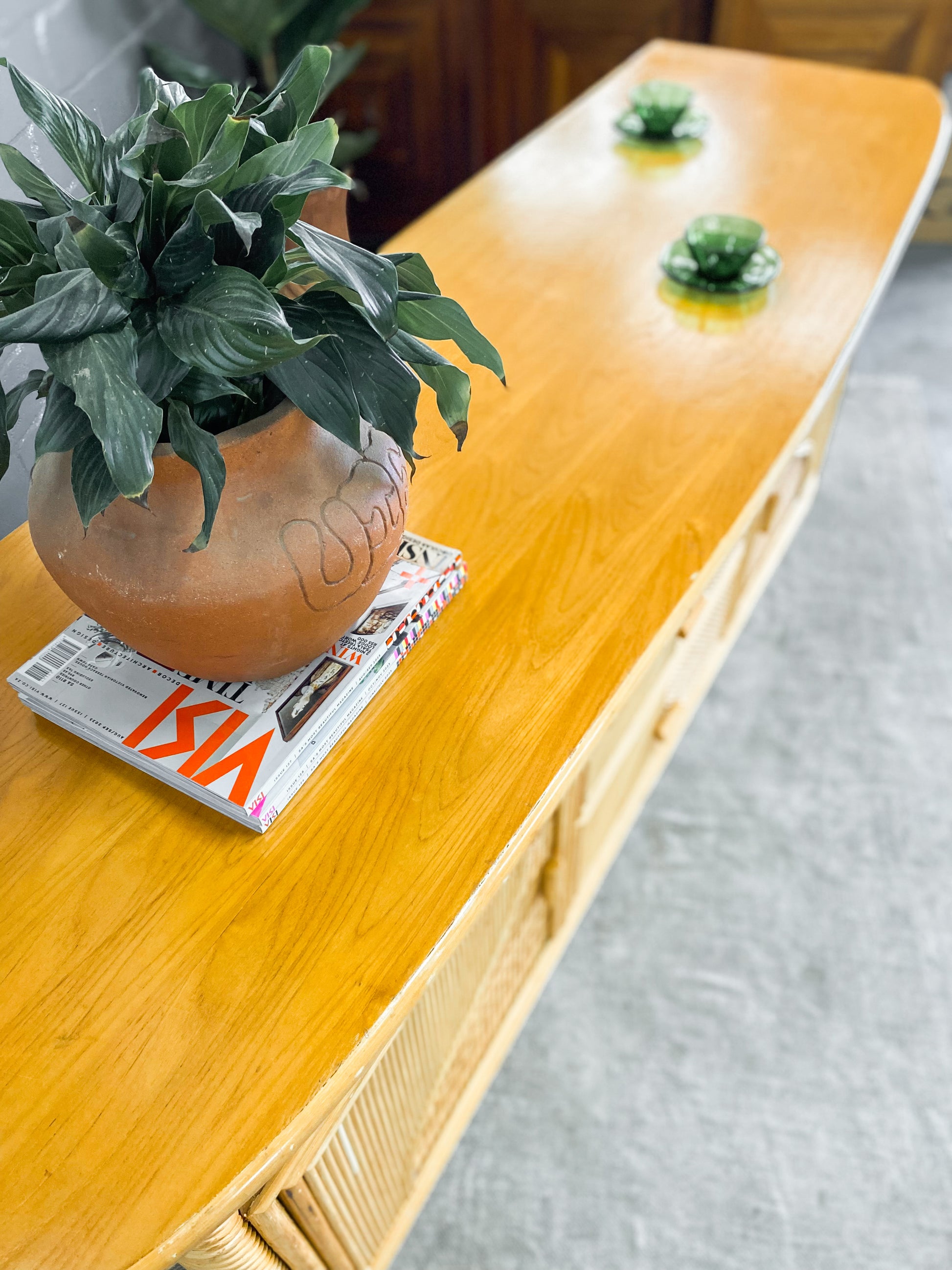 Exuding timeless elegance, this stunning cane and wood sideboard is a masterpiece of craftsmanship, showcasing intricate woven wicker and cane rod detailing. With its blend of natural materials and delicate design elements, this piece adds a touch of artisanal beauty to any room. The warm tones of the wood impart a sense of inviting warmth, while its boho charm infuses the space with personality and style. Whether placed in a living room, dining area, or entryway, this sideboard becomes a focal point. Its has ample storage space divided between 2 spacious drawers and 2 cabinets.