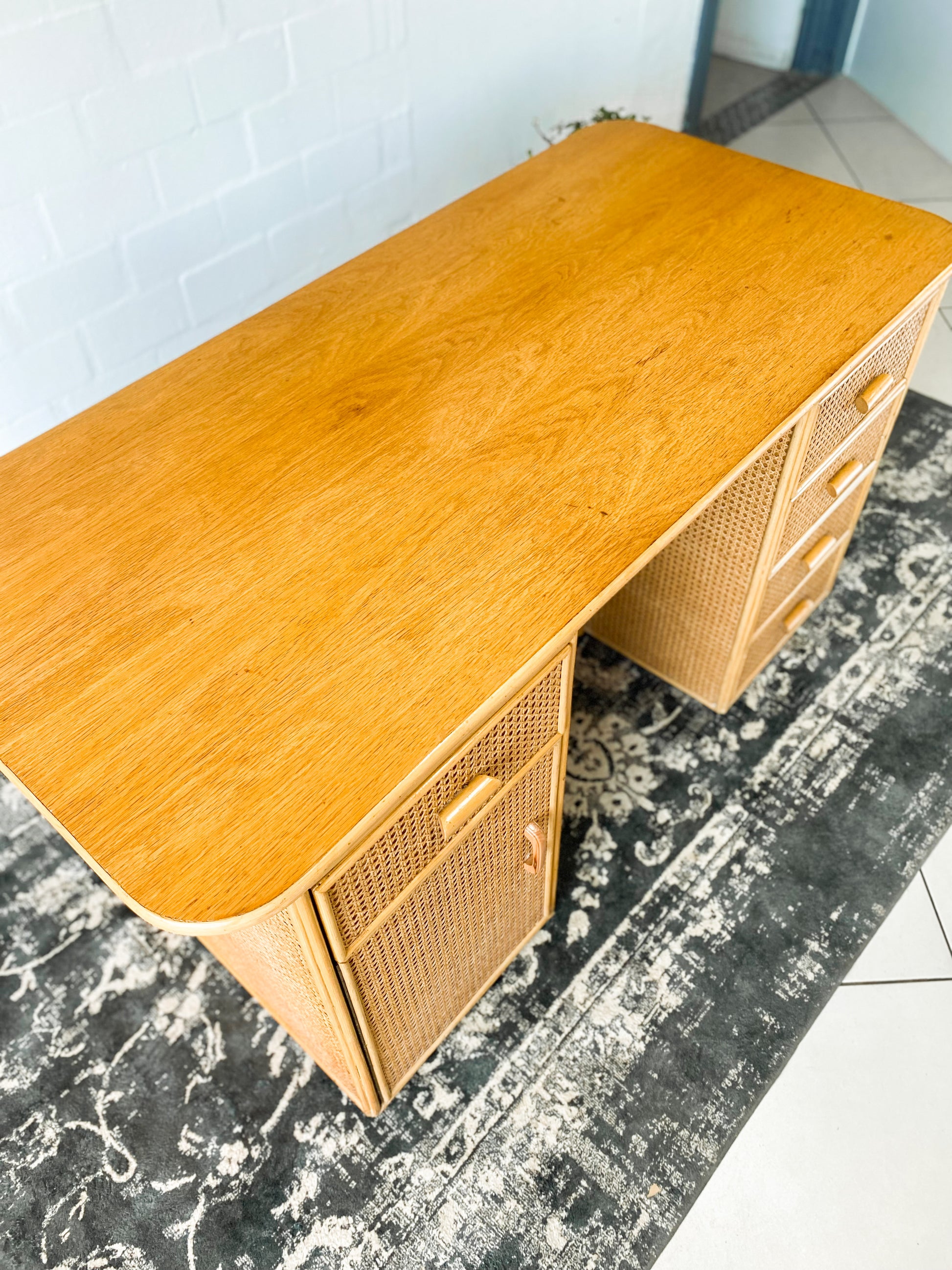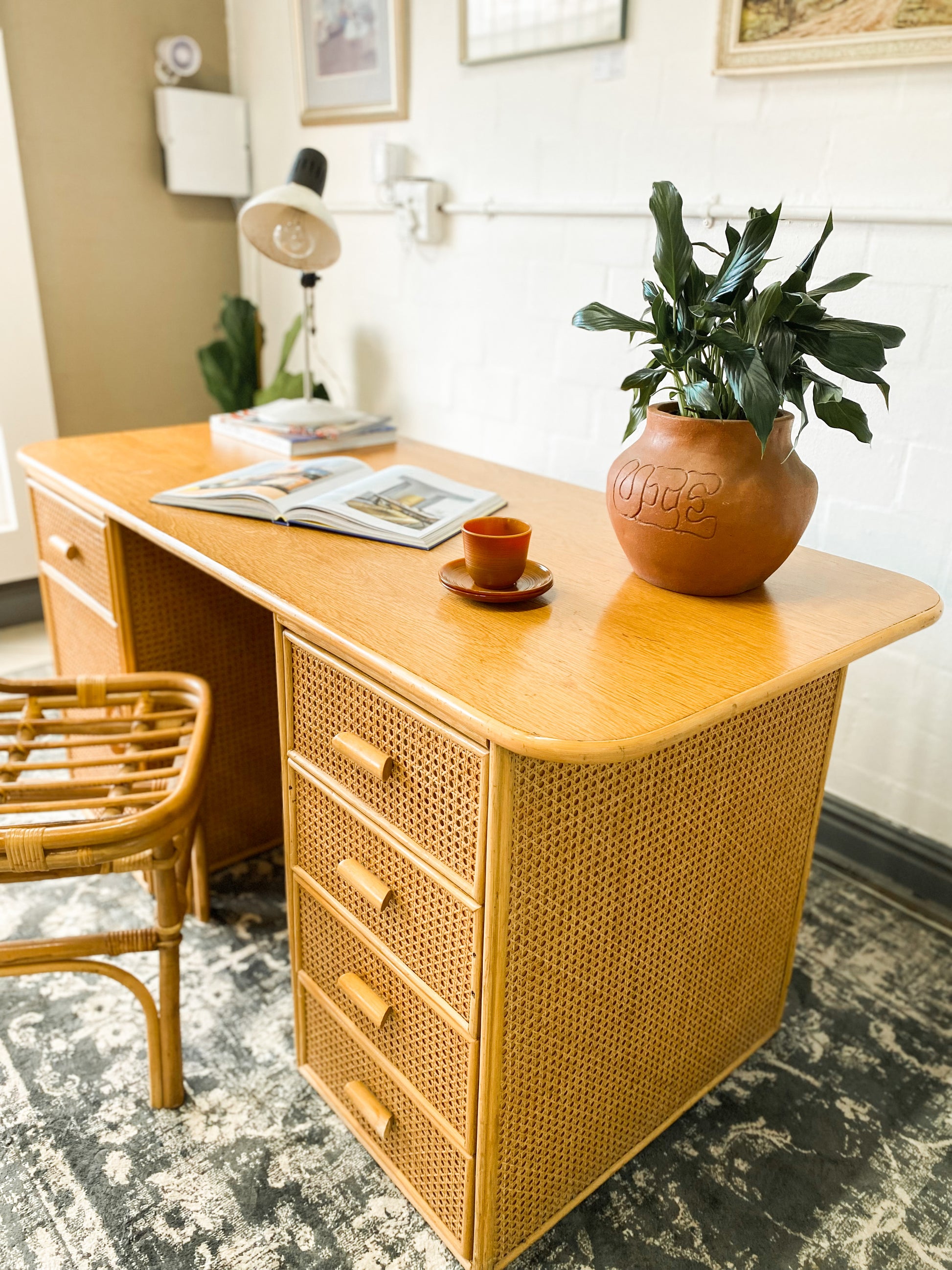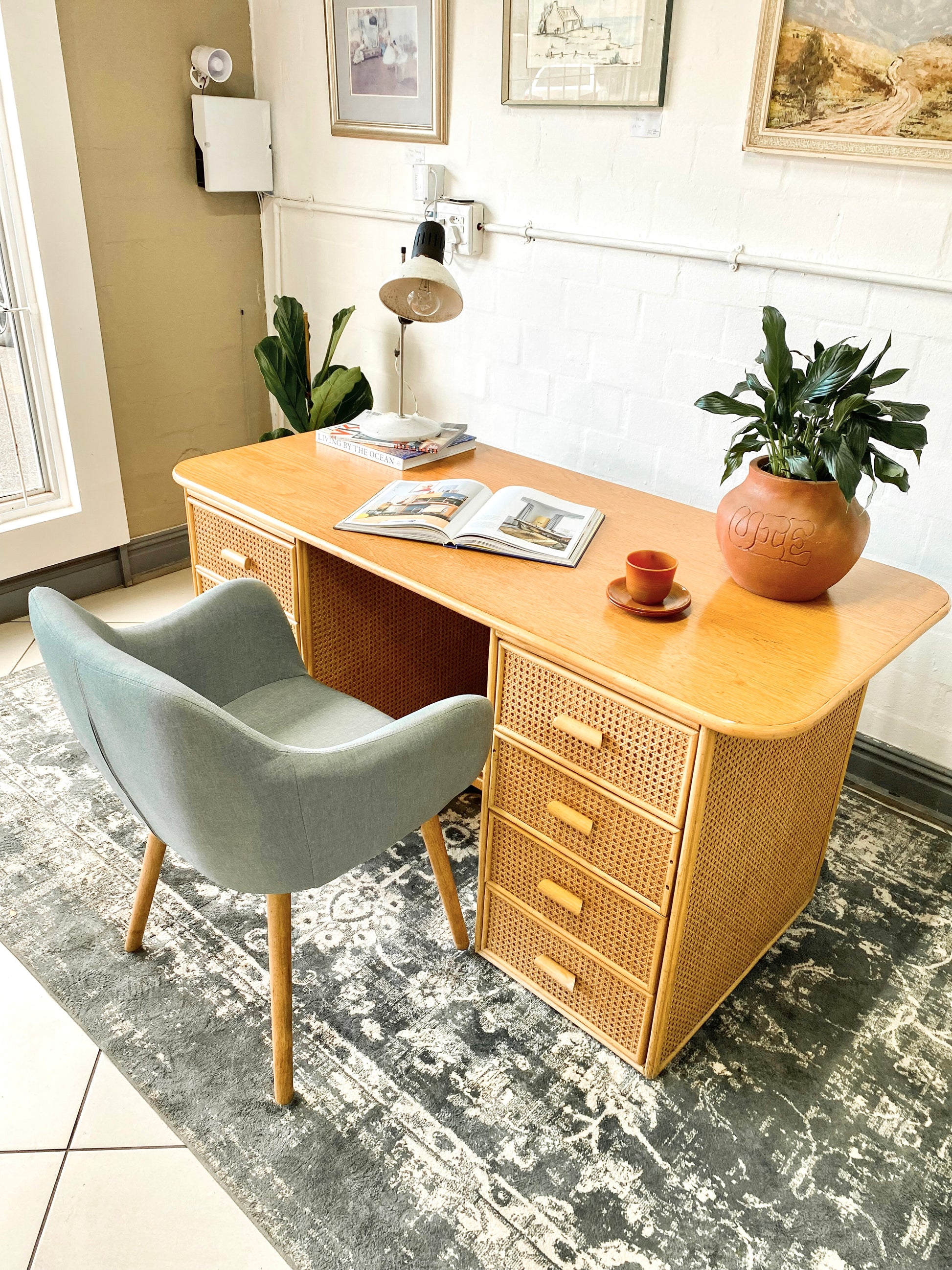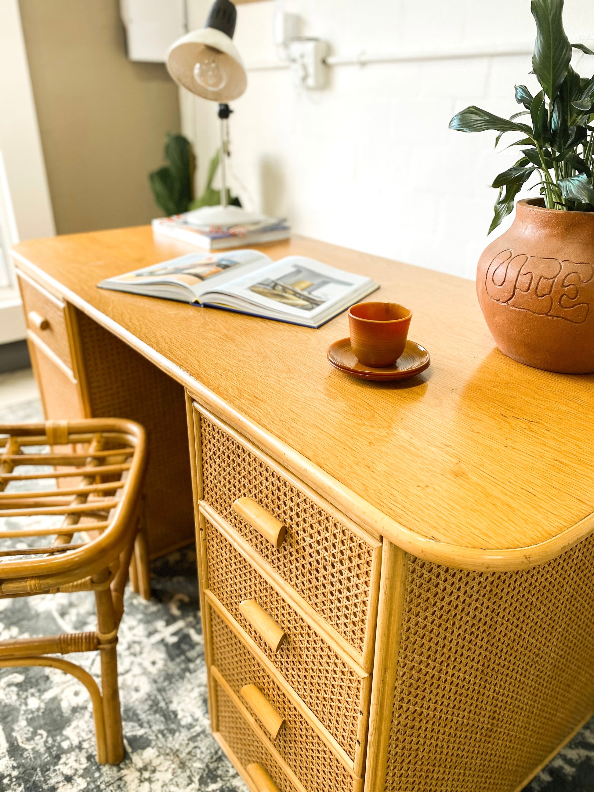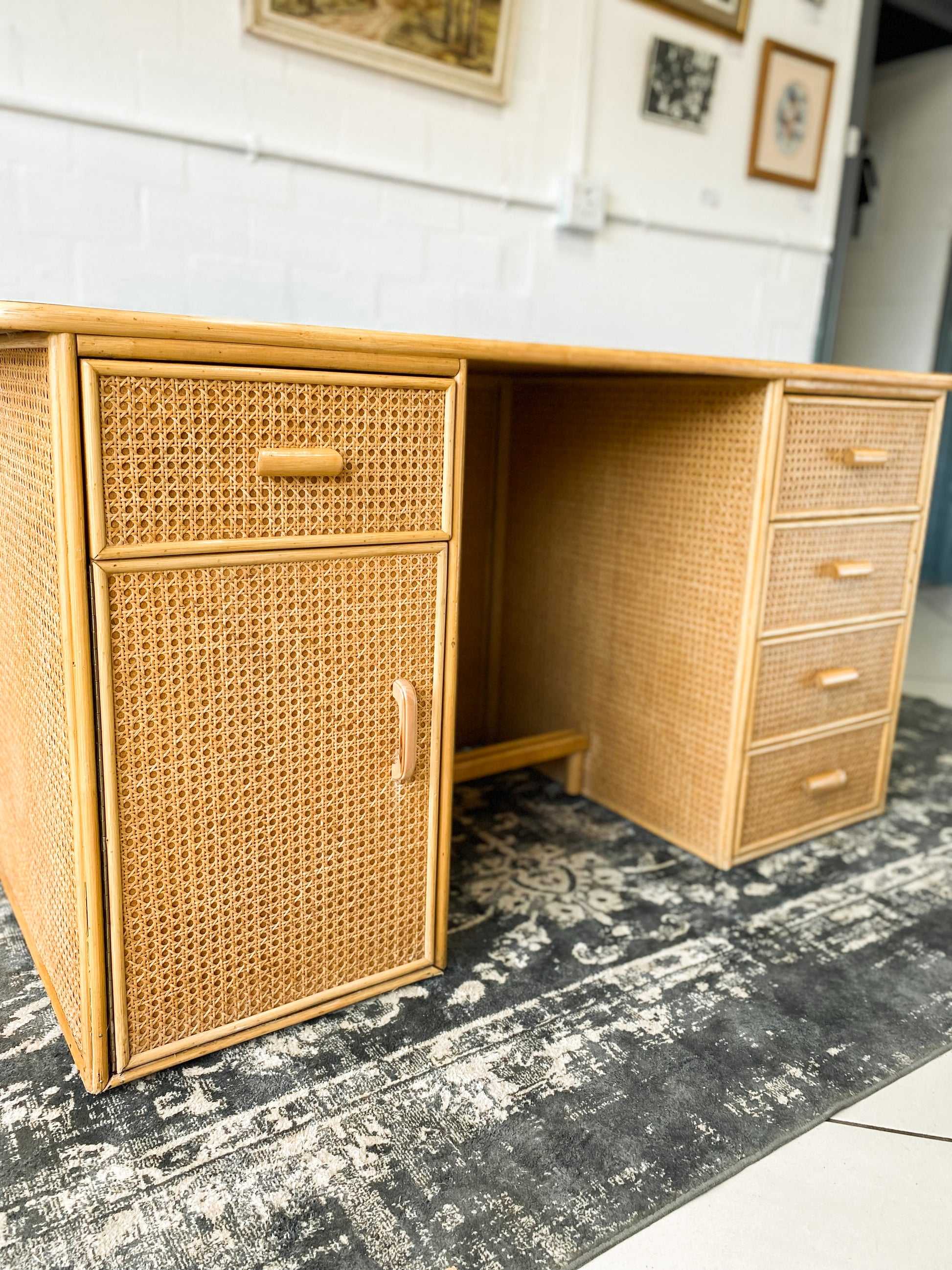 Create and innovate seamlessly with this beautiful Cane Desk. This exquisite piece offers five drawers and a cabinet adorned with cane webbing and rattan accents. Its wood top and fully enclosed cane back provide plenty of space and a captivating bohemian workspace feel.