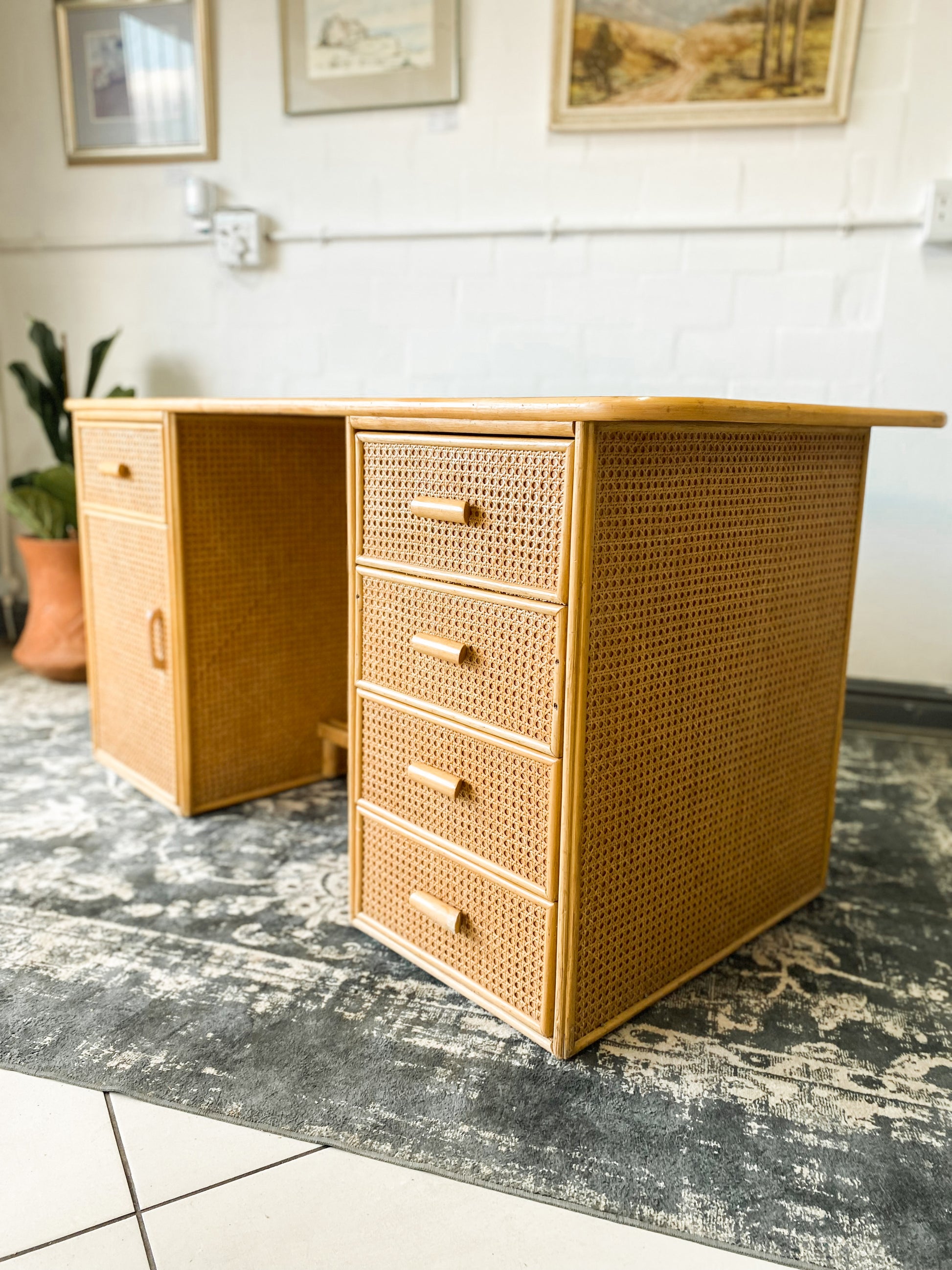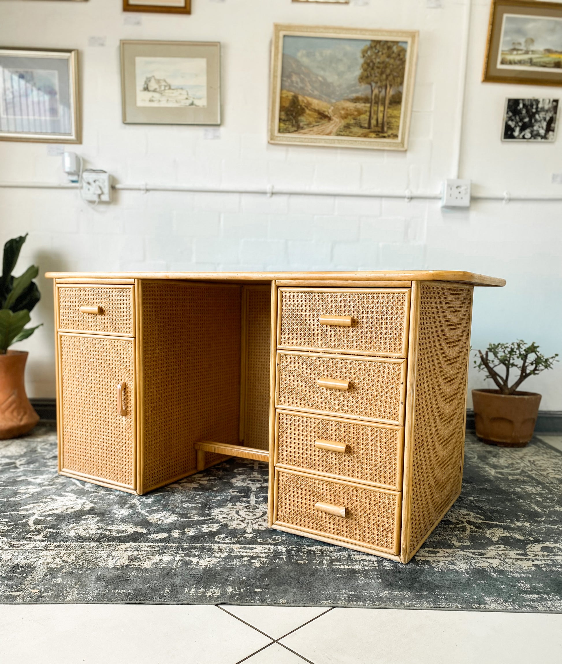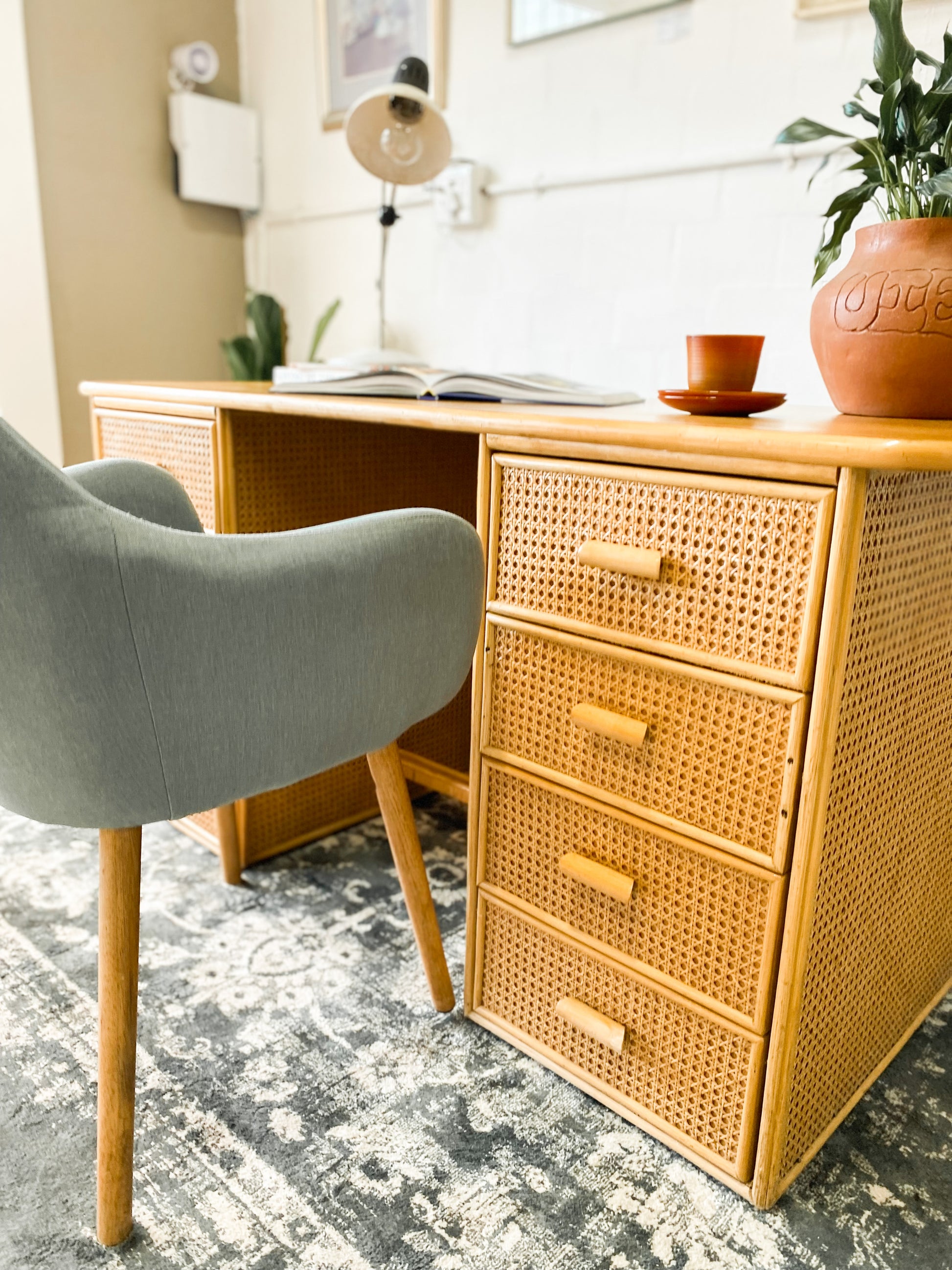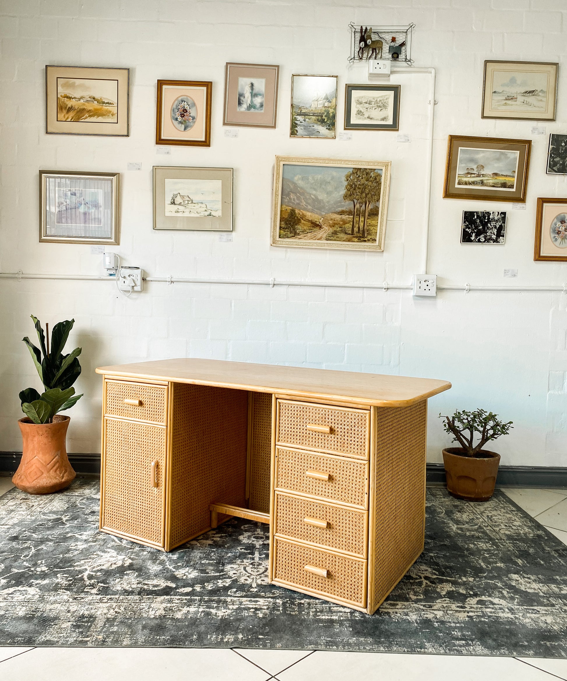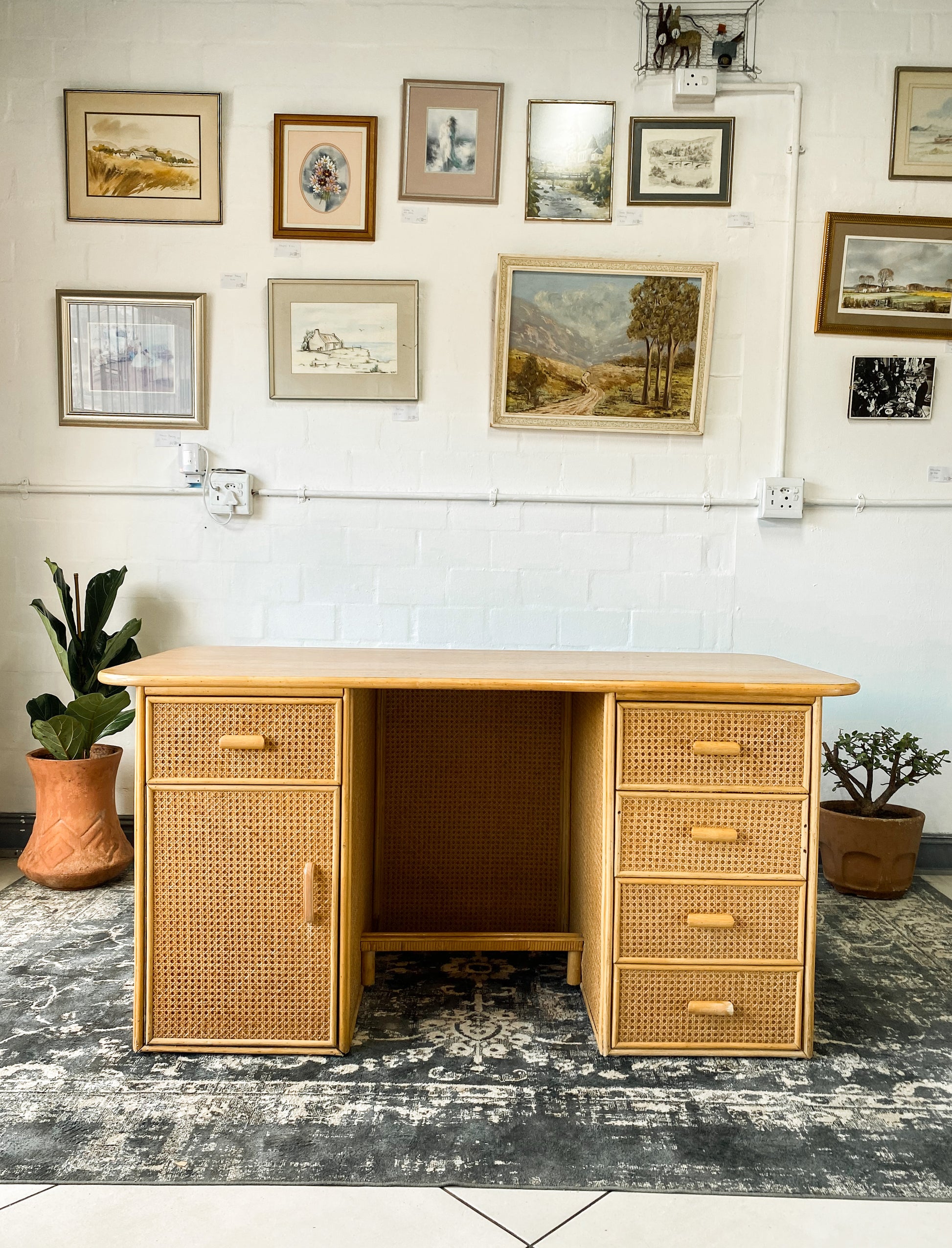 Create and innovate seamlessly with this beautiful Cane Desk. This exquisite piece offers five drawers and a cabinet adorned with cane webbing and rattan accents. Its wood top and fully enclosed cane back provide plenty of space and a captivating bohemian workspace feel.