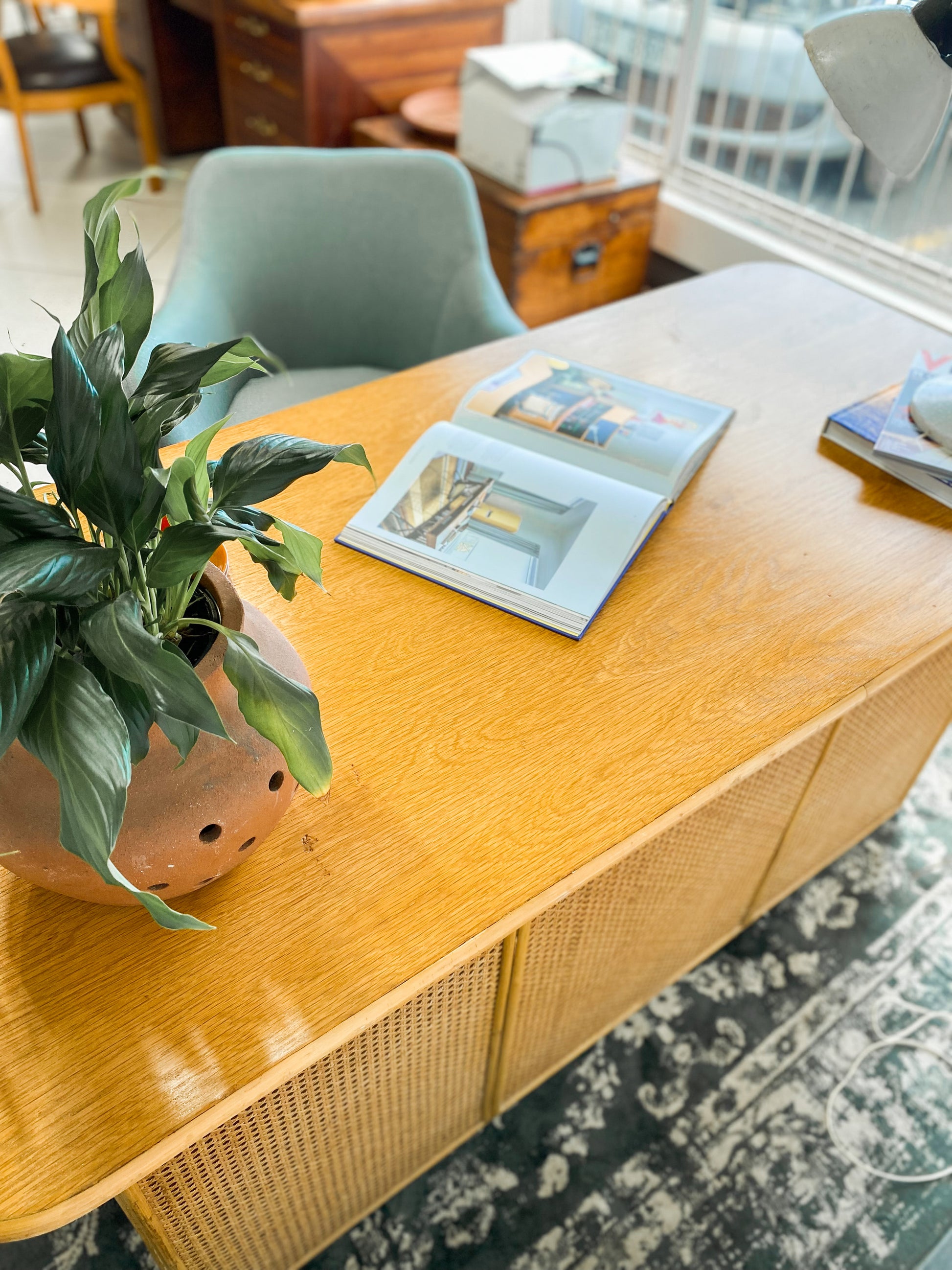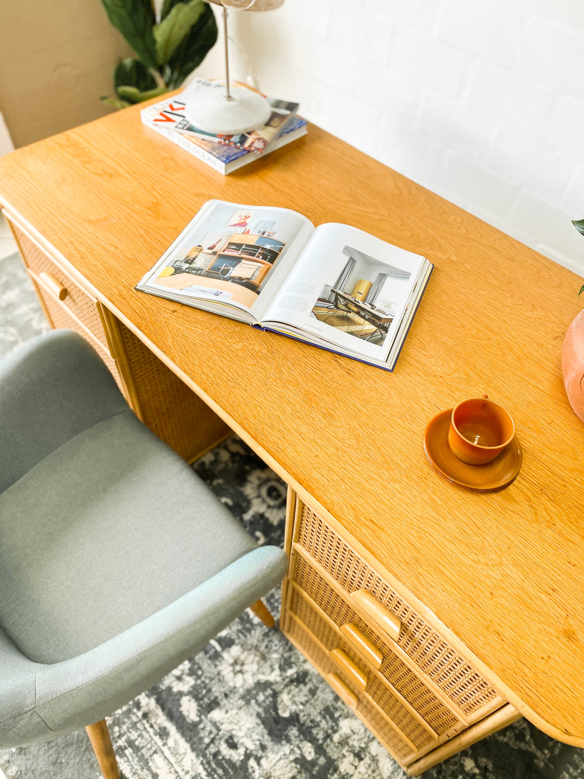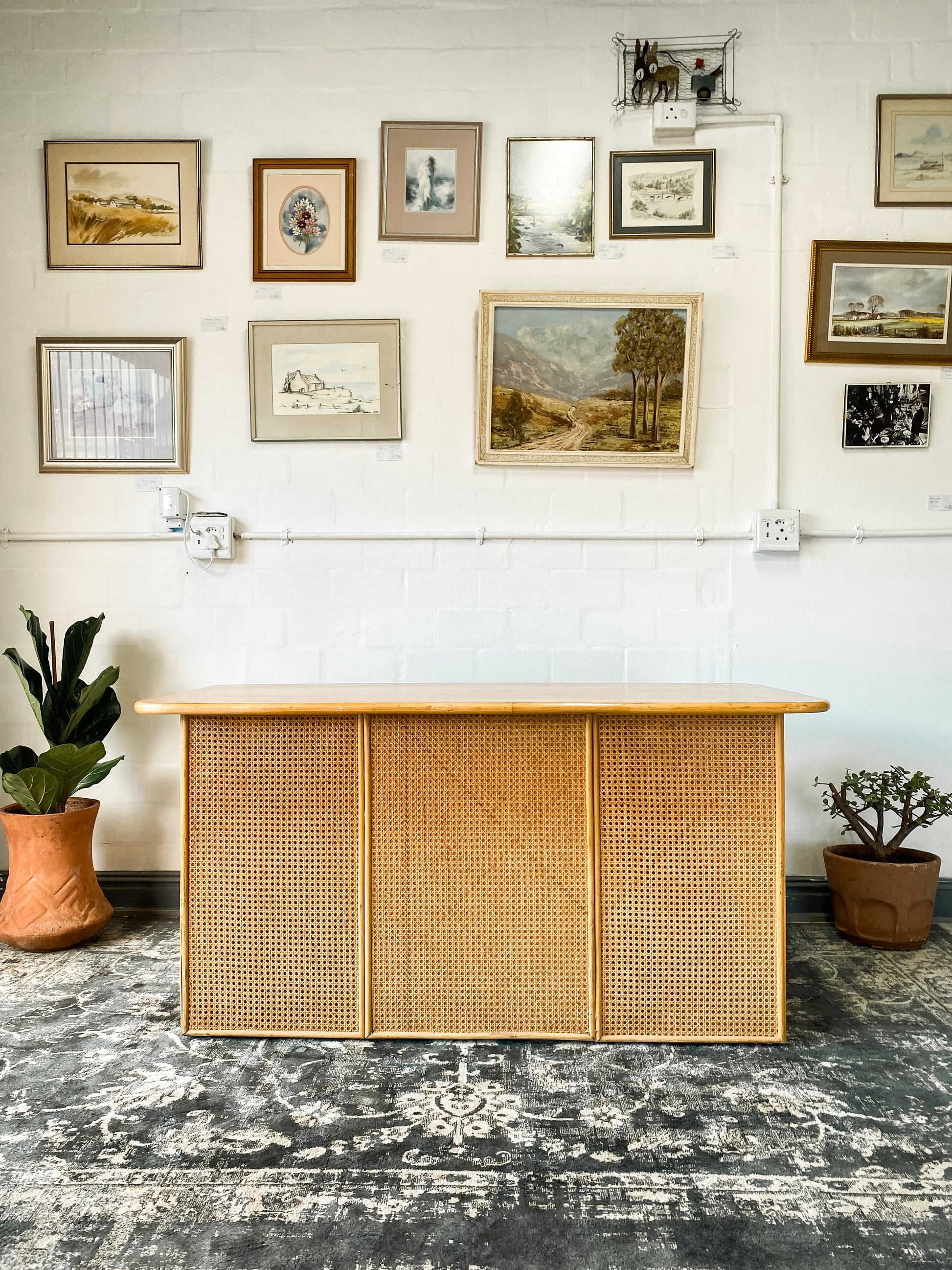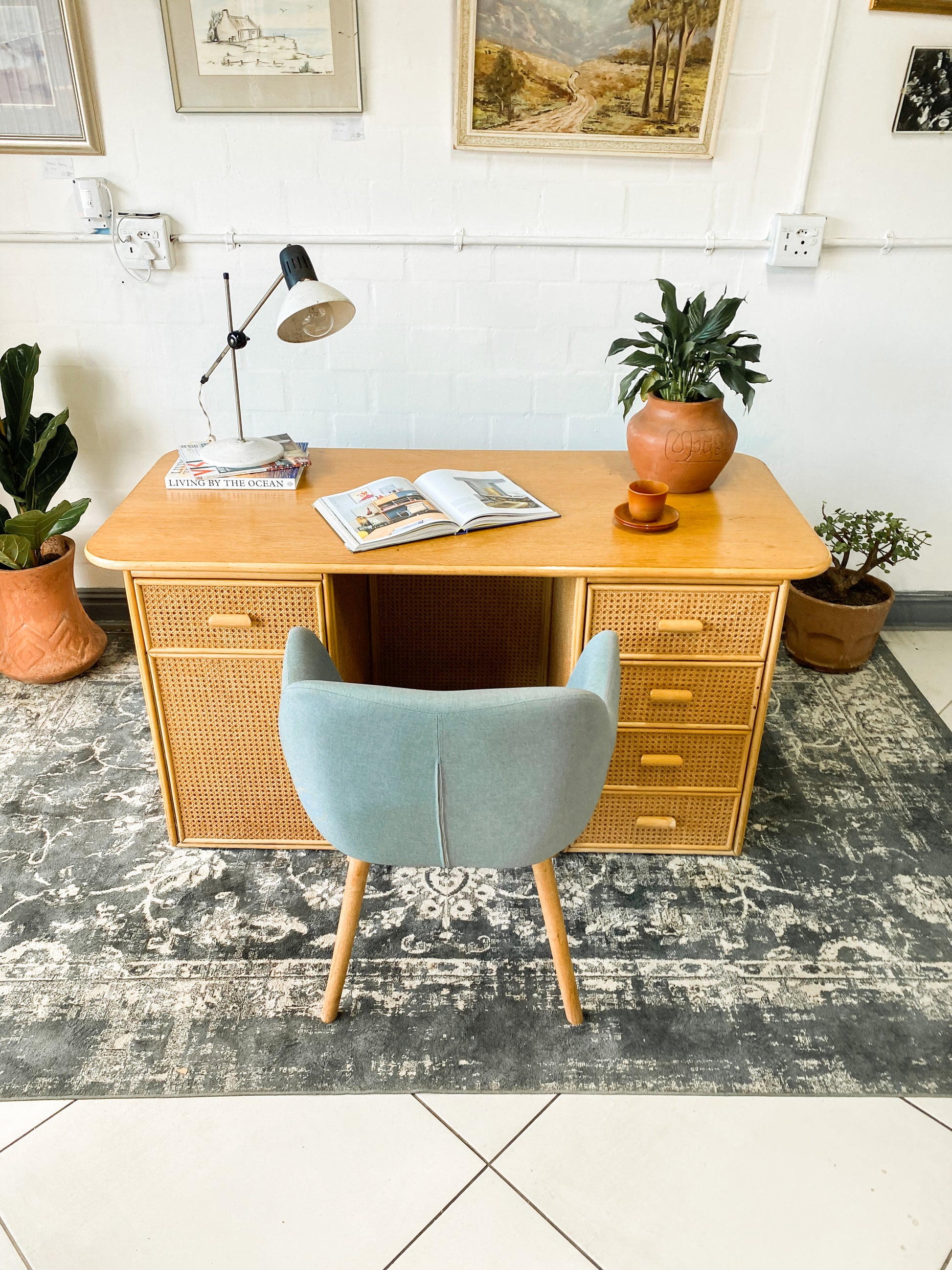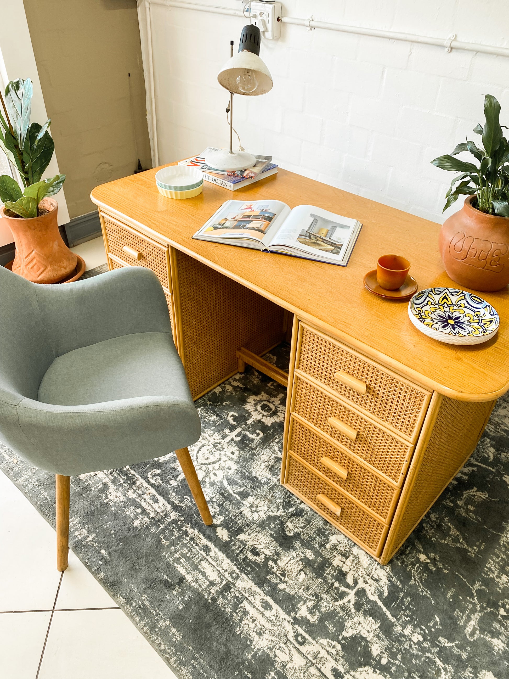 Create and innovate seamlessly with this beautiful Cane Desk. This exquisite piece offers five drawers and a cabinet adorned with cane webbing and rattan accents. Its wood top and fully enclosed cane back provide plenty of space and a captivating bohemian workspace feel.