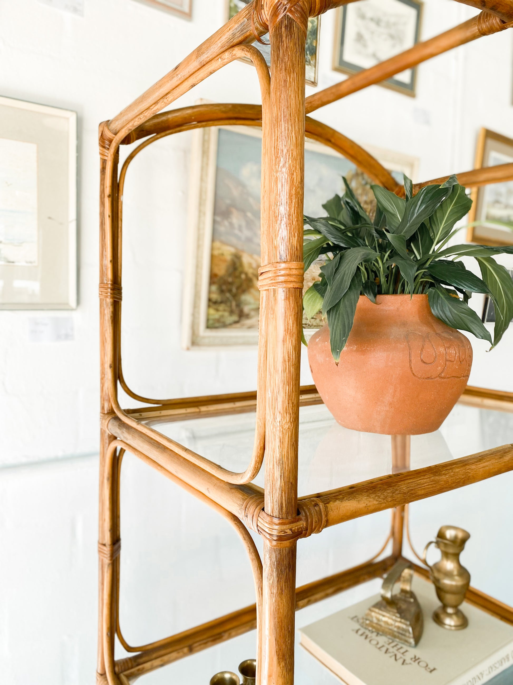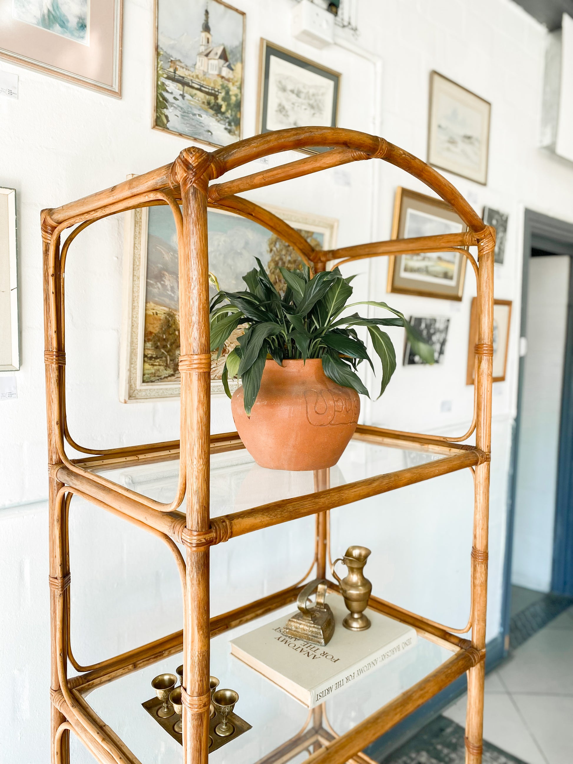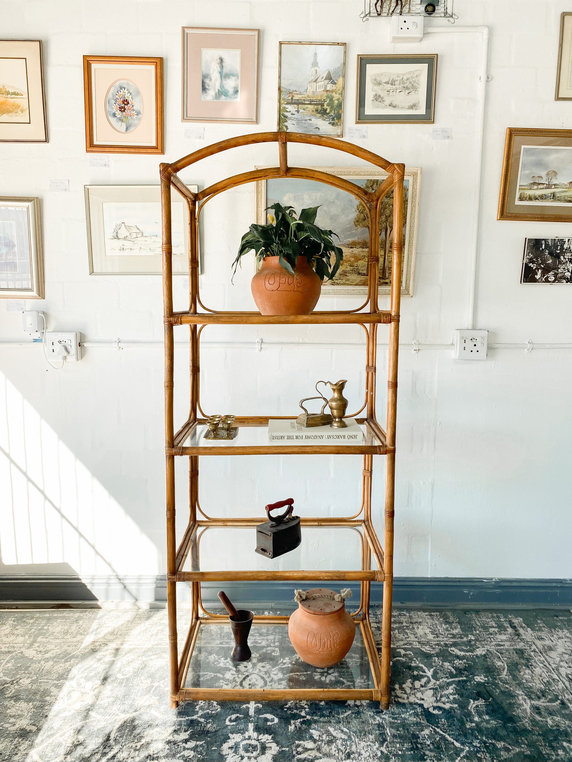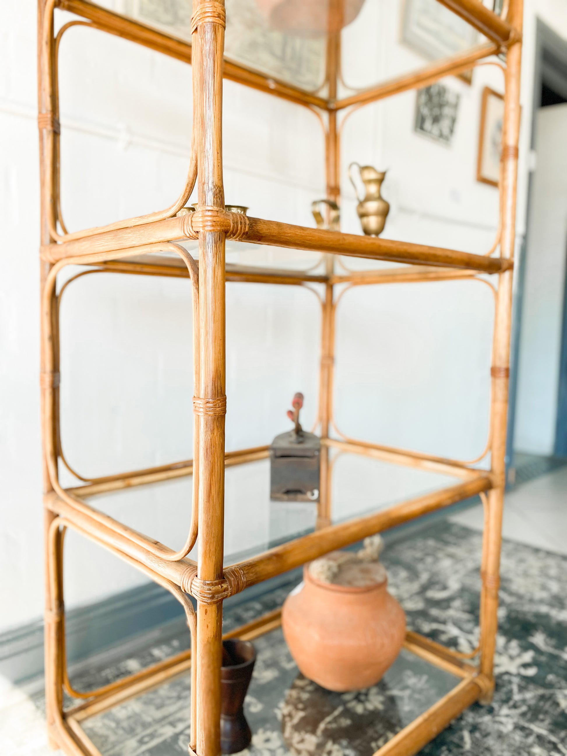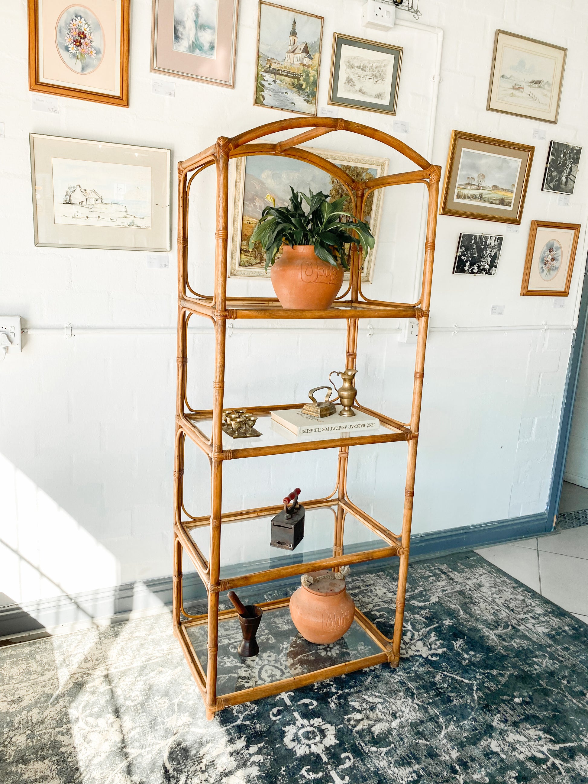 Light and airy cane display shelf and. This piece boasts alluring curves that are bound to add a touch of elegance to any space. It comes with four shelves providing ample storage space. The cane has been cleaned and oiled. This unit is ideal for compact spaces that require a light and airy storage solution, and can seamlessly fit into any room, be it a bedroom, living room or even a bathroom.