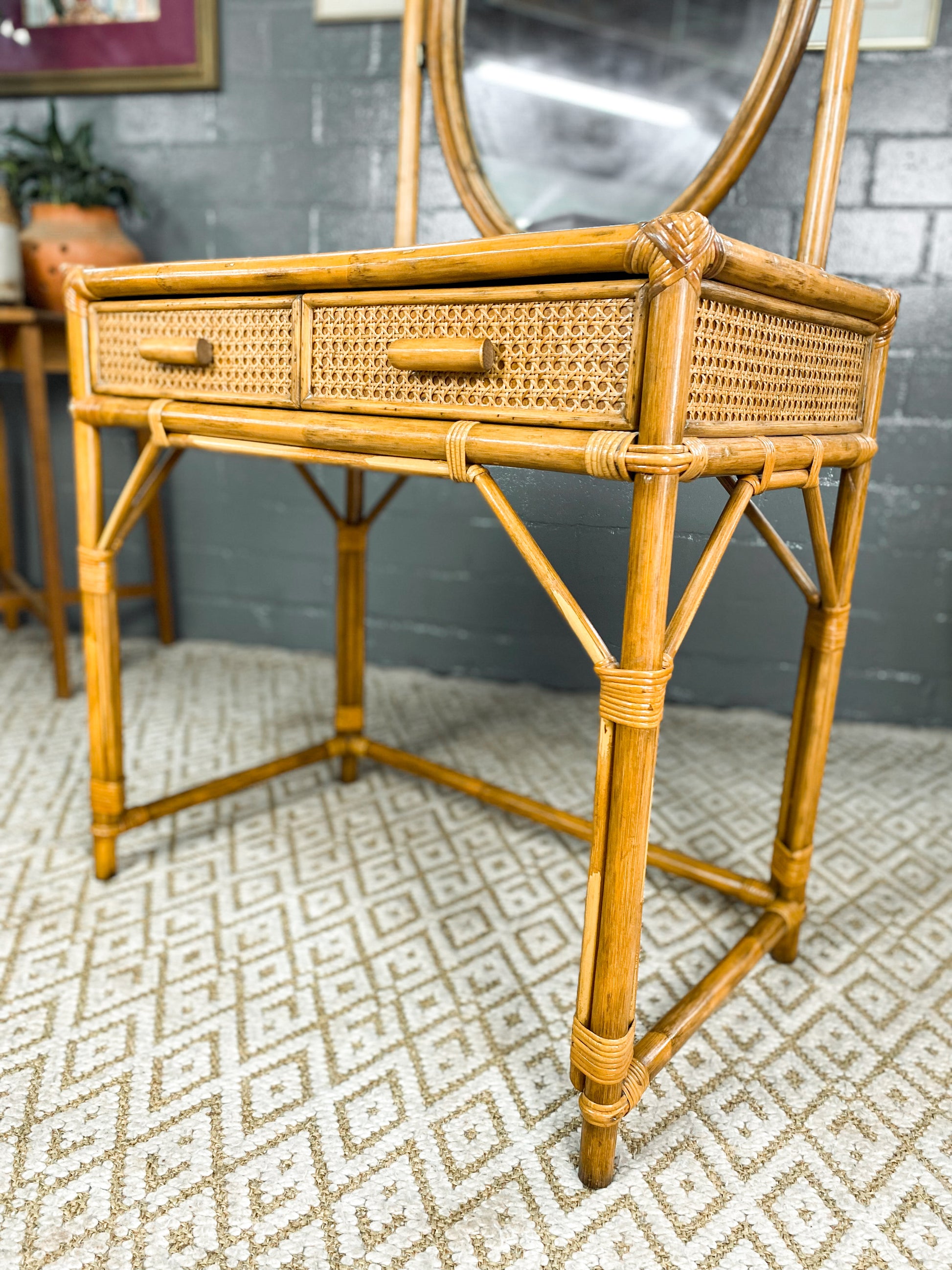 This versatile cane dresser, with its airy design, is a perfect addition to any room. It features a single drawer and a sleek glass top, making it ideal as a vanity, dresser, desk, entry table, or side table. The dresser is complemented by a beautiful round mirror. Its multifunctionality and bright aesthetic make it a standout piece in any space.