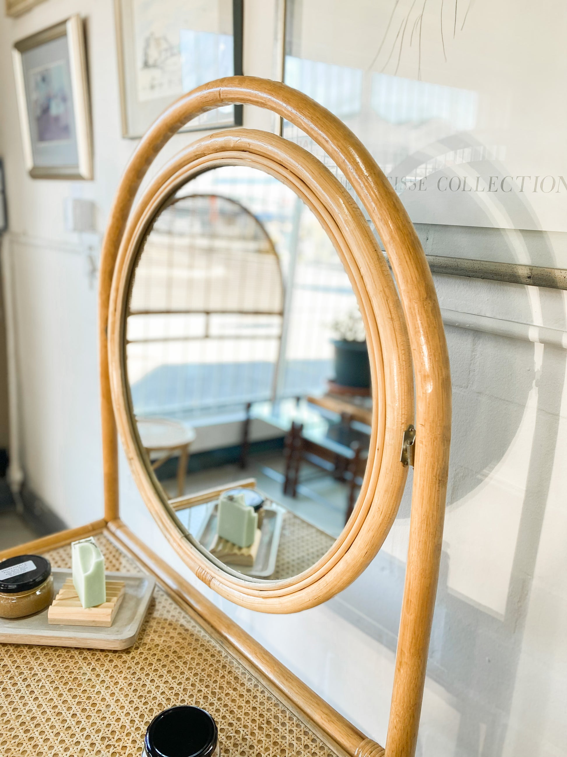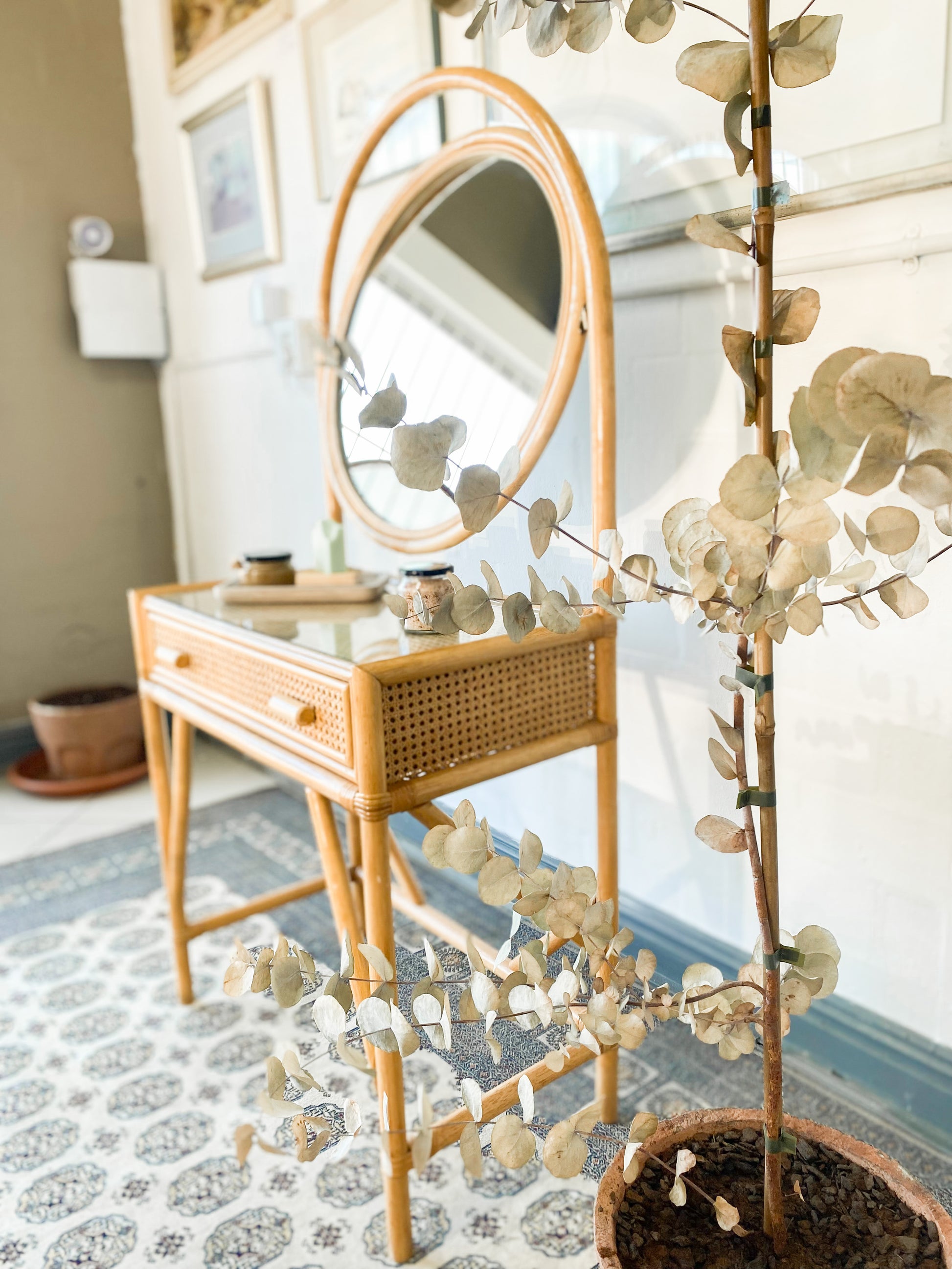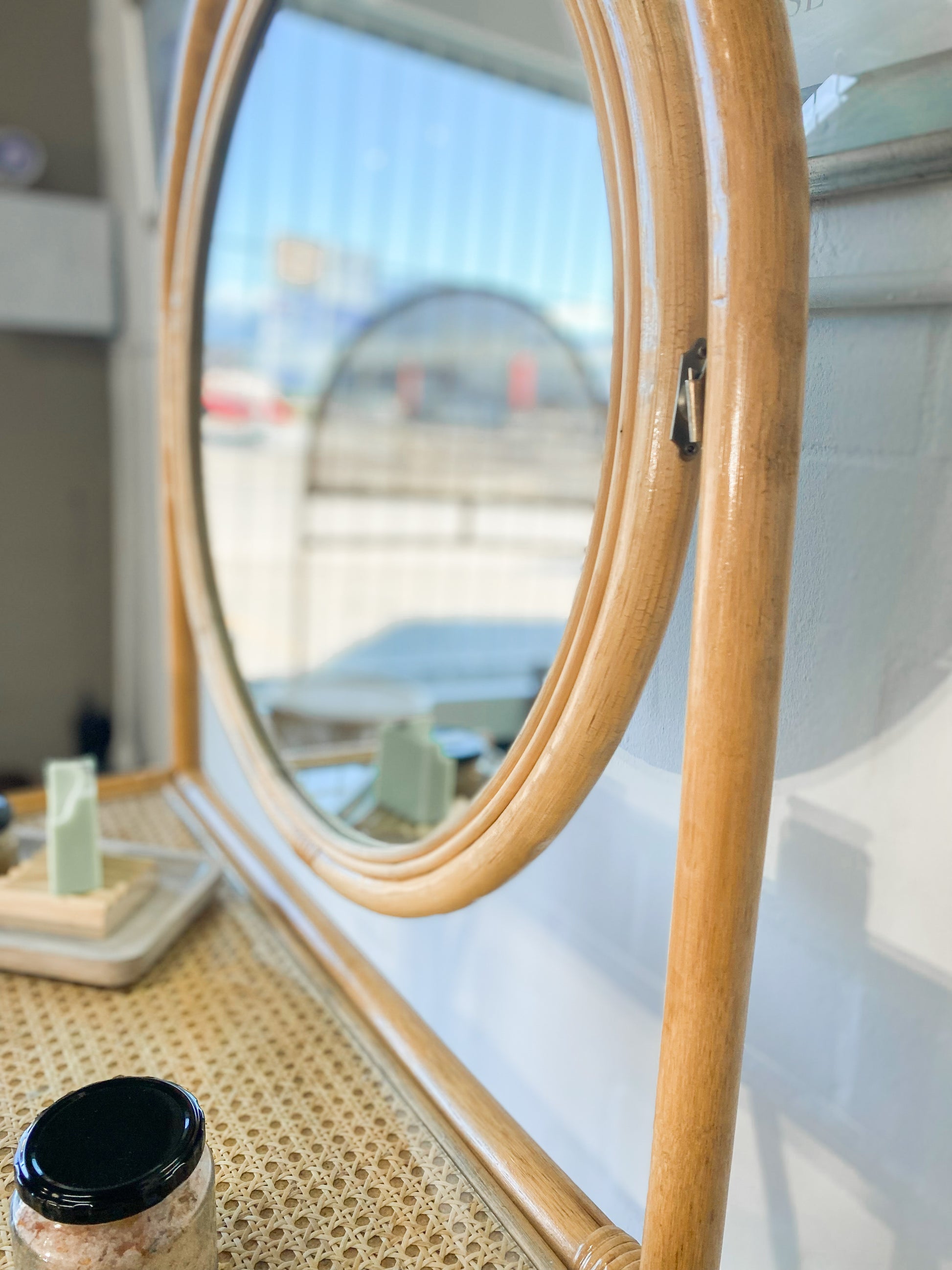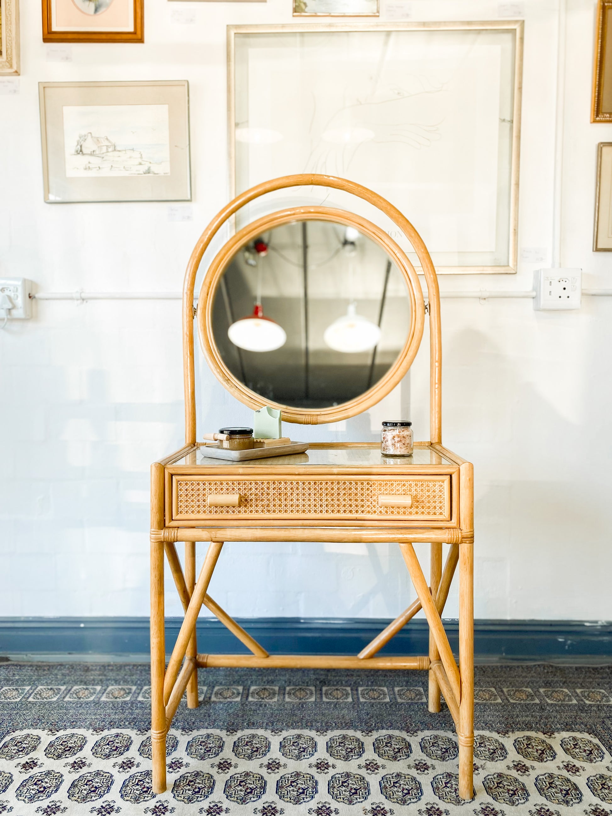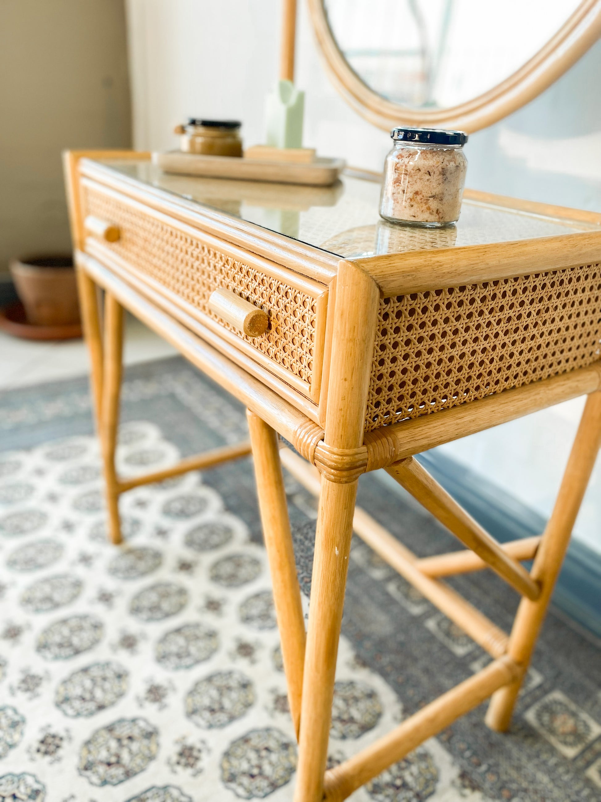 This versatile cane dresser with its airy design is a perfect addition to any room. It features a single drawers and a sleek glass top, making it ideal as a vanity, dresser, desk, entry table, or side table. it flaunts a beautiful round mirror. Its multifunctionality and bright aesthetic makes it a standout piece in any space.
