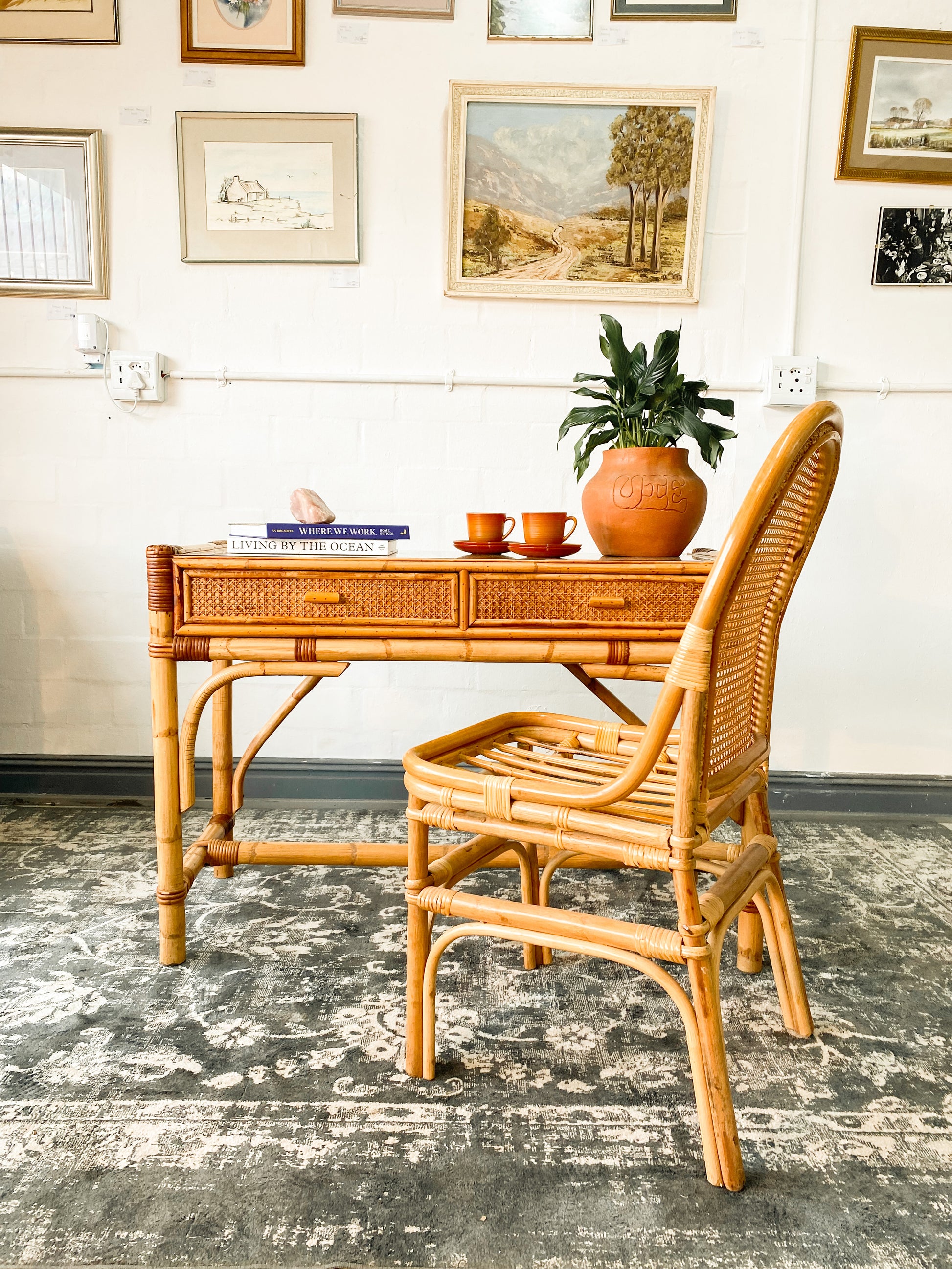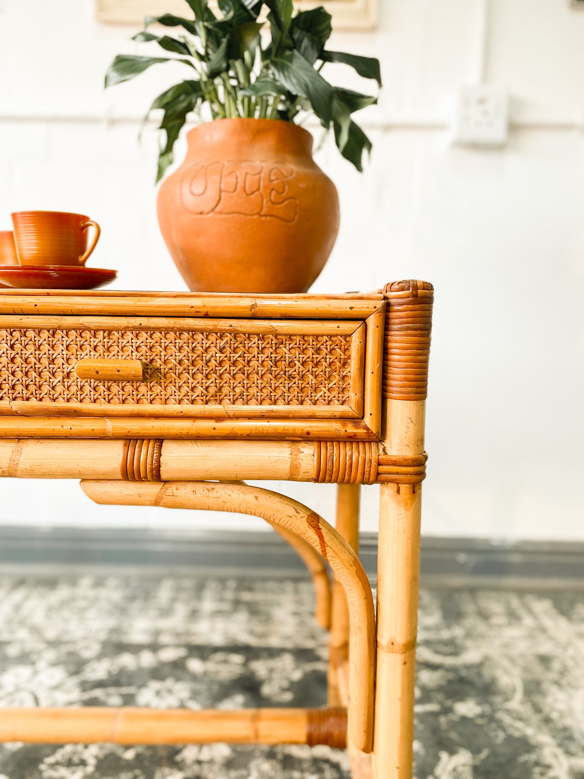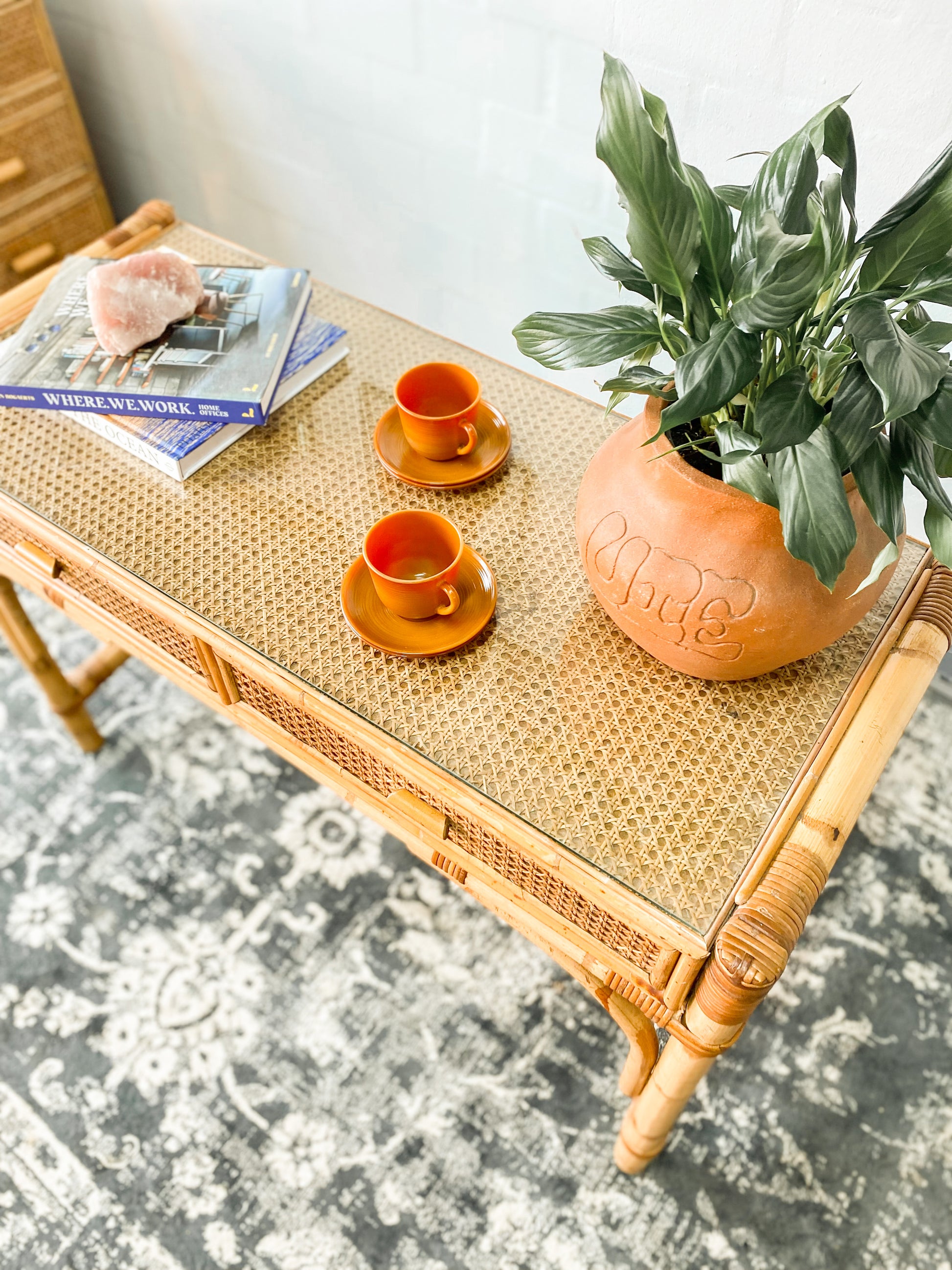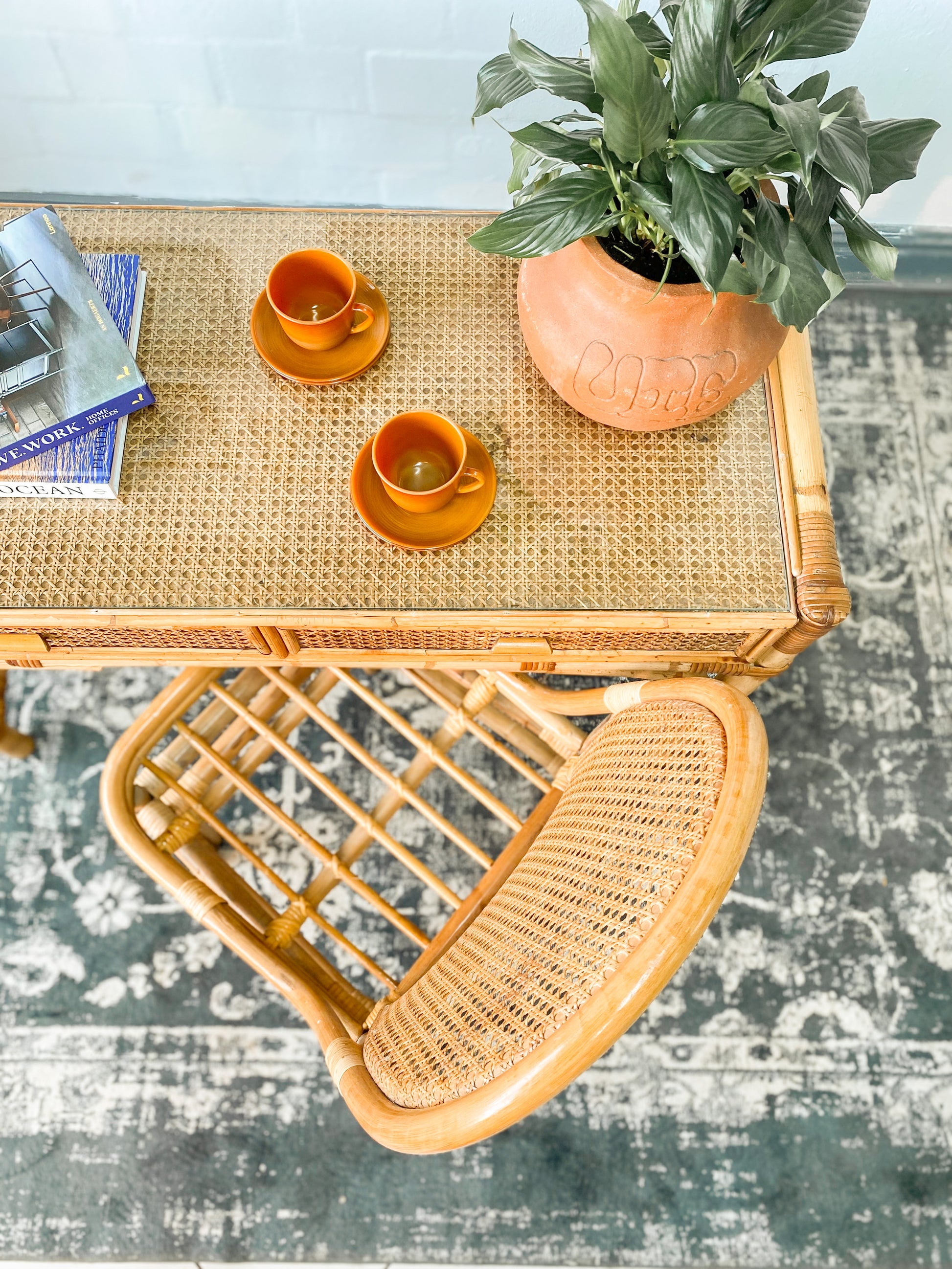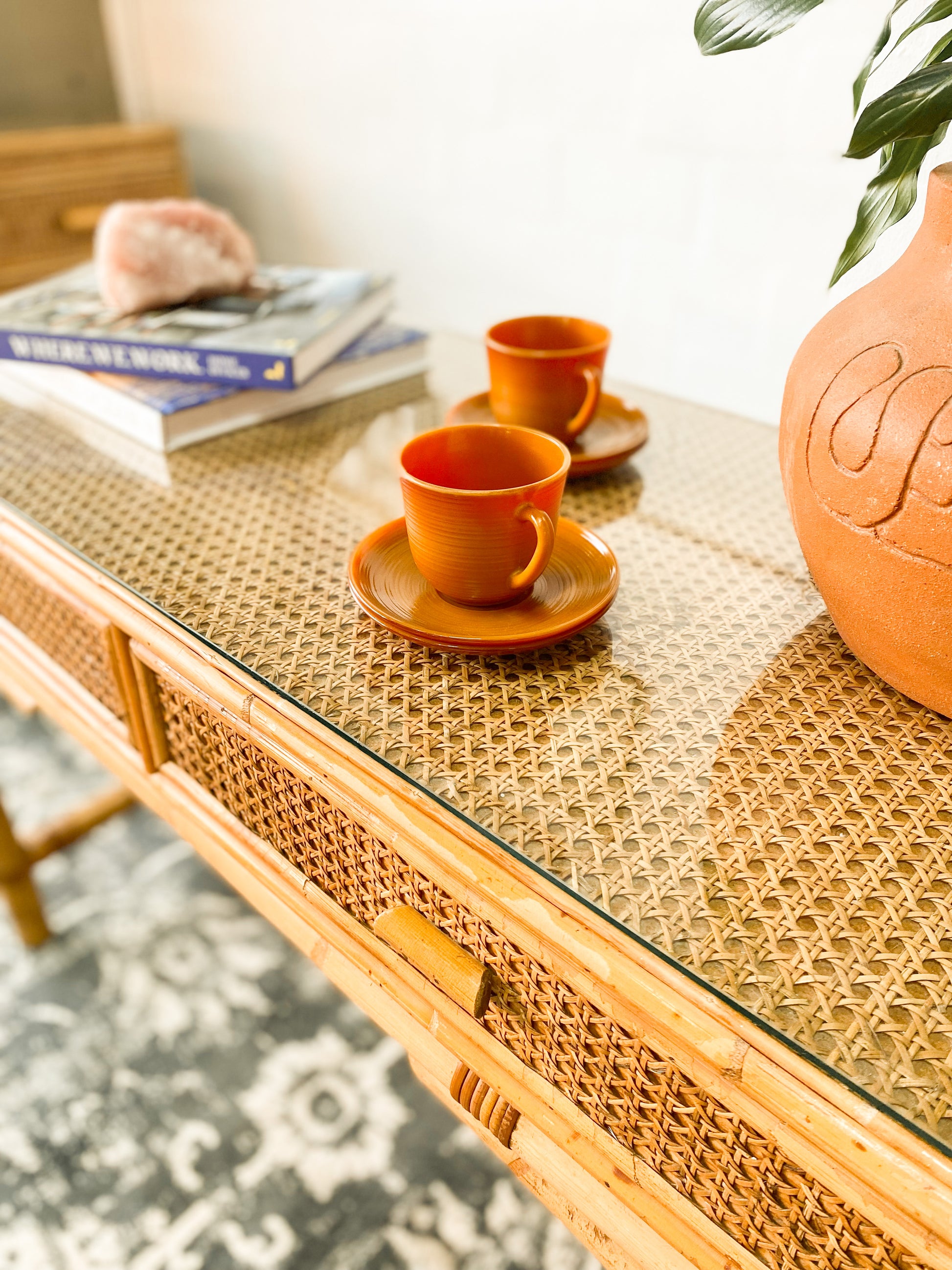 Add charm and flair to any room with this elegant cane dresser. Its multifunctional design with two drawers and a glass top makes it the perfect vanity, dresser, desk, entry table, or side table to suit your specific design needs. Its airy design and bright aesthetic will surely make it a standout piece that you'll love for years to come! It is in fair condition with some age-related marks here and there.