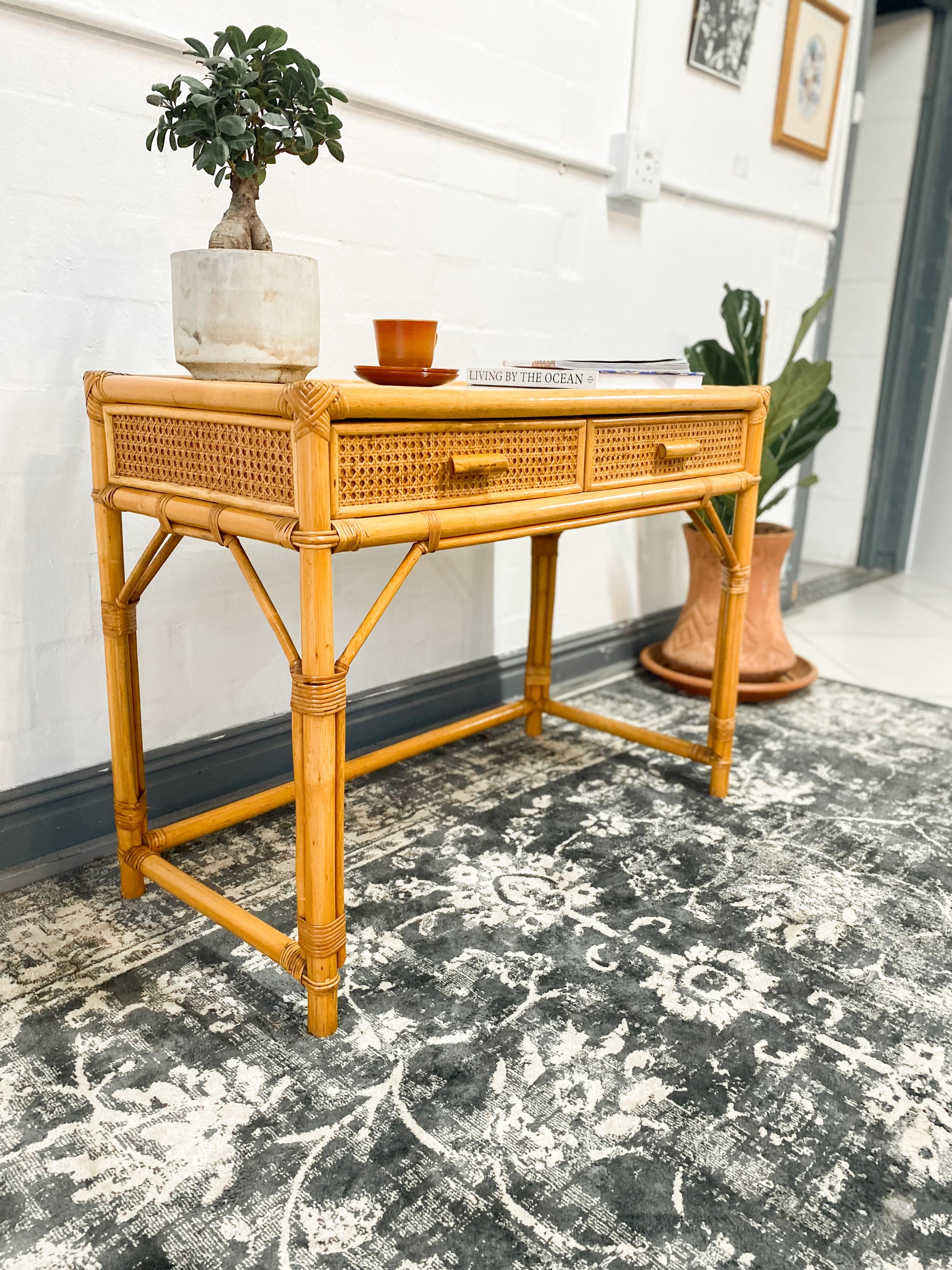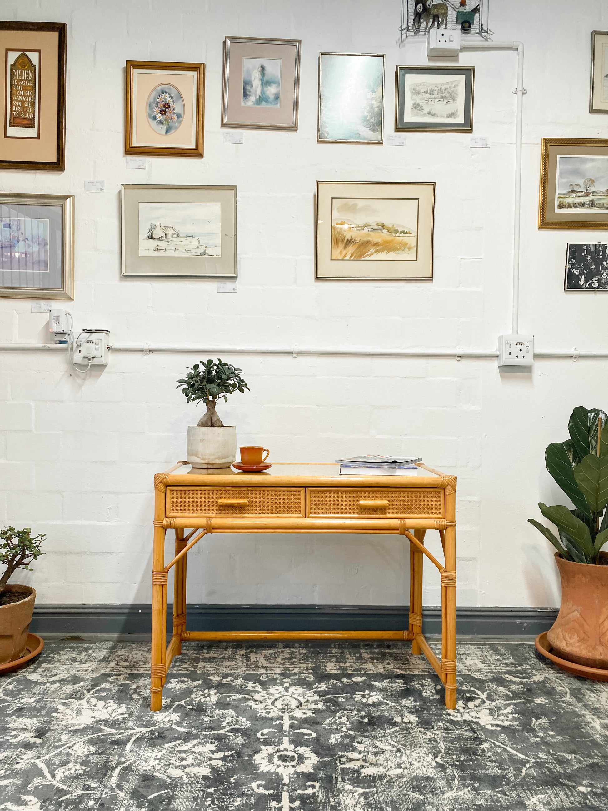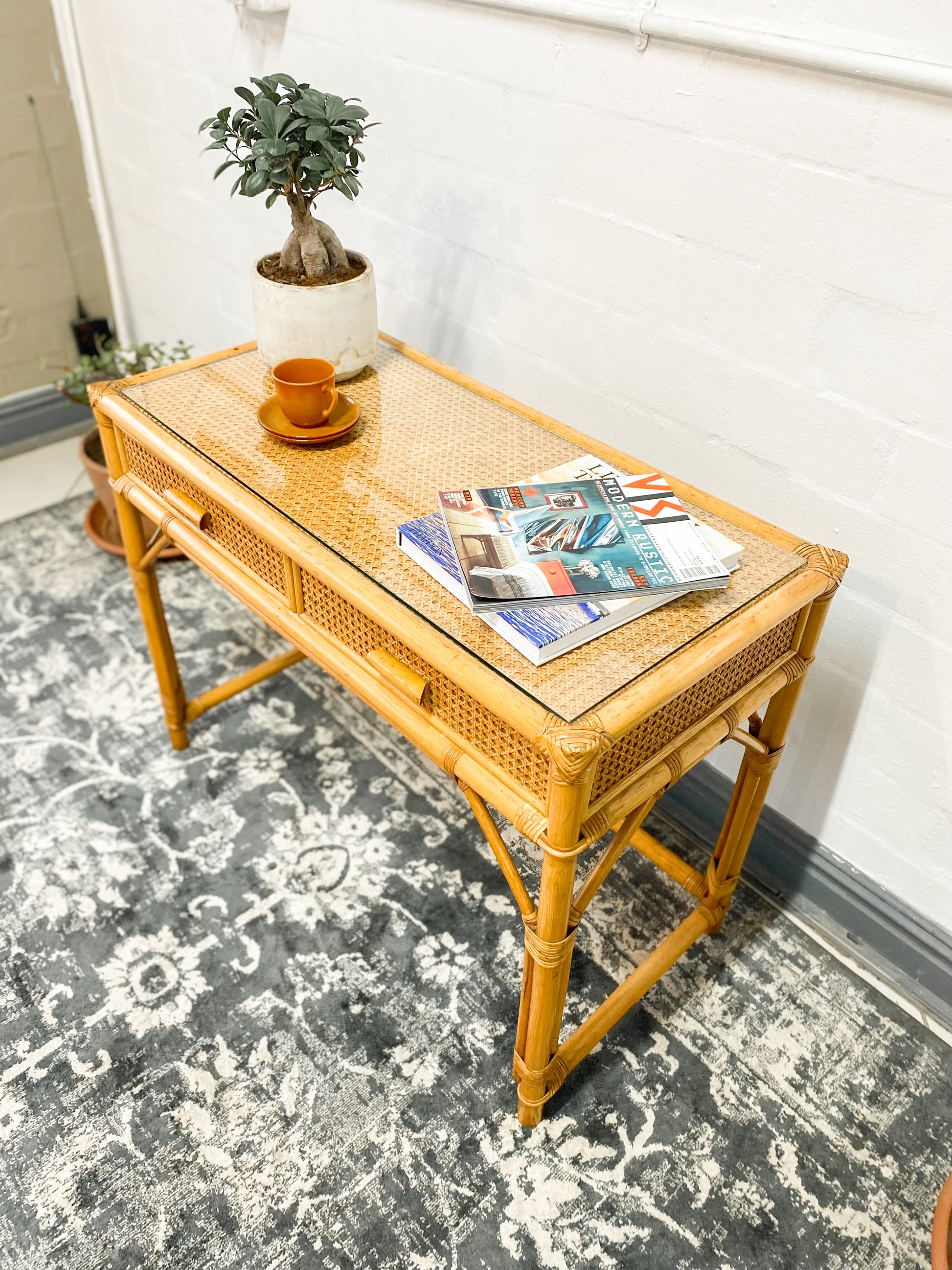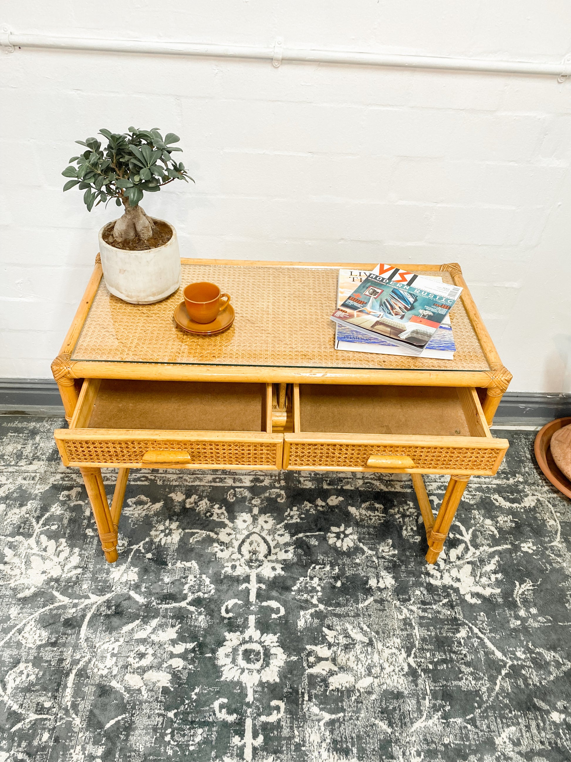 Bring timeless charm and flair to your home with this multifunctional Cane Dresser. Its two drawers, glass top, and bright aesthetic make it perfect for any room as a vanity, dresser, desk, entry table, or side table. It's in good condition with some age-related marks, and will be a standout piece you'll cherish for years.