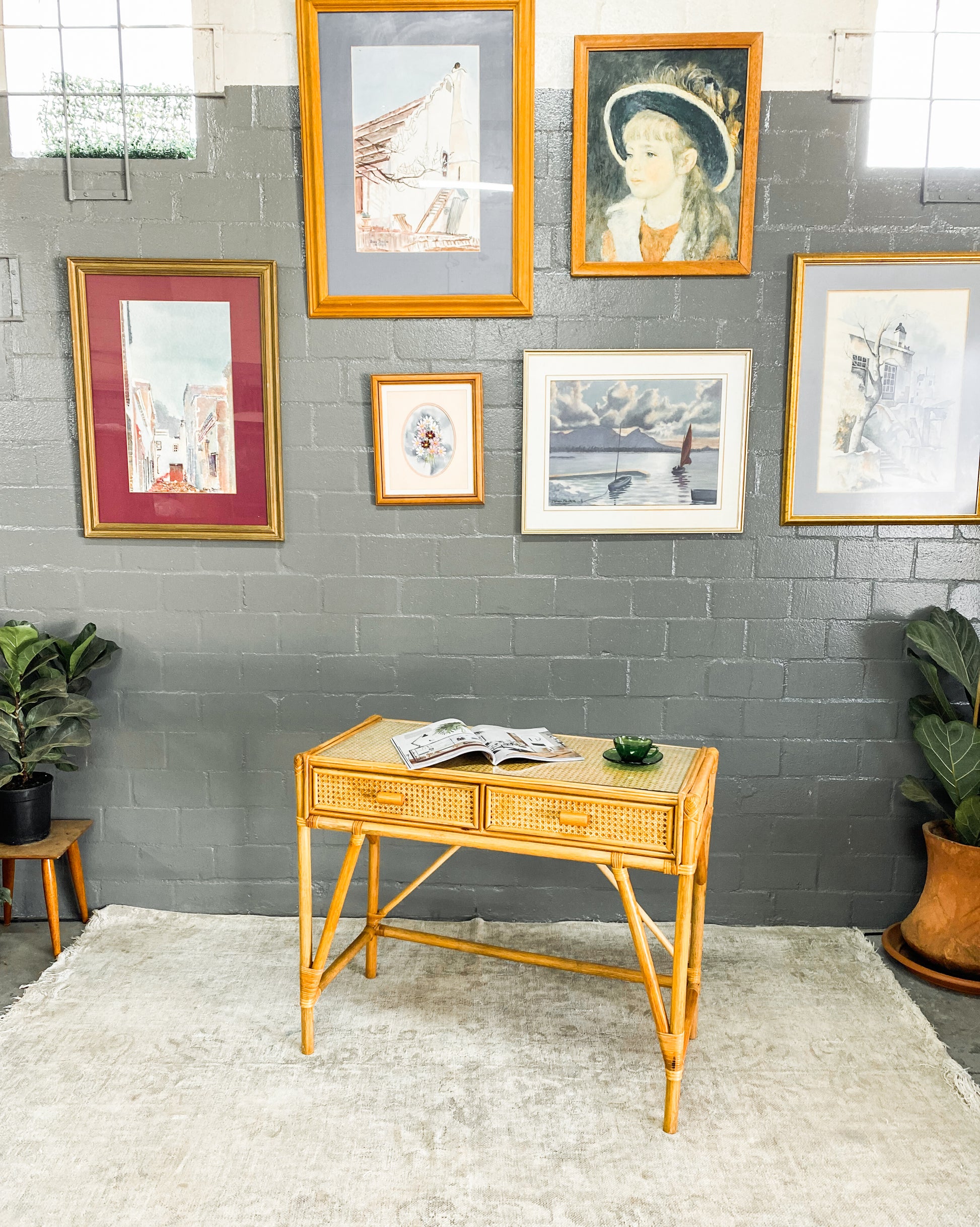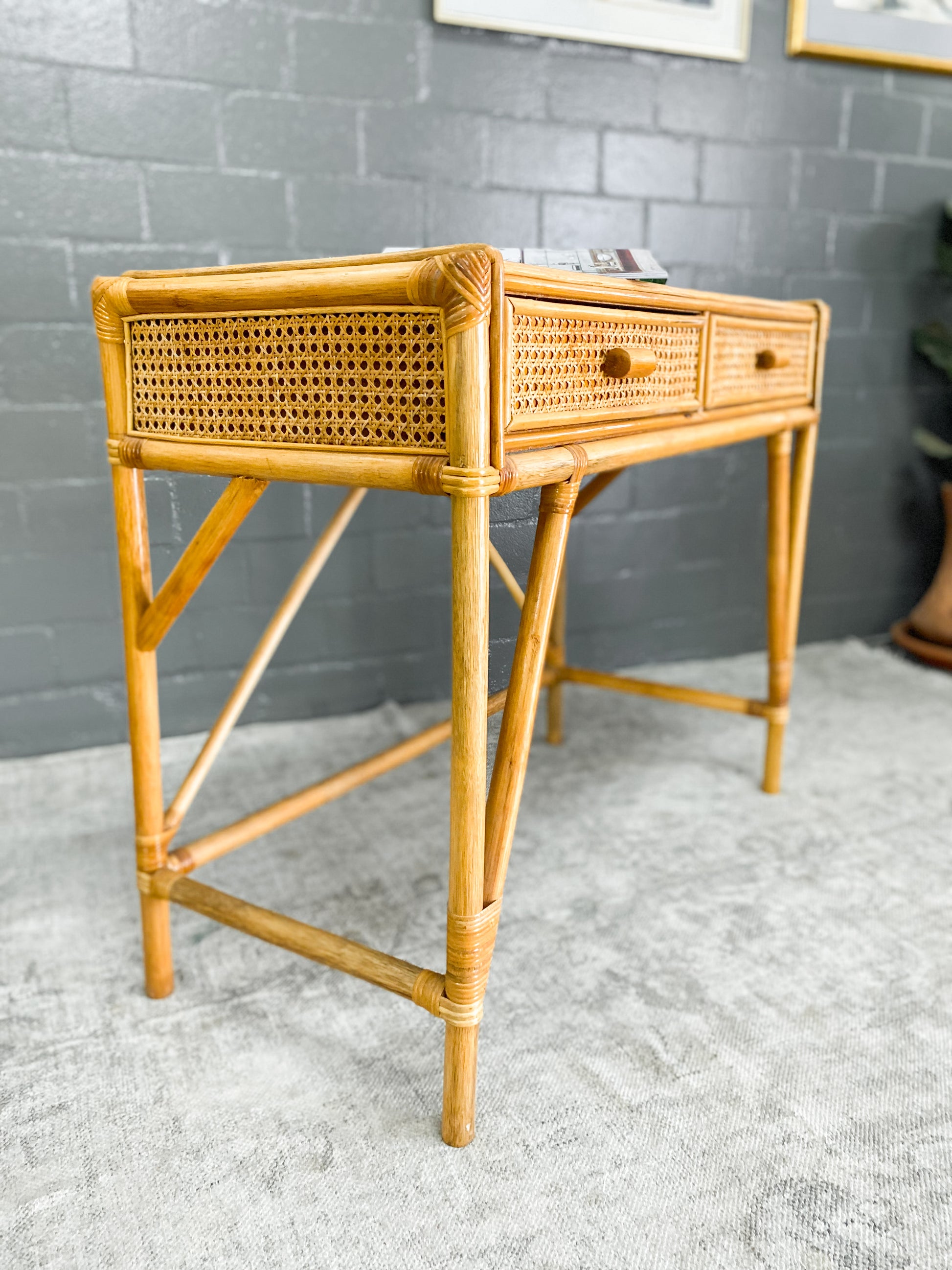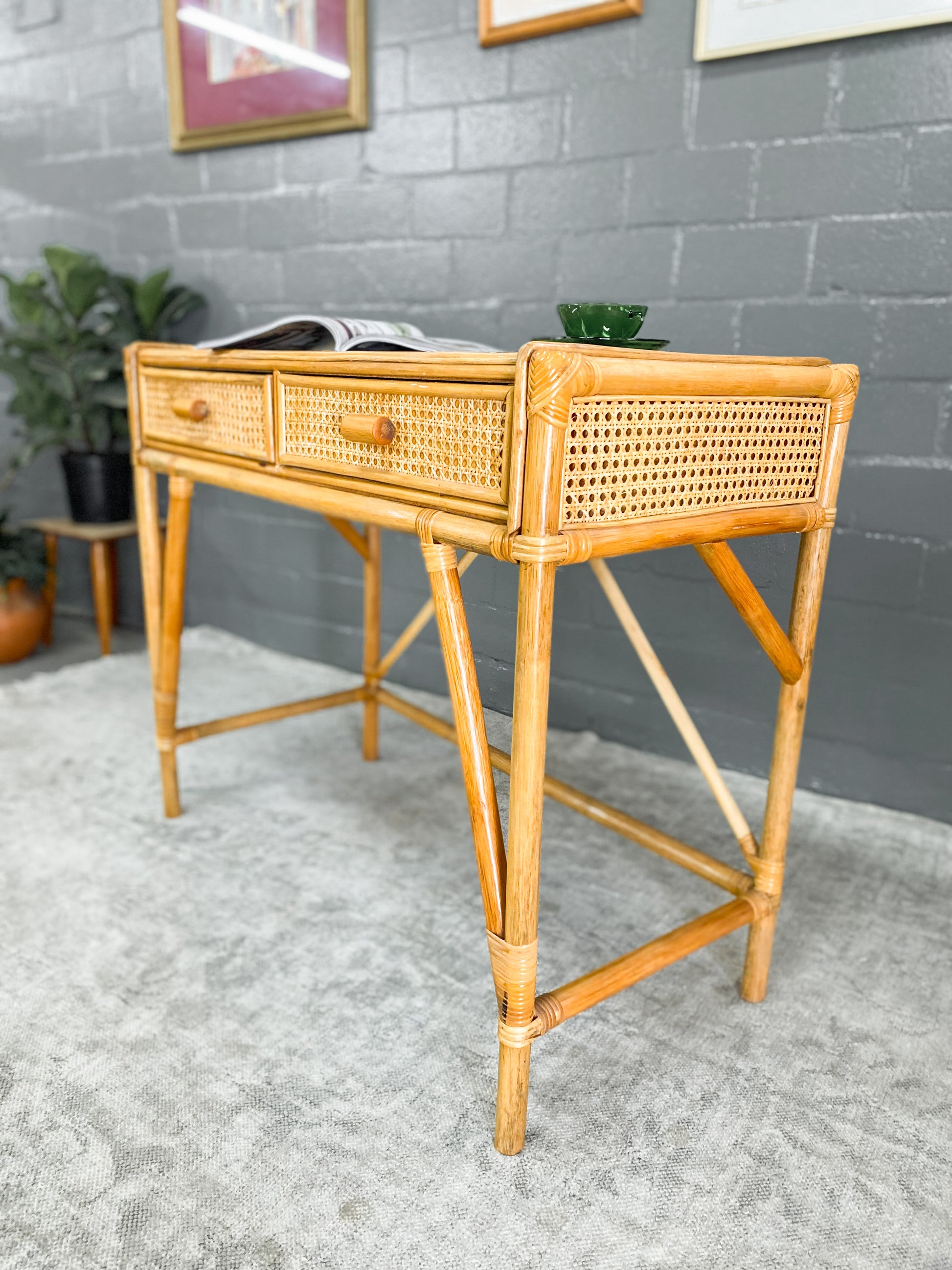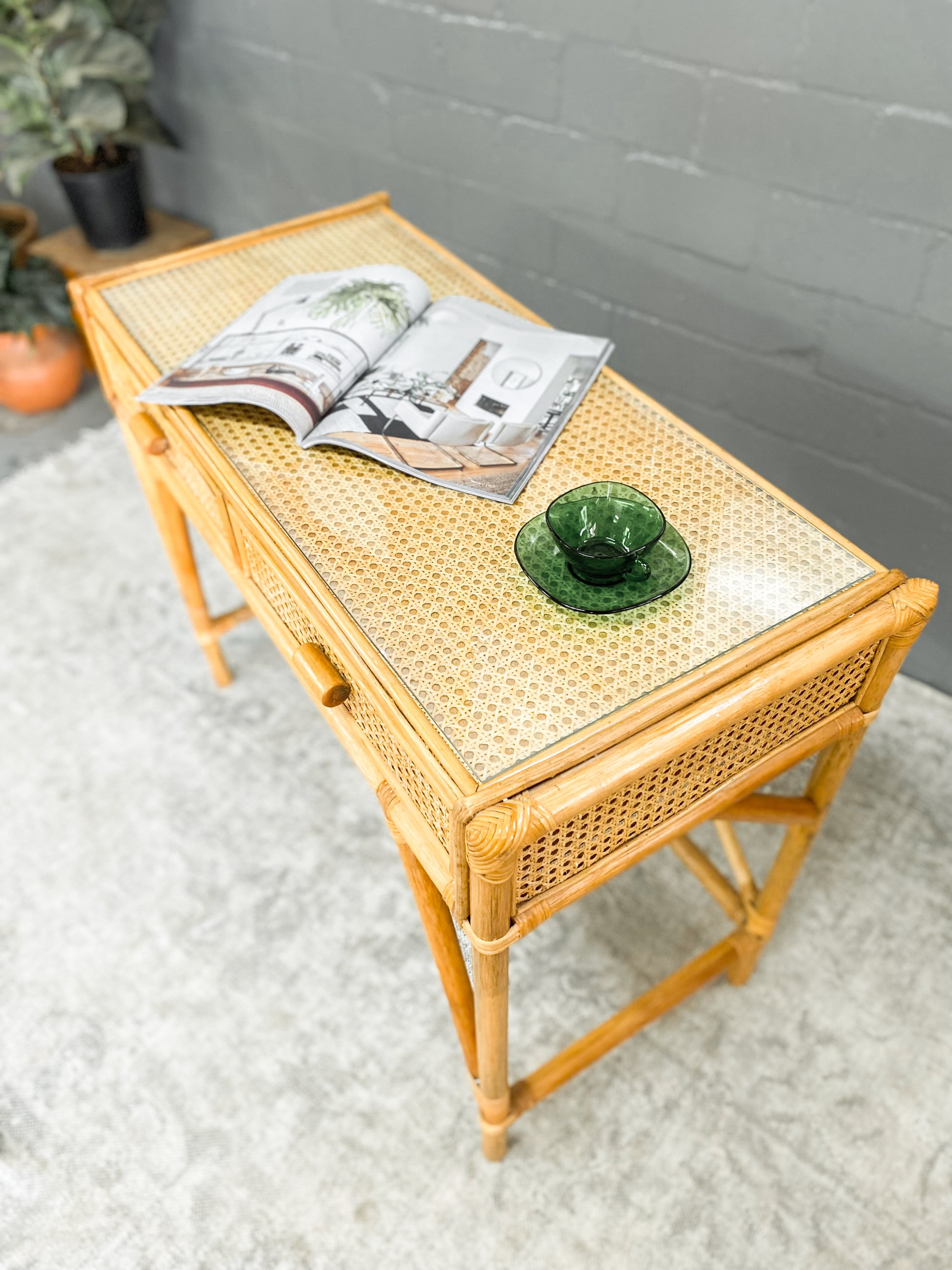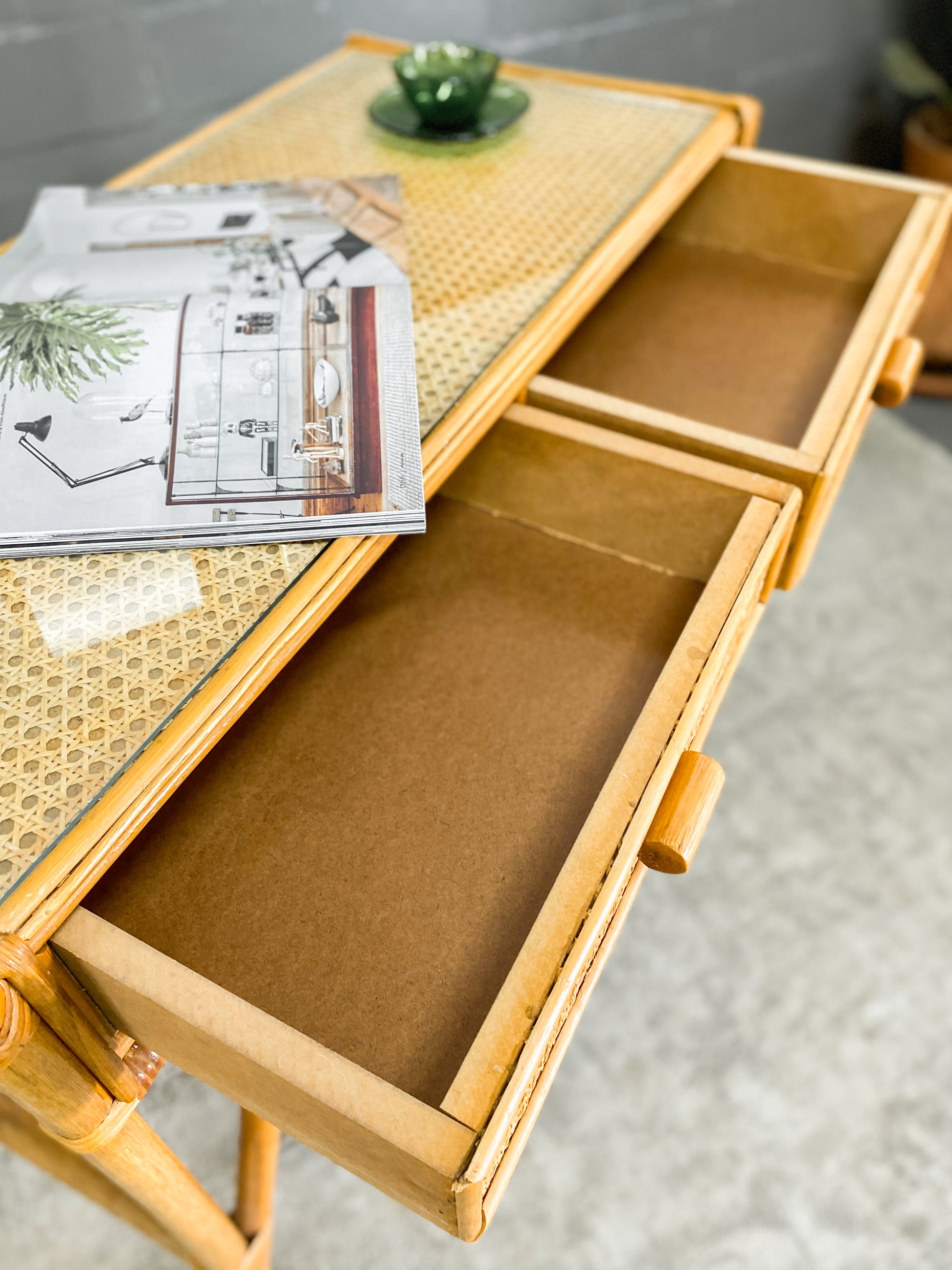Infuse your home with timeless charm using this versatile Cane Dresser. With two drawers, a glass top, and a bright aesthetic, it serves as an ideal piece for various roles like a vanity, dresser, desk, entry table, or side table in any room. In great condition, this standout piece promises to be cherished for years, adding flair to your space.