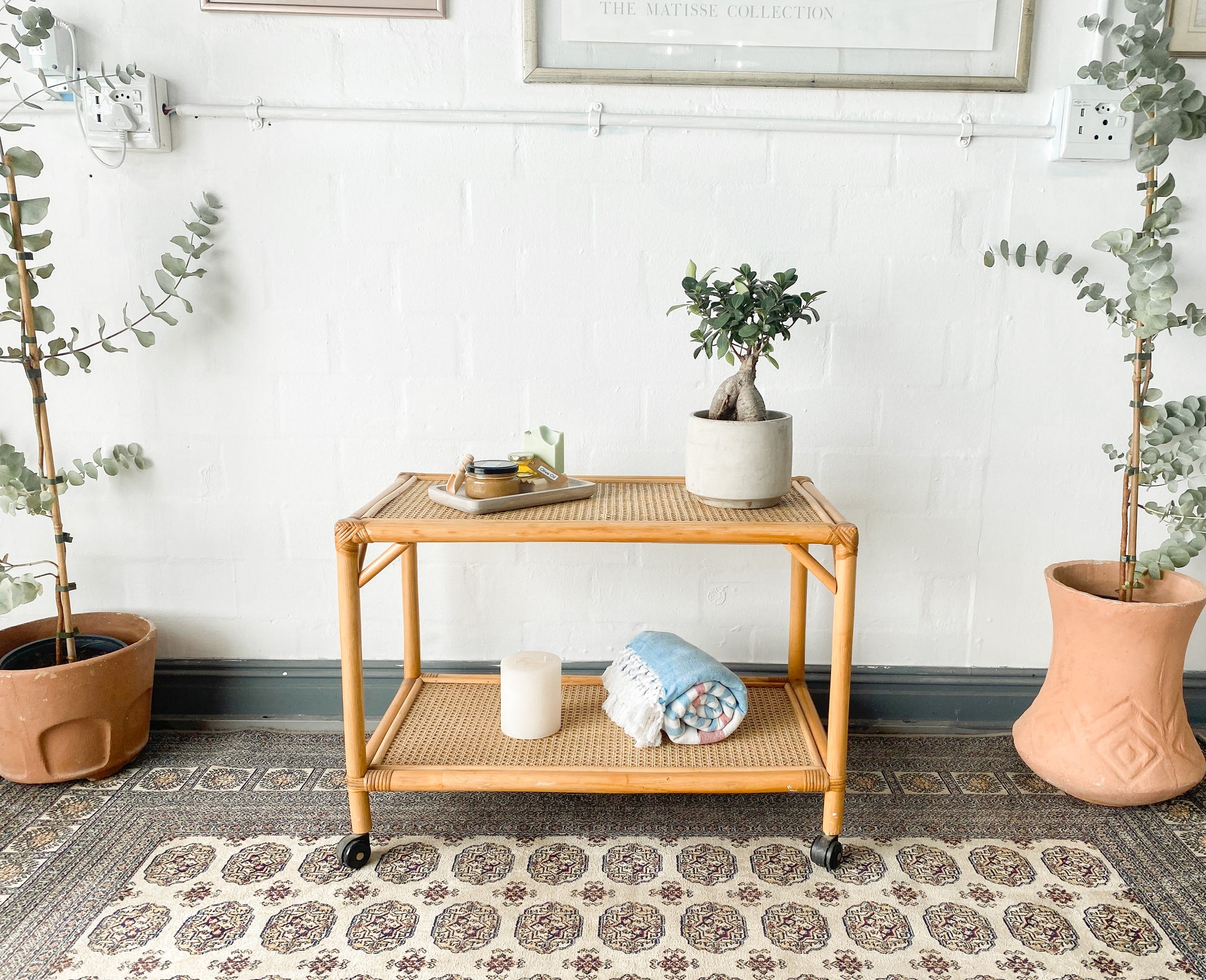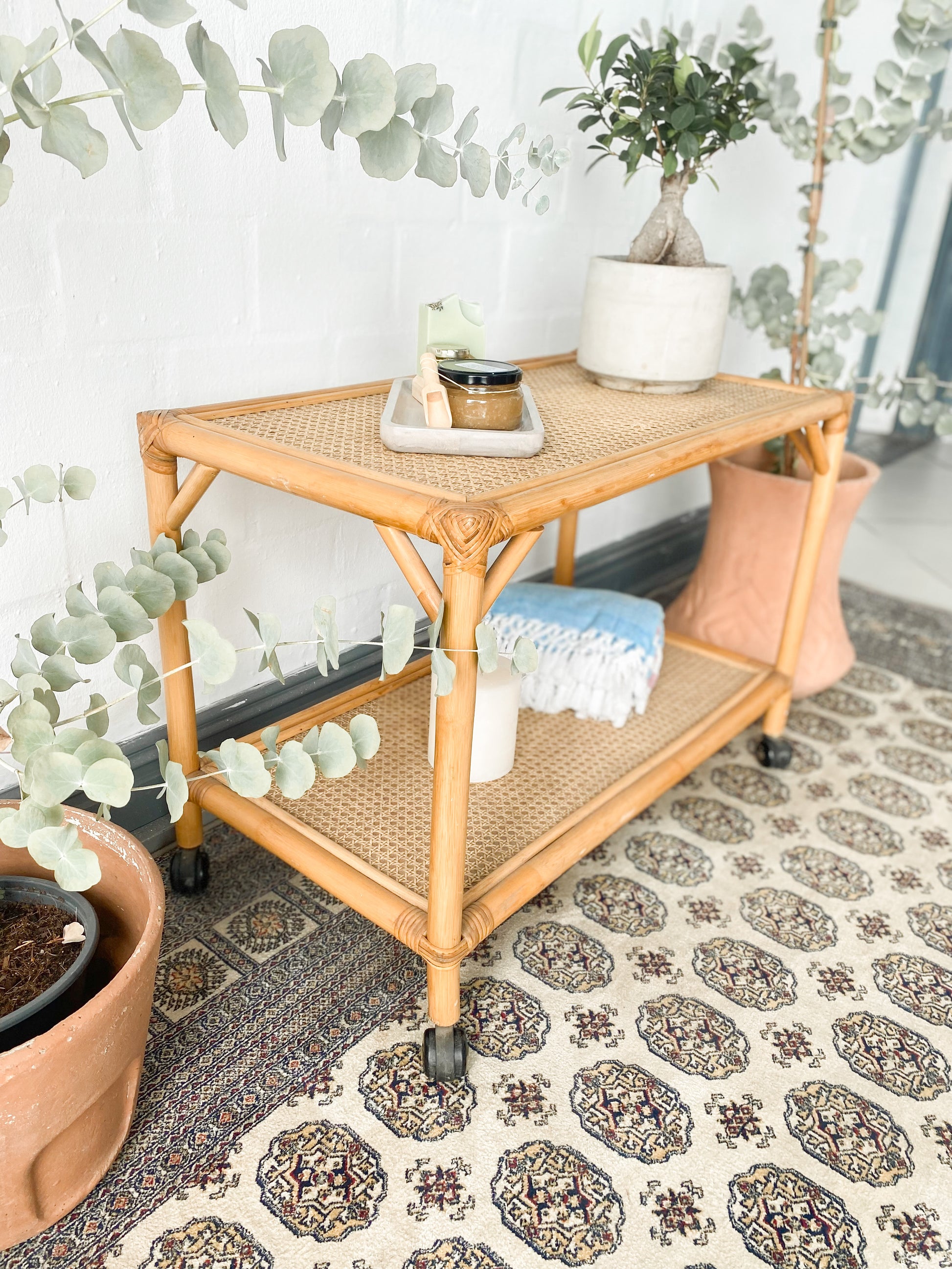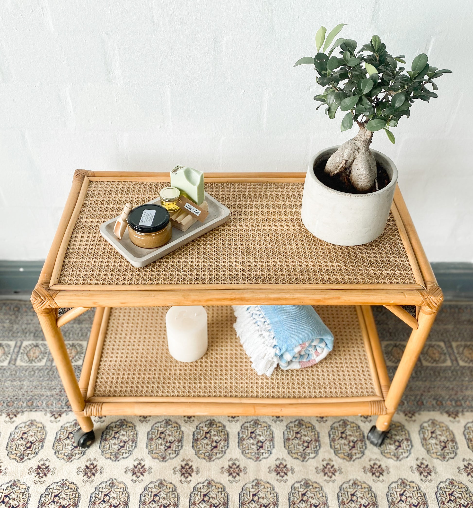 Radiant and light cane trolley featuring clean lines and a warm glow. Perfect as a drinks trolley, bathroom caddy, window display and so much more. It has elegant plastic wheels that have been oiled.