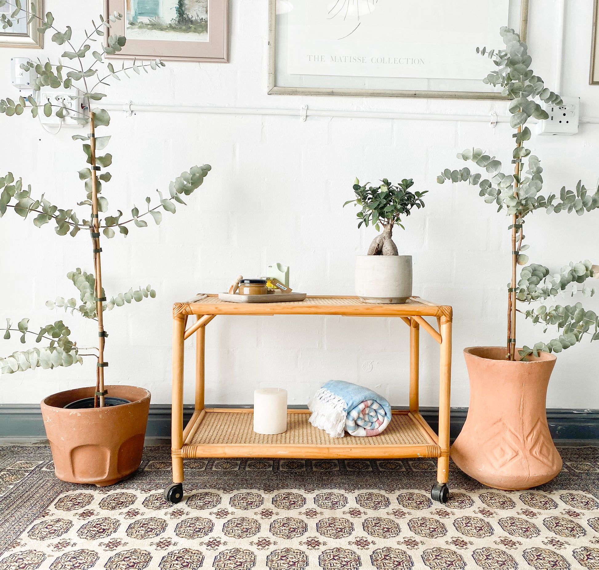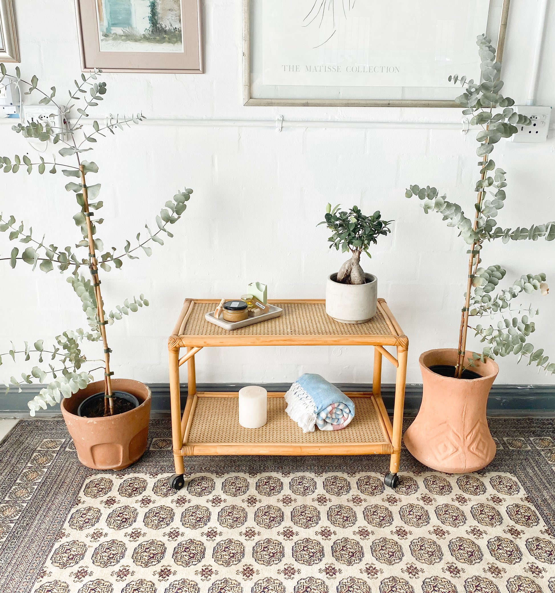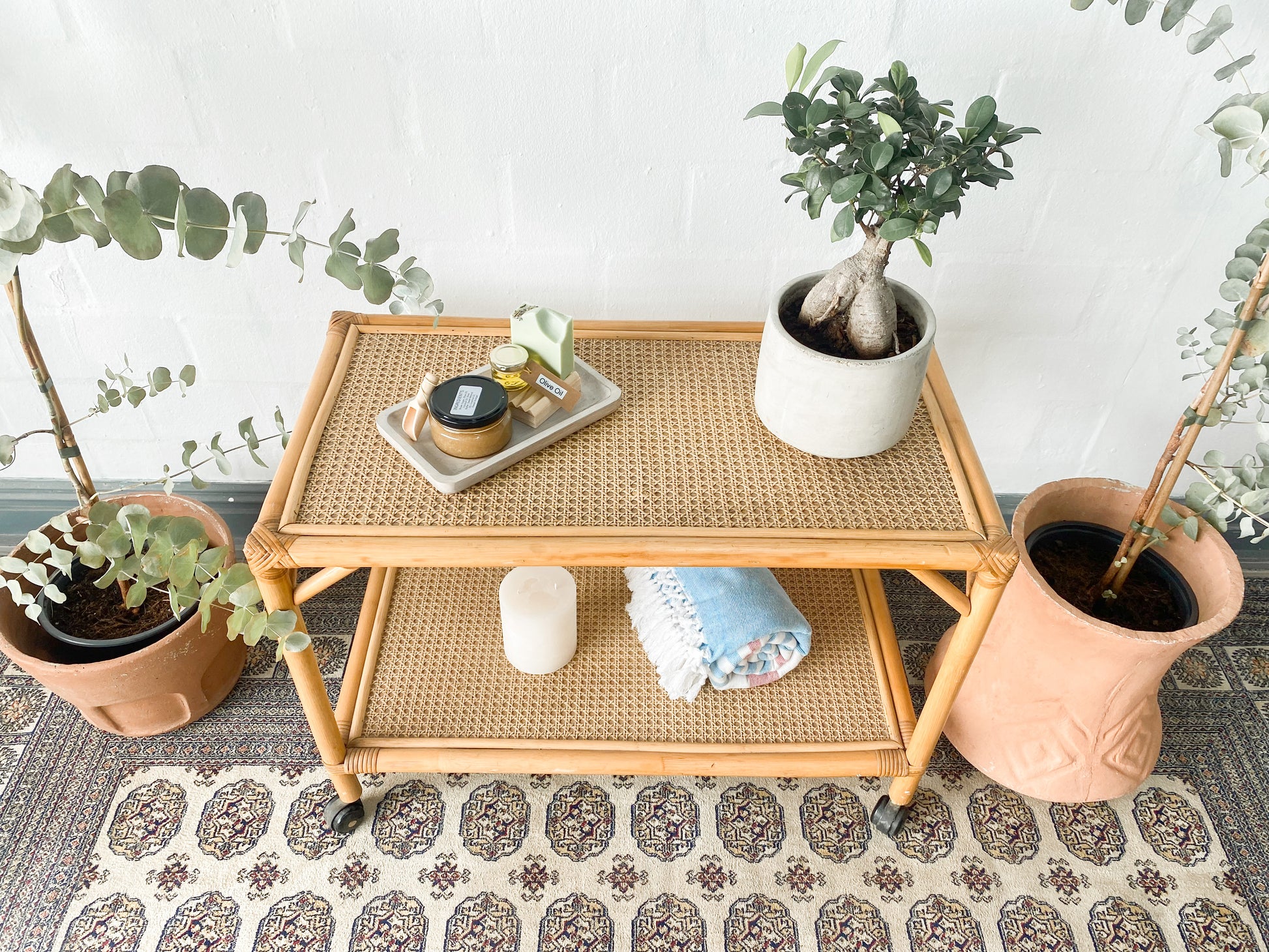 Radiant and light cane trolley featuring clean lines and a warm glow. Perfect as a drinks trolley, bathroom caddy, window display and so much more. It has elegant plastic wheels that have been oiled.