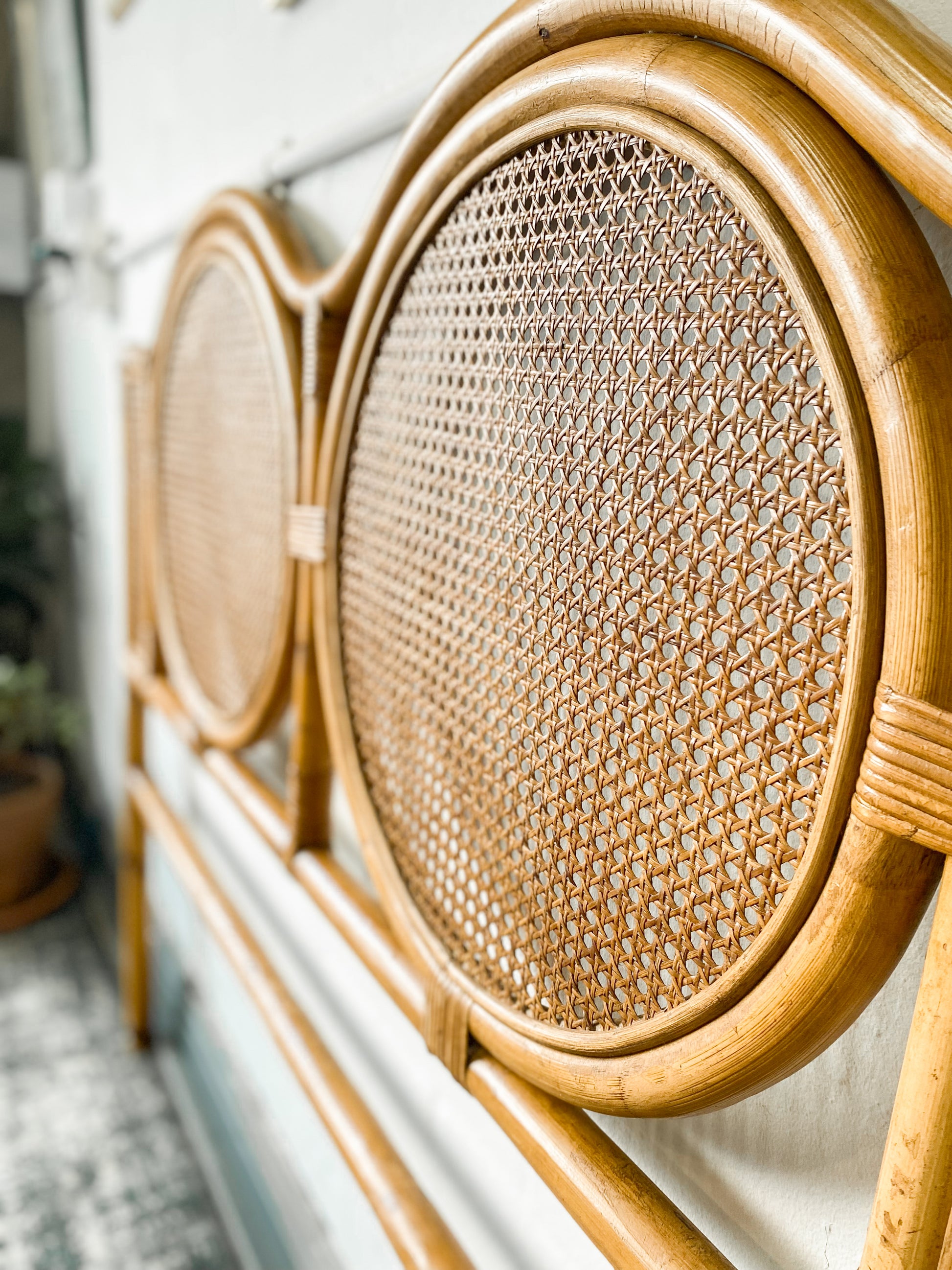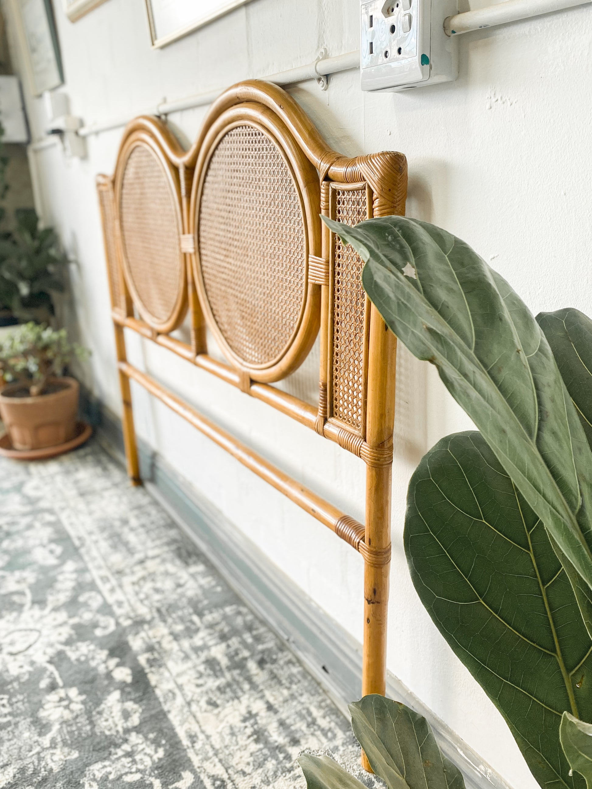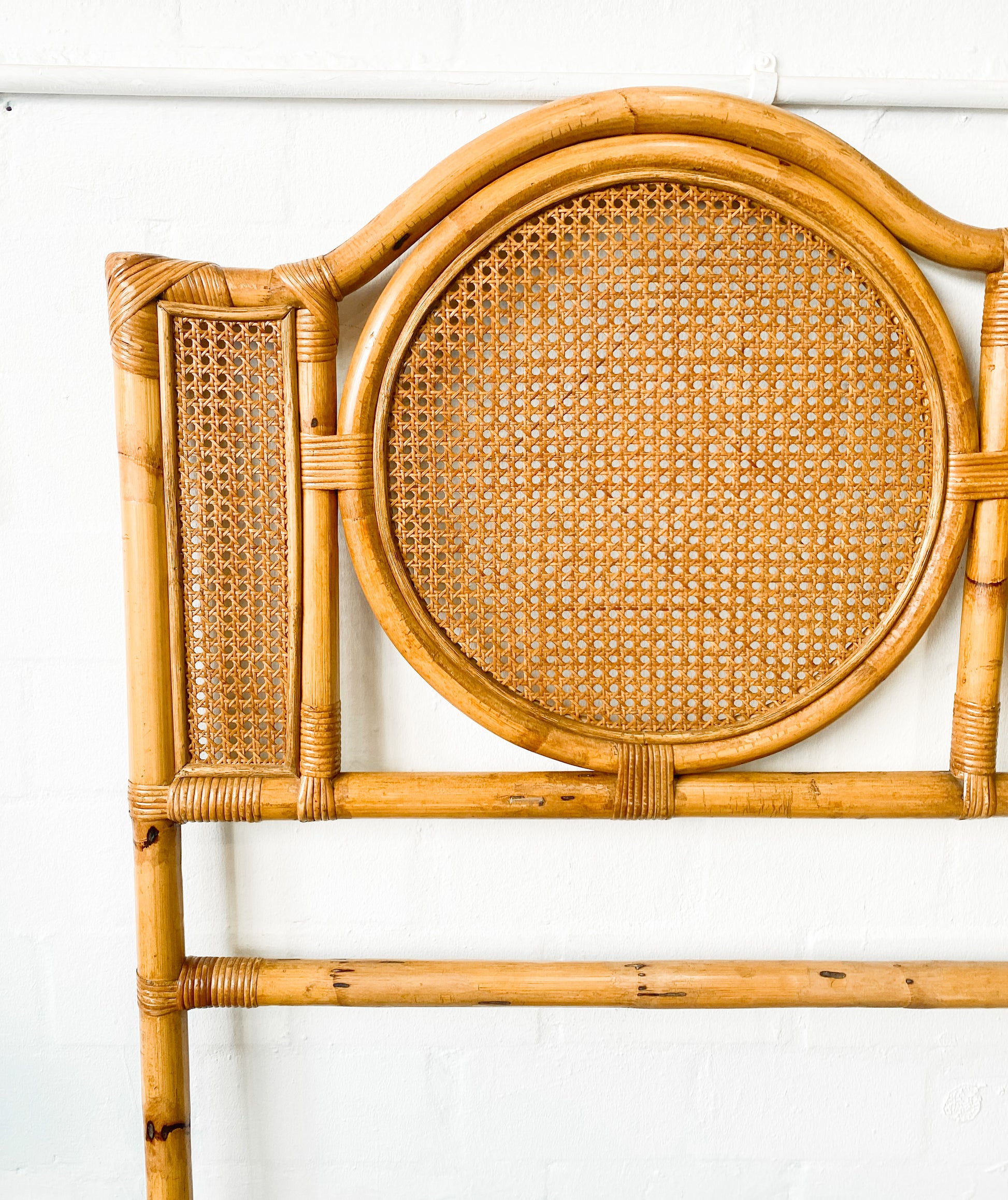 Beautifully dreamy bohemian large double headboard featuring circular detailing. The cane has undergone cleaning and oiling, and the headboard is generally in excellent condition for its age.