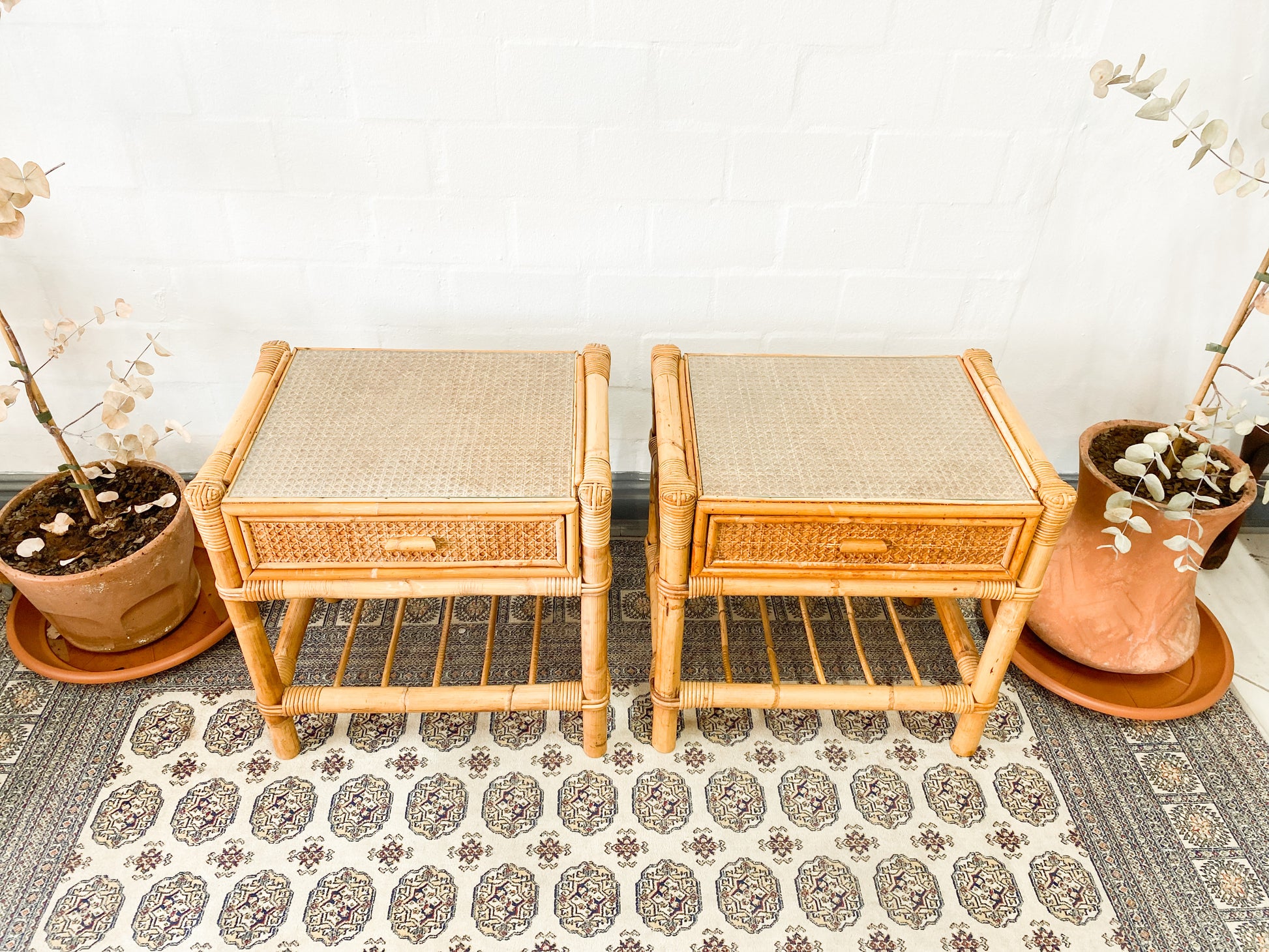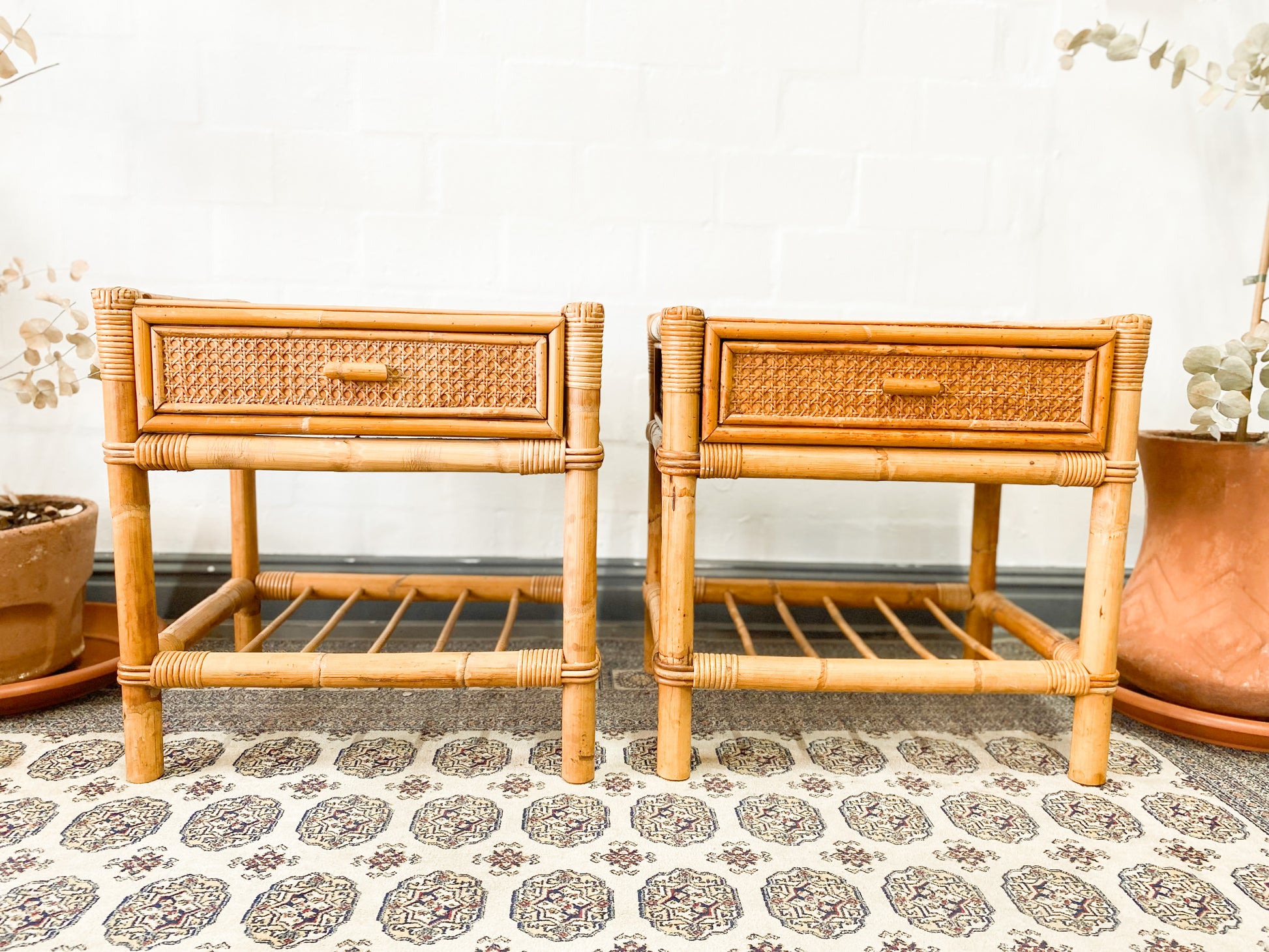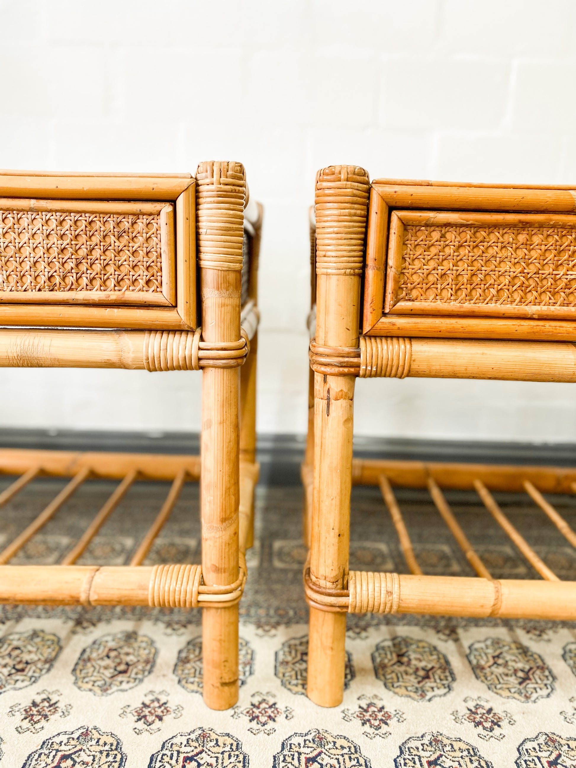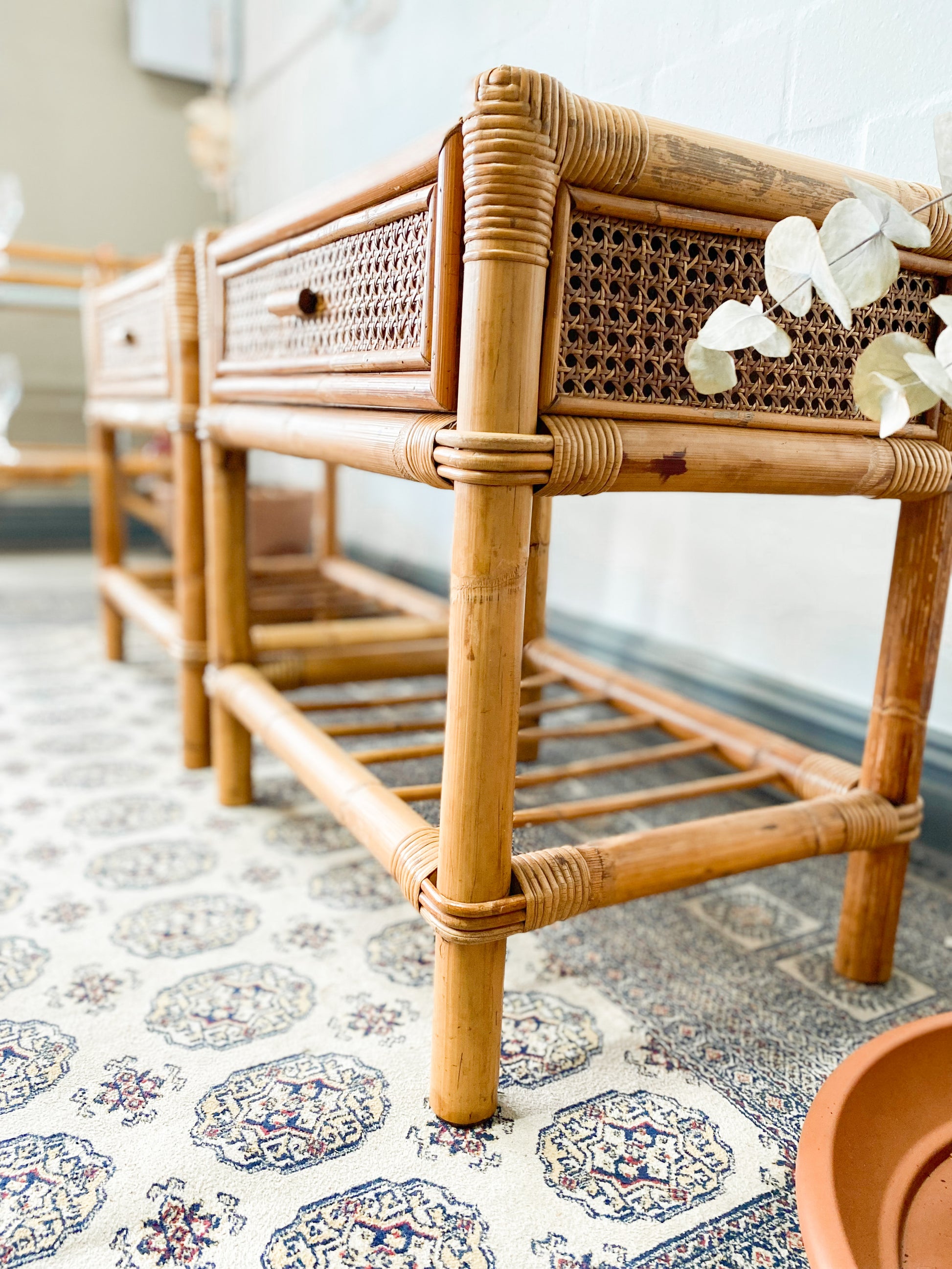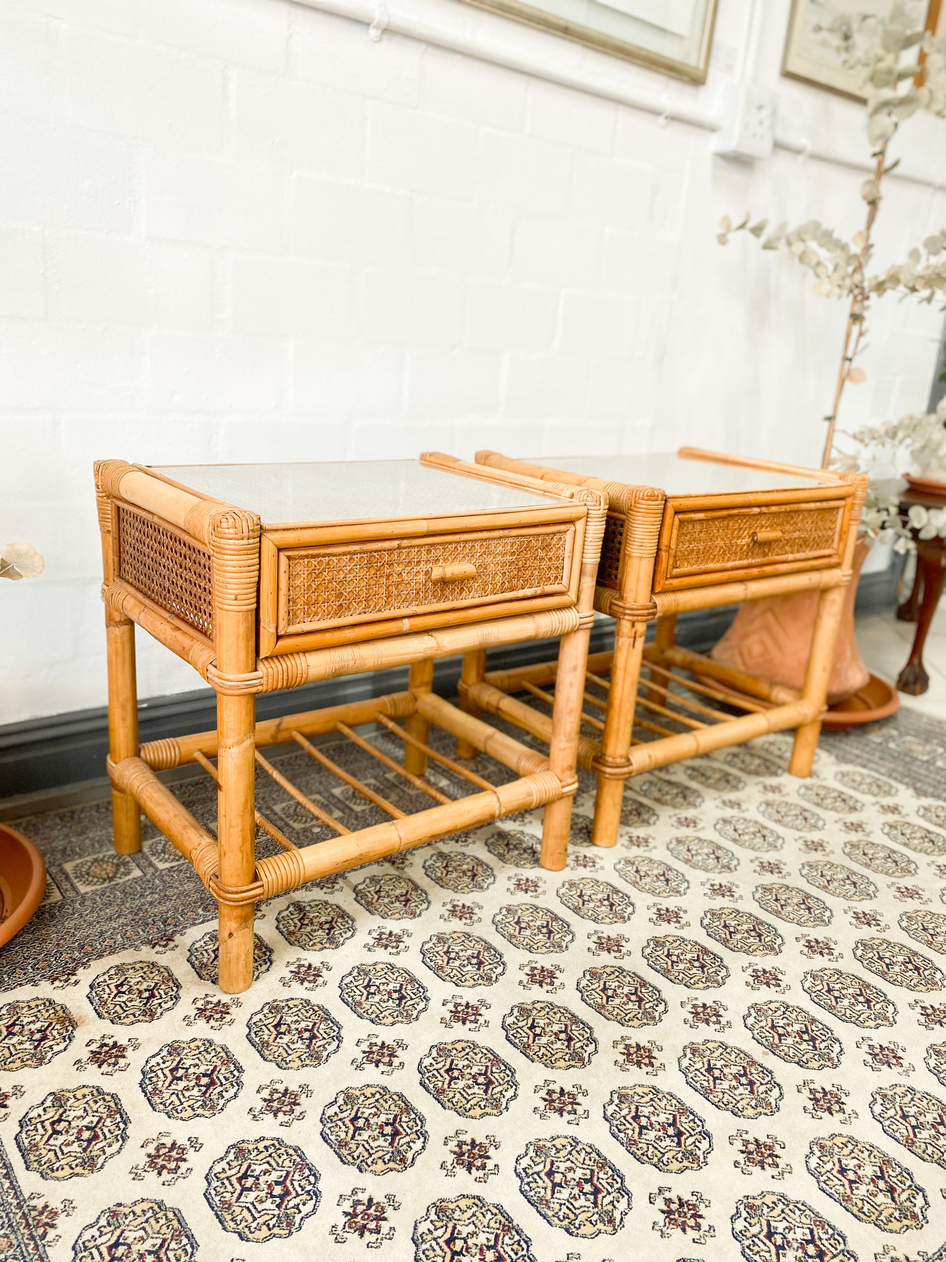 Elegantly crafted cane pedestals with glass tops, drawers, and a sleek slat shelf, exuding a bohemian charm. These pedestals are perfect for adding a touch of airiness and lightness to any space while providing functional storage. The vintage cane is well-preserved, and the glass top ensures its protection. The drawers are clean on the inside, adding to their overall appeal.