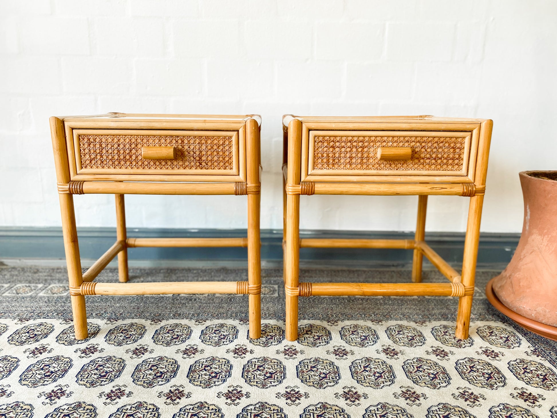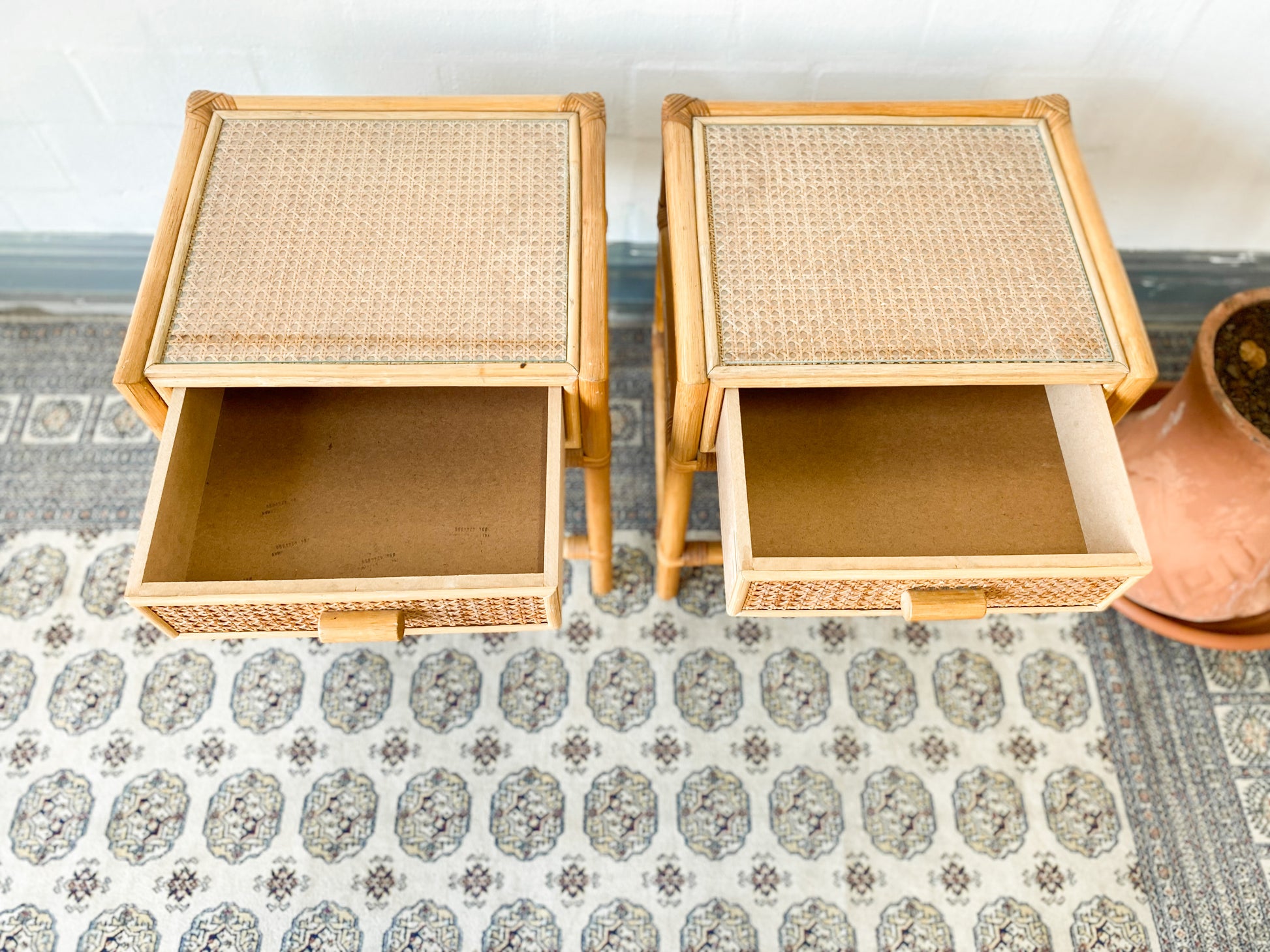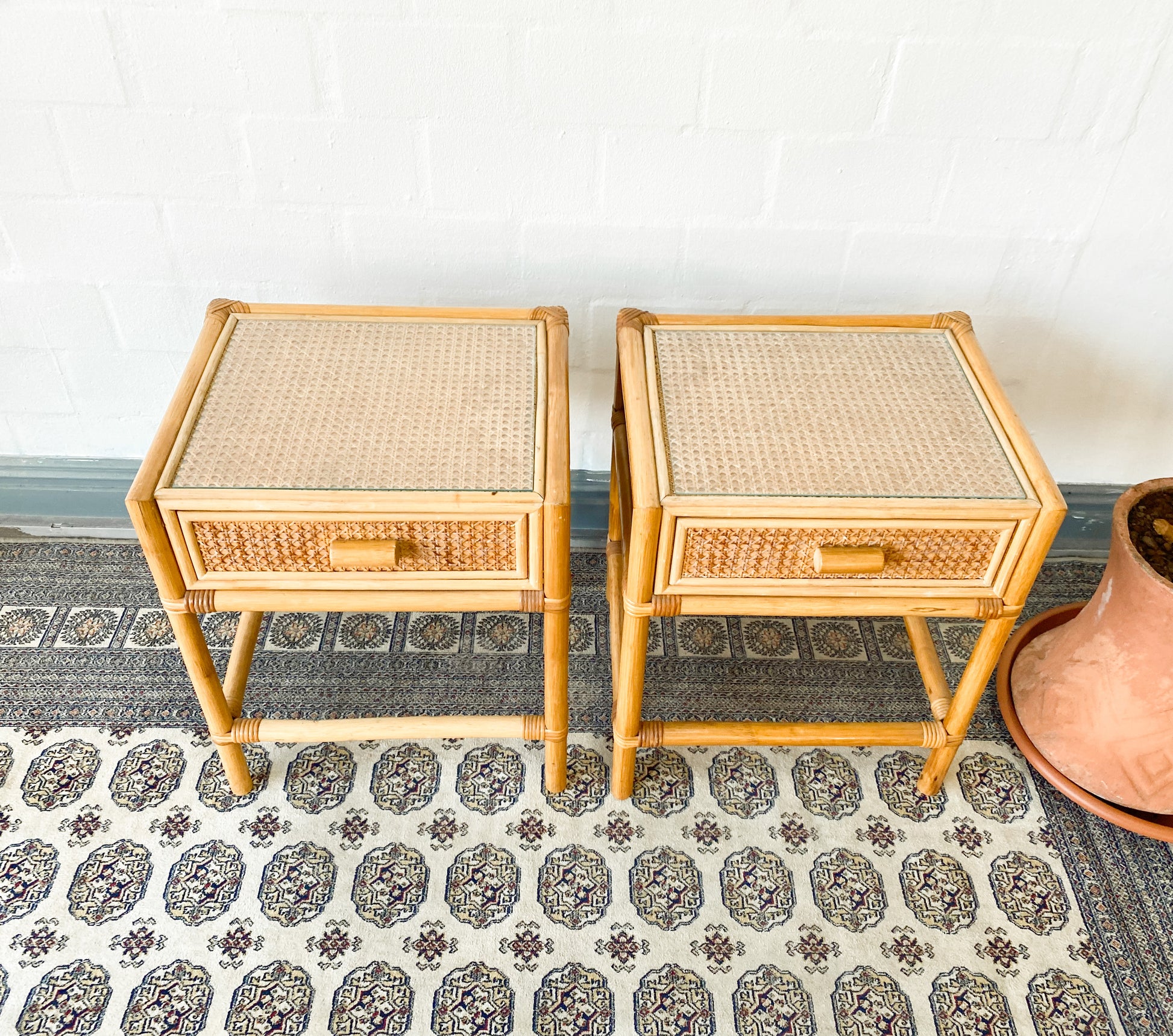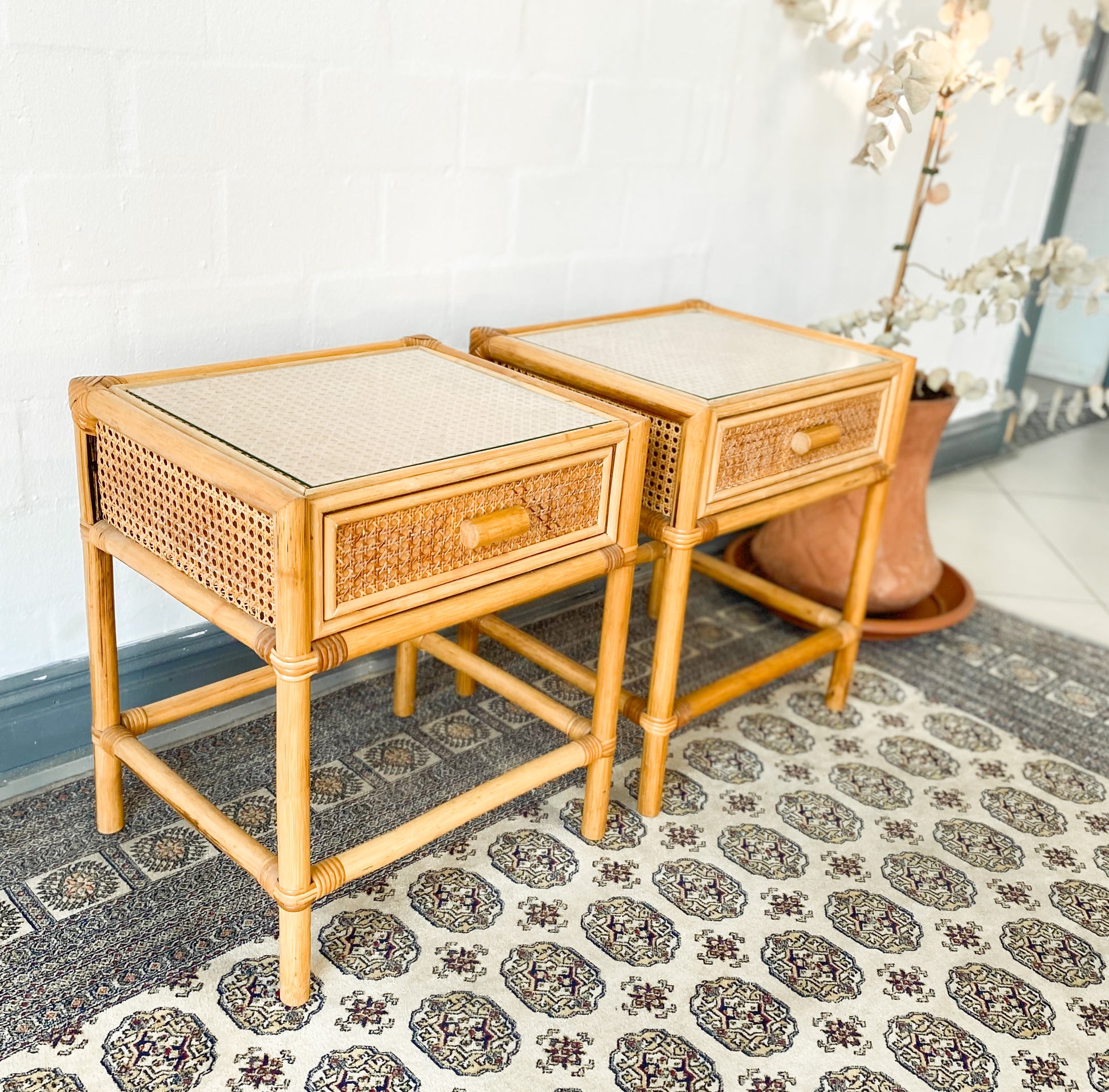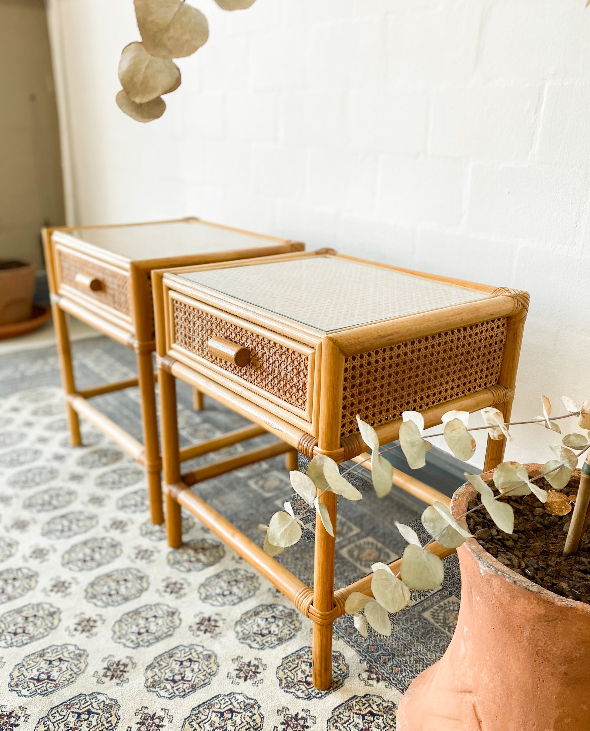 Elegantly crafted cane pedestals with glass tops and drawers that exude a bohemian charm. These pedestals are perfect for adding a touch of airiness and lightness to any space while providing functional storage. The vintage cane is well-preserved, and the glass top ensures its protection. The drawers are clean on the inside, adding to their overall appeal.