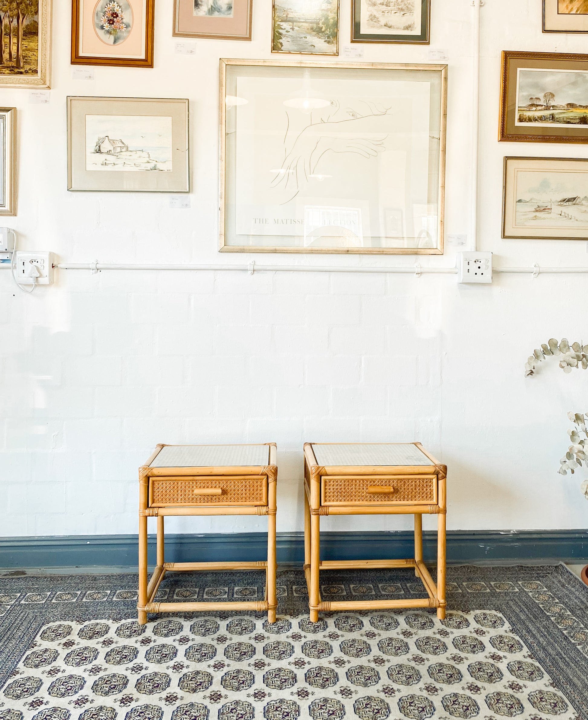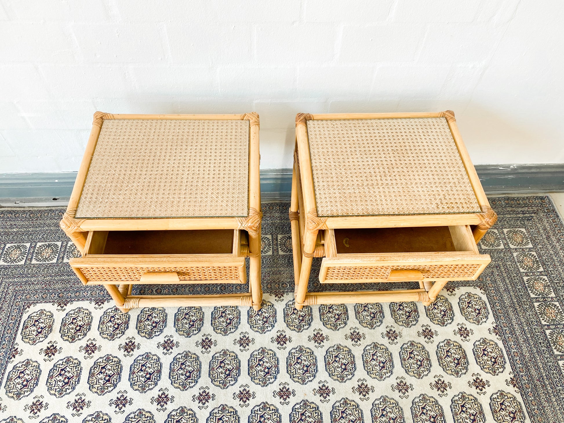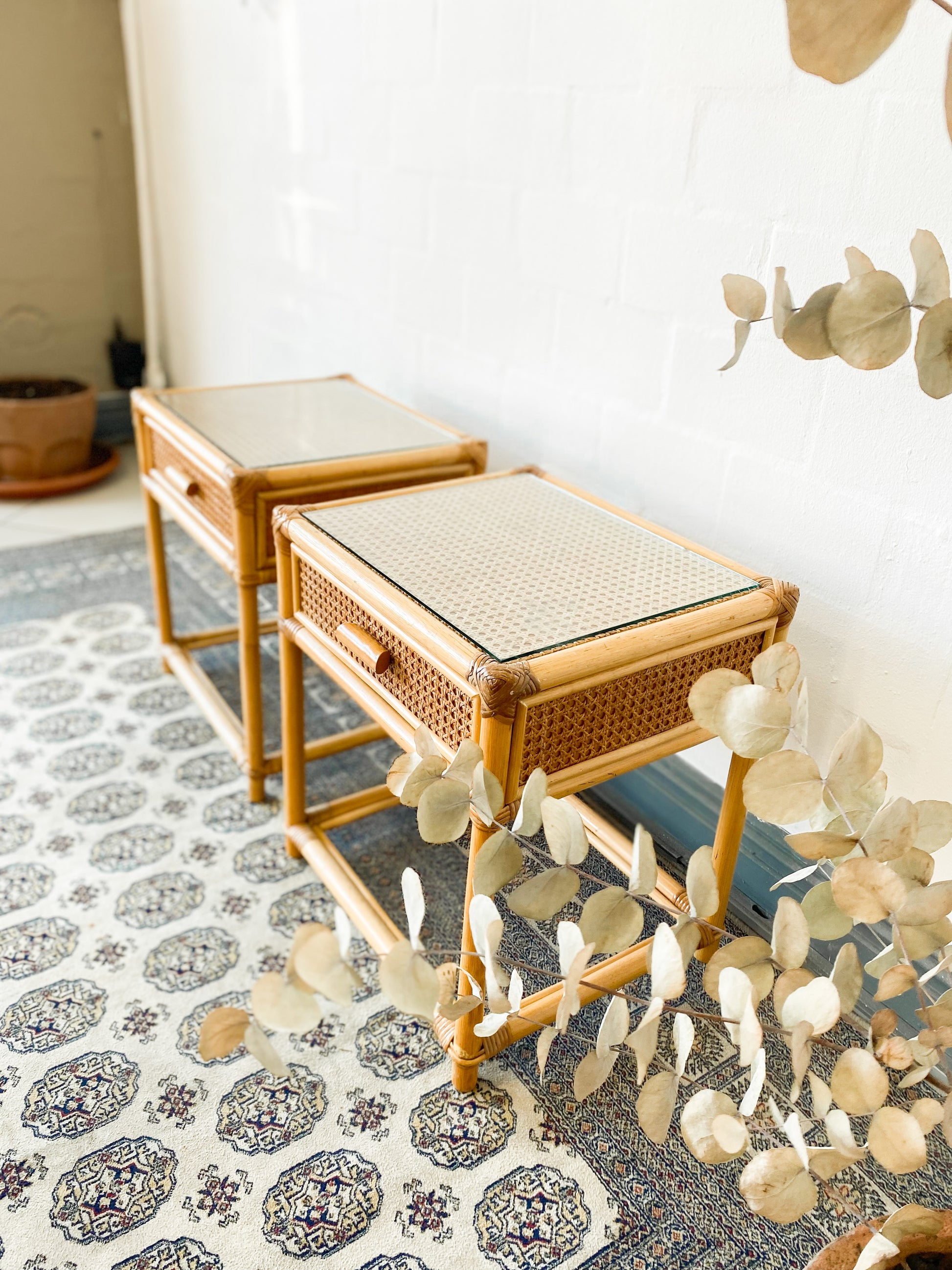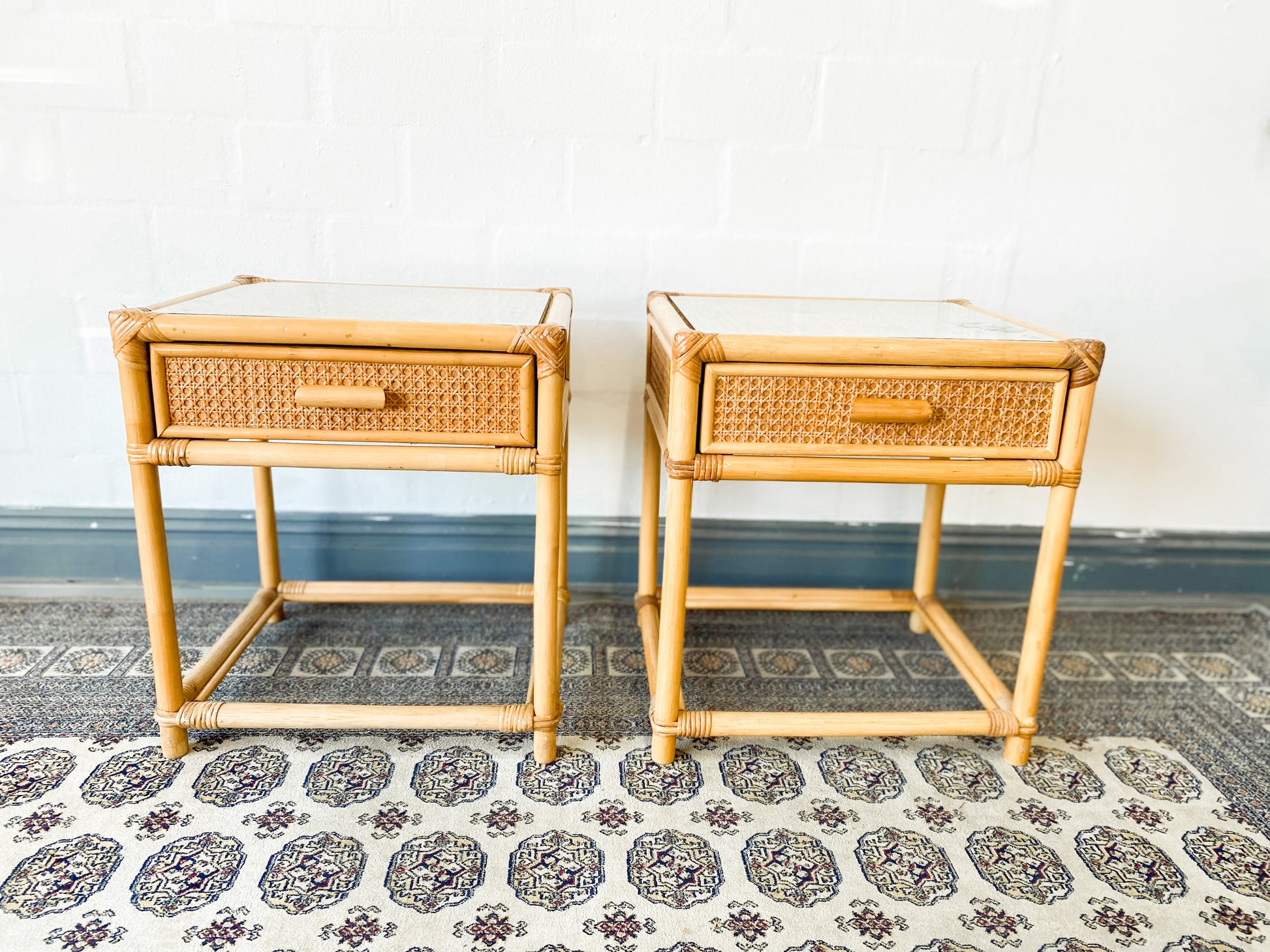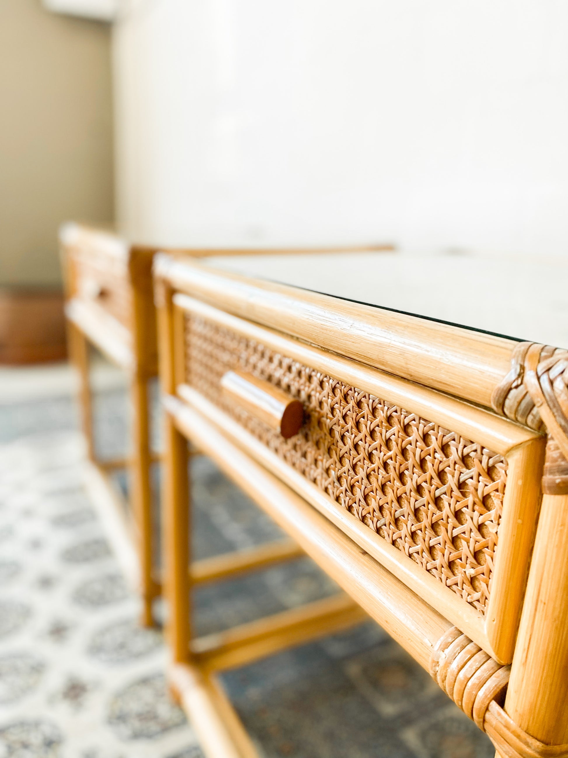 Elegantly crafted cane pedestals with glass tops, and drawers exuding a bohemian charm. These pedestals are perfect for adding a touch of airiness and lightness to any space while providing functional storage. The vintage cane is well-preserved, and the glass top ensures its protection. The drawers are clean on the inside, adding to their overall appeal.