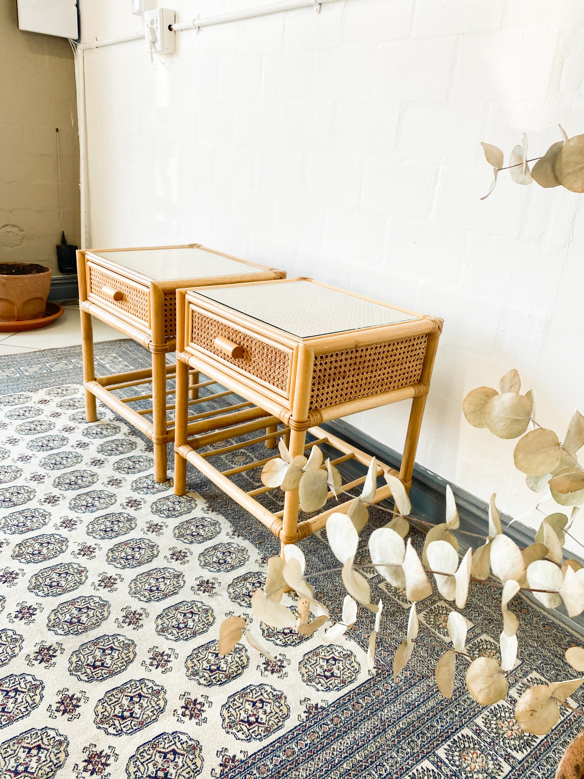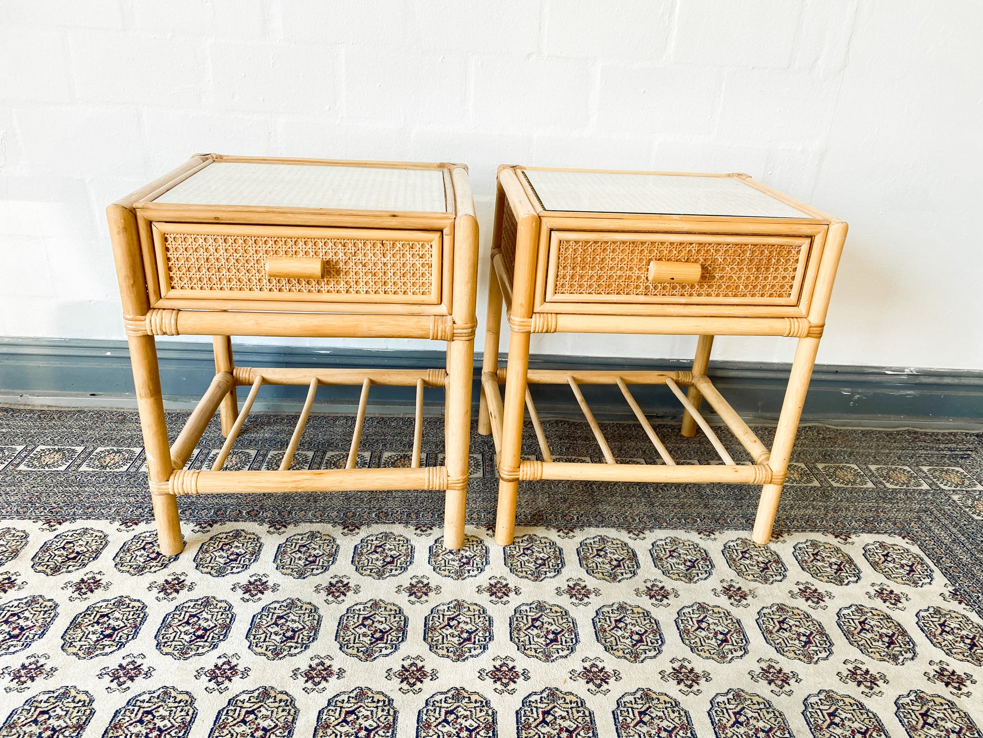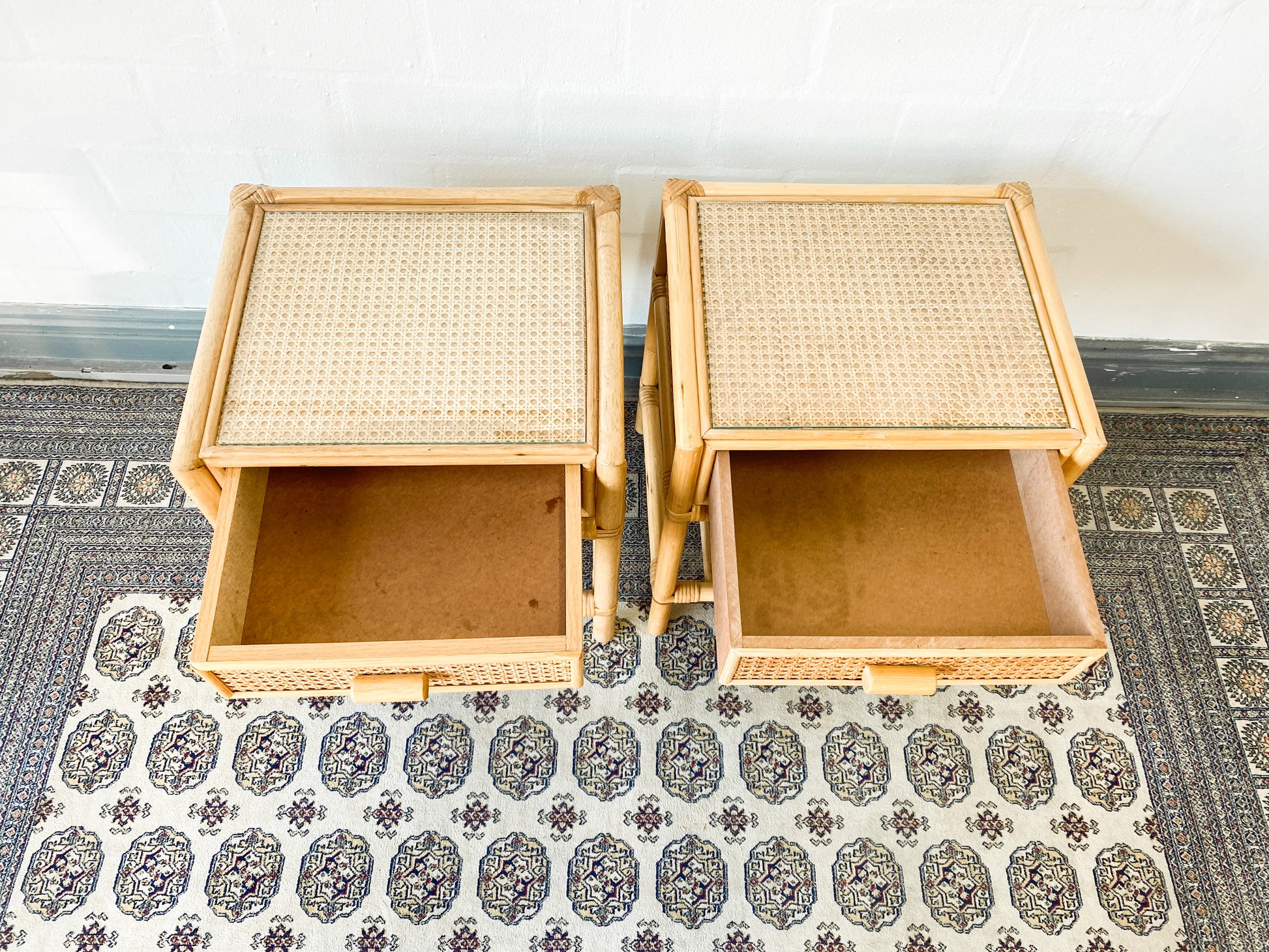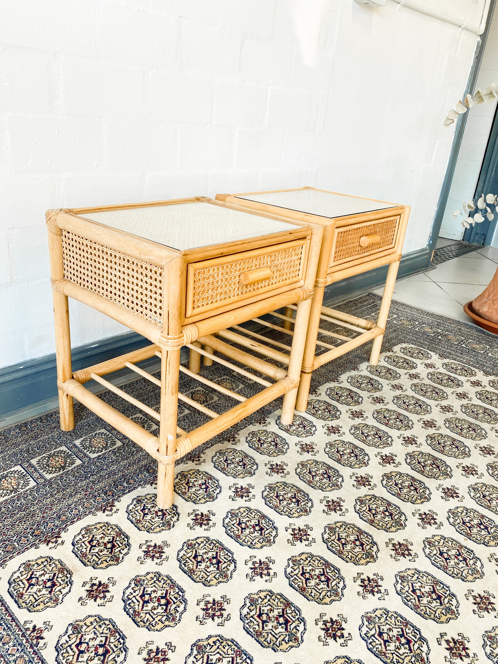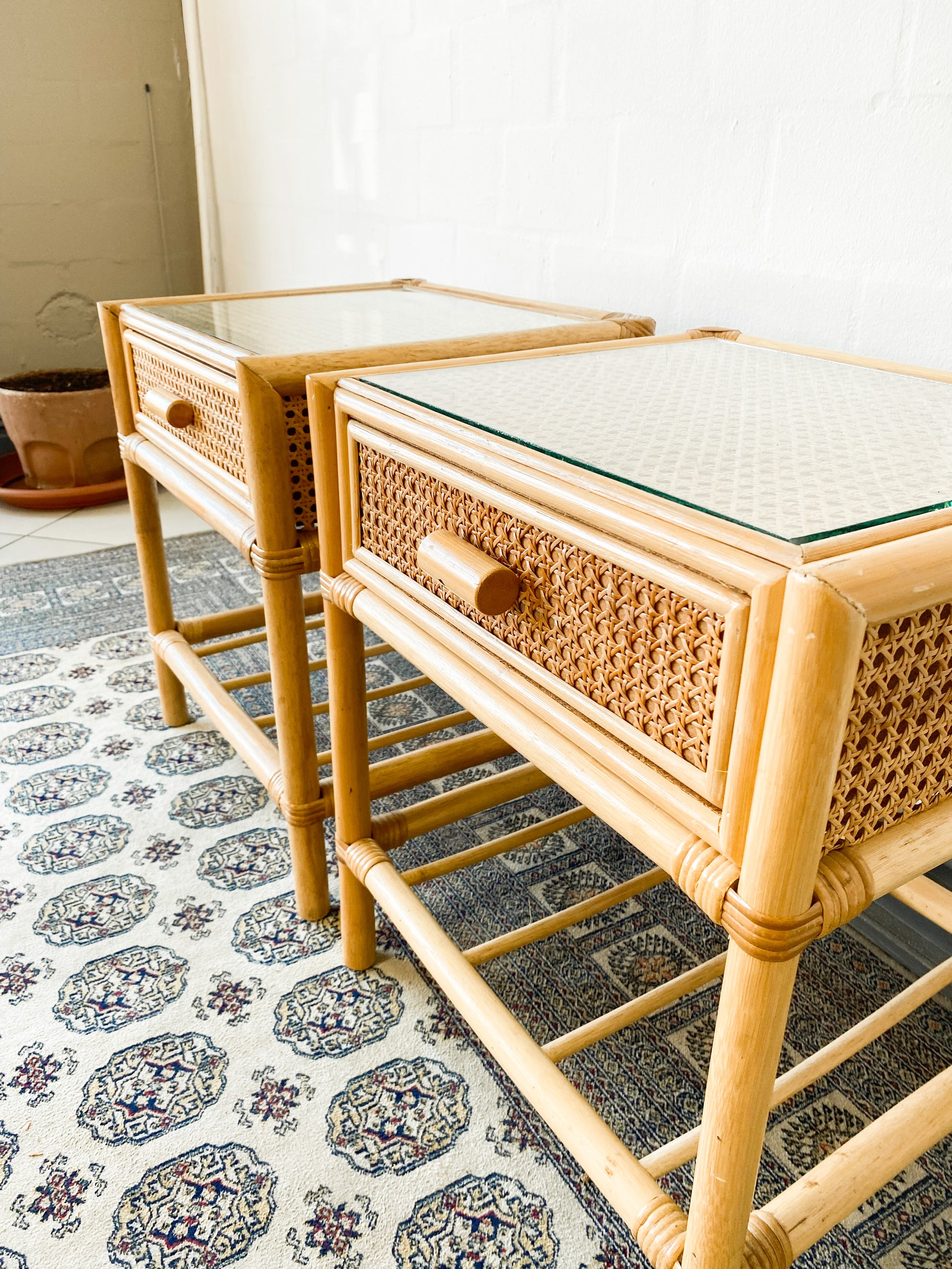 Elegantly crafted cane pedestals with glass tops, drawers, and a sleek slat shelf, exuding a bohemian charm. These pedestals are perfect for adding a touch of airiness and lightness to any space while providing functional storage. The vintage cane is well-preserved, and the glass top ensures its protection. The drawers are clean on the inside, adding to their overall appeal.