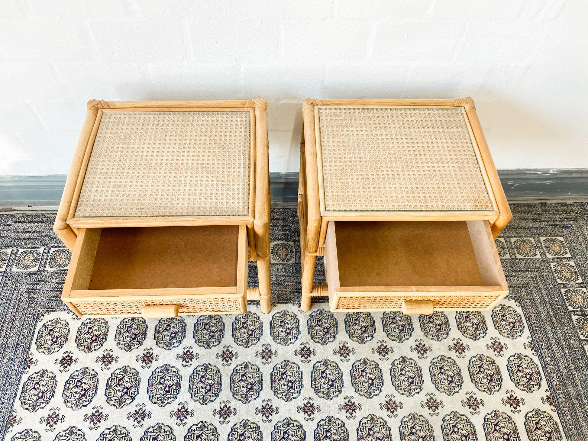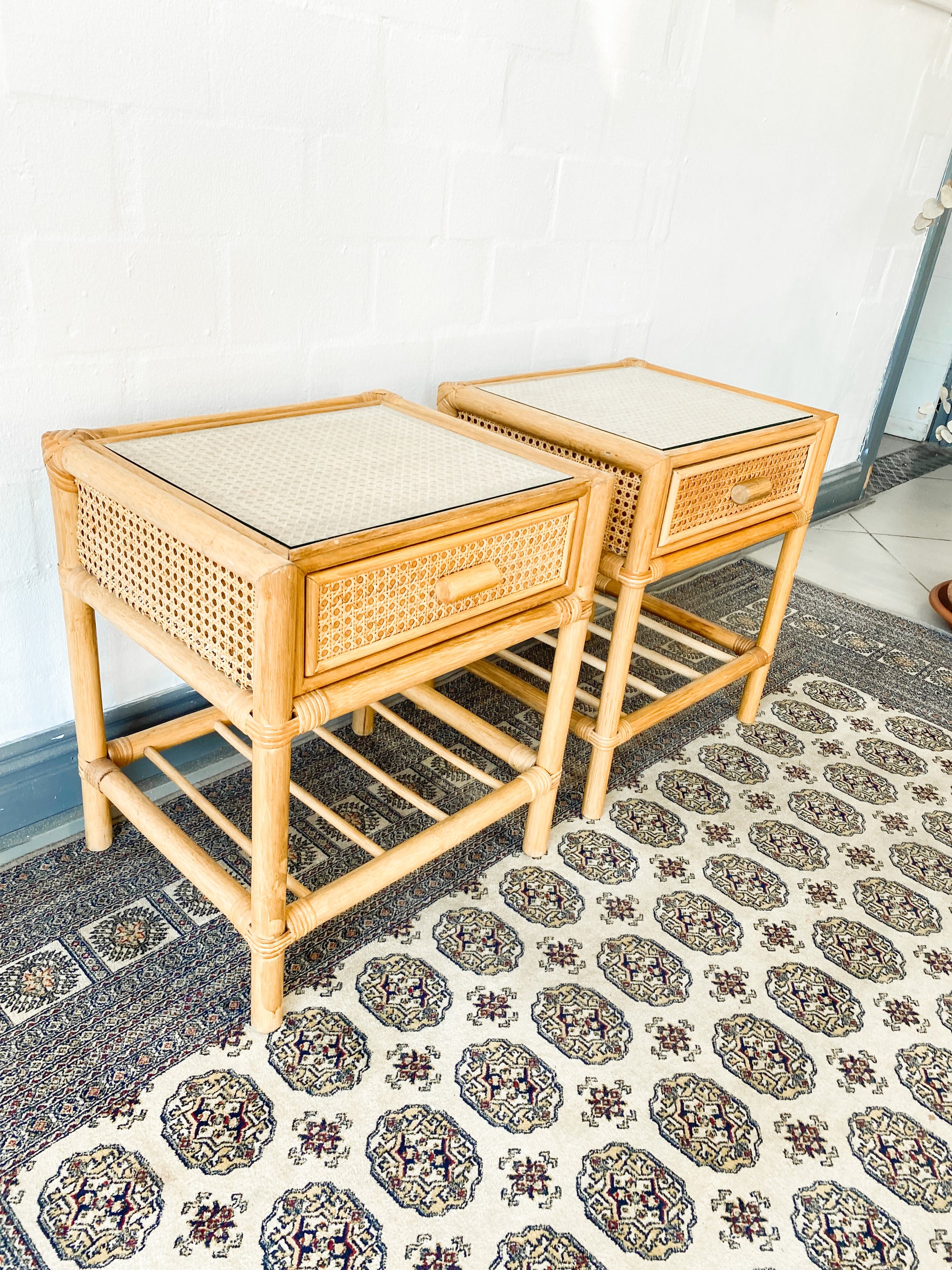 Elegantly crafted cane pedestals with glass tops, drawers, and a sleek slat shelf, exuding a bohemian charm. These pedestals are perfect for adding a touch of airiness and lightness to any space while providing functional storage. The vintage cane is well-preserved, and the glass top ensures its protection. The drawers are clean on the inside, adding to their overall appeal.