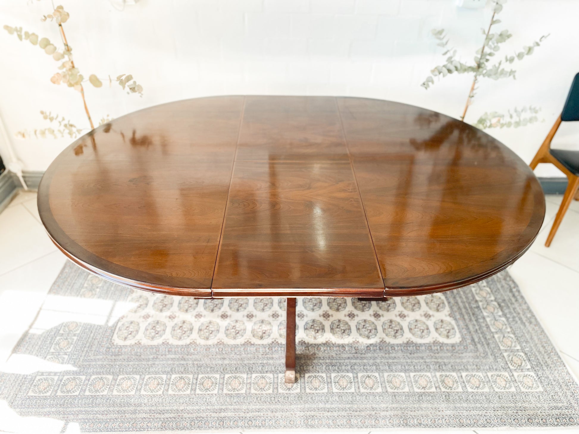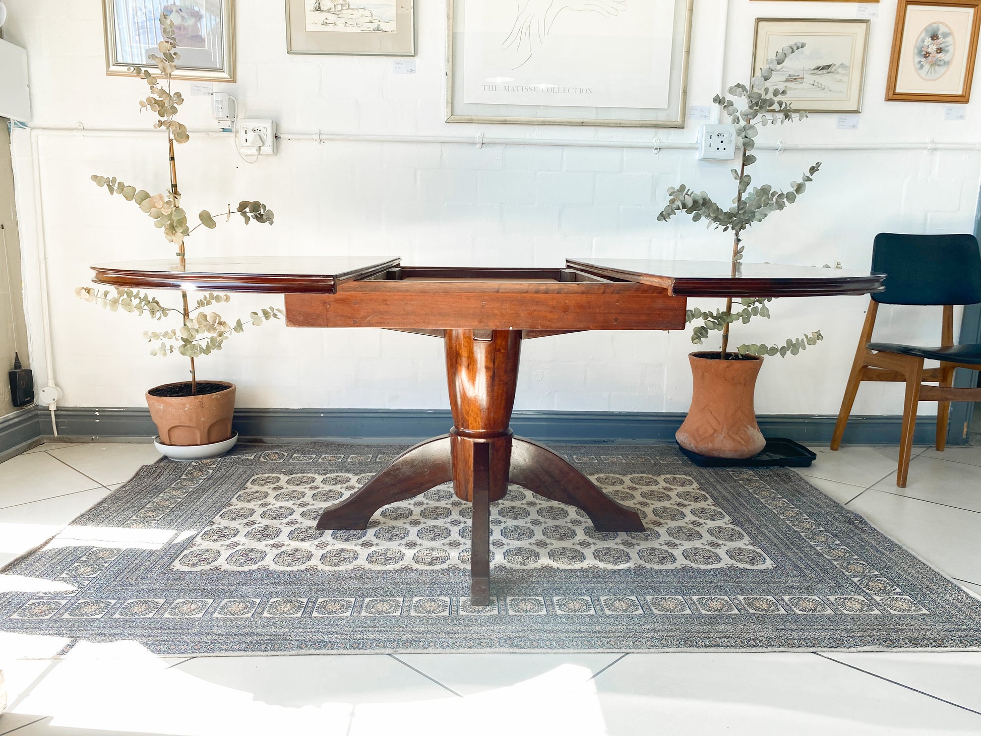 Elegant Extendable Imbuia 6-8 seat dining table made by premium South African designer EE Meyer. Featuring swooping Scandinavian lines. Flaunting a stunning heavy pedestal base. The extension mechanism boasts of its craftsmanship with a smooth transition. In good condition. Based in Somerset West and can deliver.