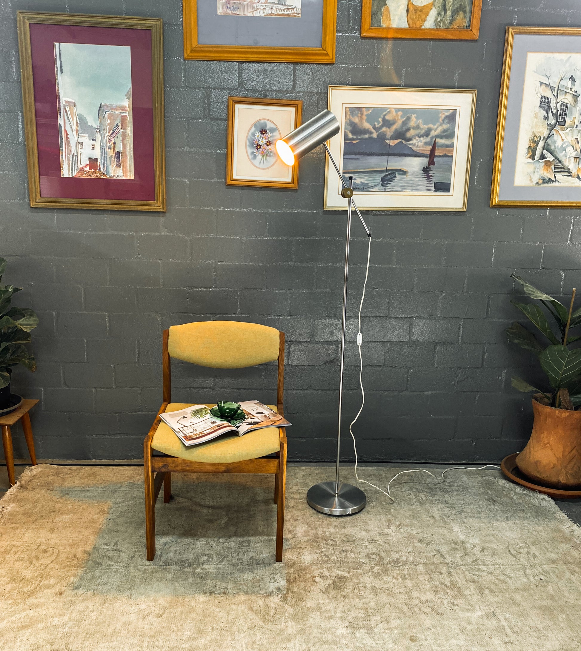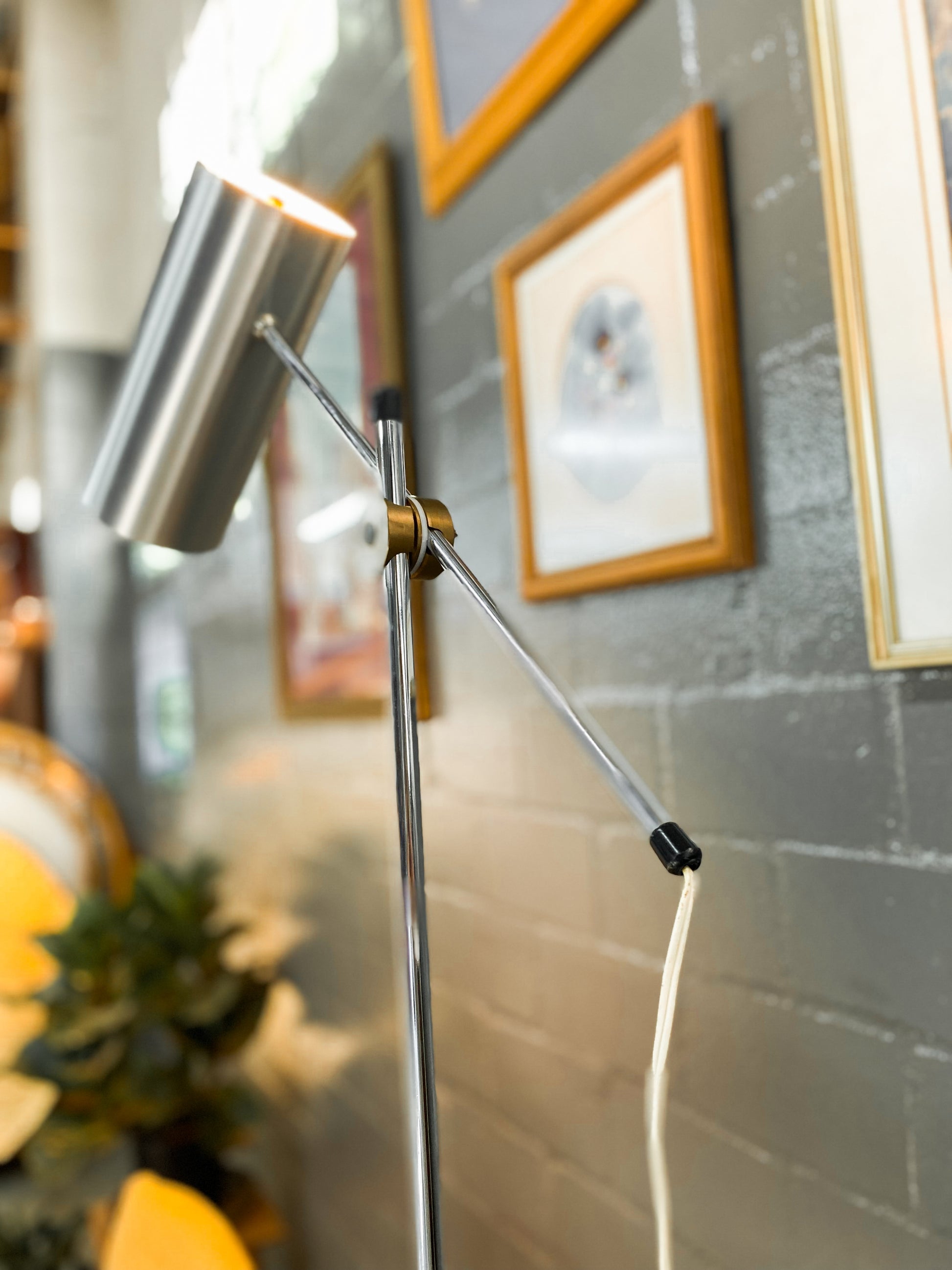A 1960s floor lamp designed by Anders Pehrson for Ateljé Lyktan Sweden, model number 591 G. This adjustable lamp features a chrome stand, hood, and base. While showing signs of age-related wear with a few minor dings, it remains in excellent working condition and retains its overall aesthetic appeal.