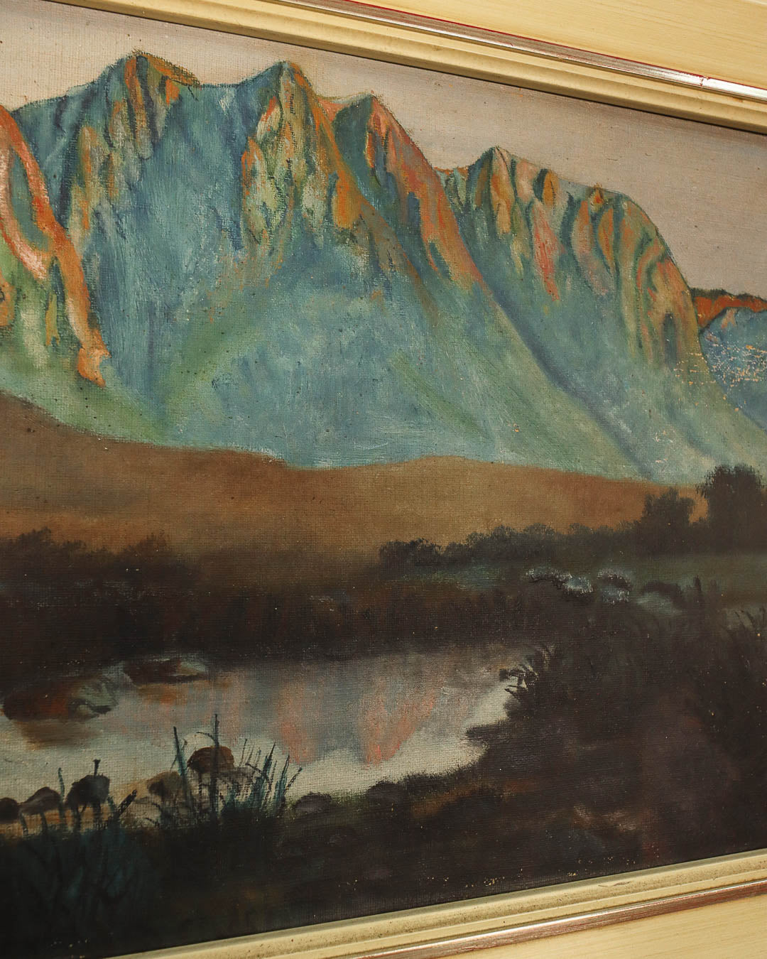 Beautifully atmospheric landscape painting, depicting a serene mountain scene reflected over still water. Painted in acrylic on board and set in a thick cream frame, the work has a quiet, moody quality that draws you in. Subtle details throughout the composition reveal themselves the longer you look—making it the kind of piece you’ll keep coming back to. A calming and contemplative artwork, perfect for adding depth to any space.