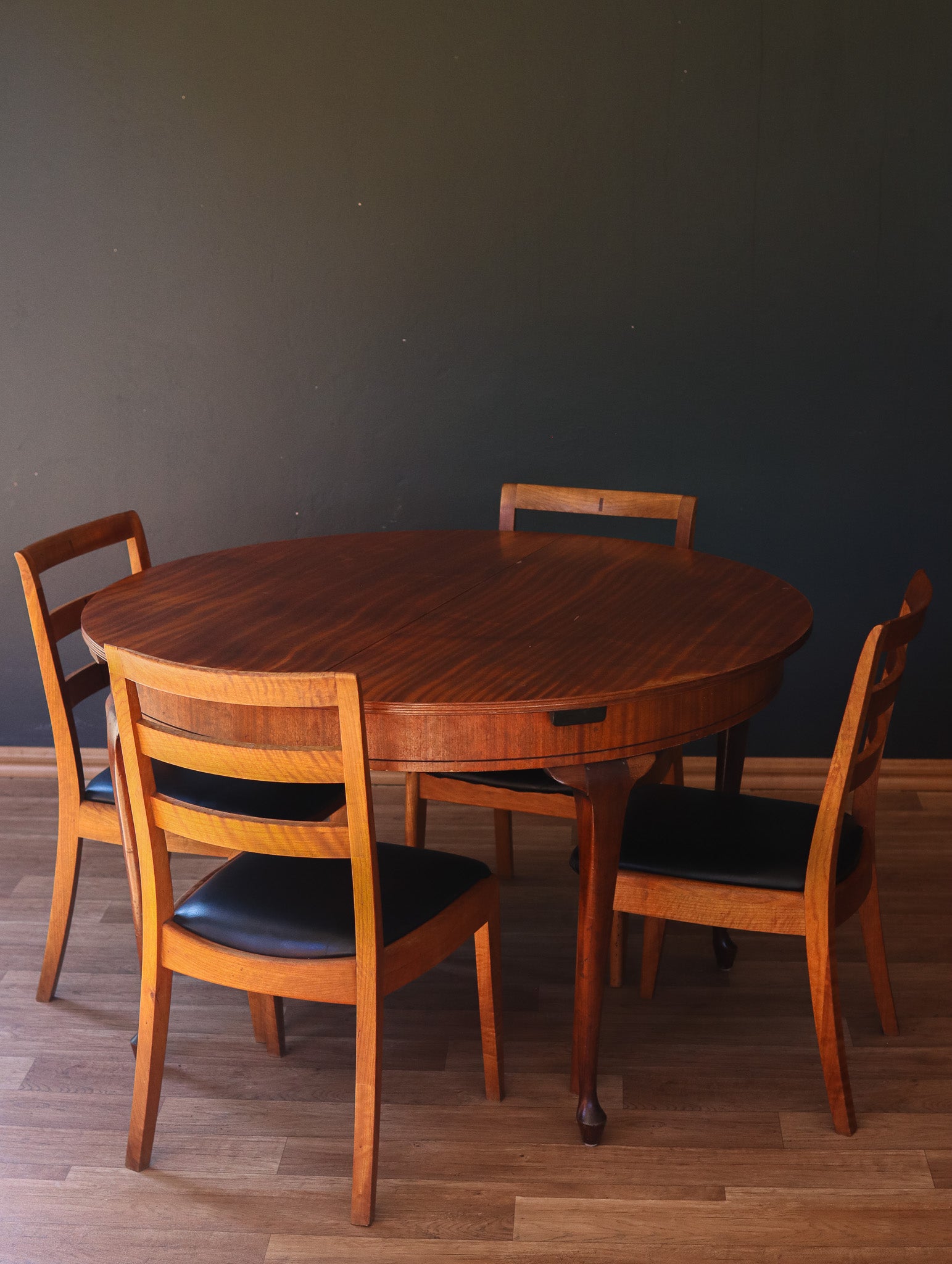 Classic extendable dining table by renowned UK manufacturer Greaves & Thomas, likely from the 1950’s, designed with timeless mid-century simplicity. Round when closed and oval when extended, this piece is both elegant and practical, ideal for everyday use or entertaining guests. The sculptural legs have the classic G&T shape. The surface has been cleaned and oiled to revive its natural warmth, with a small chip on the top consistent with age and use. A well-cared-for example of British craftsmanship that blends seamlessly into vintage-inspired interiors.