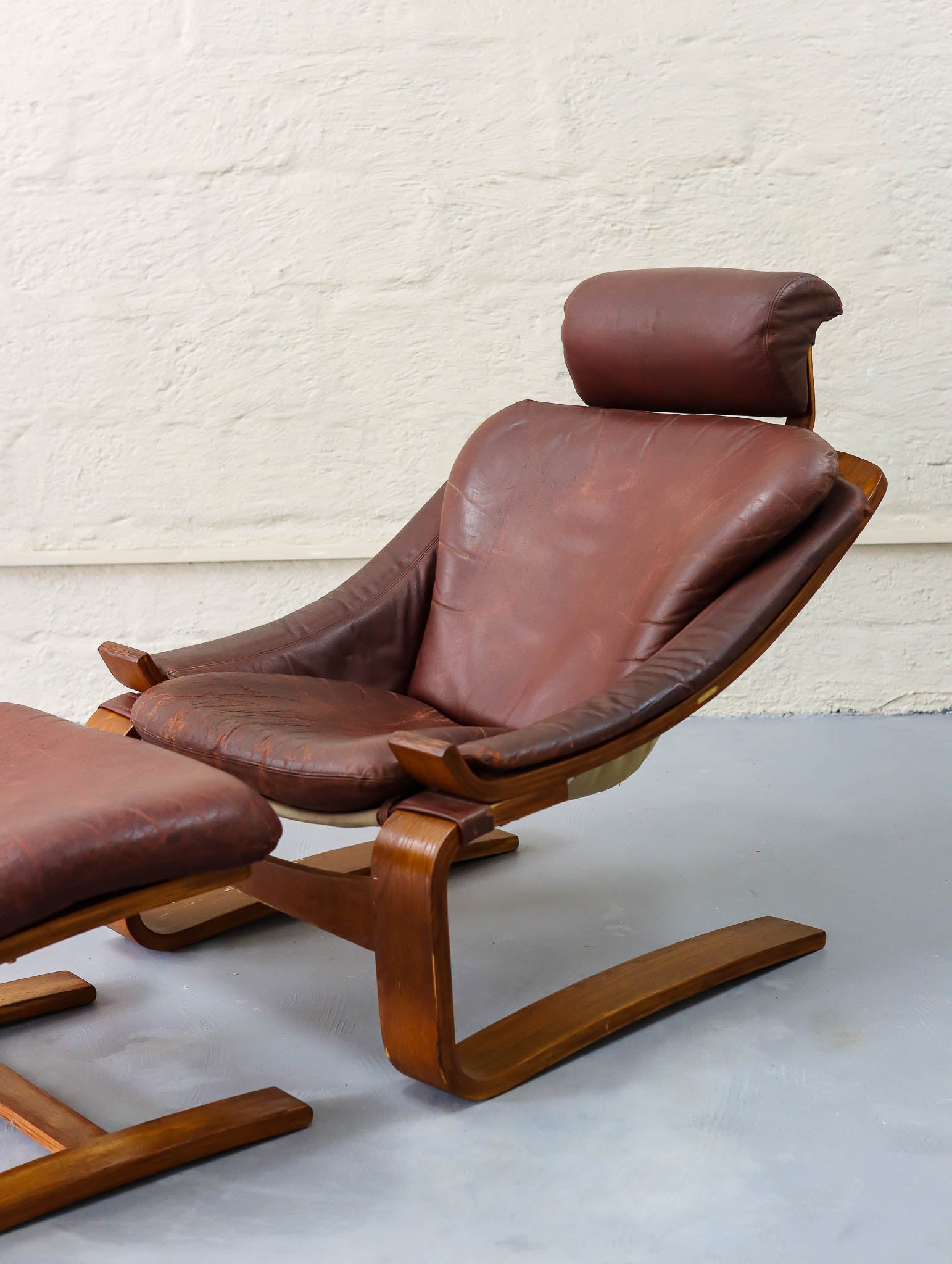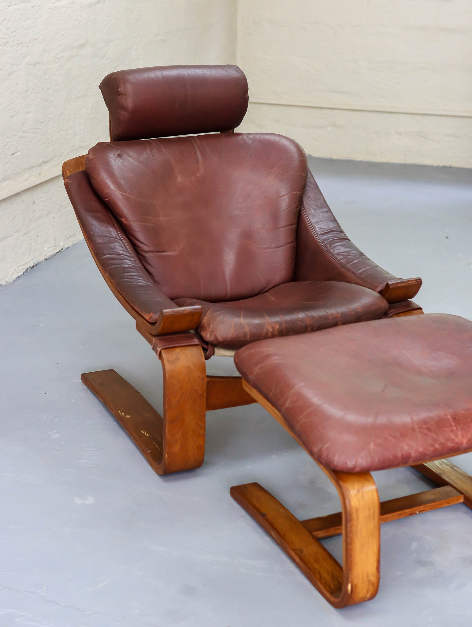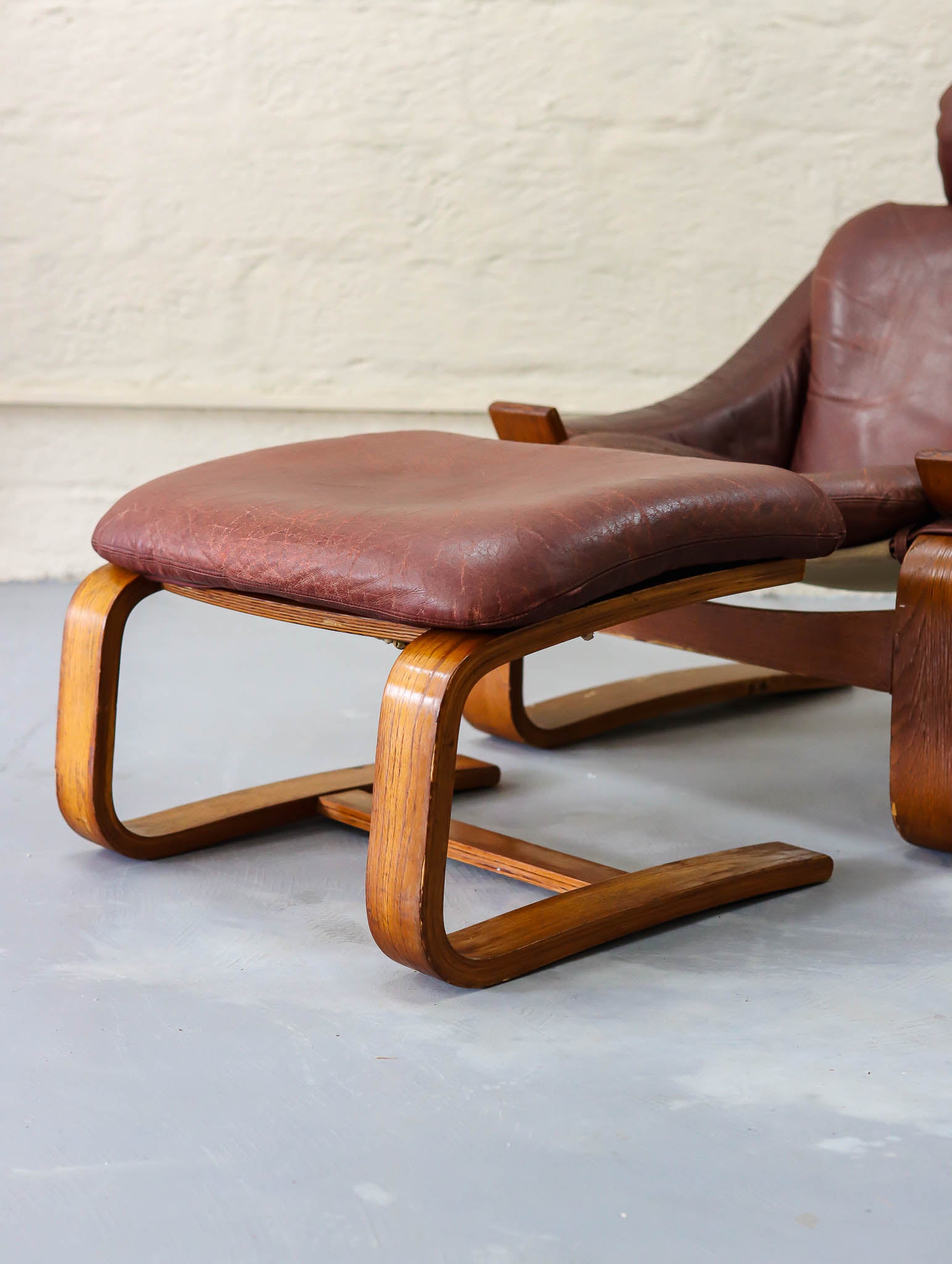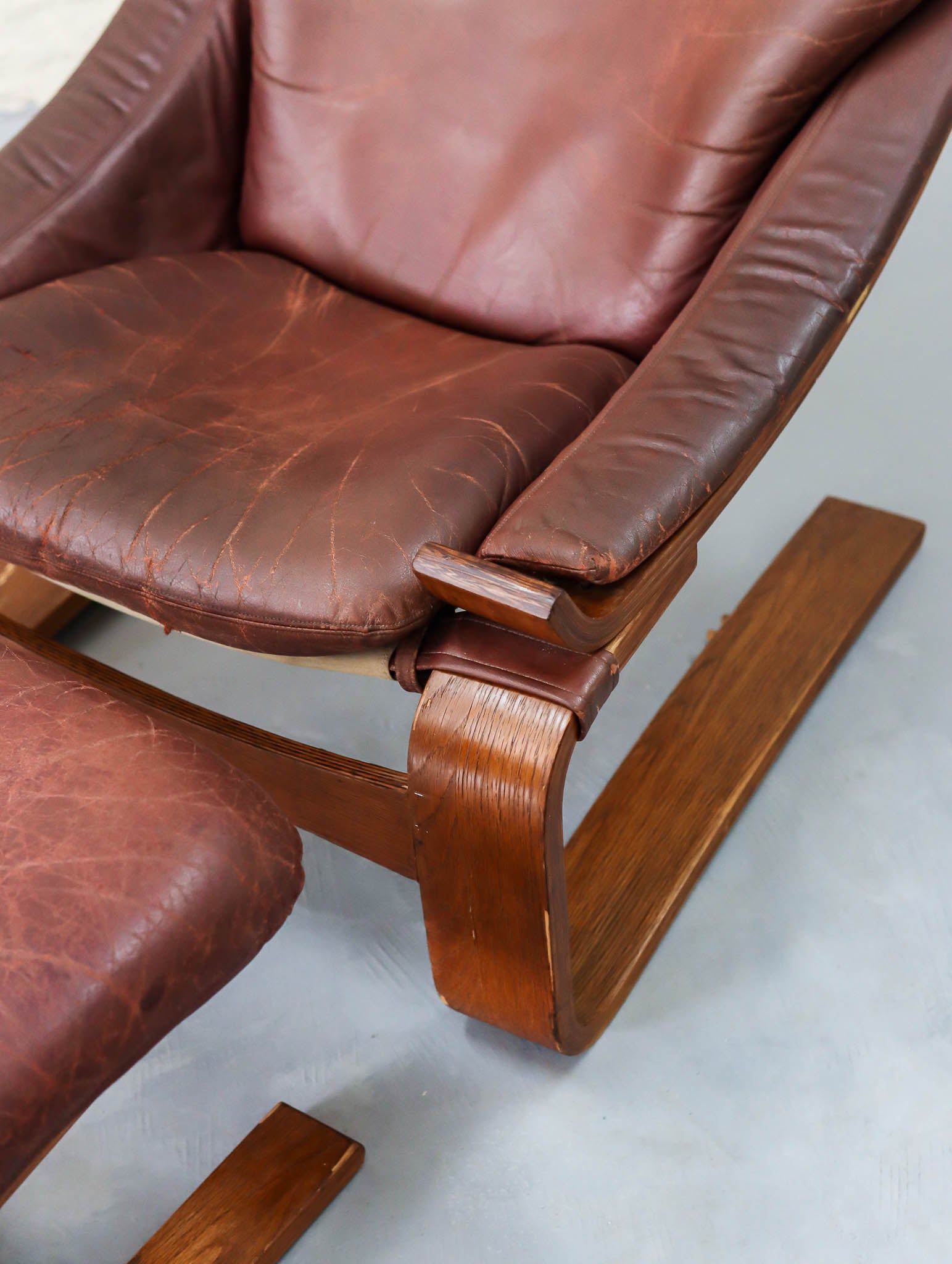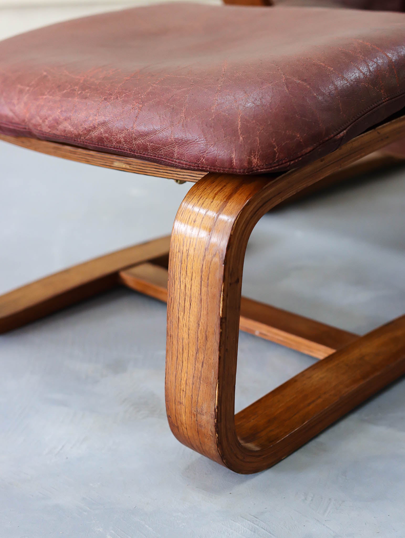 This Kroken style chair is a stunning piece originally designed by Åke Fribytter and produced by Nelo Möbel. Featuring a cantilever bentwood frame, the Kroken Chair is extremely comfortable. The original burgundy leather, characteristic of the 70s style, enhances its nostalgic charm and was kept for this purpose.