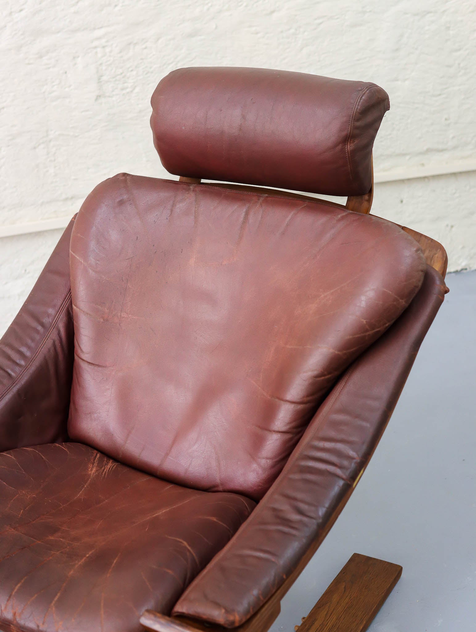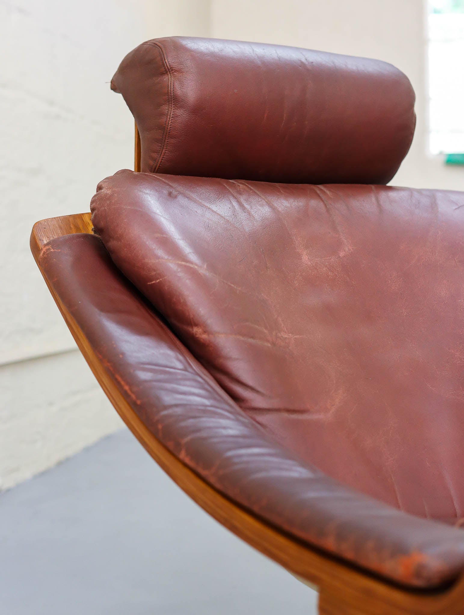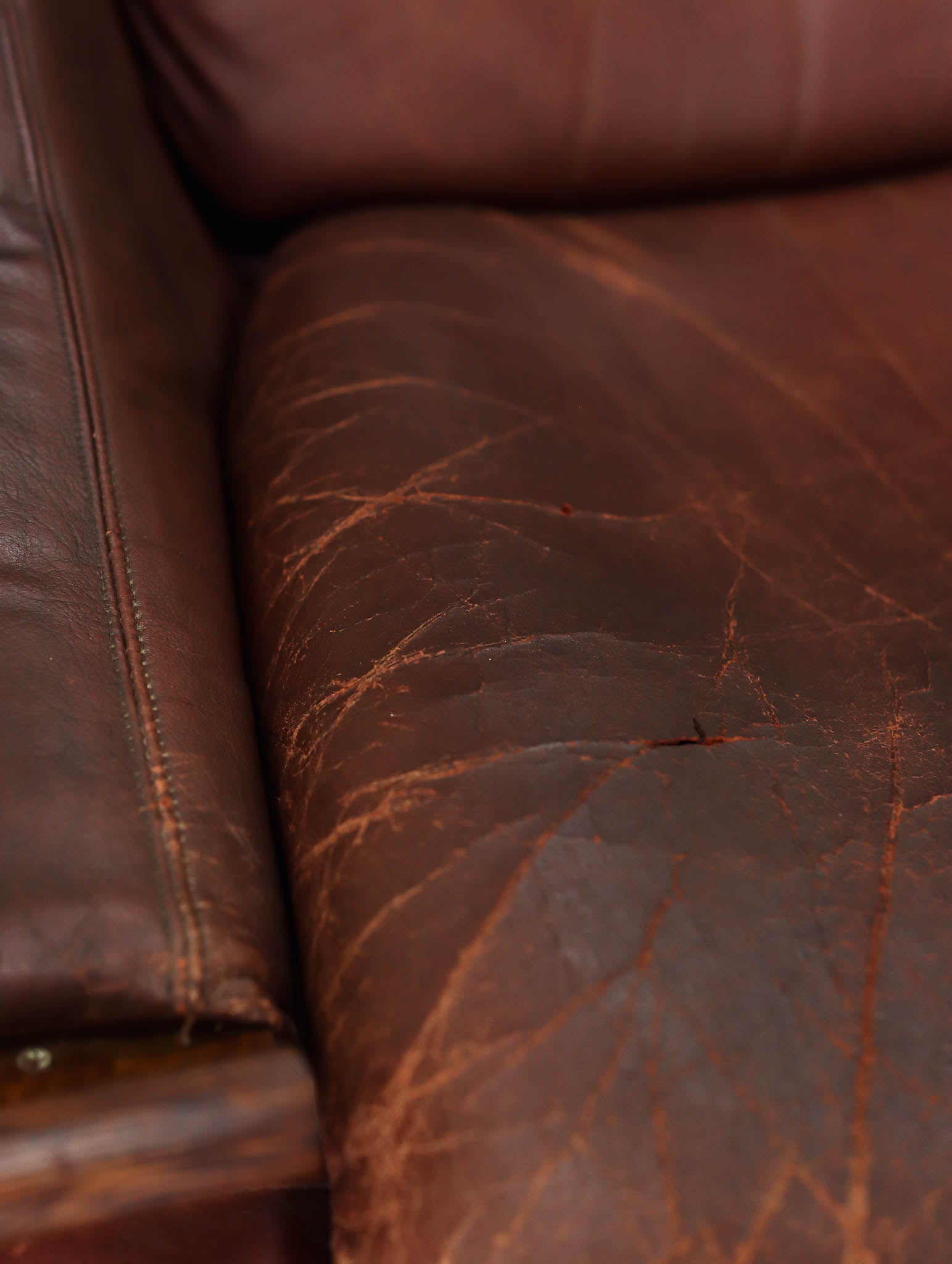 In good overall condition with aged wear on the leather. The wooden frames were oiled and the original leather cleaned, conditioned & repaired as best as possible to retain its original appearance. This vintage chair shows some natural wear on the leather adding to its treasured character.