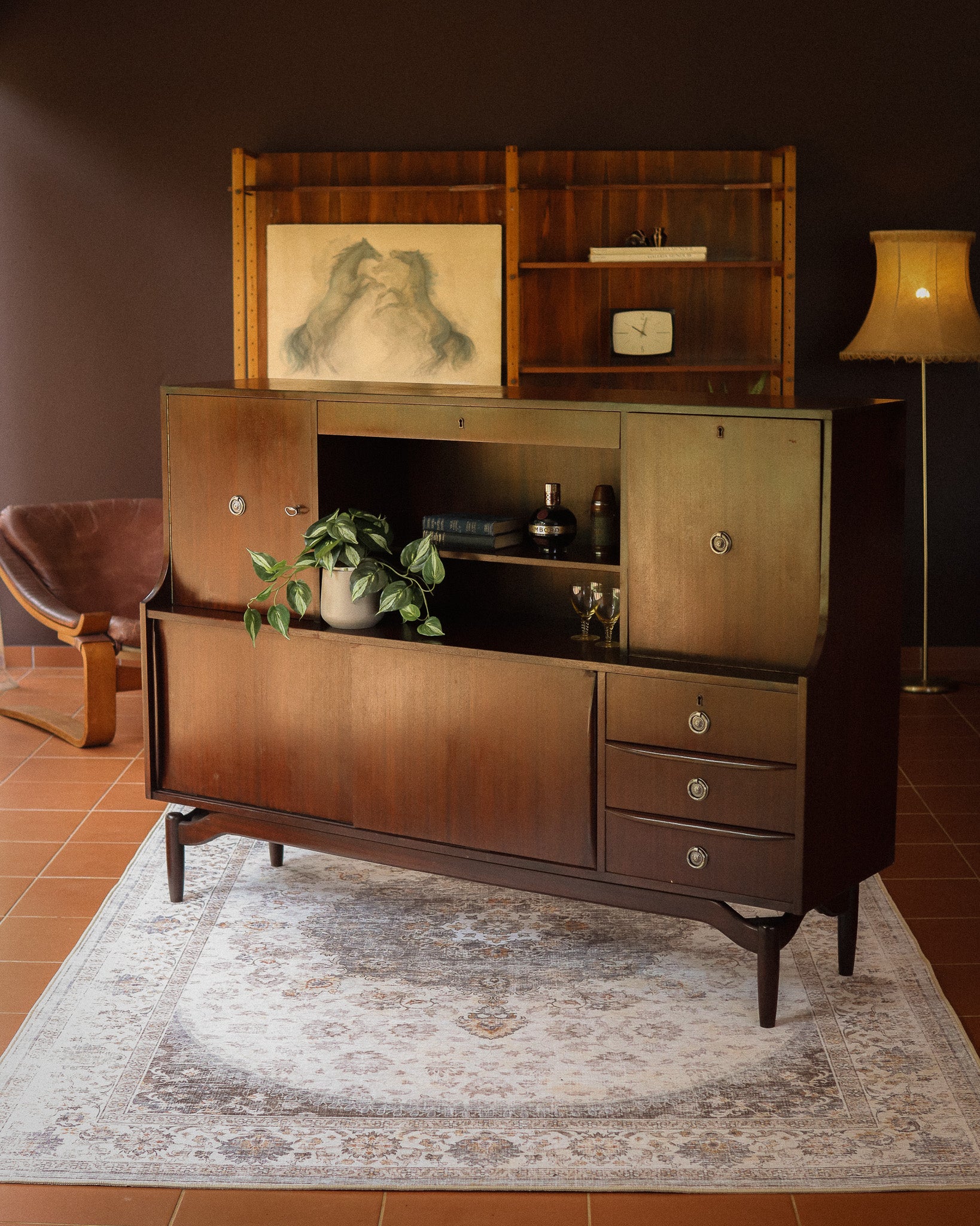 On the right side, there's a drop down beverage cabinet, while the left side features a cabinet enclosing three shelves, and in the centre, there's a cutlery drawer above open shelved display/storage. The bottom is equipped with sliding doors that enclose an adjustable shelf. There are three side drawers featuring wooden lip handles.