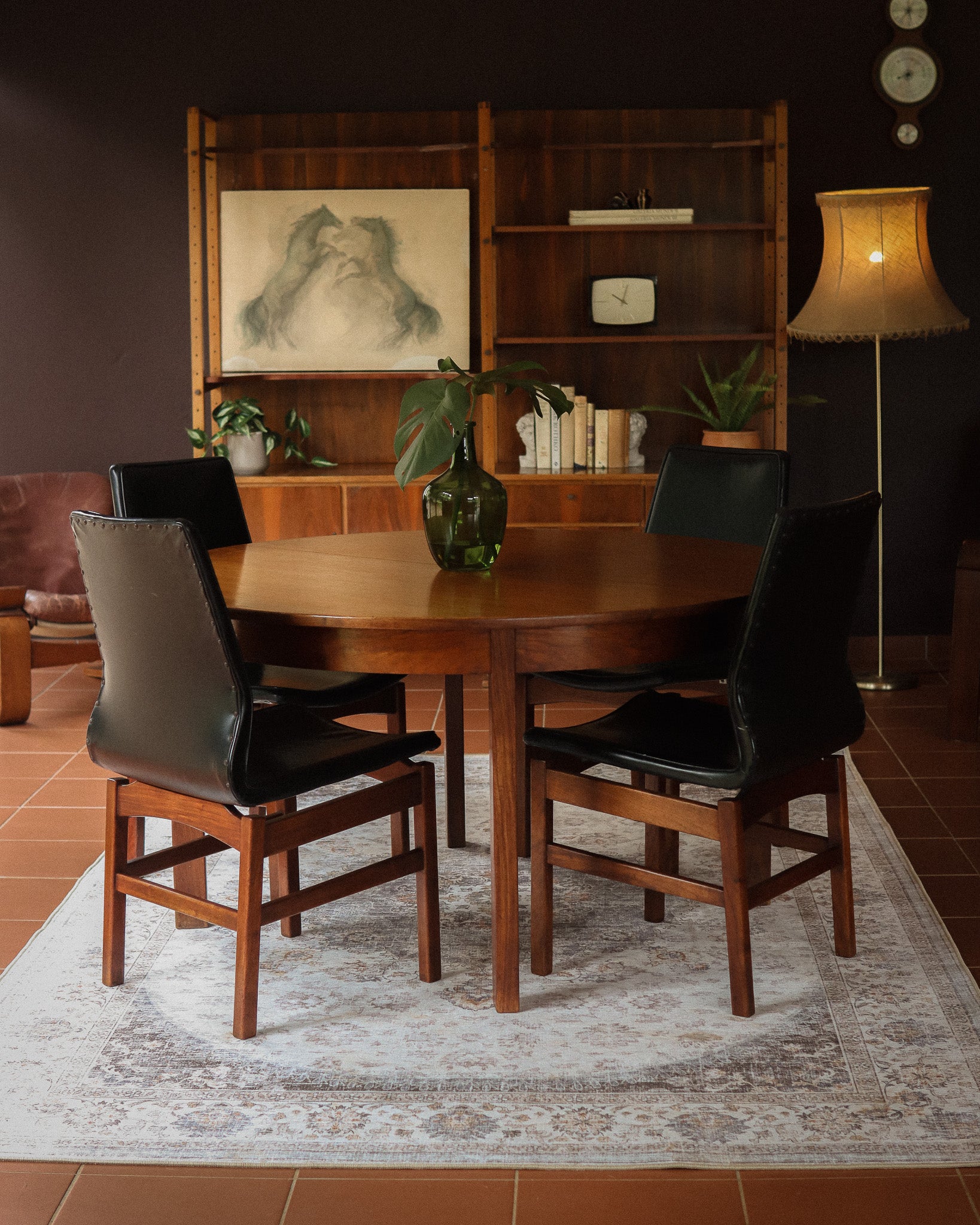 Stunning mid-century dining set with four chairs in a stylish black vinyl. The round table extends to an oval, with the potential to seat six. The chairs have intricate ‘floating’ bases and have a BQF maker’s mark. This unique set is quite rare and a wonderful collector’s piece.