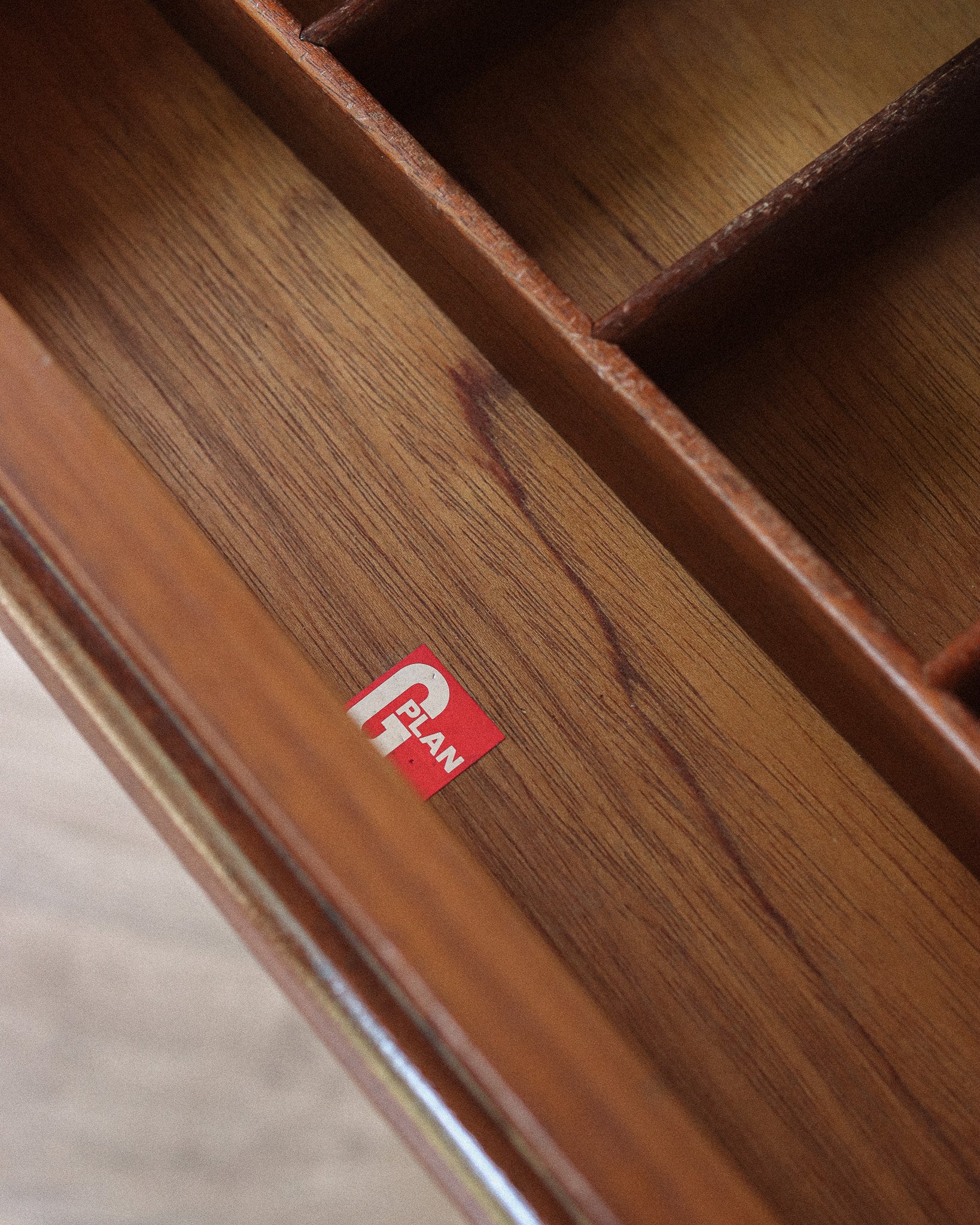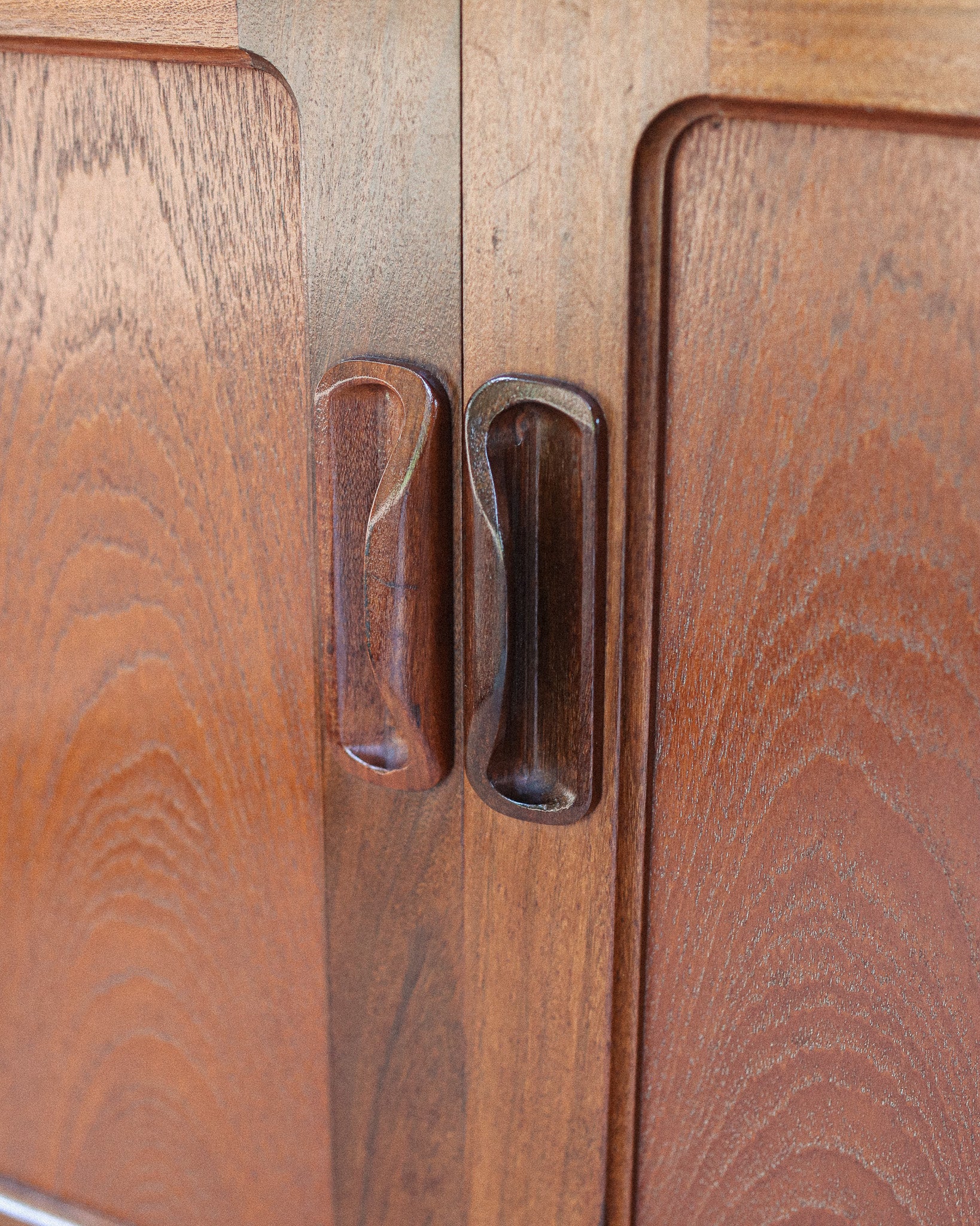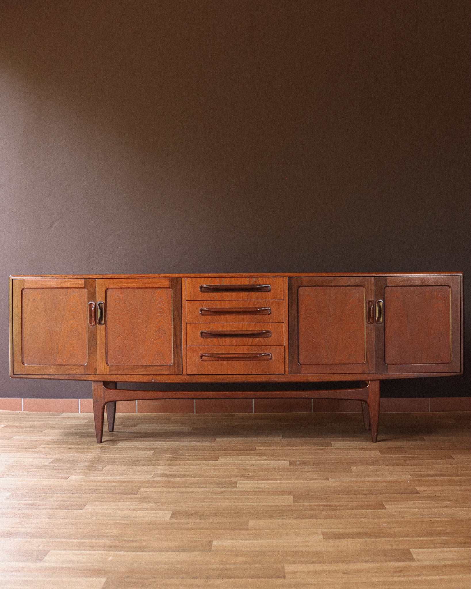 Featuring contrasting teak door & drawer handles, two cupboards flank four middle drawers, which includes the cutlery tray. The sideboard is beautifully finished with match grain teak throughout and is set on an elegant solid and sculptural frame.