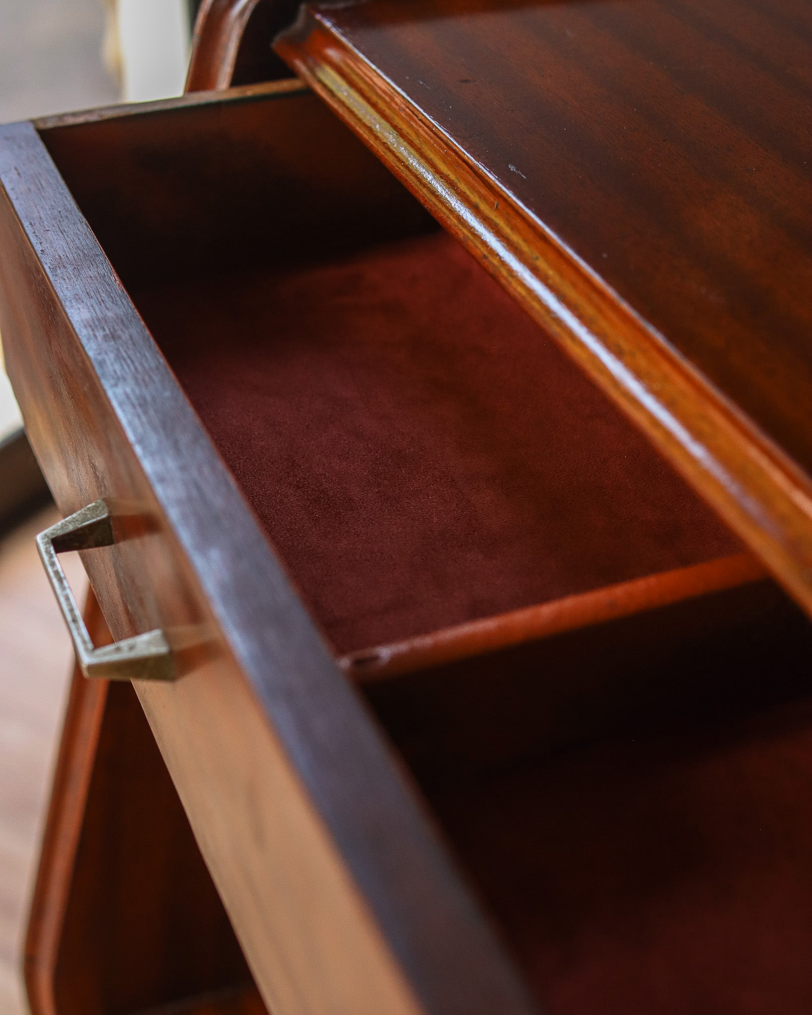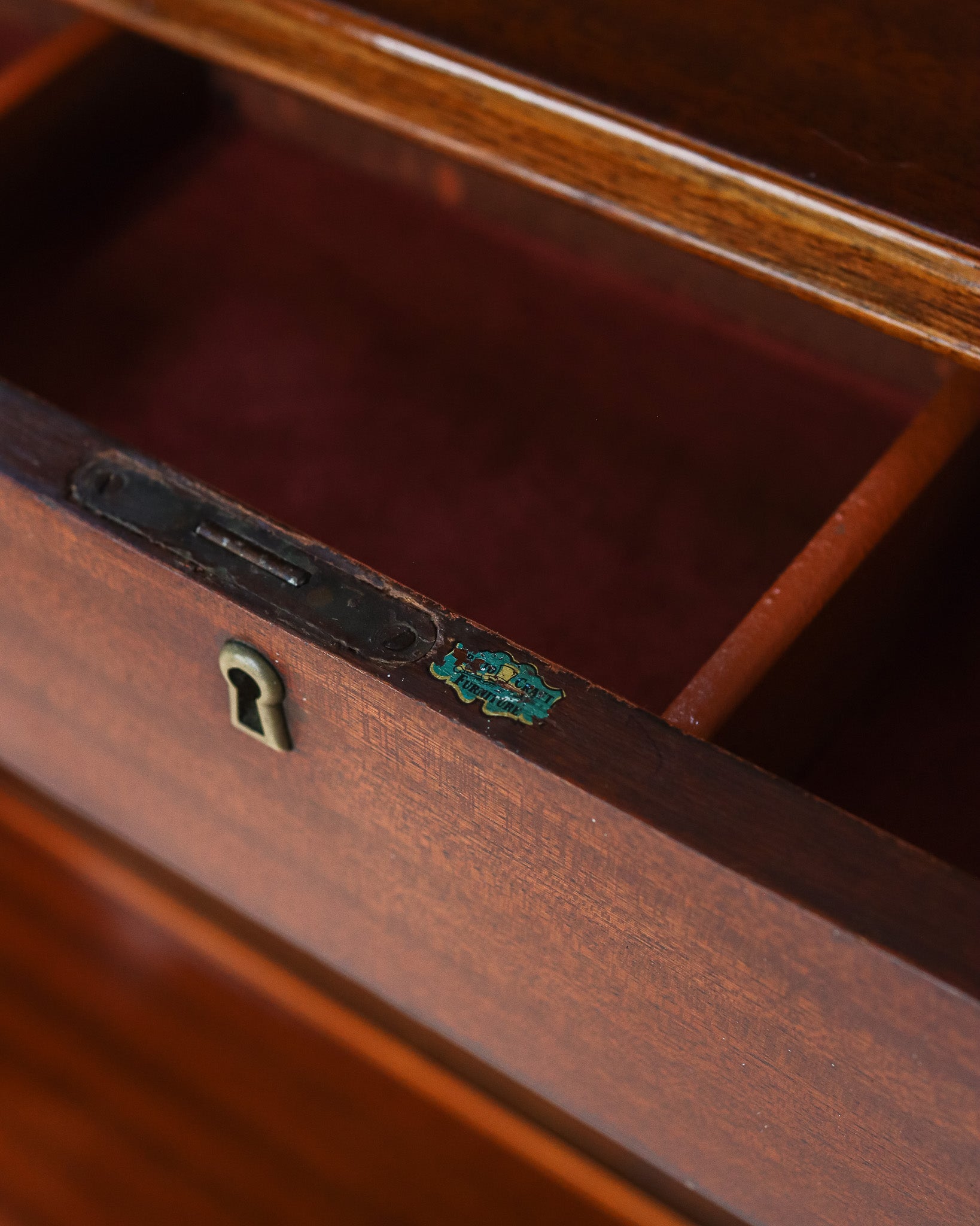 The wood has been restored, with minor signs of its vintage age. Part of the back panel is missing, but not visible from the front. Some wear inside the cutlery drawer after a previous restoration. The piece has been priced accordingly.