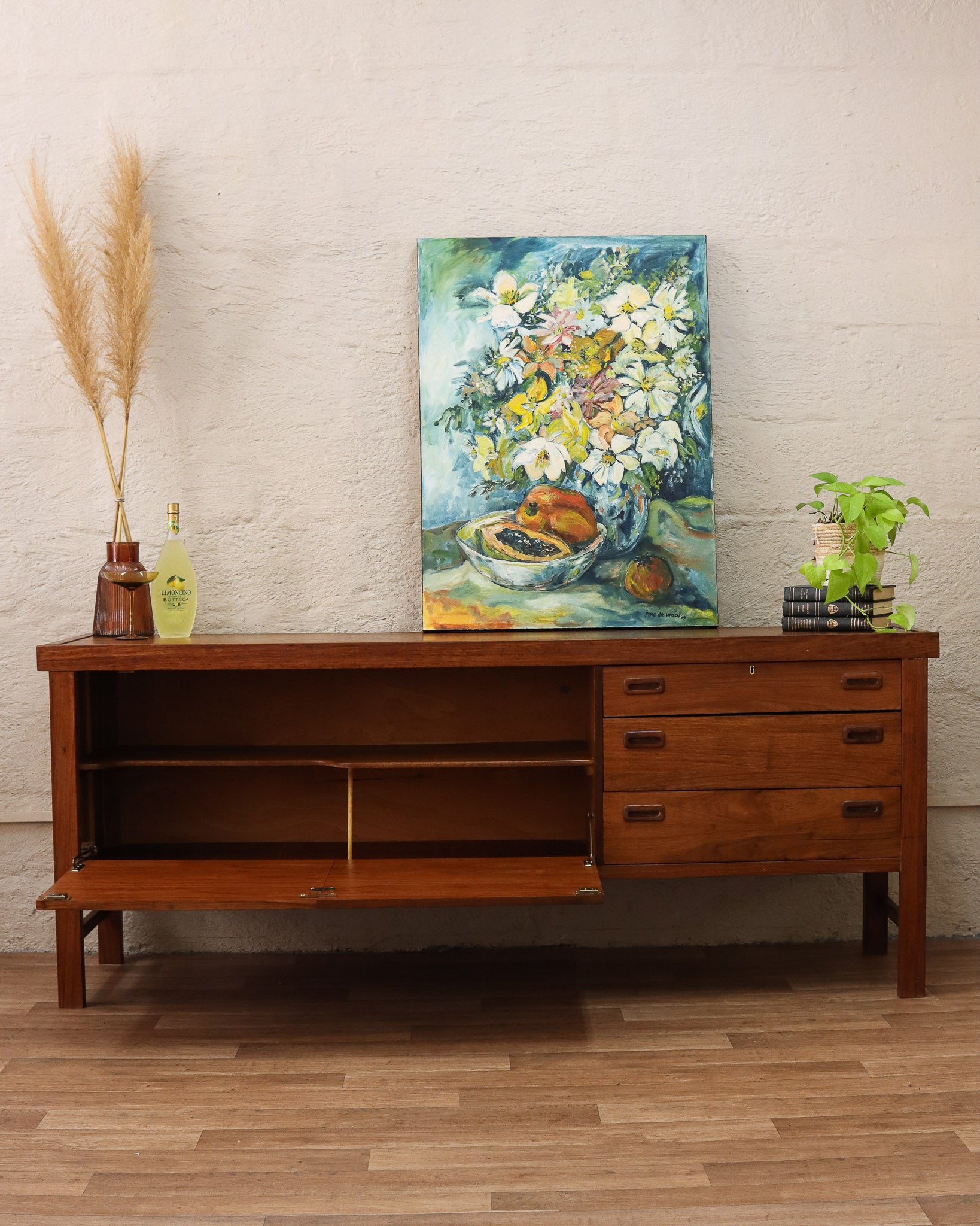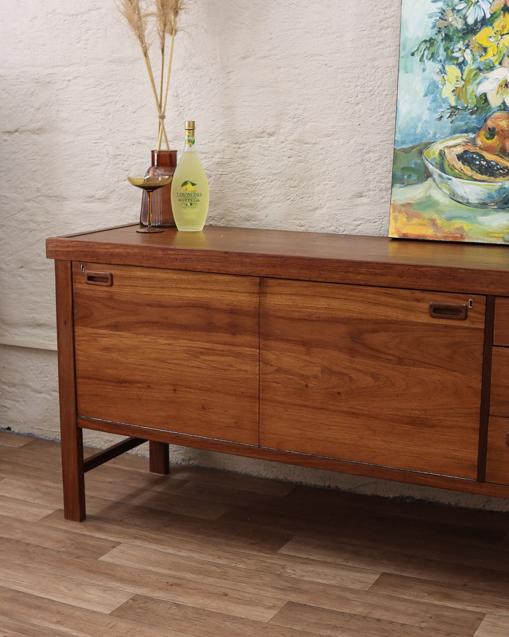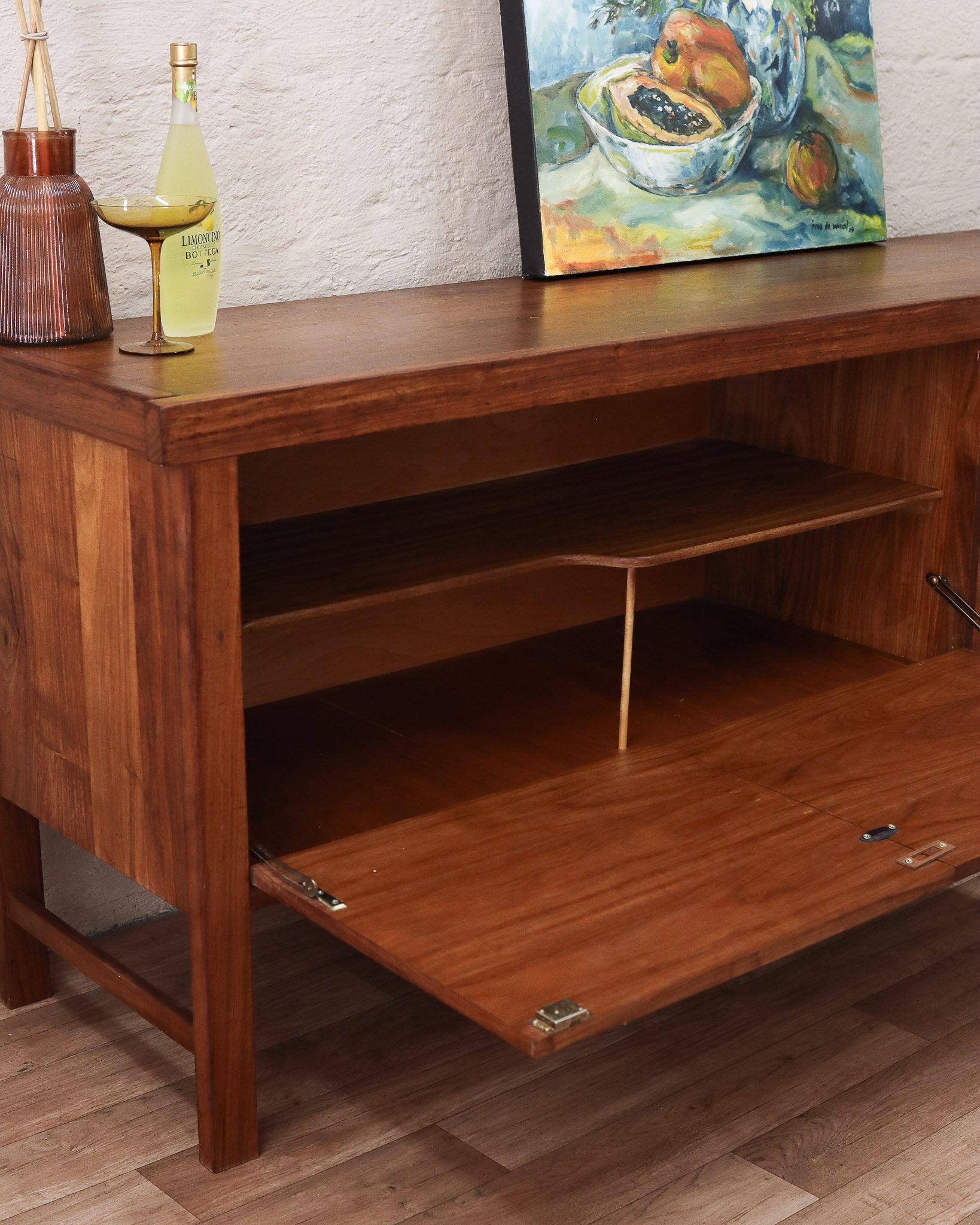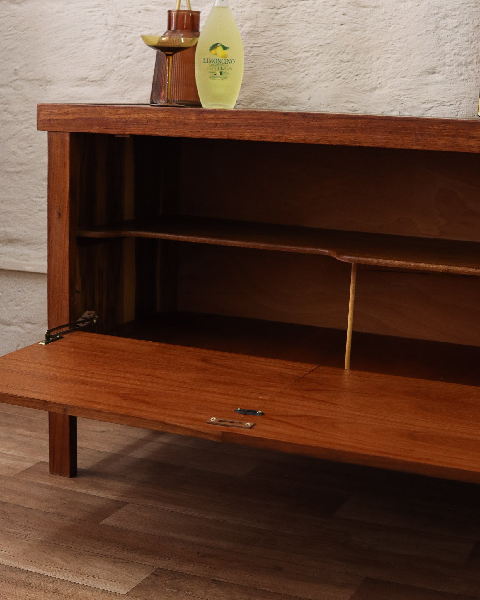 A beautiful solid Kiaat sideboard with modern clean lines and plenty of space for storage. The two doors drop down, with a curved shelf ideal for storing drinks. This can be used in the dining room and also as a television stand. Minor marks on the surface consistent with age. The wood has been lightly sanded and refinished.