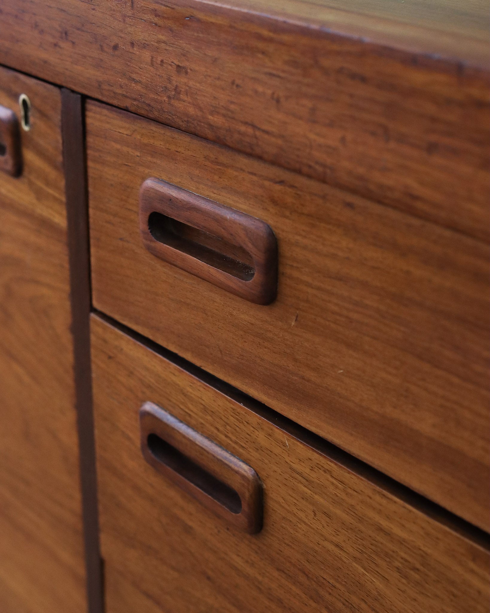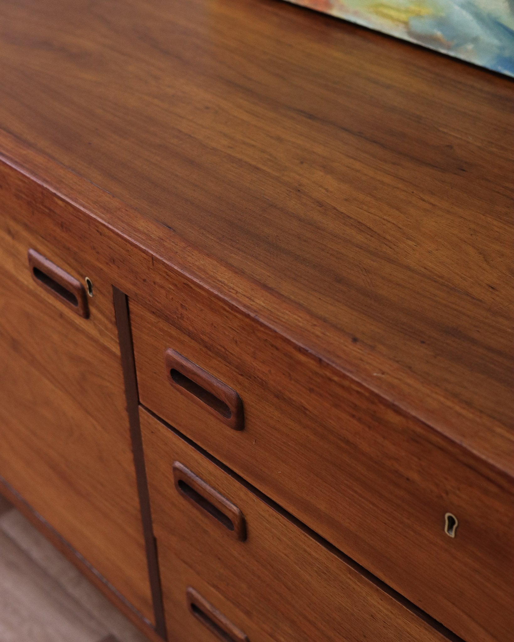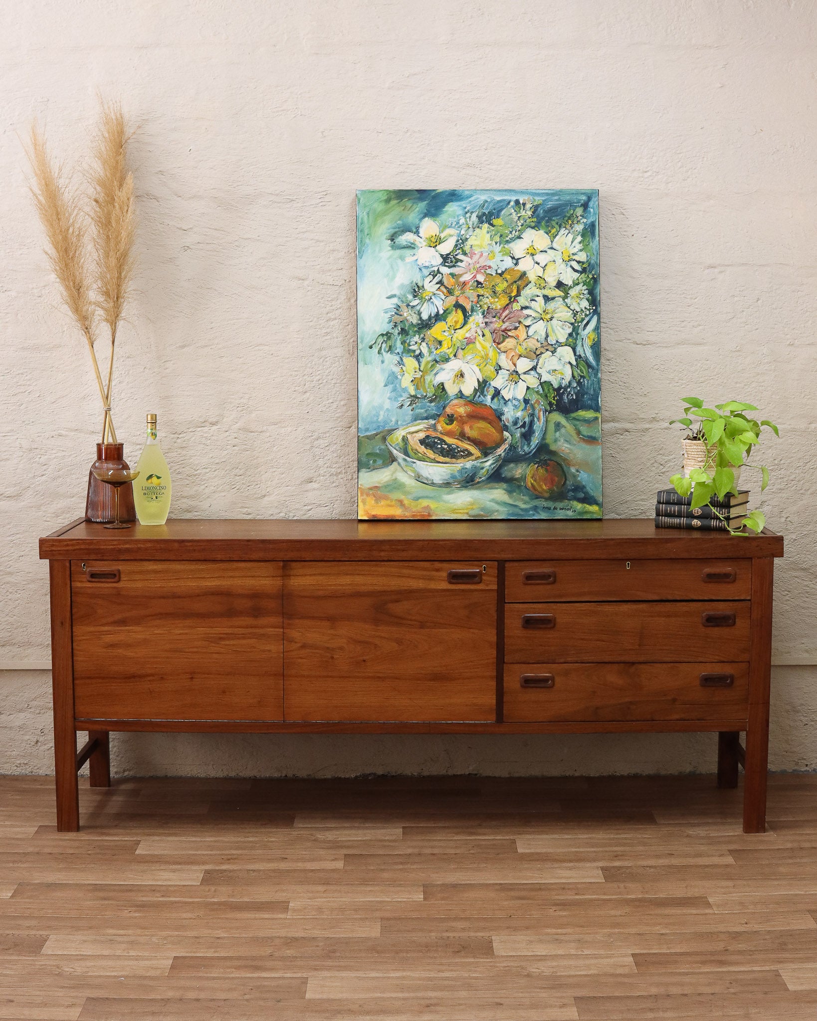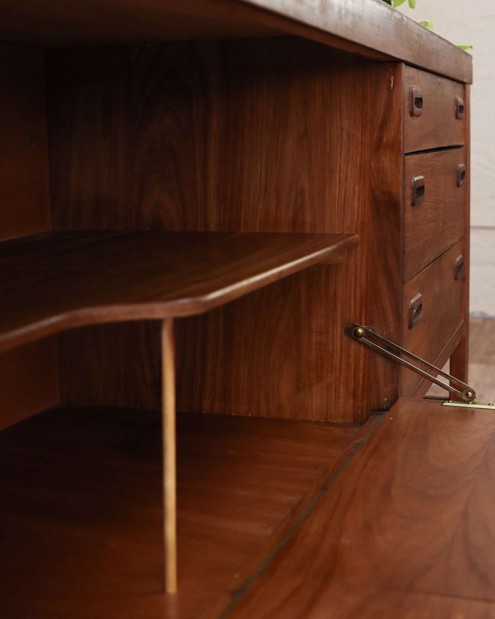 A beautiful solid Kiaat sideboard with modern clean lines and plenty of space for storage. The two doors drop down, with a curved shelf ideal for storing drinks. This can be used in the dining room and also as a television stand. Minor marks on the surface consistent with age. The wood has been lightly sanded and refinished.