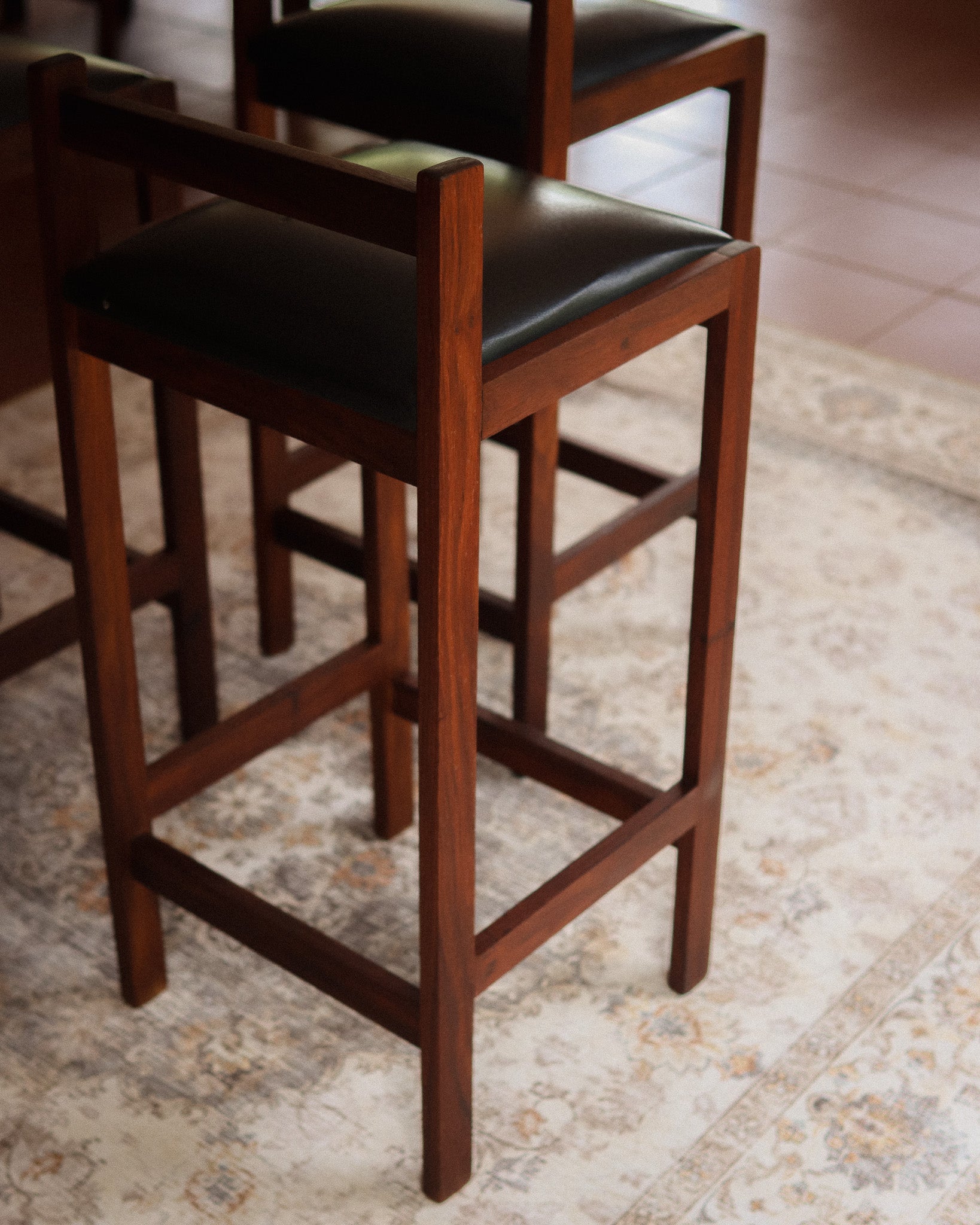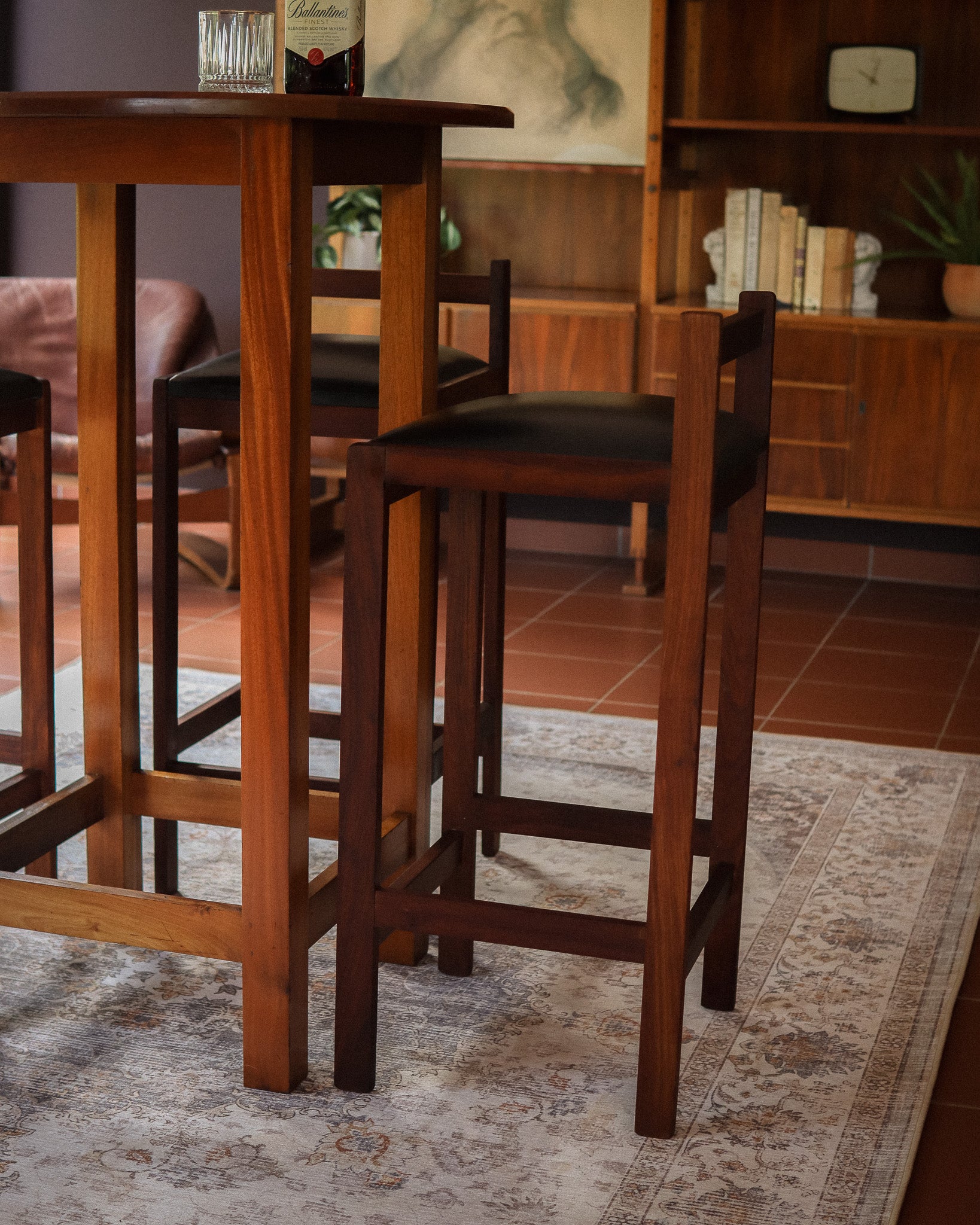 Set of three mid-century bar stools made from stunning kiaat wood and upholstered in original black vinyl, paired with a solid round bar table. This compact set is perfect for adding additional seating to smaller living or entertaining spaces.