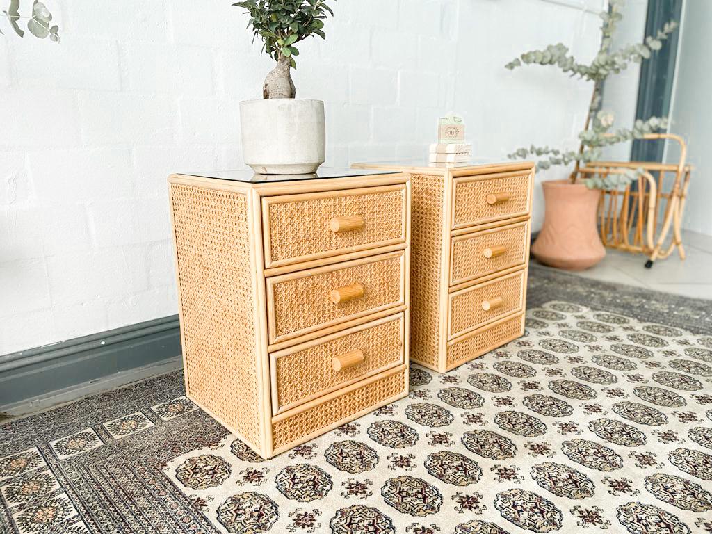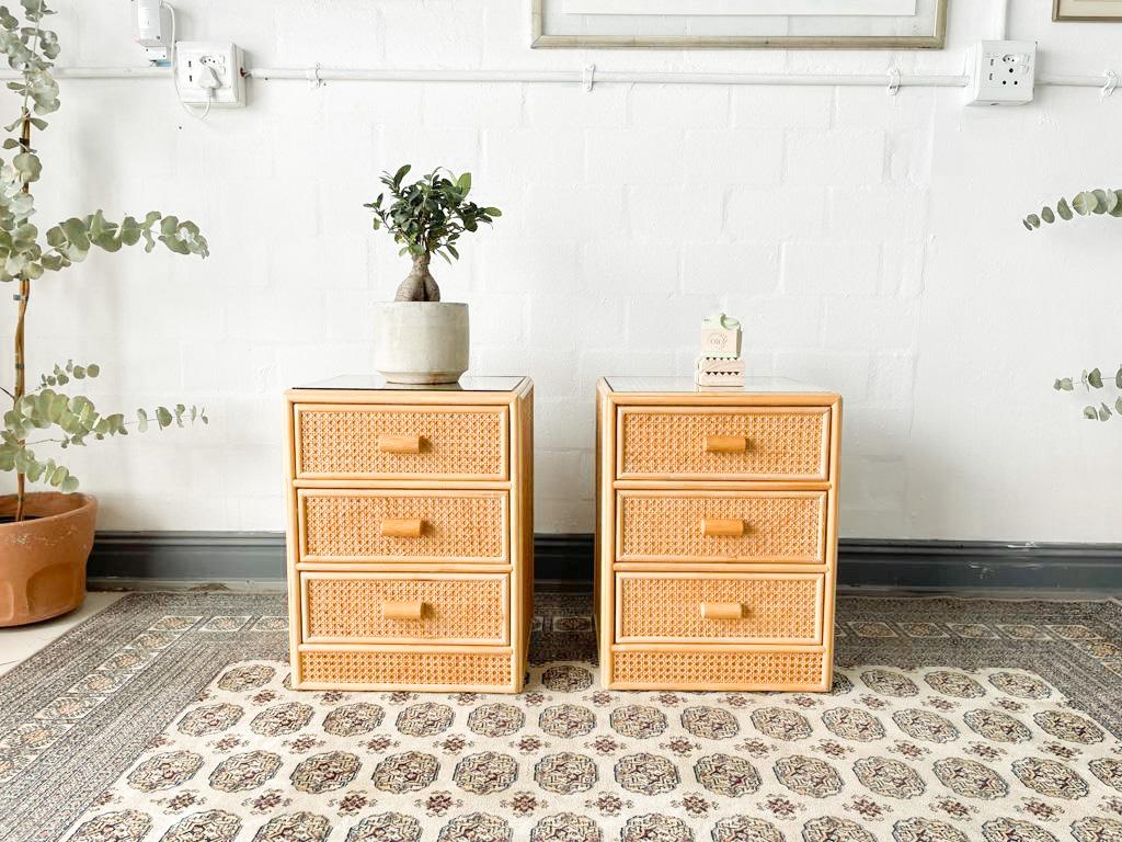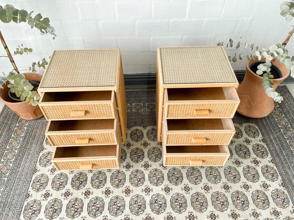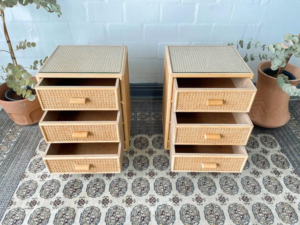Pair of cane pedestals in pristine condition, includes glass tops and contains 3 drawers for maximum storage space.