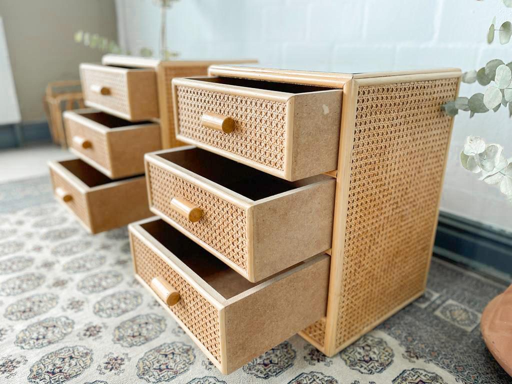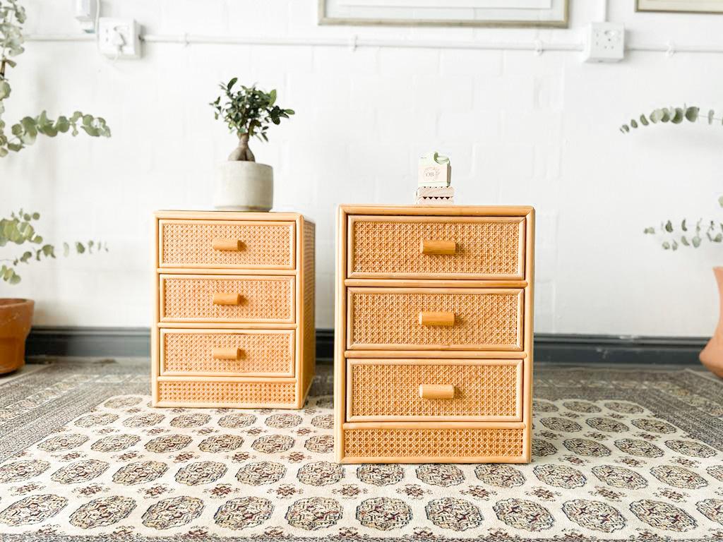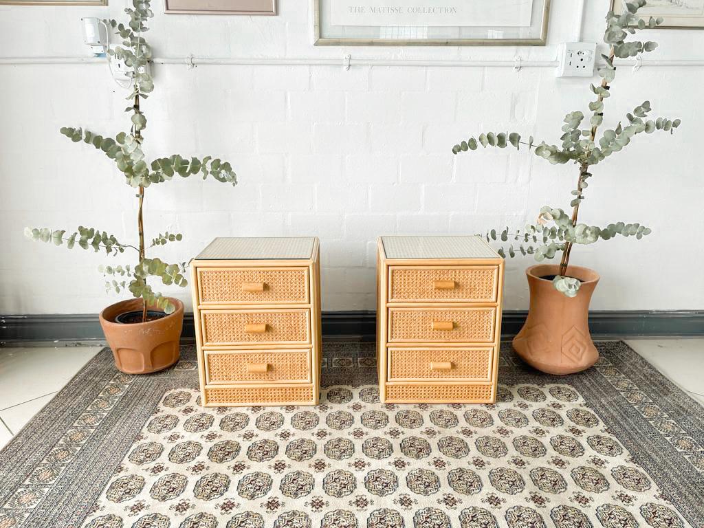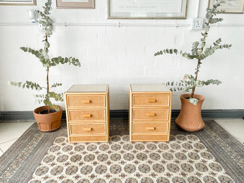 Pair of cane pedestals in pristine condition, includes glass tops and contains 3 drawers for maximum storage space.