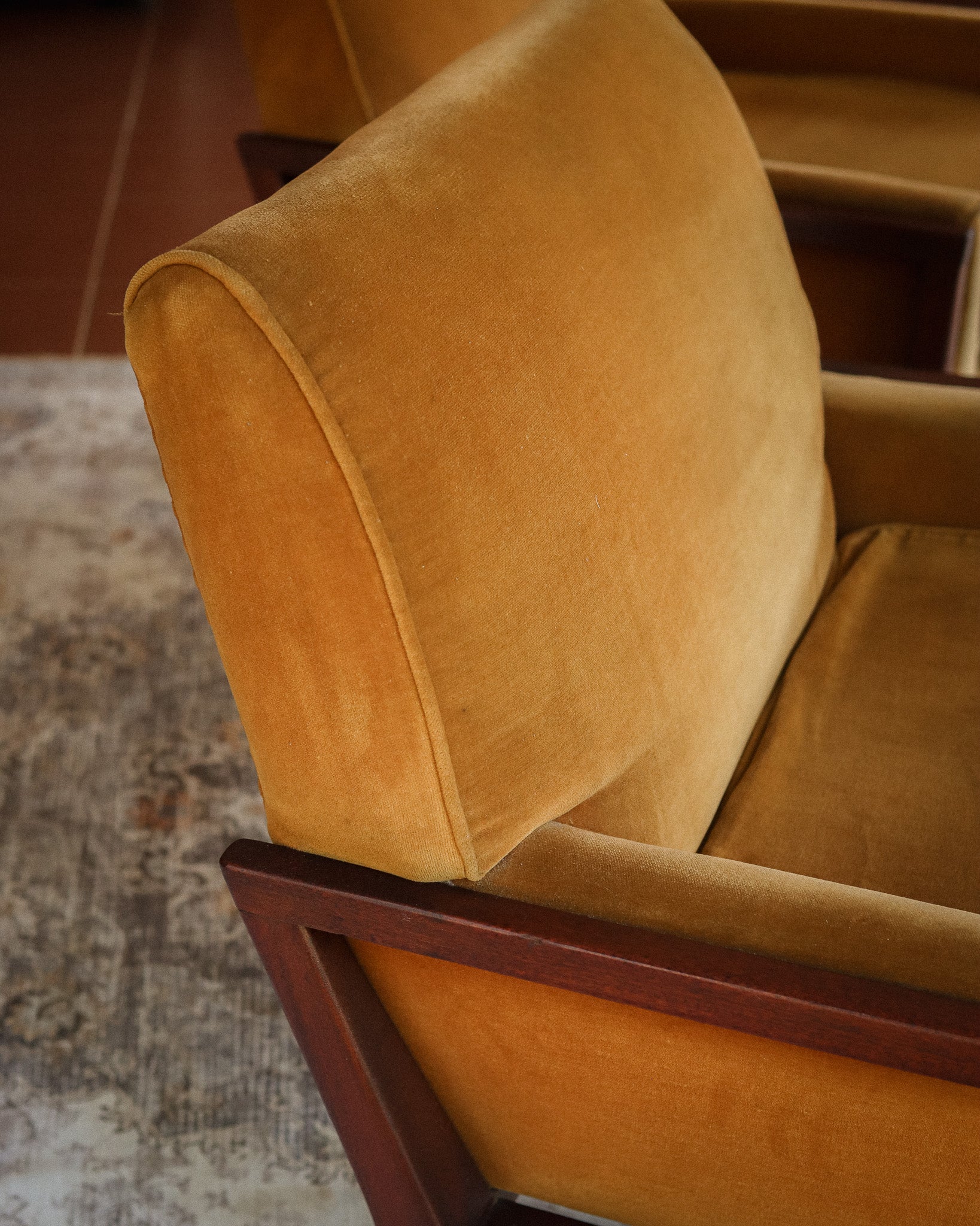 A stunning and incredibly comfortable set of armchairs in vintage velvet upholstery with unique wooden frames. They have a classic mid-century shape, with a rich mustard color that will brighten any living room. A rare find, part of a set with a three-seater couch (sold separately).