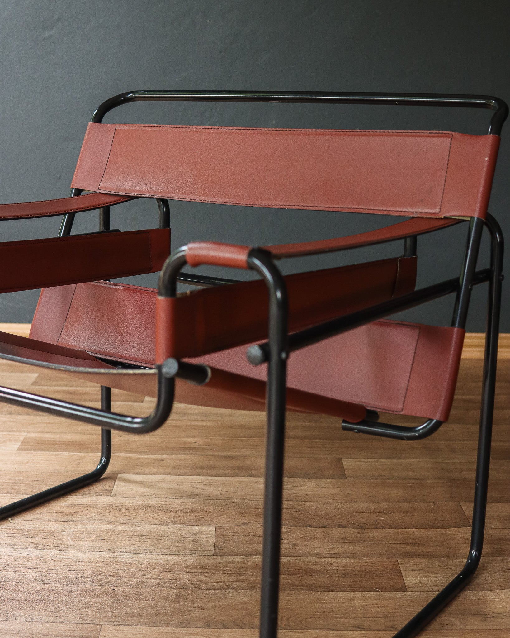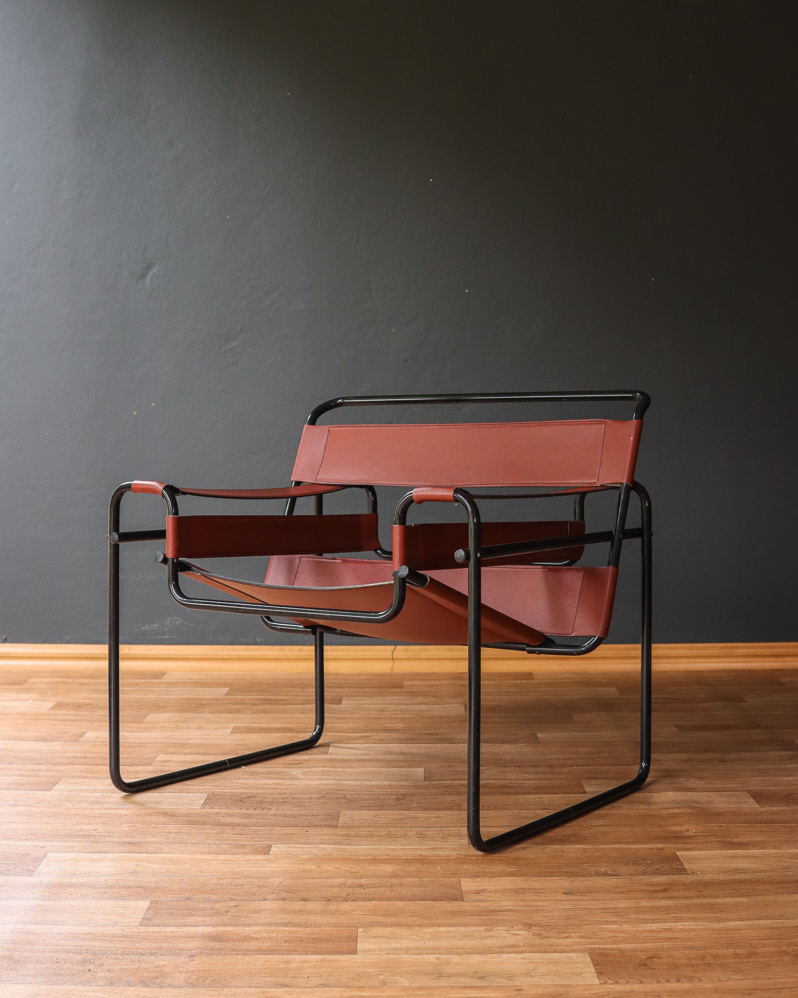 Stylish 'Wassily' chair (Model B3) in a warm brown. Originally designed by Marcel Breuer in the 20's, they are one of the most recognizable chairs in design (and one of the first furniture designs to make use of steel tubing in furniture). If you love Bauhaus design, this is a must-have piece. The chair is in great condition showing a few marks consistent with age and use. It has been thoroughly cleaned and treated.