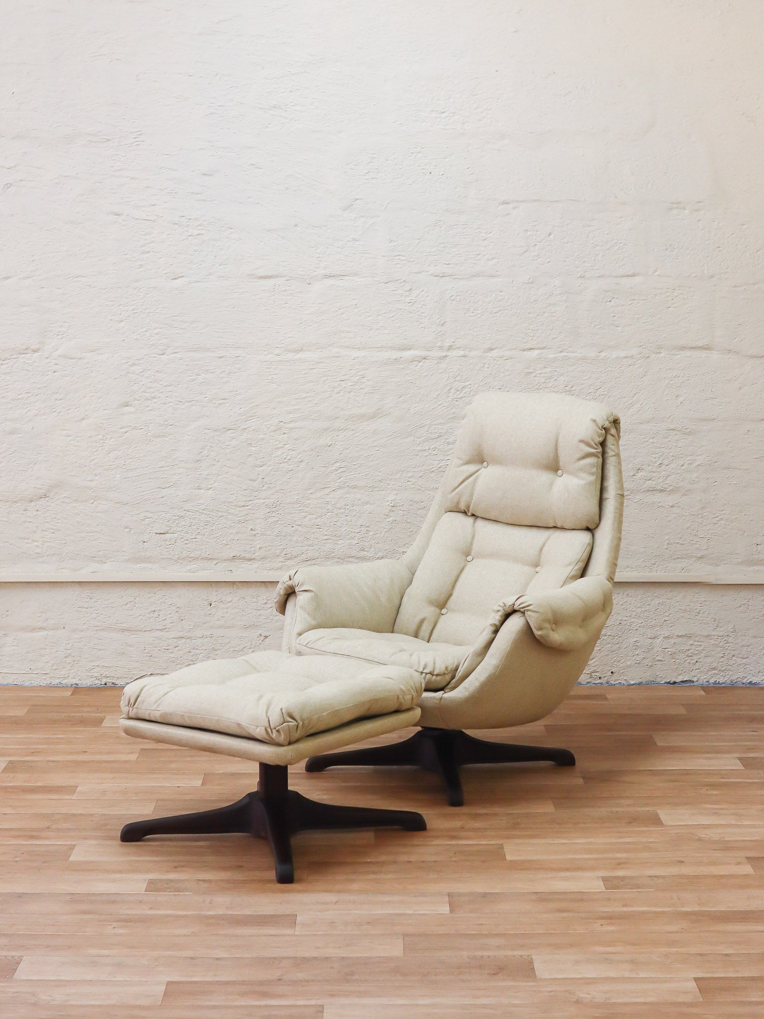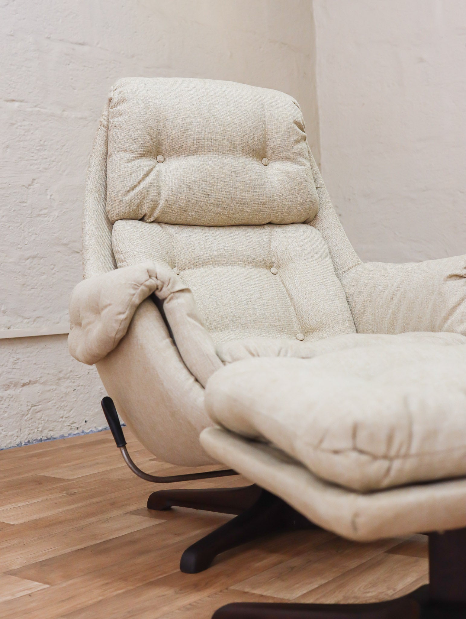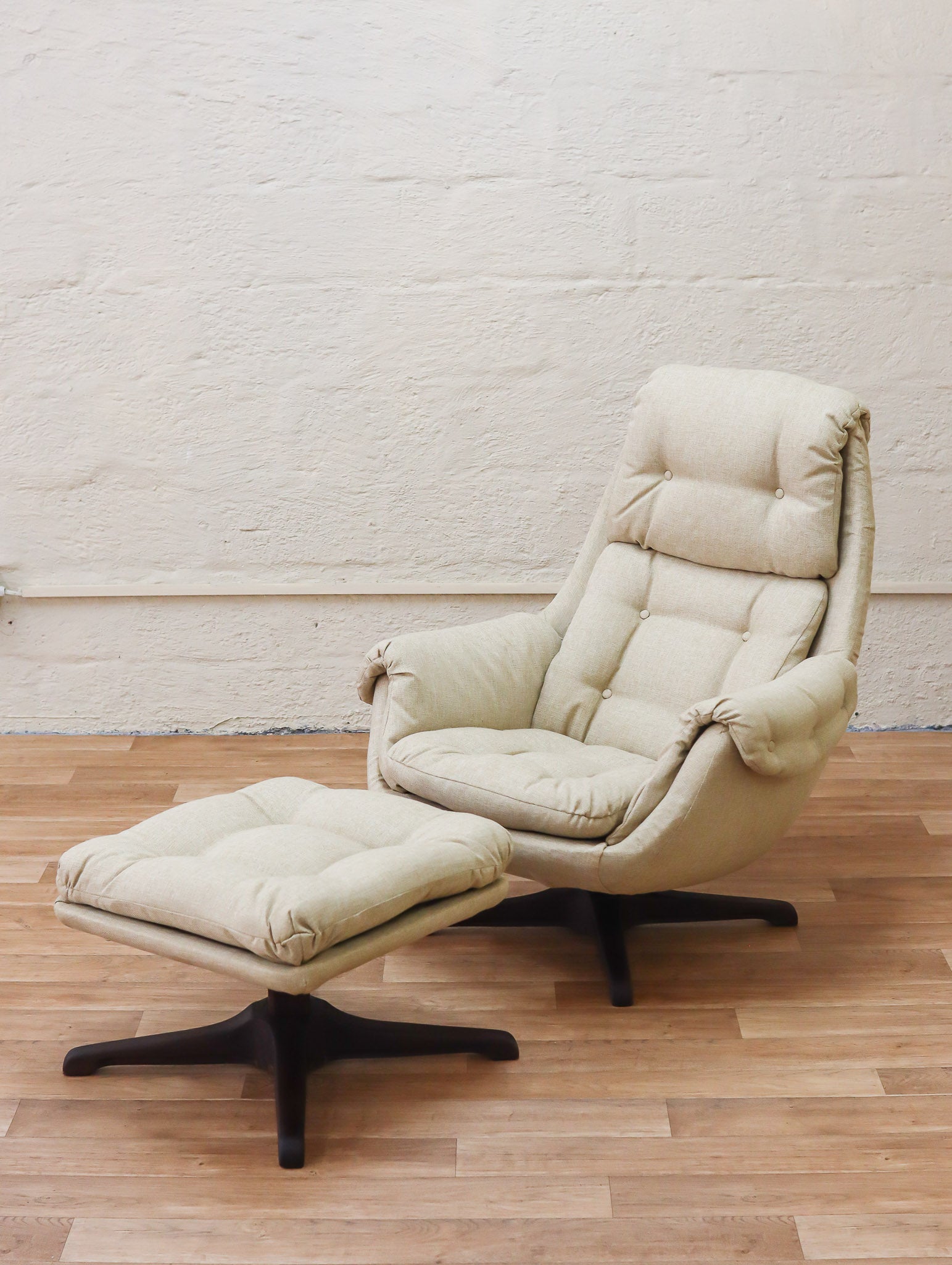 The ultimate lounge chair and stool combo, manufactured locally by South African company Grafton Everest. The chair and stool both feature a 360-degree swivel rotation and wooden base, with a reclining mechanism on the chair. The wooden bases have been carefully sanded and refinished. The entire set has been professionally reupholstered in high-quality cream fabric. Extremely comfortable and ready to adorn any retro living room.
