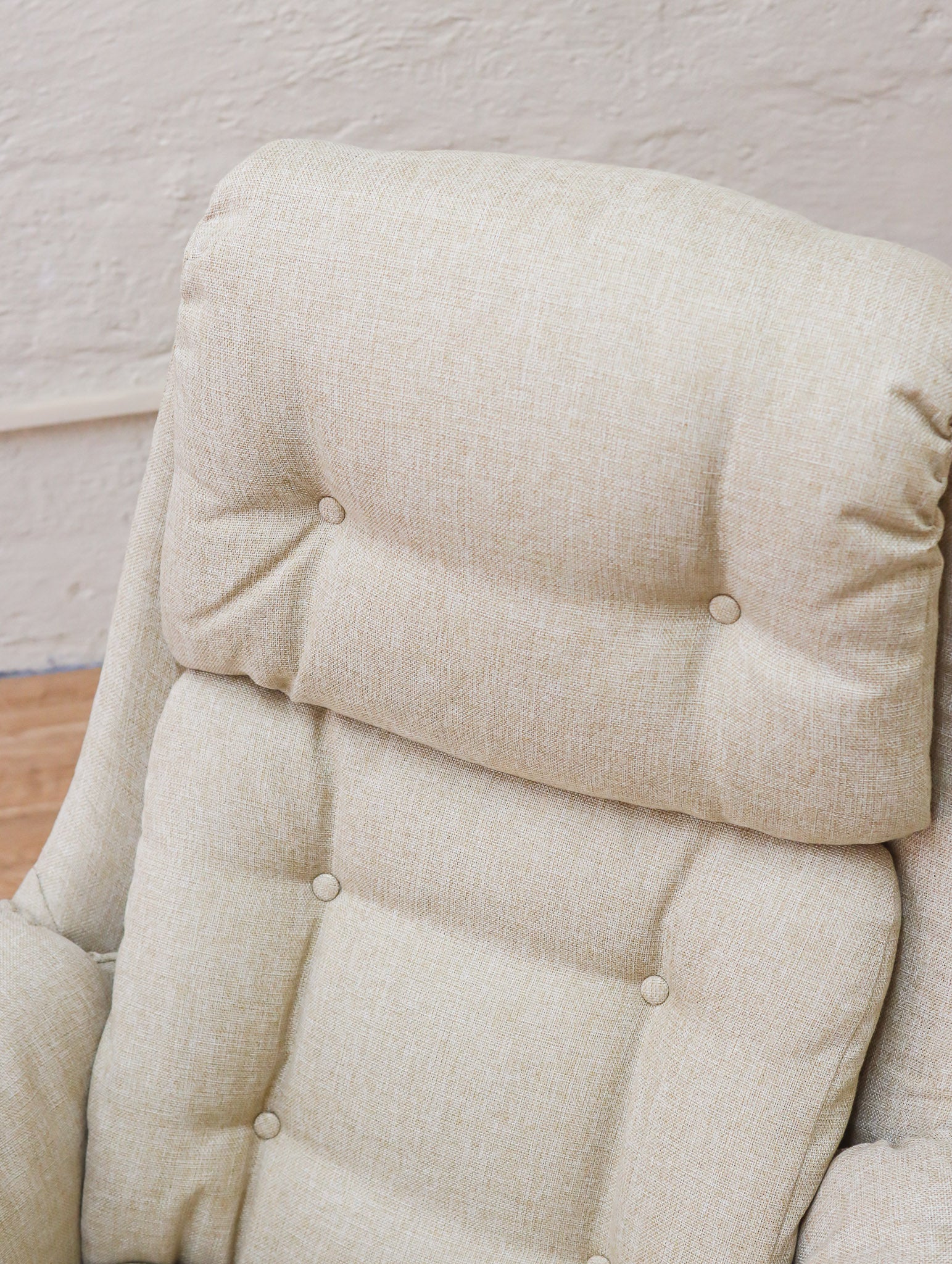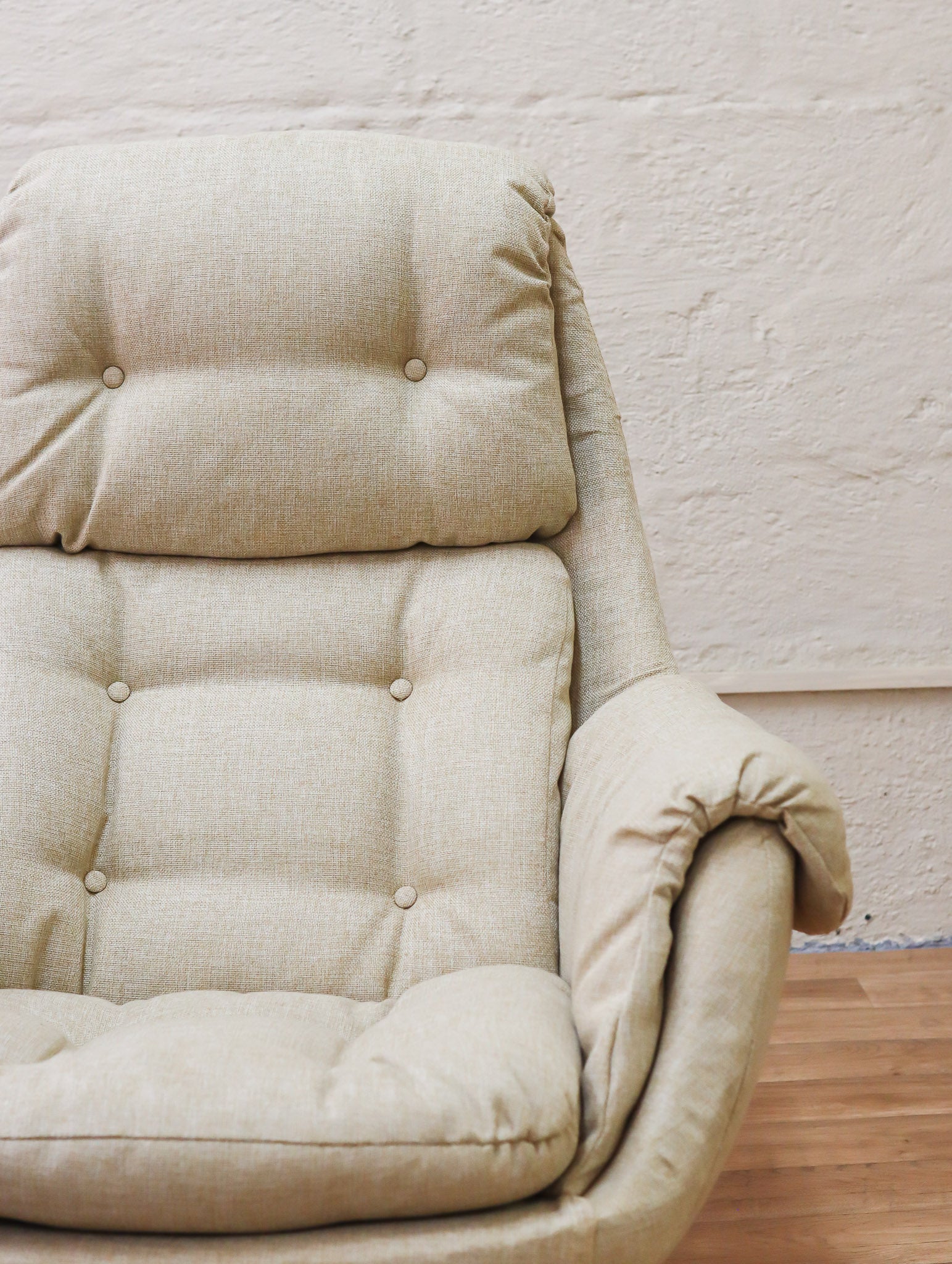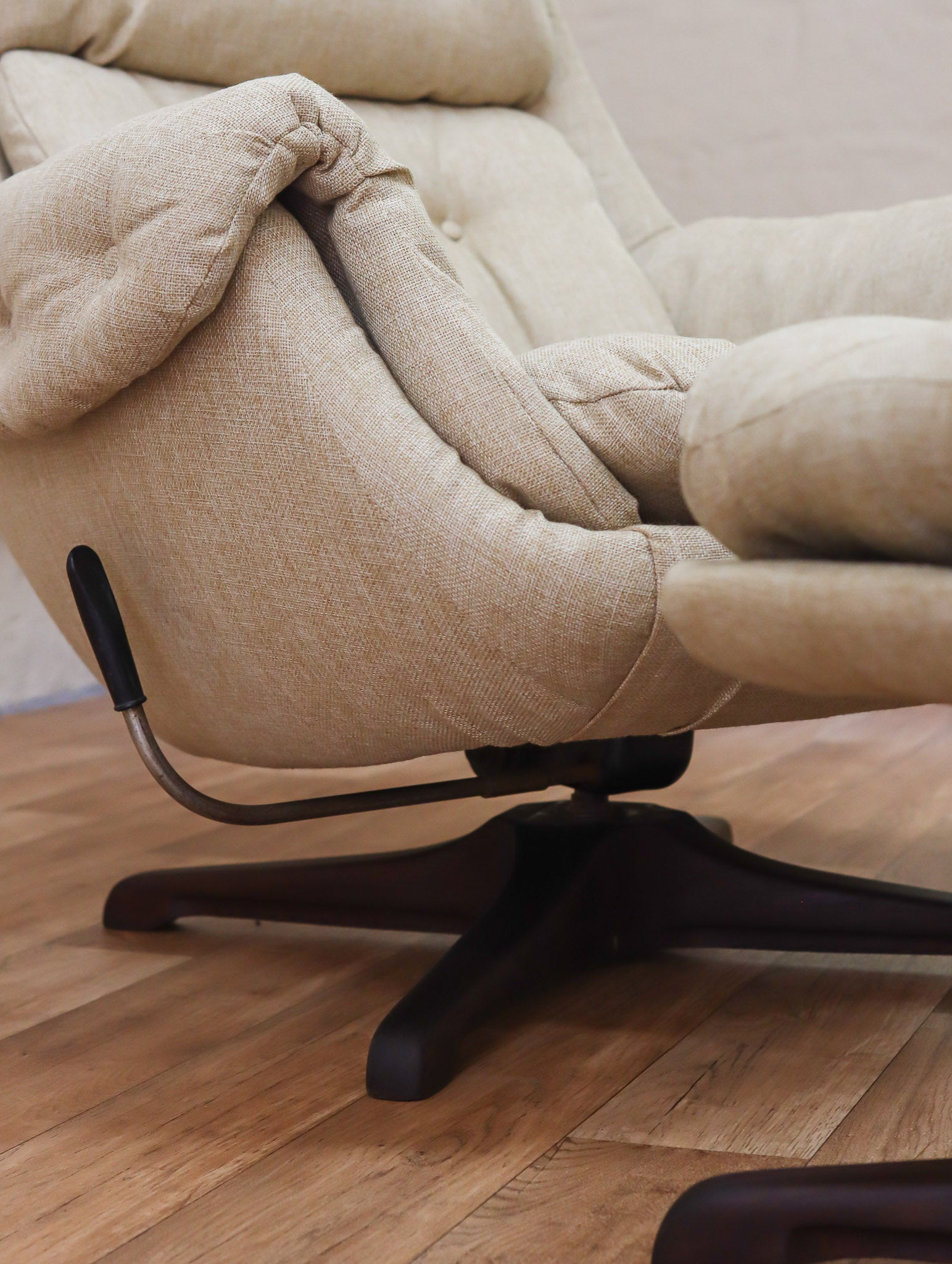 The ultimate lounge chair and stool combo, manufactured locally by South African company Grafton Everest. The chair and stool both feature a 360-degree swivel rotation and wooden base, with a reclining mechanism on the chair. The wooden bases have been carefully sanded and refinished. The entire set has been professionally reupholstered in high-quality cream fabric. Extremely comfortable and ready to adorn any retro living room.