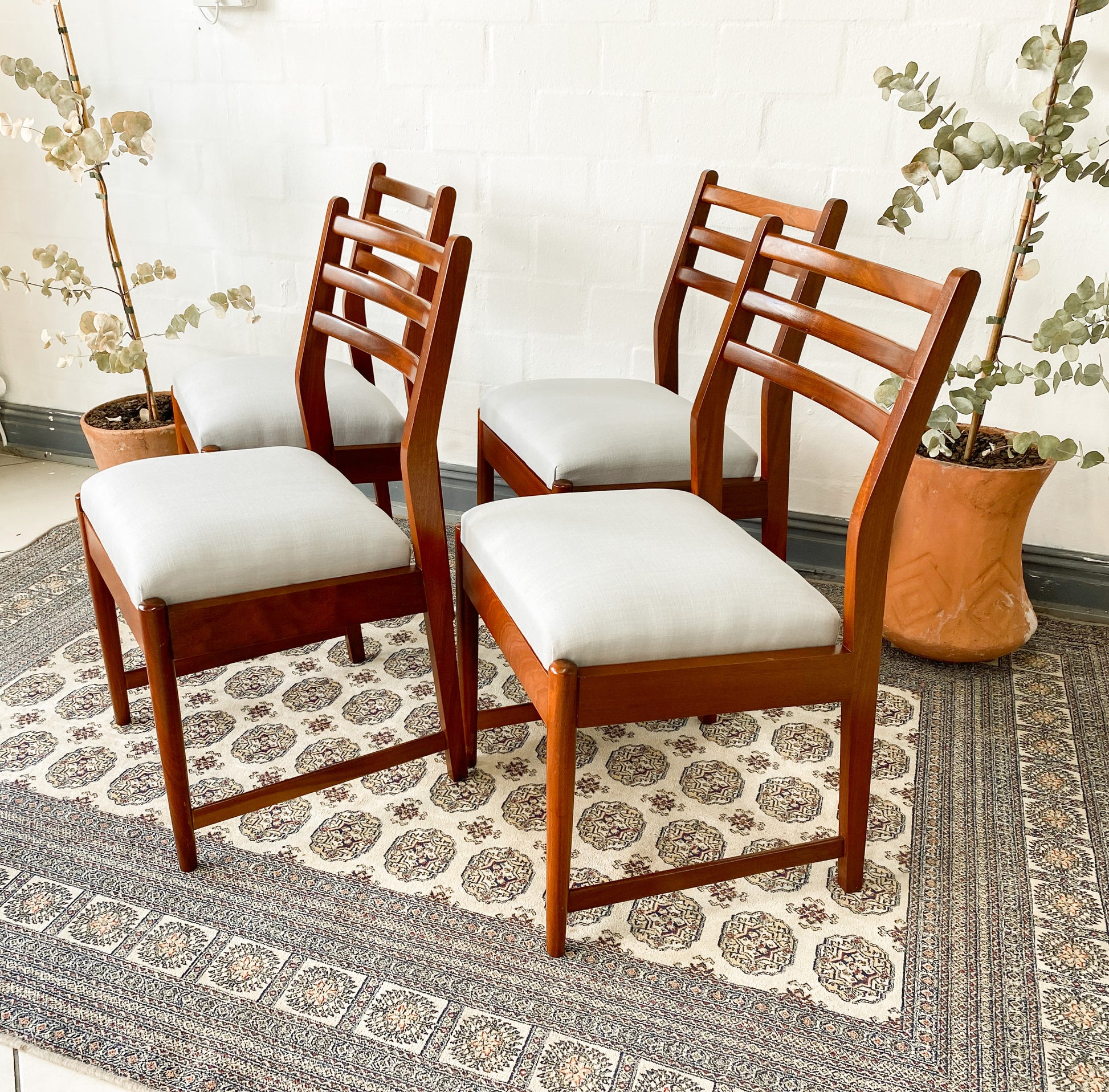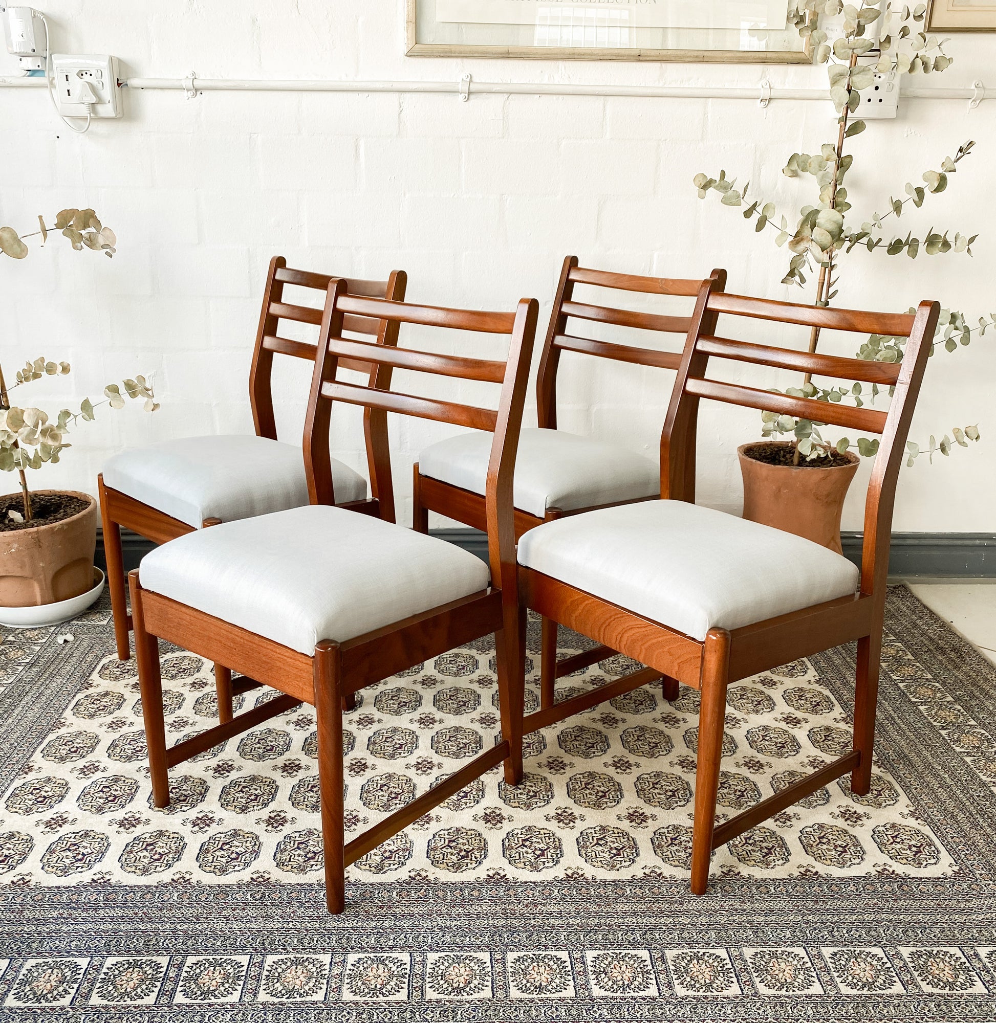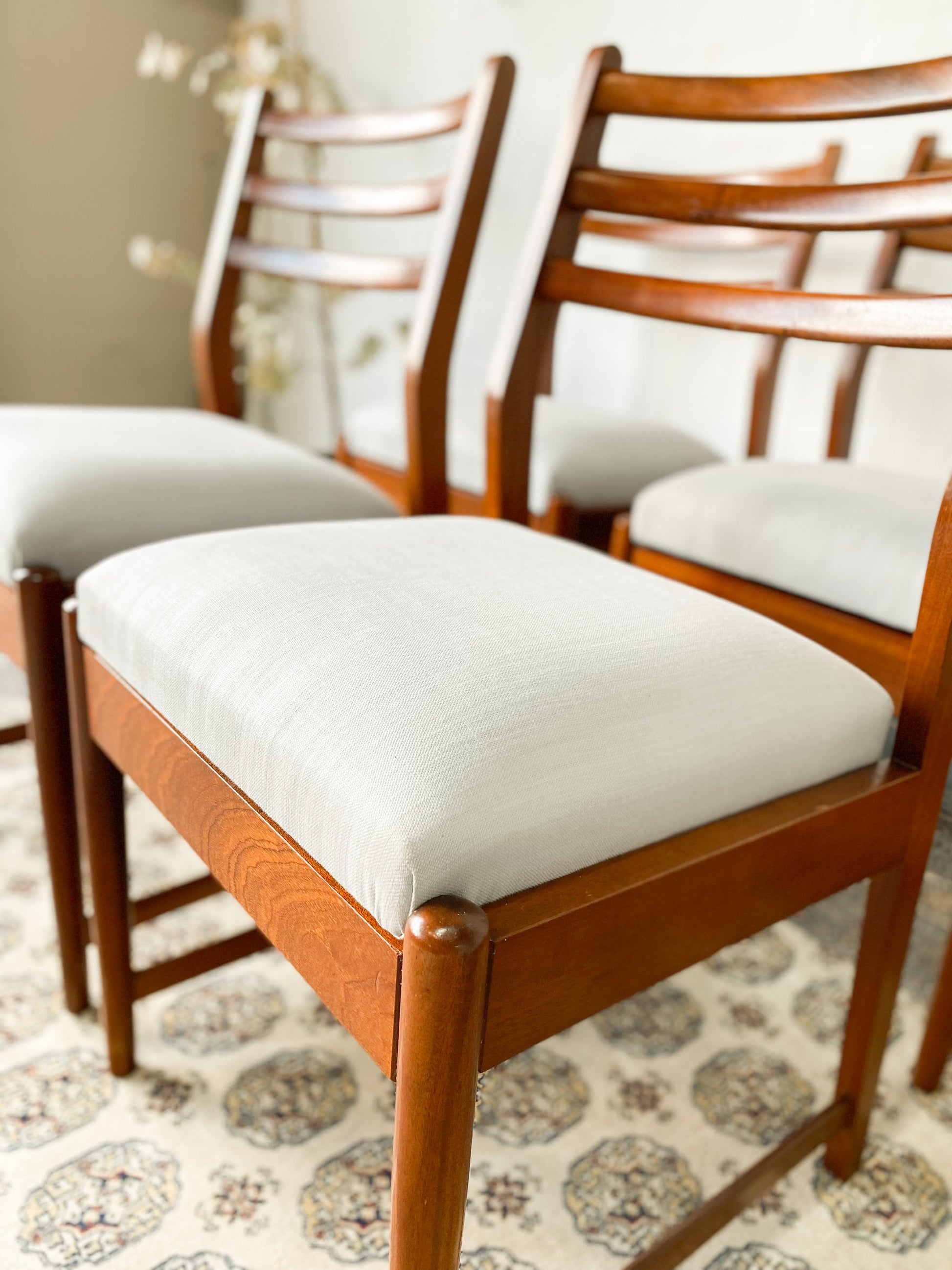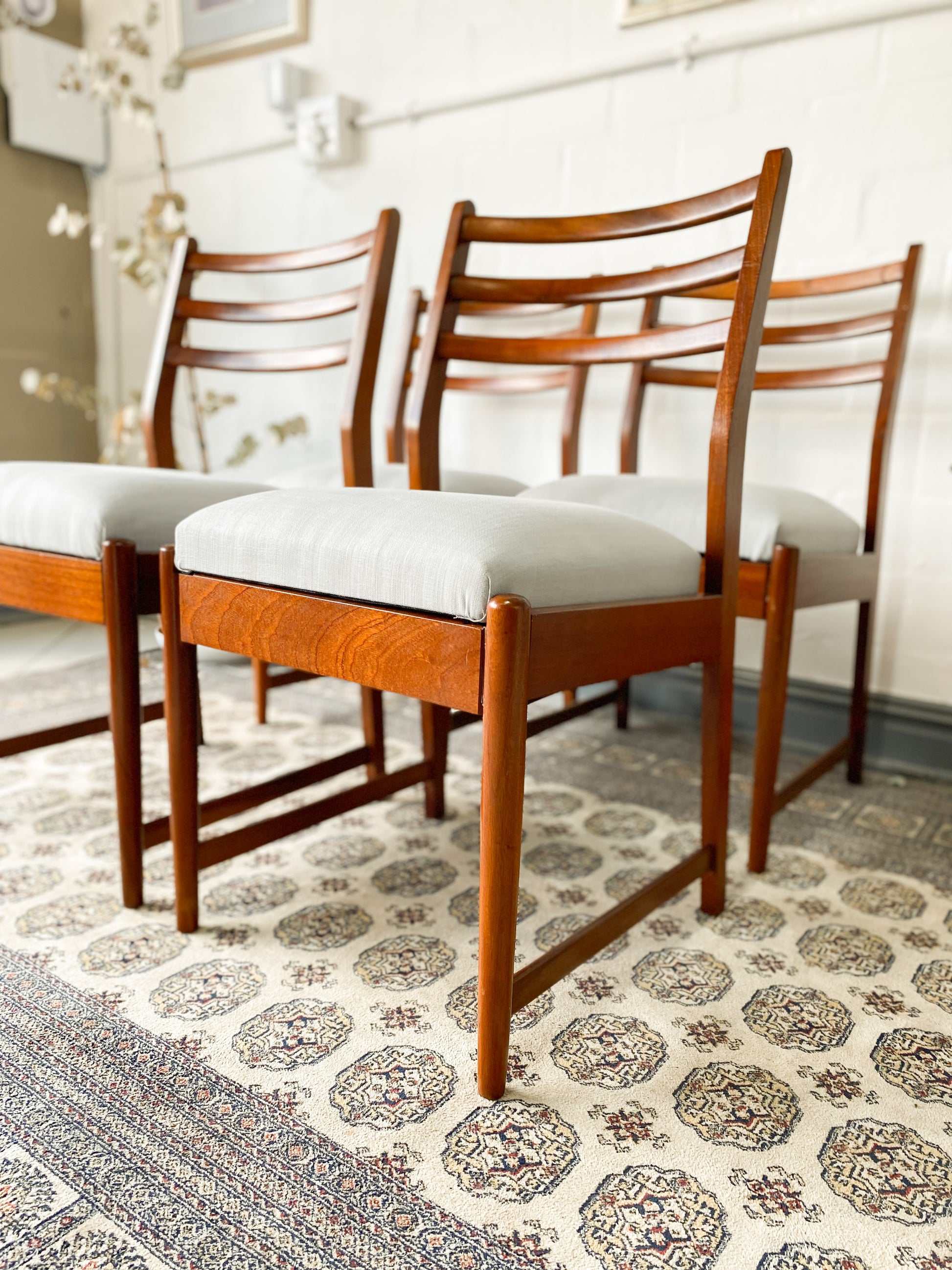 These elegant dining chairs were crafted by Frystark, a renowned furniture maker from South Africa in the 1970s. The chairs showcase clean lines and premium quality wood, and have been reupholstered with new cushioning in a soft shade of grey. With their clean lines and tapered legs, they can easily complement any room's decor, exuding a charming mid-century modern vibe.