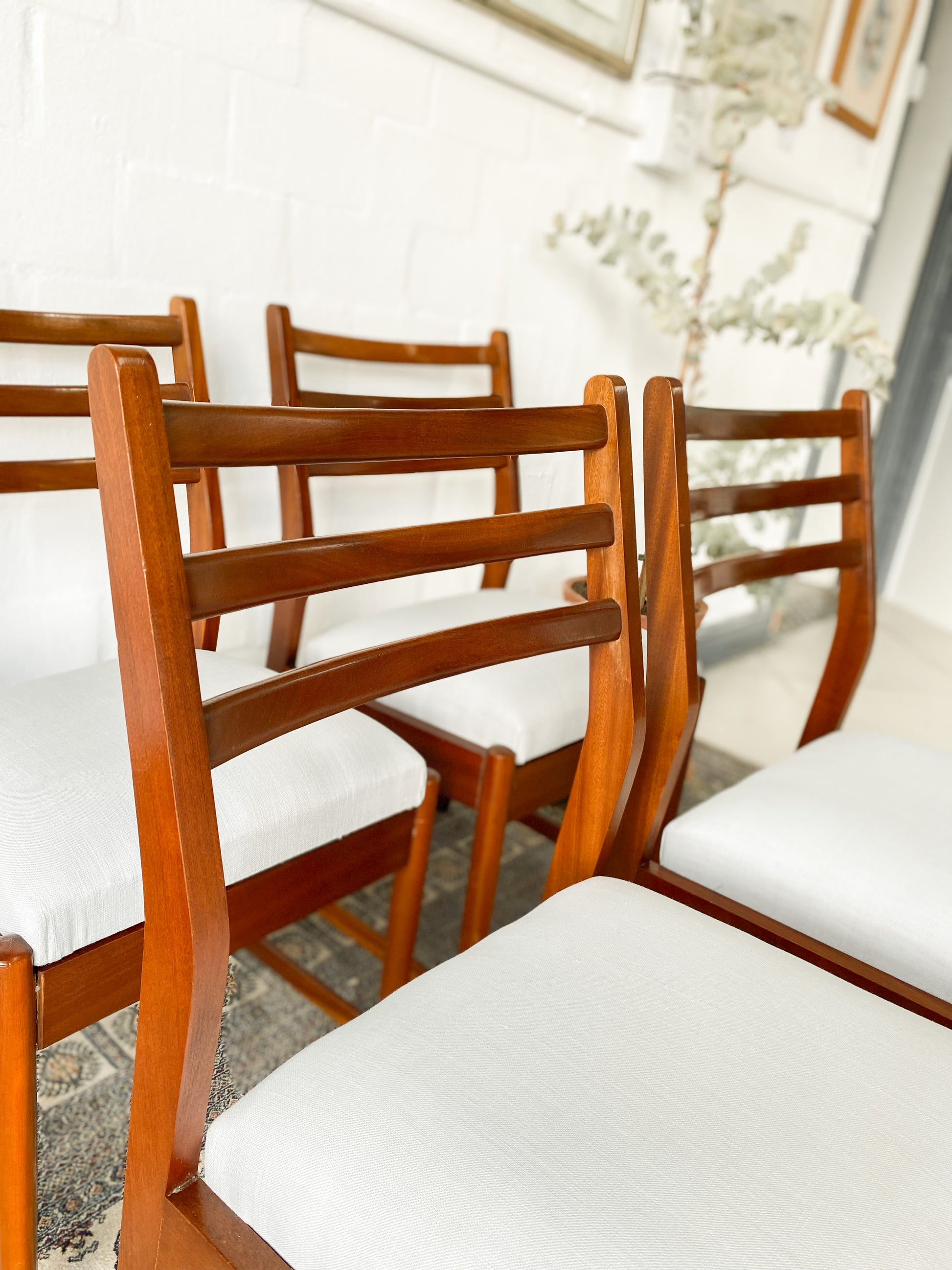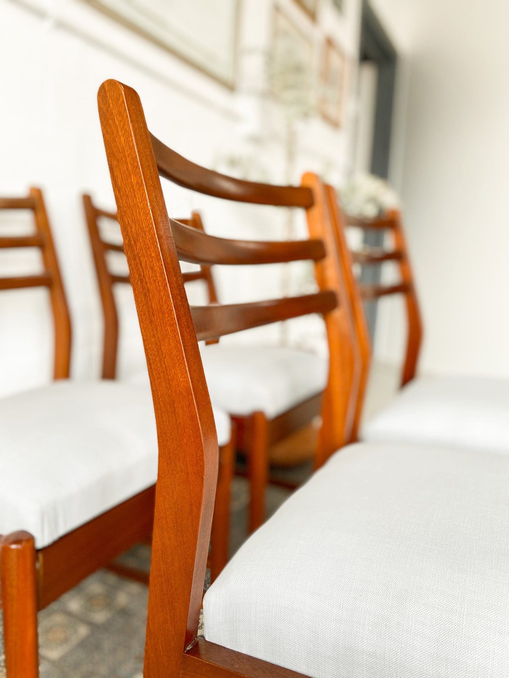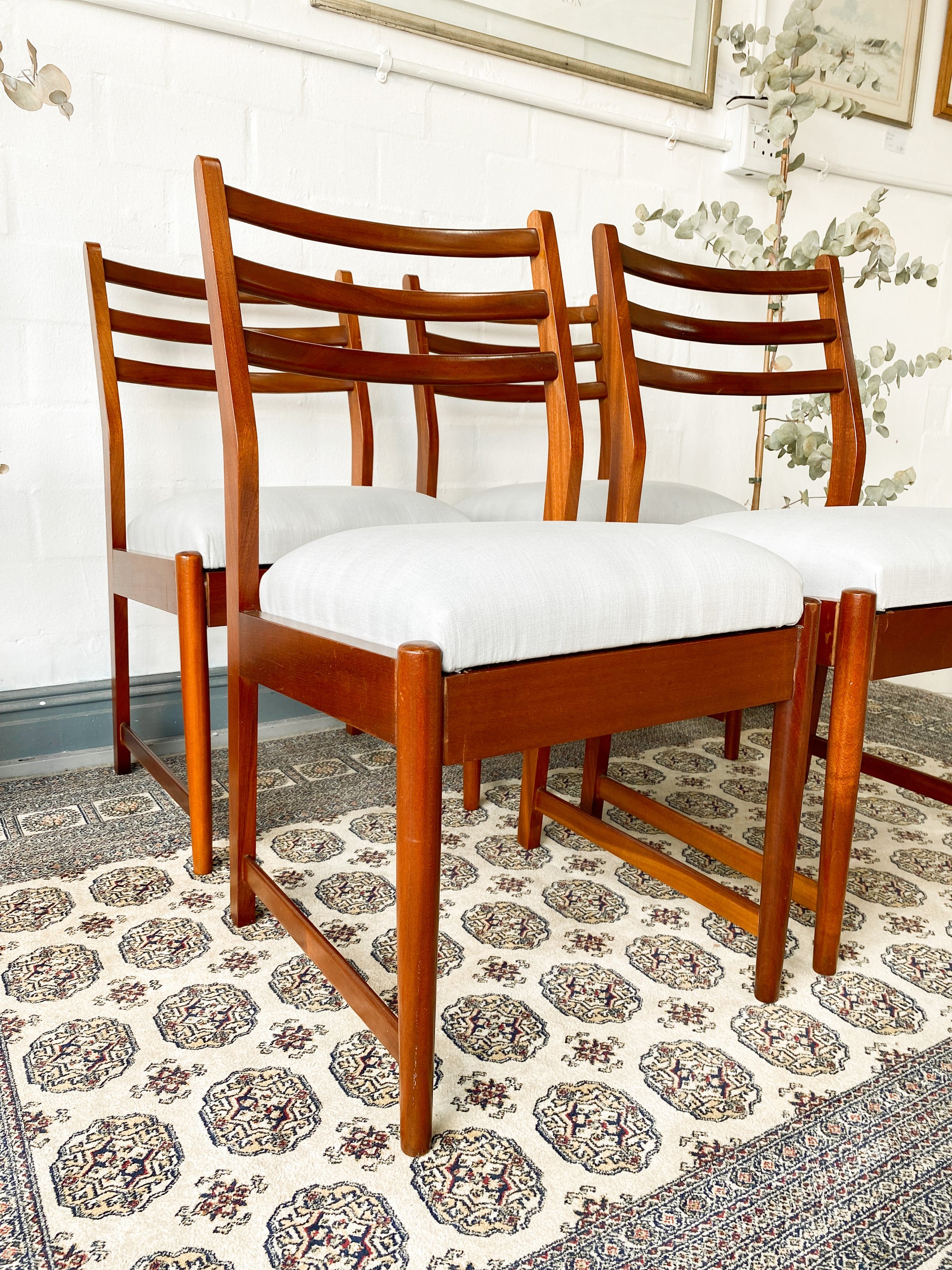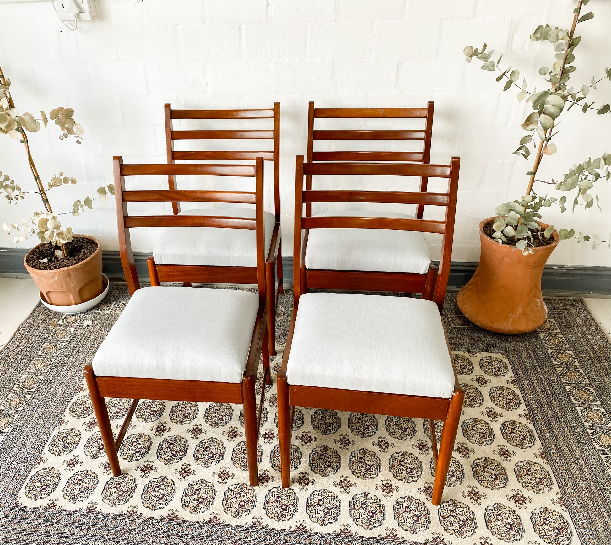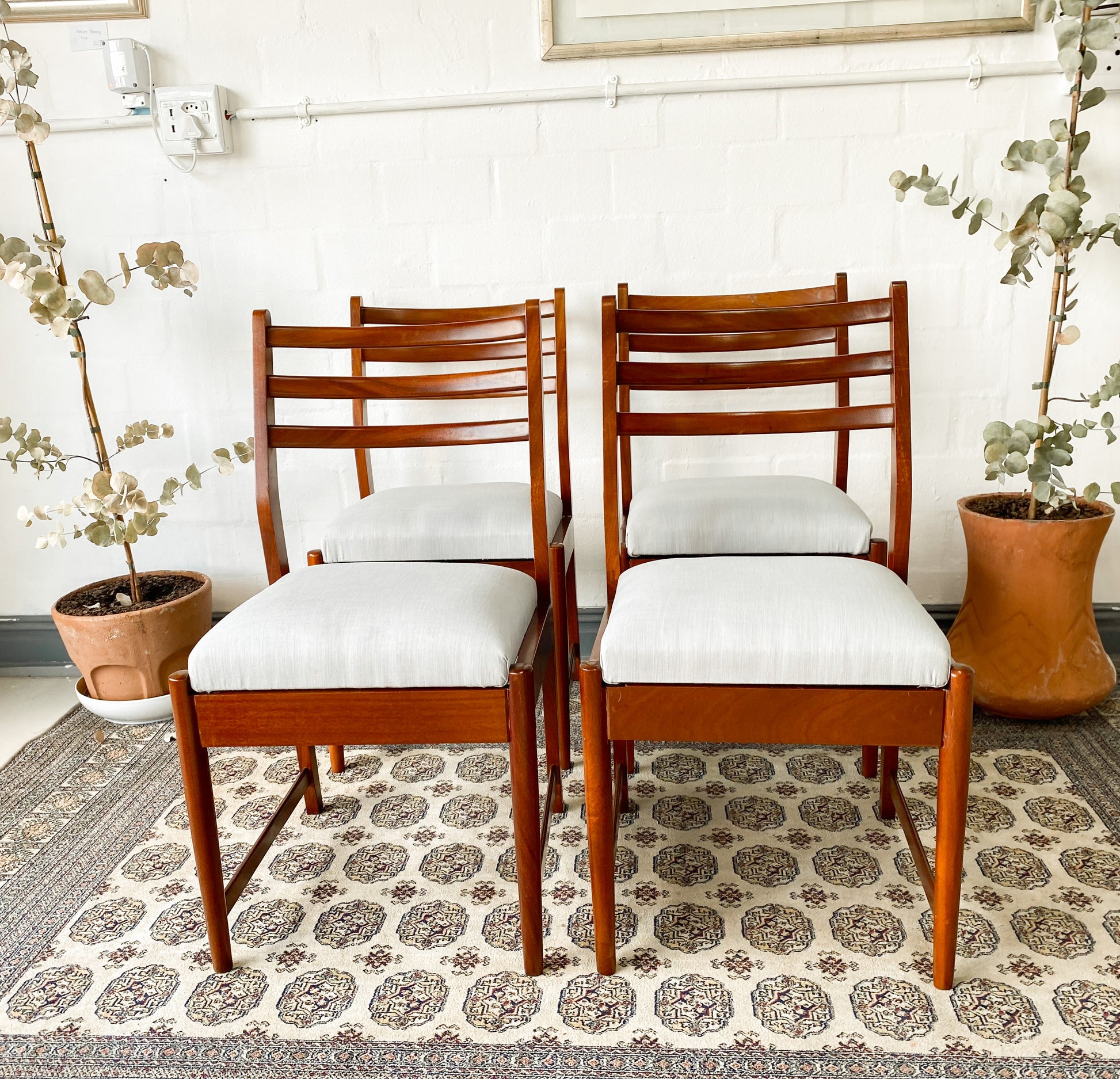 These elegant dining chairs were crafted by Frystark, a renowned furniture maker from South Africa in the 1970s. The chairs showcase clean lines and premium quality wood, and have been reupholstered with new cushioning in a soft shade of grey. With their clean lines and tapered legs, they can easily complement any room's decor, exuding a charming mid-century modern vibe.