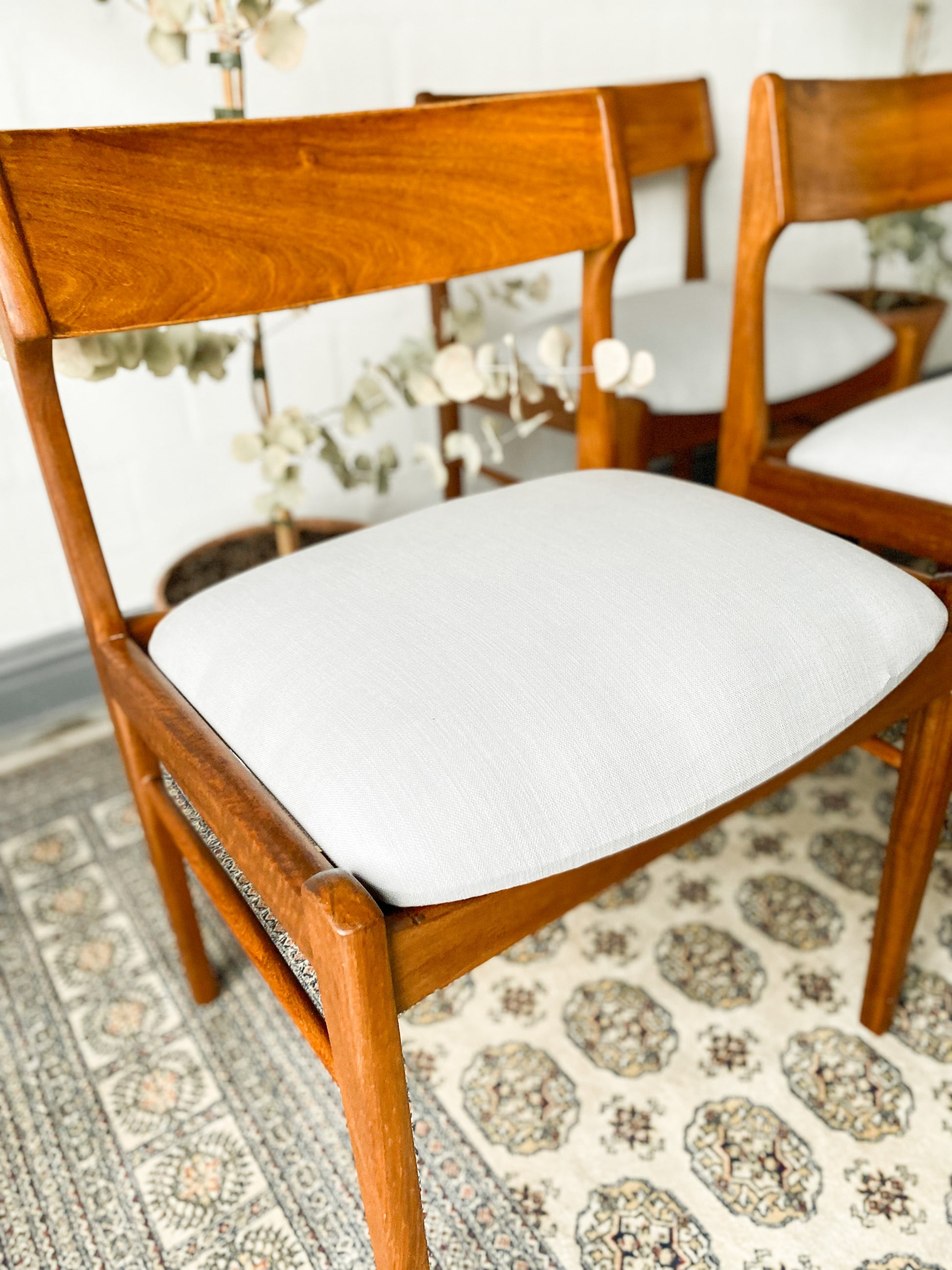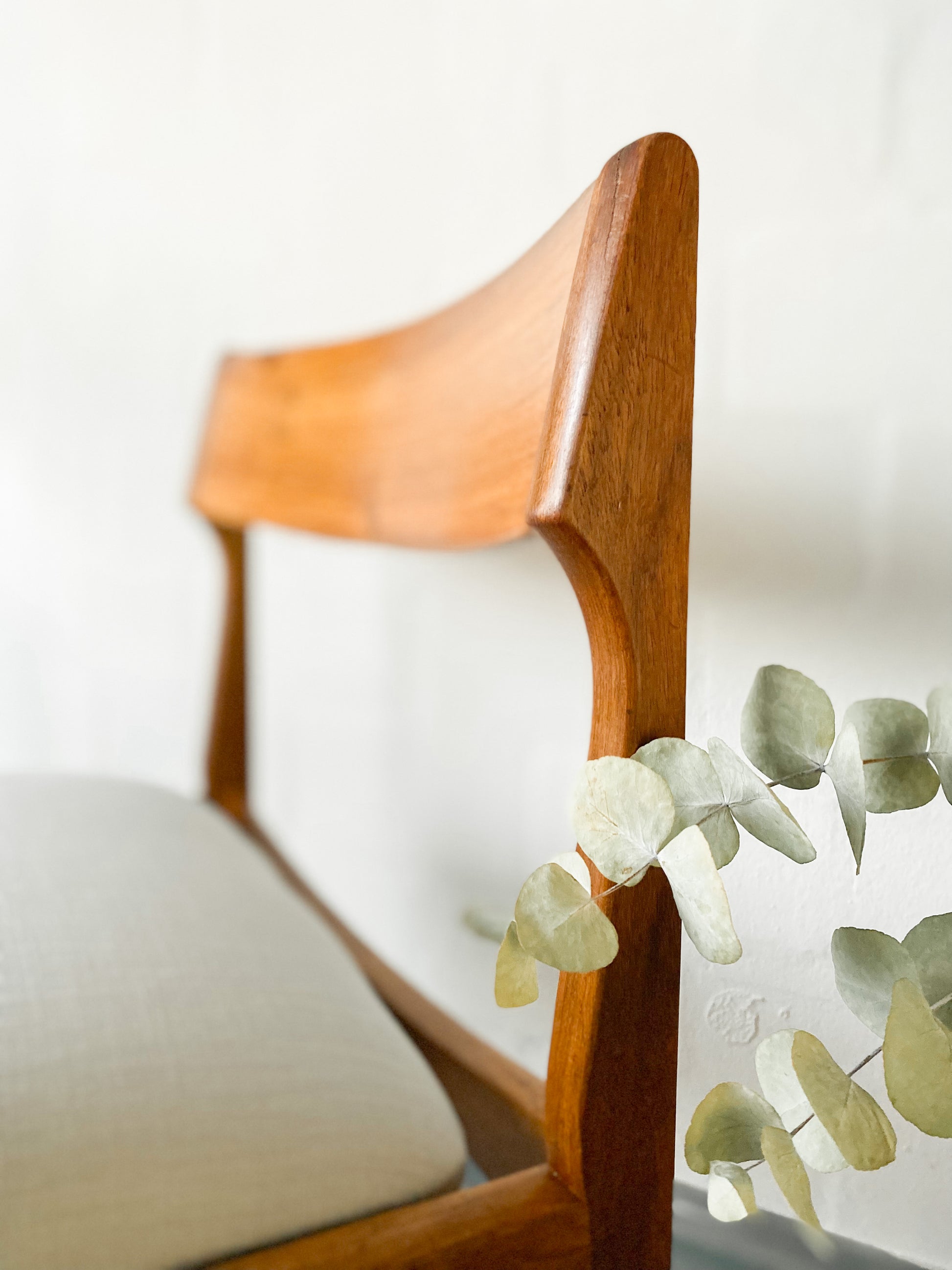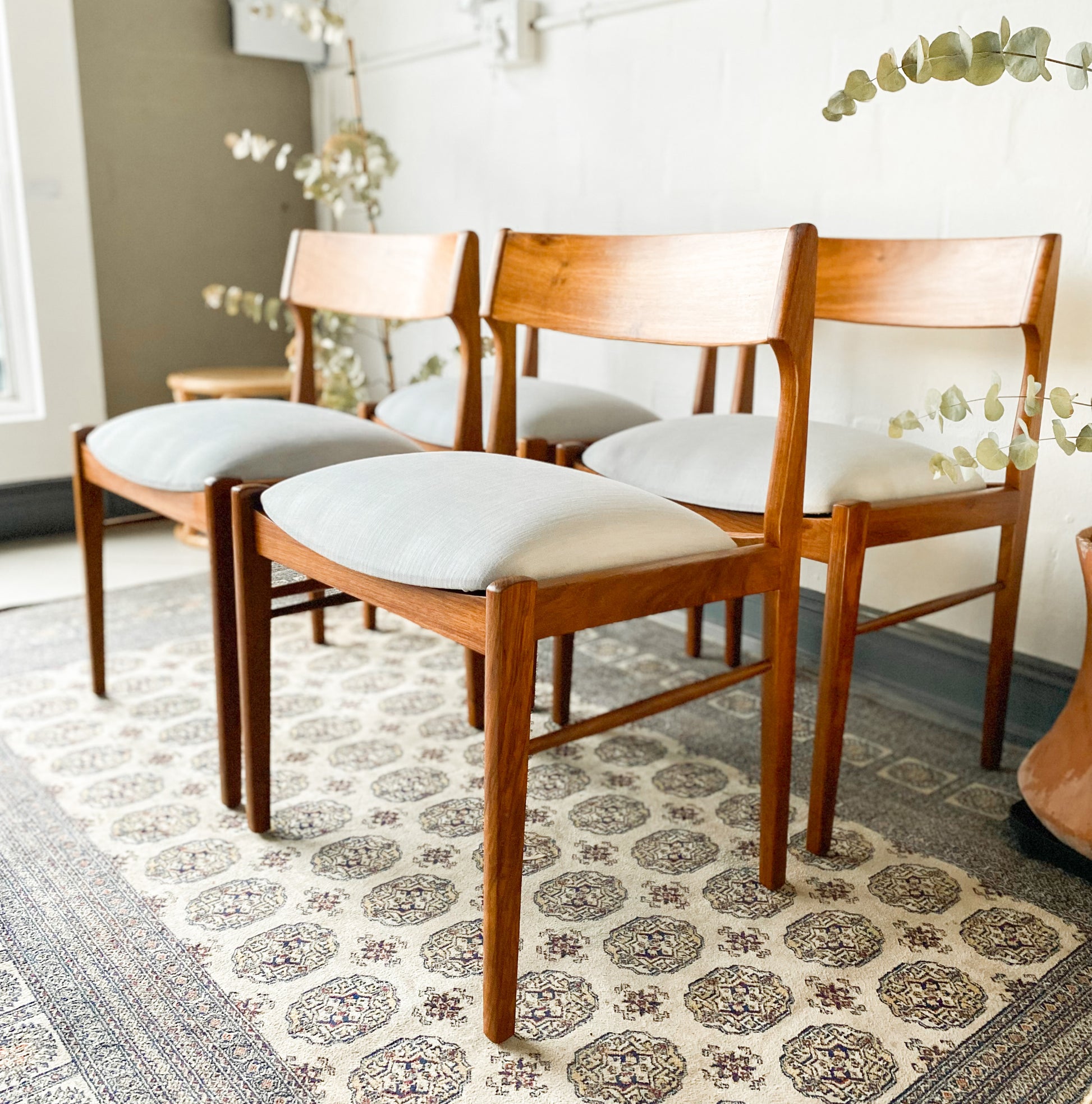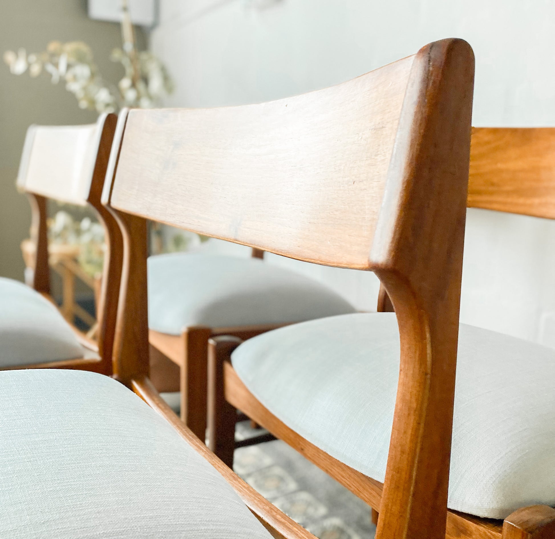 Enhance your dining area with this exquisite collection of four dining chairs from the renowned UK brand, Greaves and Thomas. The chairs boast a sleek and modern design with clean lines, accentuated by the bright and inviting warm wood grain finish, sure to elevate the aesthetic of any room they're placed in. Furthermore, the chairs have been expertly reupholstered in a stunning light grey fabric, and come with new cushioning to ensure both comfort and style.