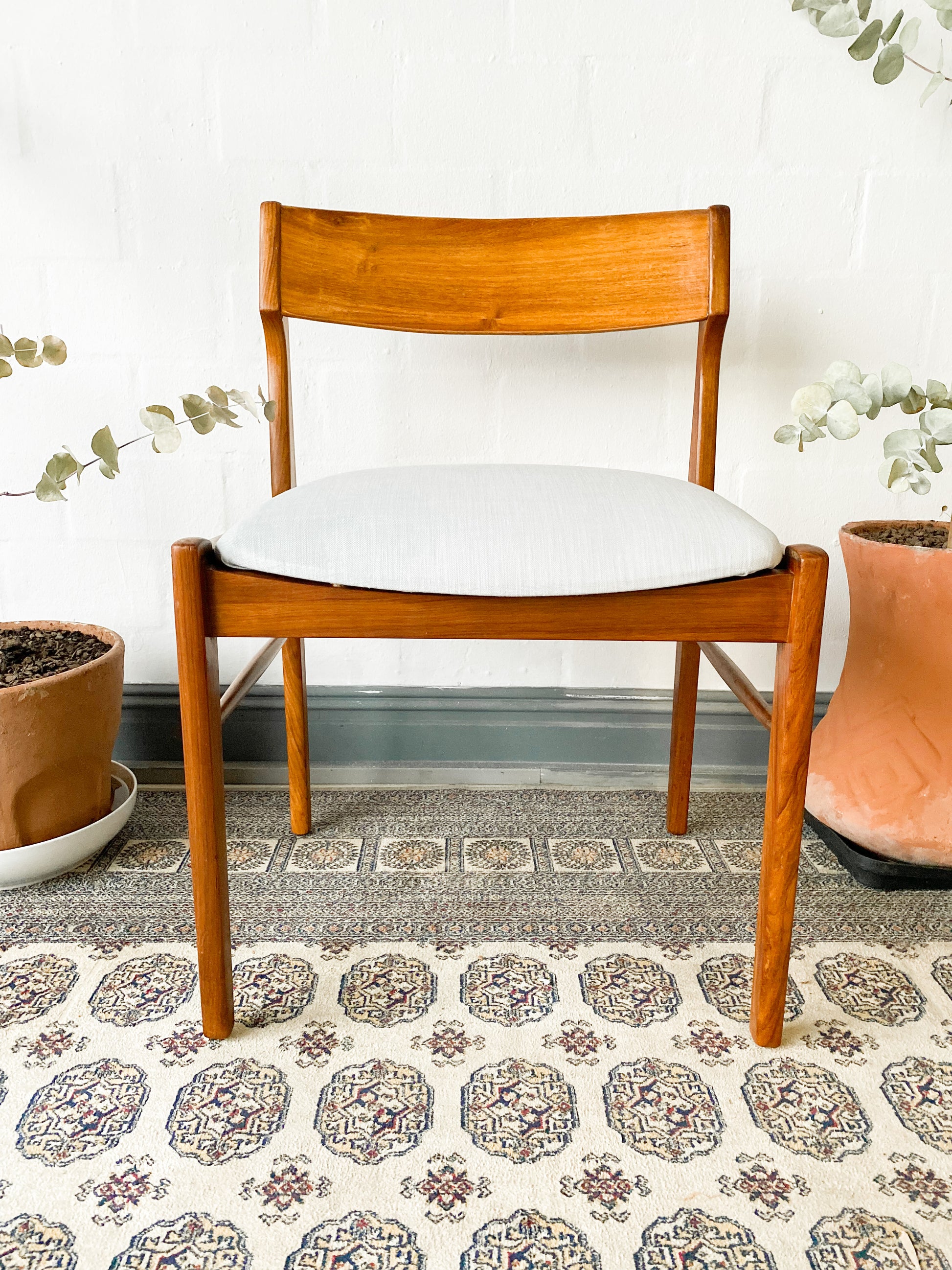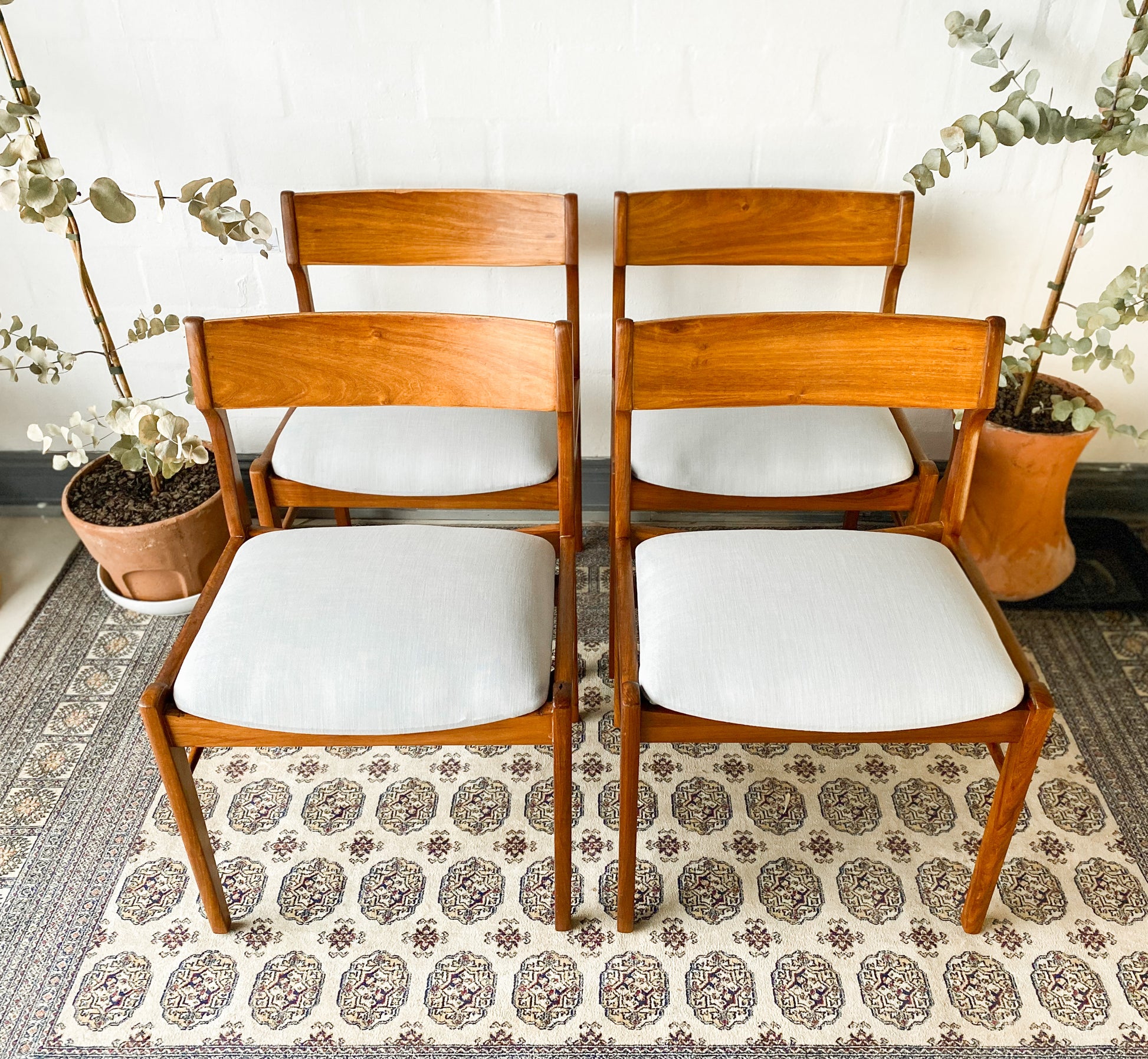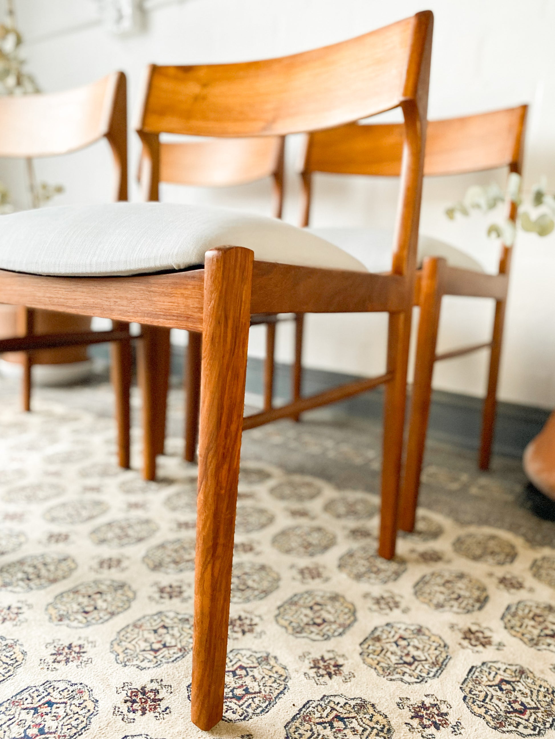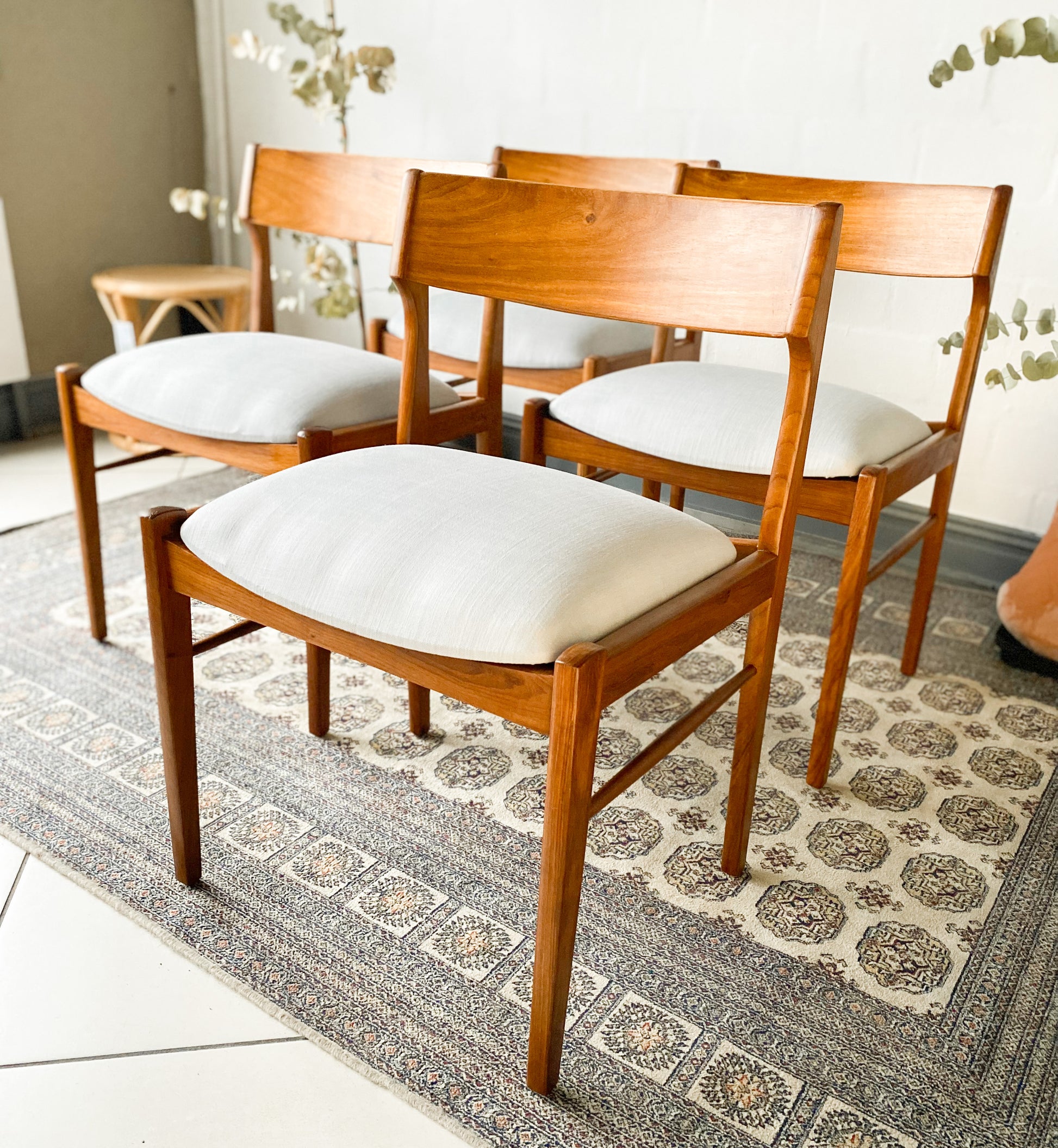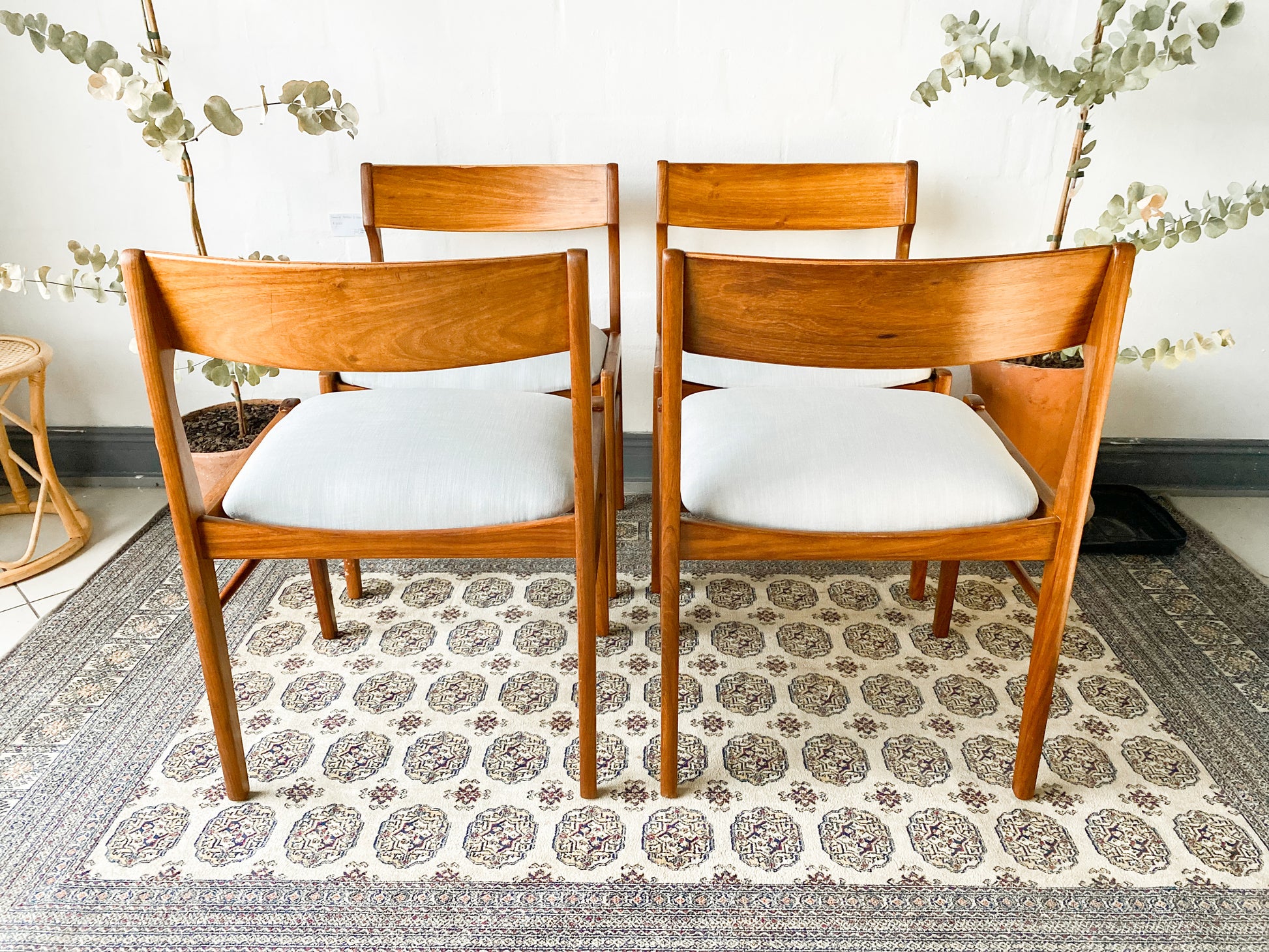 Enhance your dining area with this exquisite collection of four dining chairs from the renowned UK brand, Greaves and Thomas. The chairs boast a sleek and modern design with clean lines, accentuated by the bright and inviting warm wood grain finish, sure to elevate the aesthetic of any room they're placed in. Furthermore, the chairs have been expertly reupholstered in a stunning light grey fabric, and come with new cushioning to ensure both comfort and style.